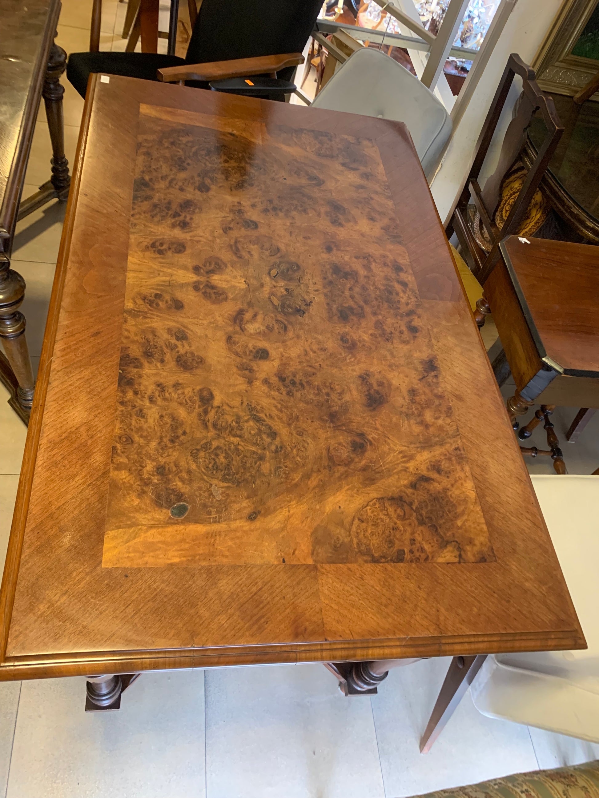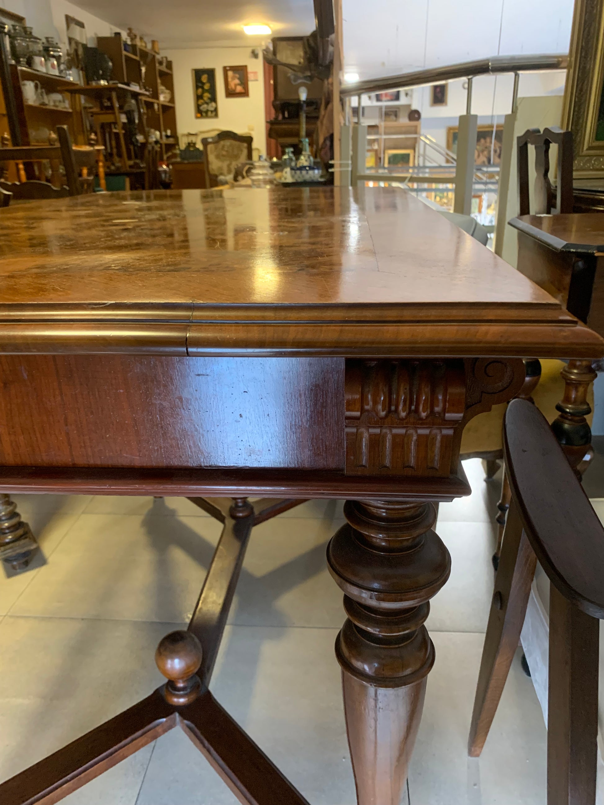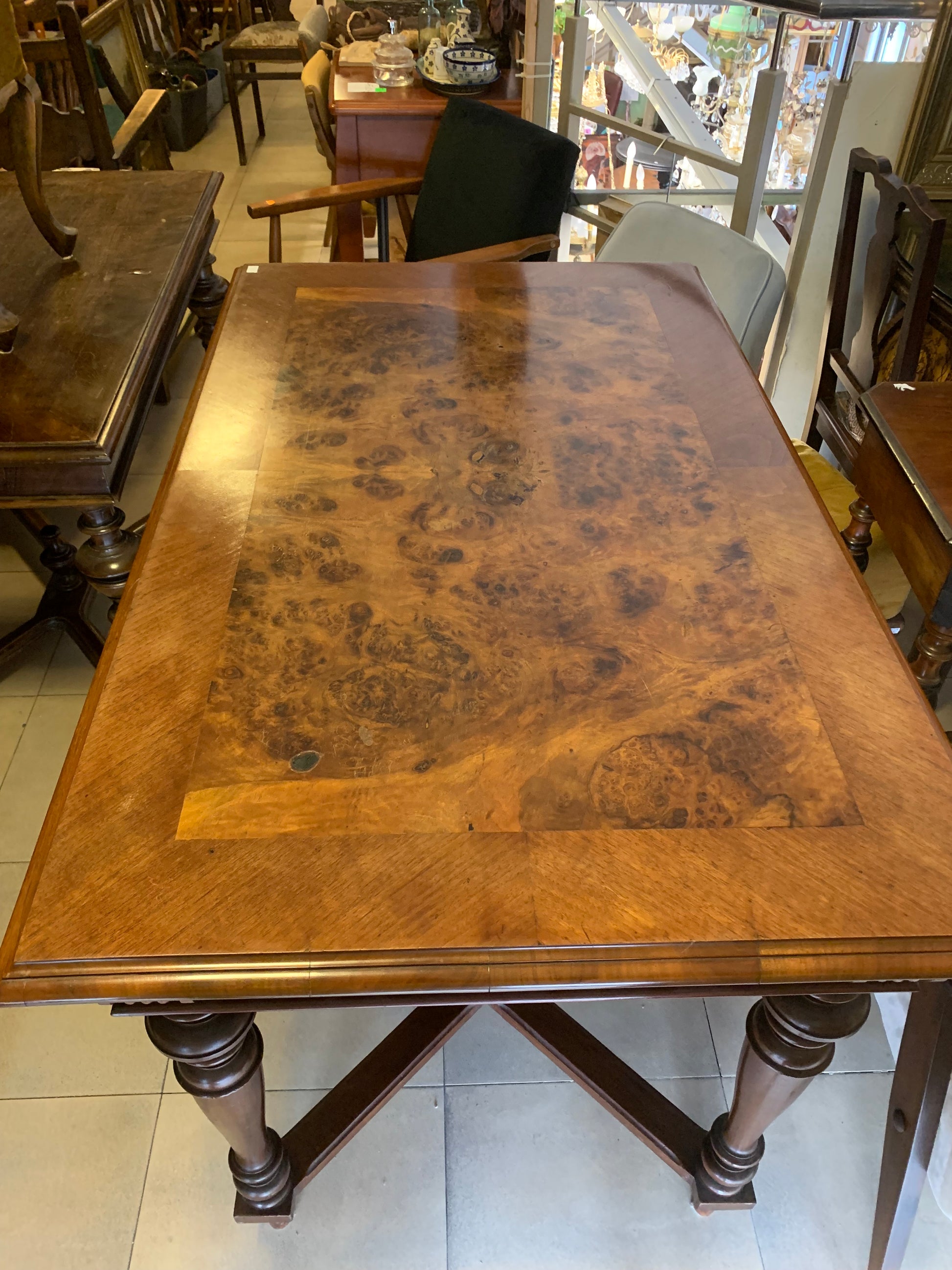 Stół zabytkowy, prostokątny, orzechowy. Nogi stołu toczone, blat - czeczot orzechowy.