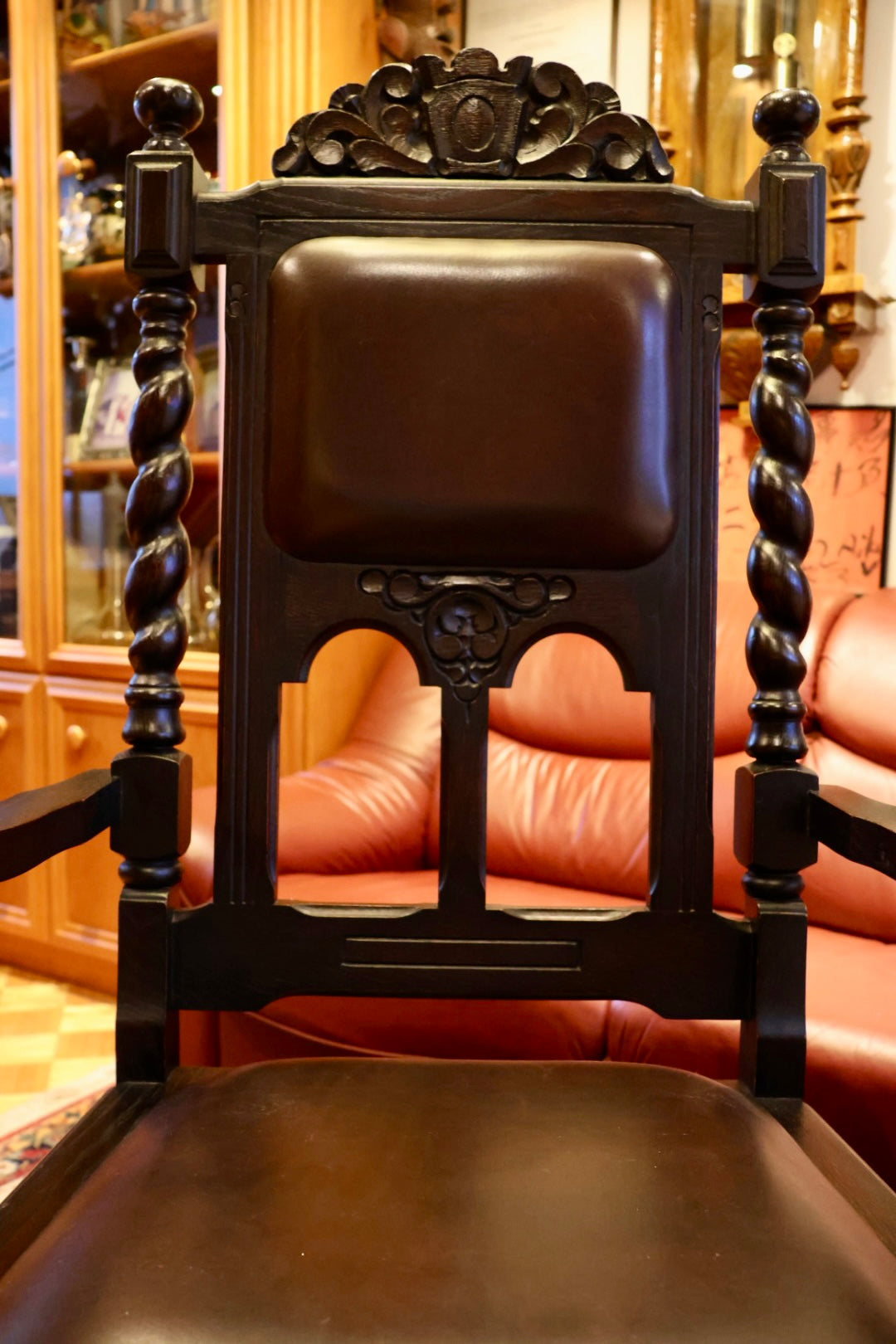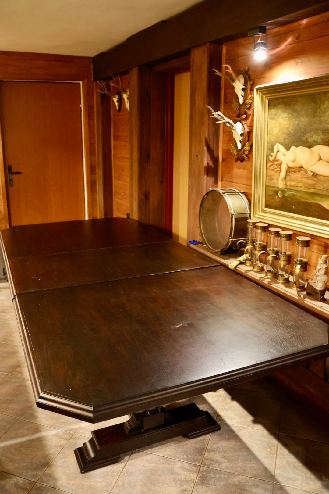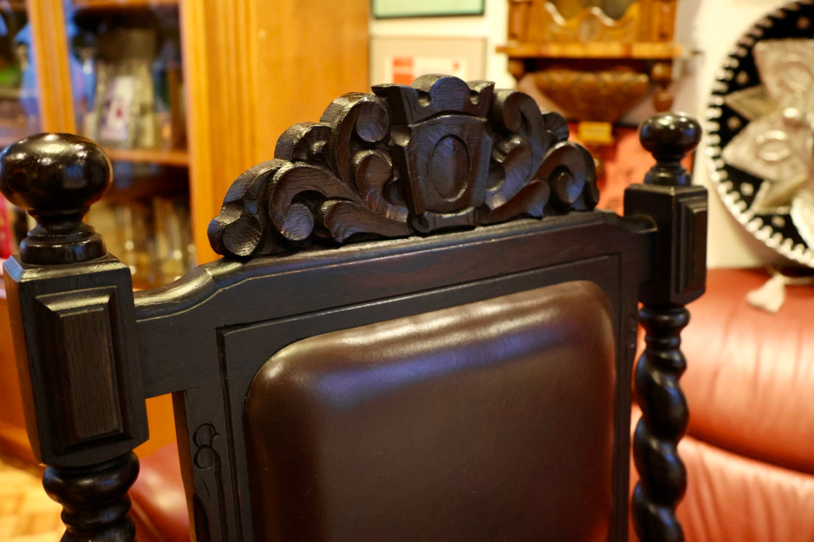 Dębowy stół rozkładany w kolorze palisandru na solidnej rzeźbionej podstawie w komplecie z 8 krzesłami (w tym 2 tronowe) Stół dębowy wymiary : stół złożony 184cm stół rozłożony 241 cm szerokość stołu 111cm wysokość stołu 78 cm