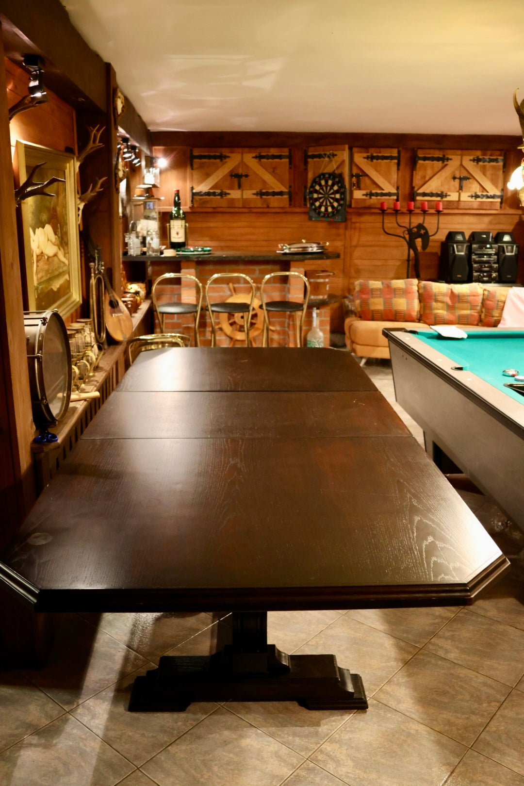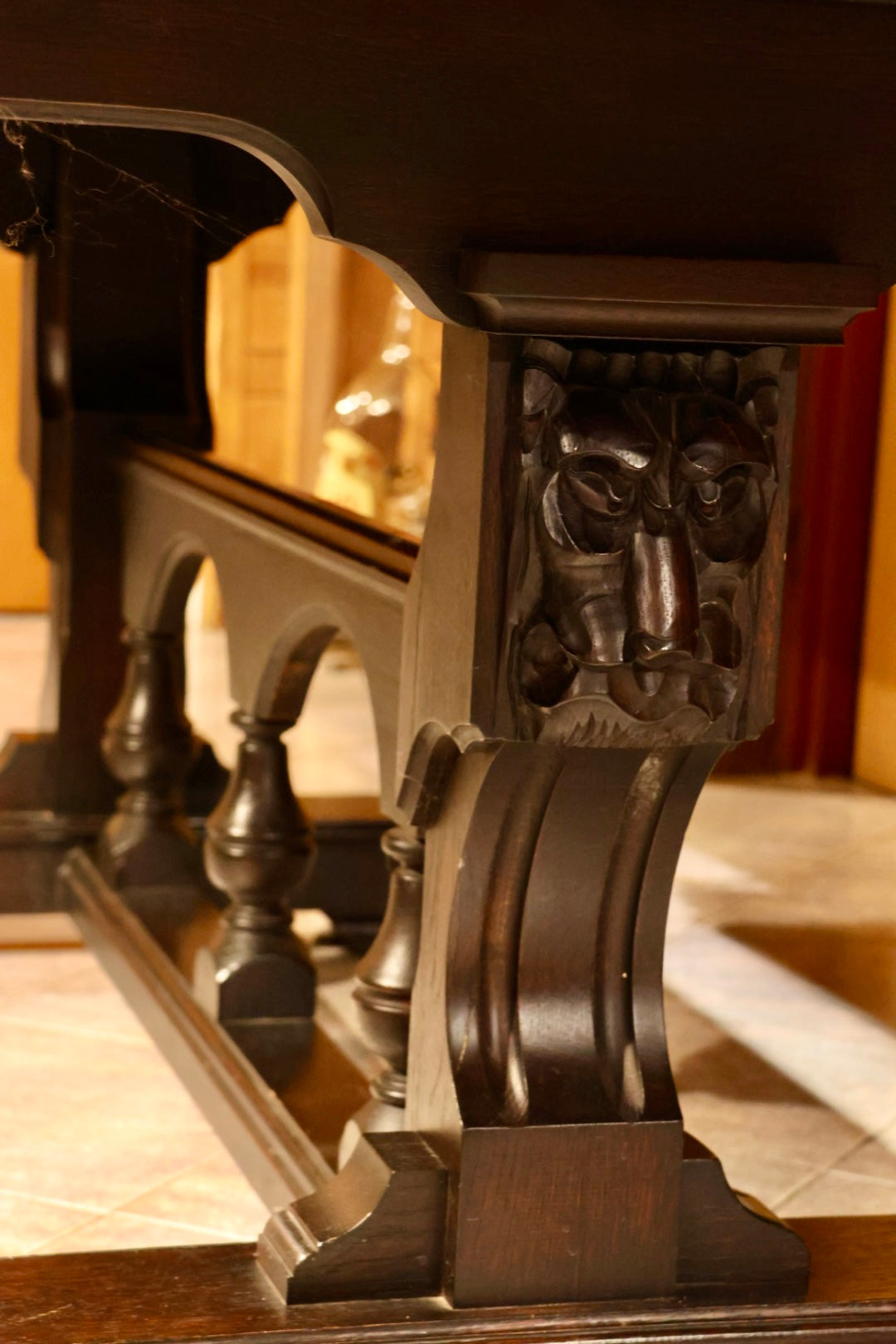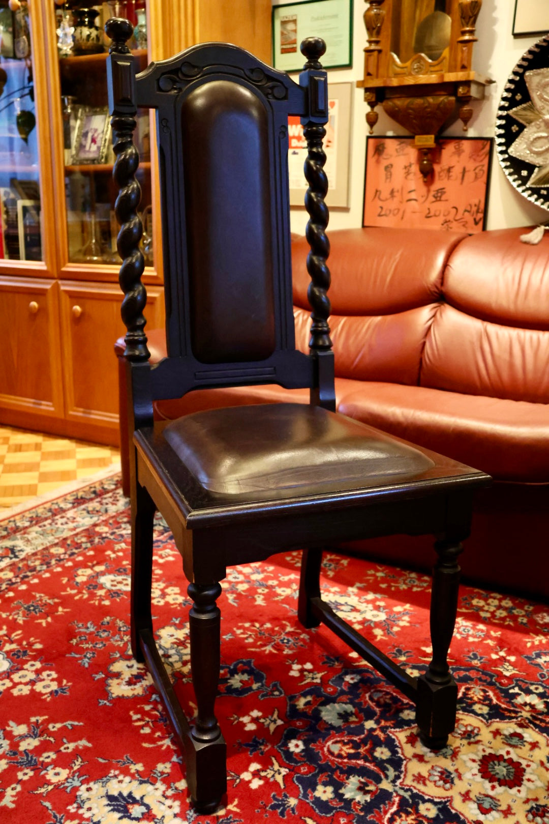 Dębowy stół rozkładany w kolorze palisandru na solidnej rzeźbionej podstawie w komplecie z 8 krzesłami (w tym 2 tronowe) Stół dębowy wymiary : stół złożony 184cm stół rozłożony 241 cm szerokość stołu 111cm wysokość stołu 78 cm