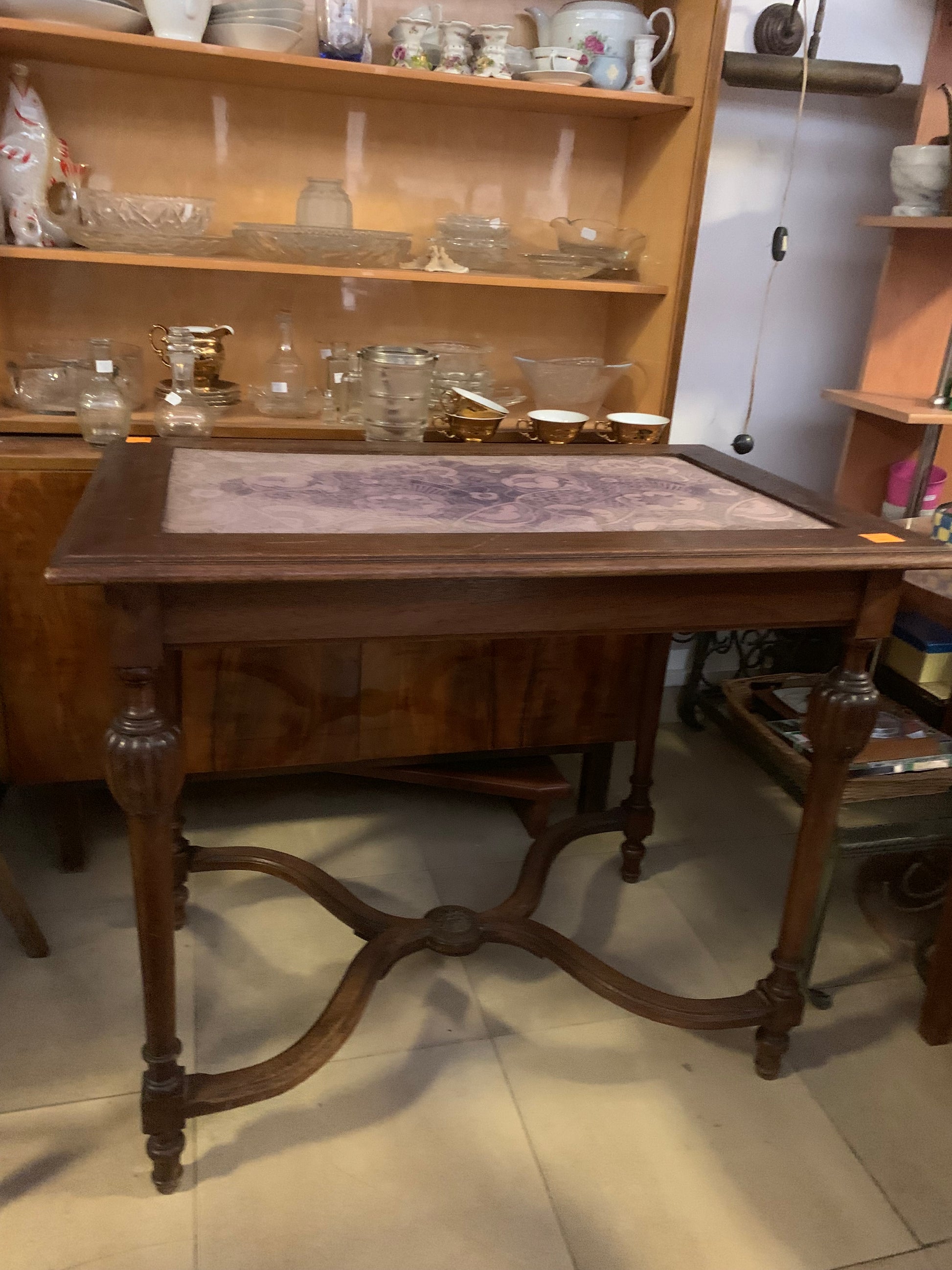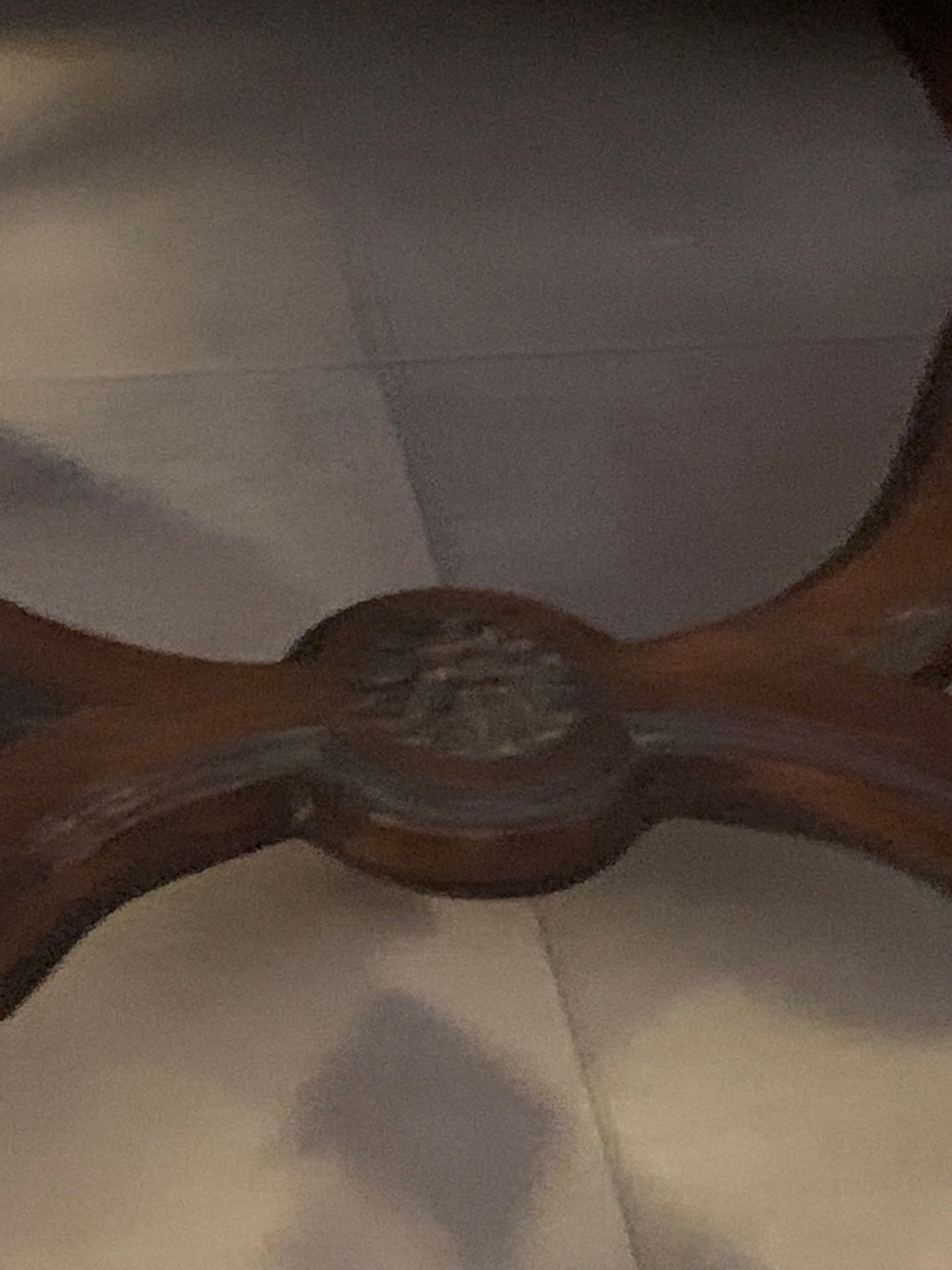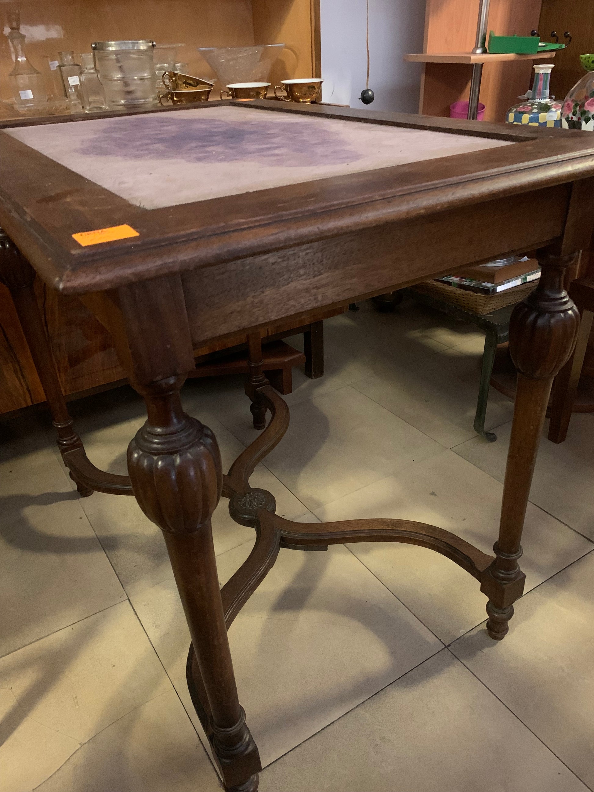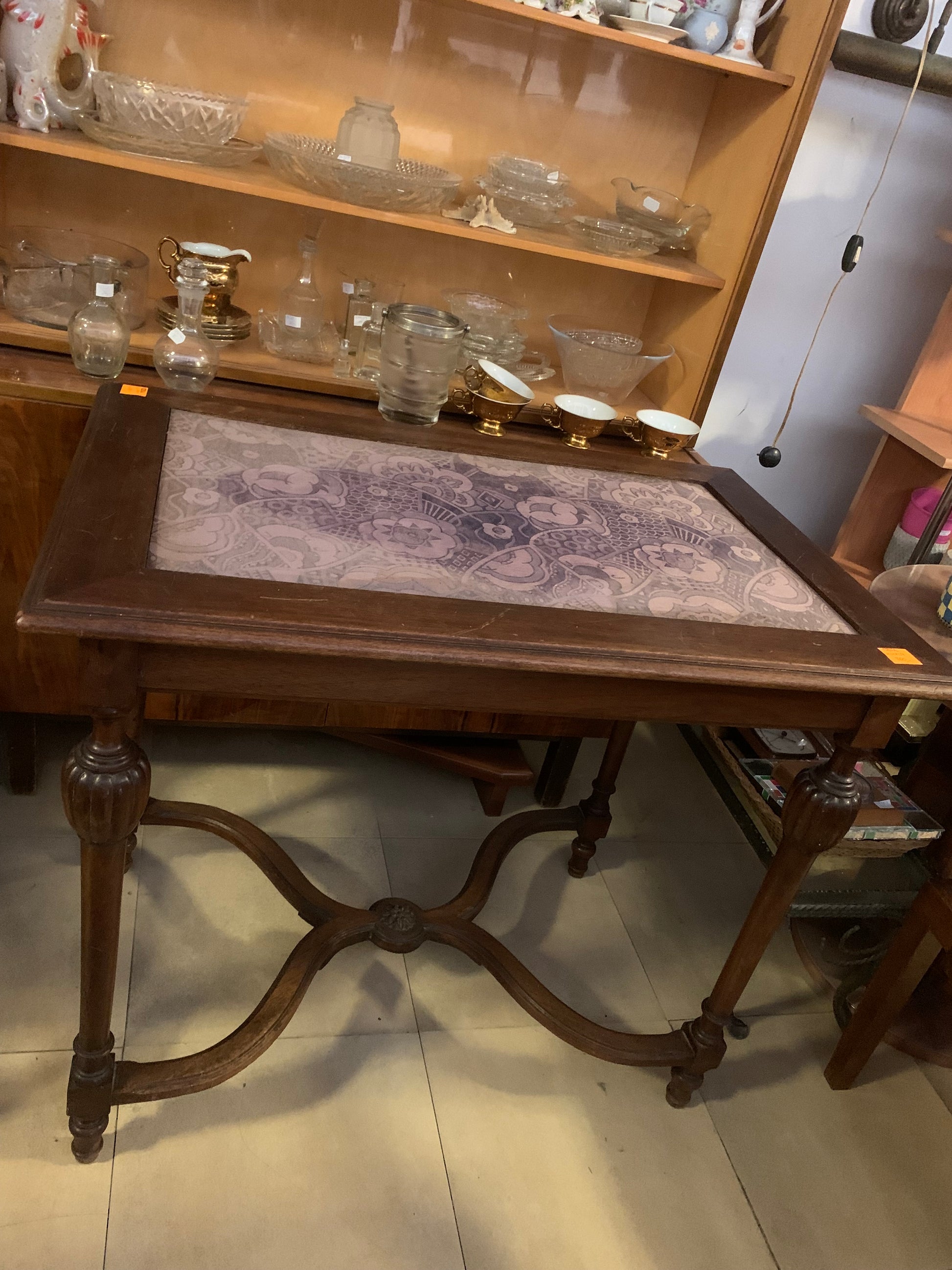 Stół obiadowy, krzyżak, drewniany. Zgrabny stolik na 4 osoby, piękne, toczone nogi, zdobiony rozetą, blat drewniany obłożony tkaniną.