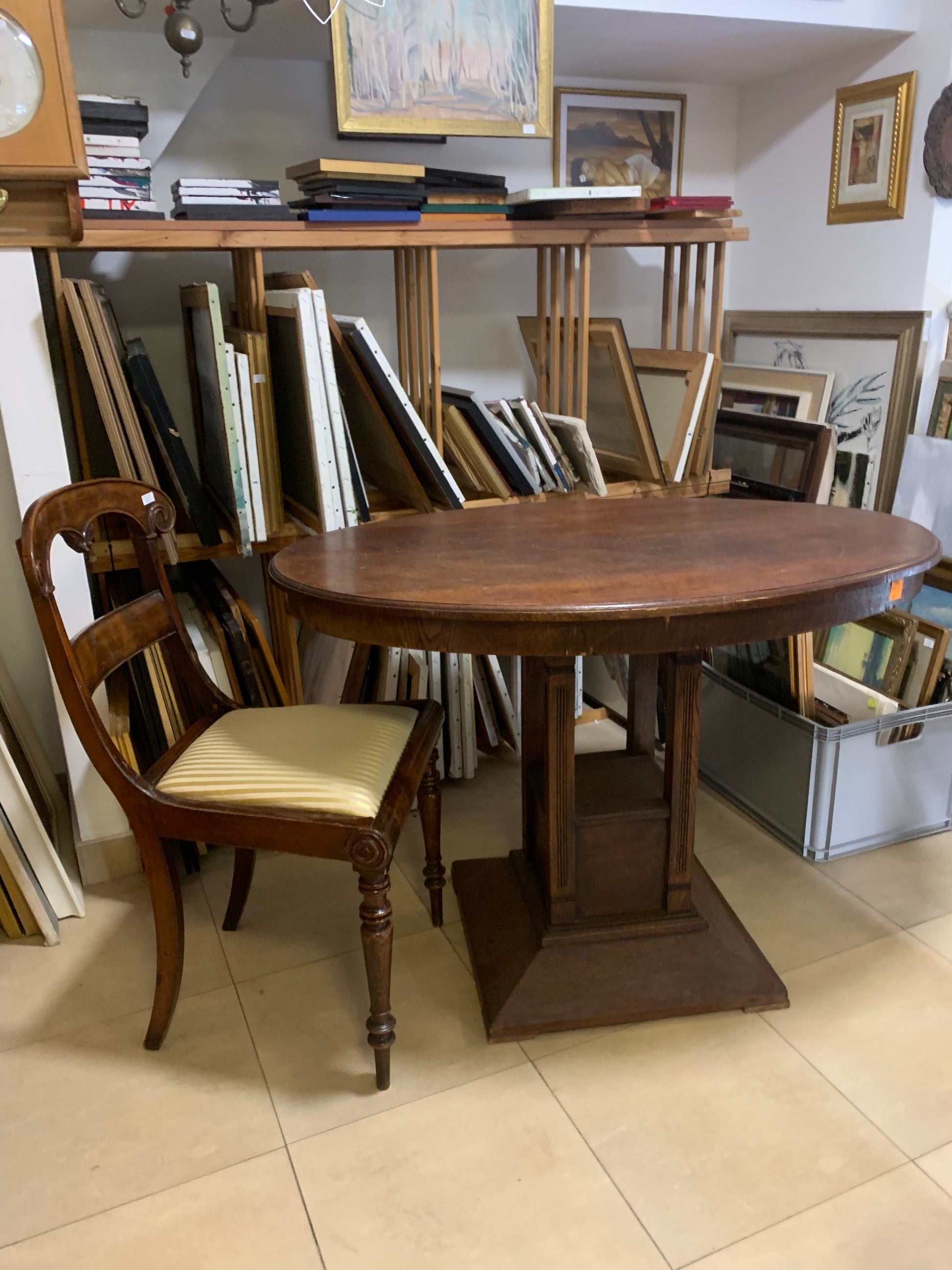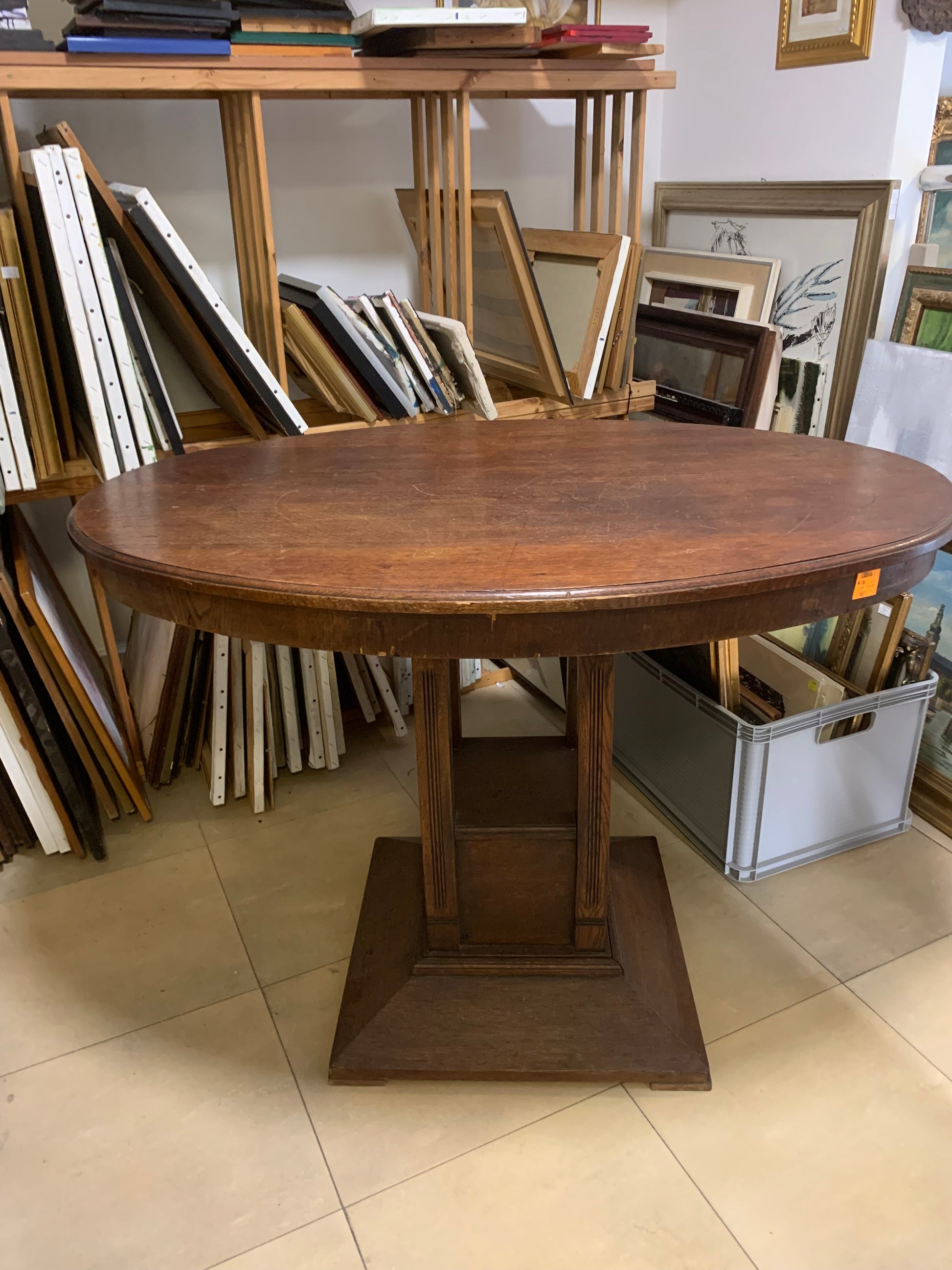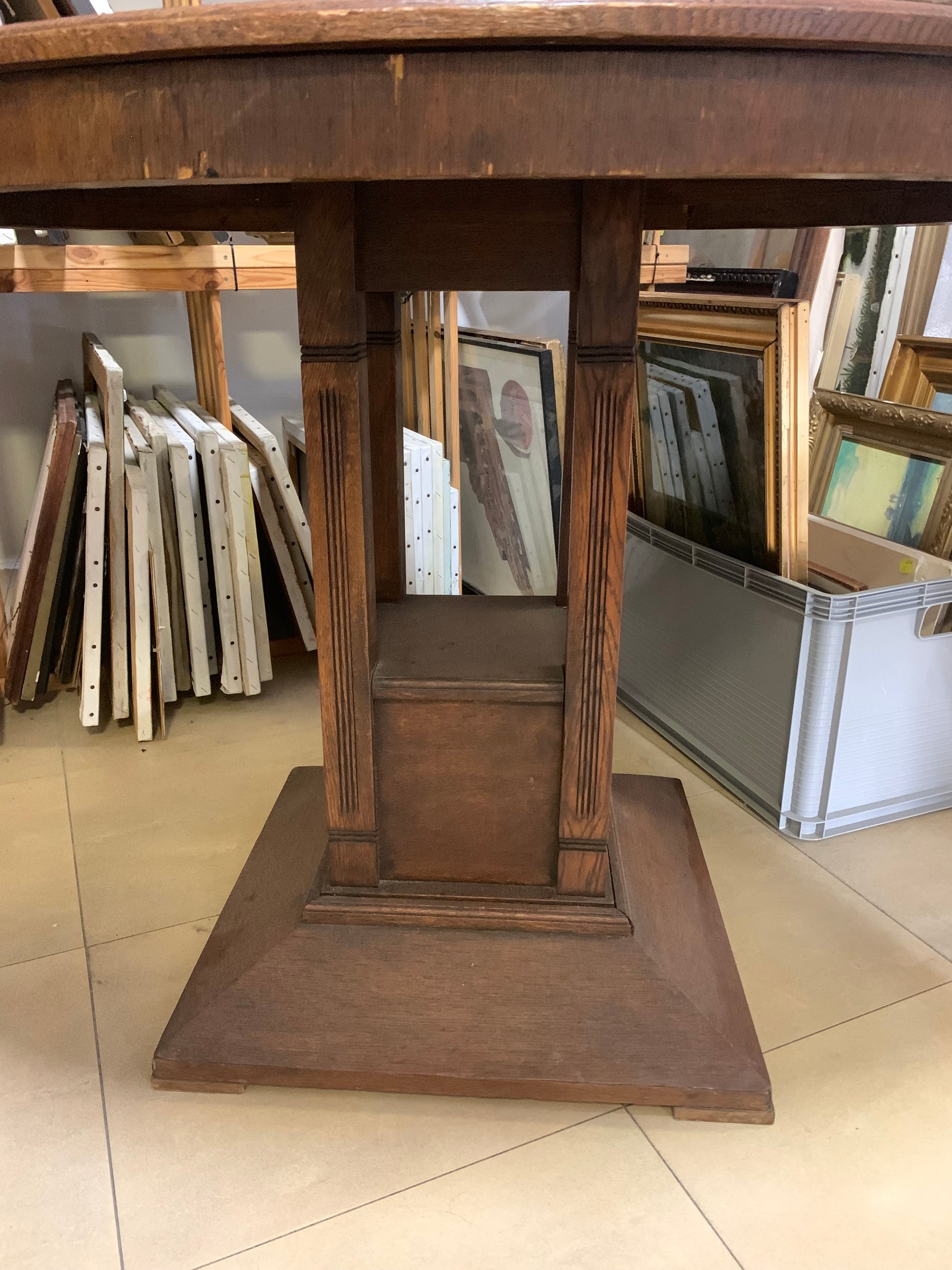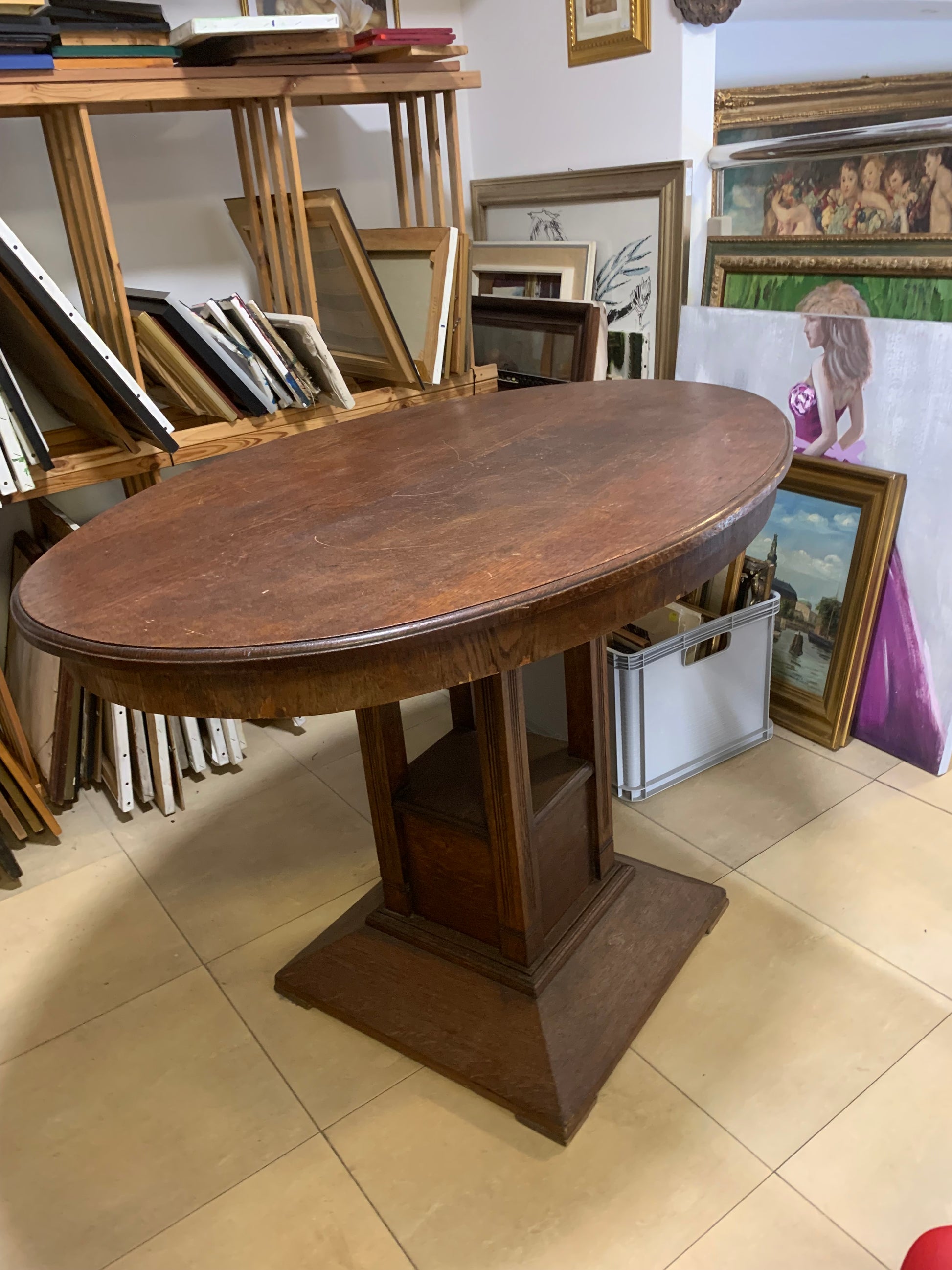 Stół owalny, kolonialny, dębowy z masywną, kwadratową podstawą. Solidny stół obiadowy na 4 osoby w stanie dobrym, blat do odświeżenia.