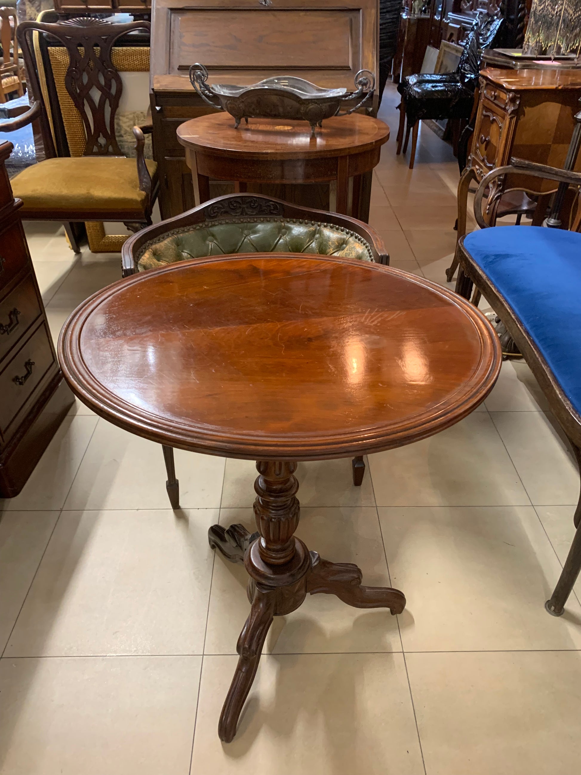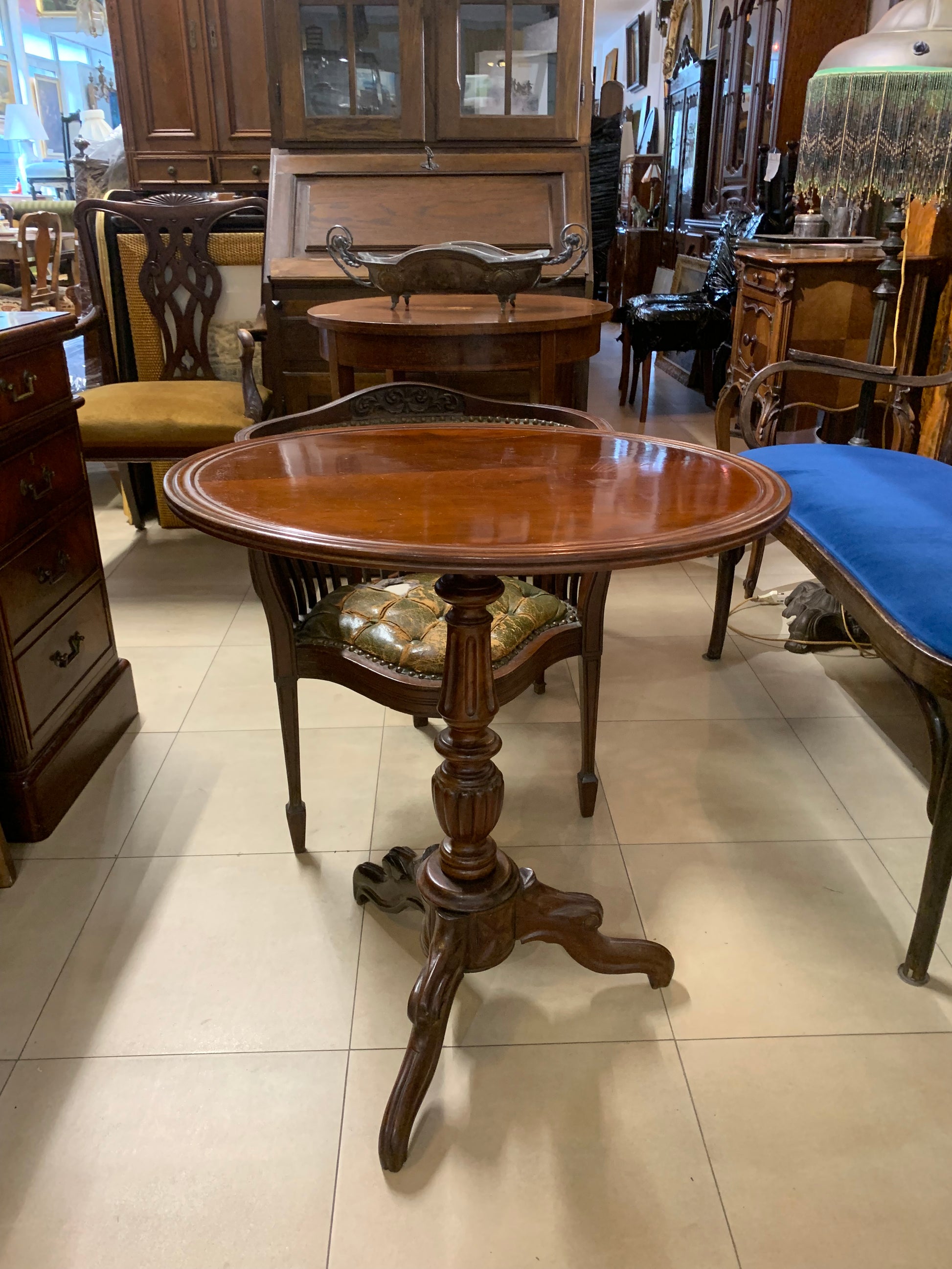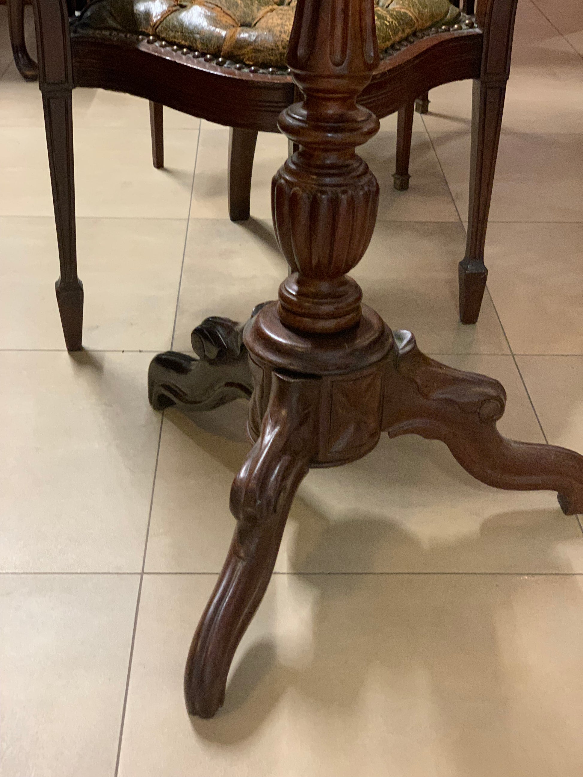 Stolik kawowy, okrągły, z mahoniu, przedwojenny, na jednej, rzeźbionej nodze.
