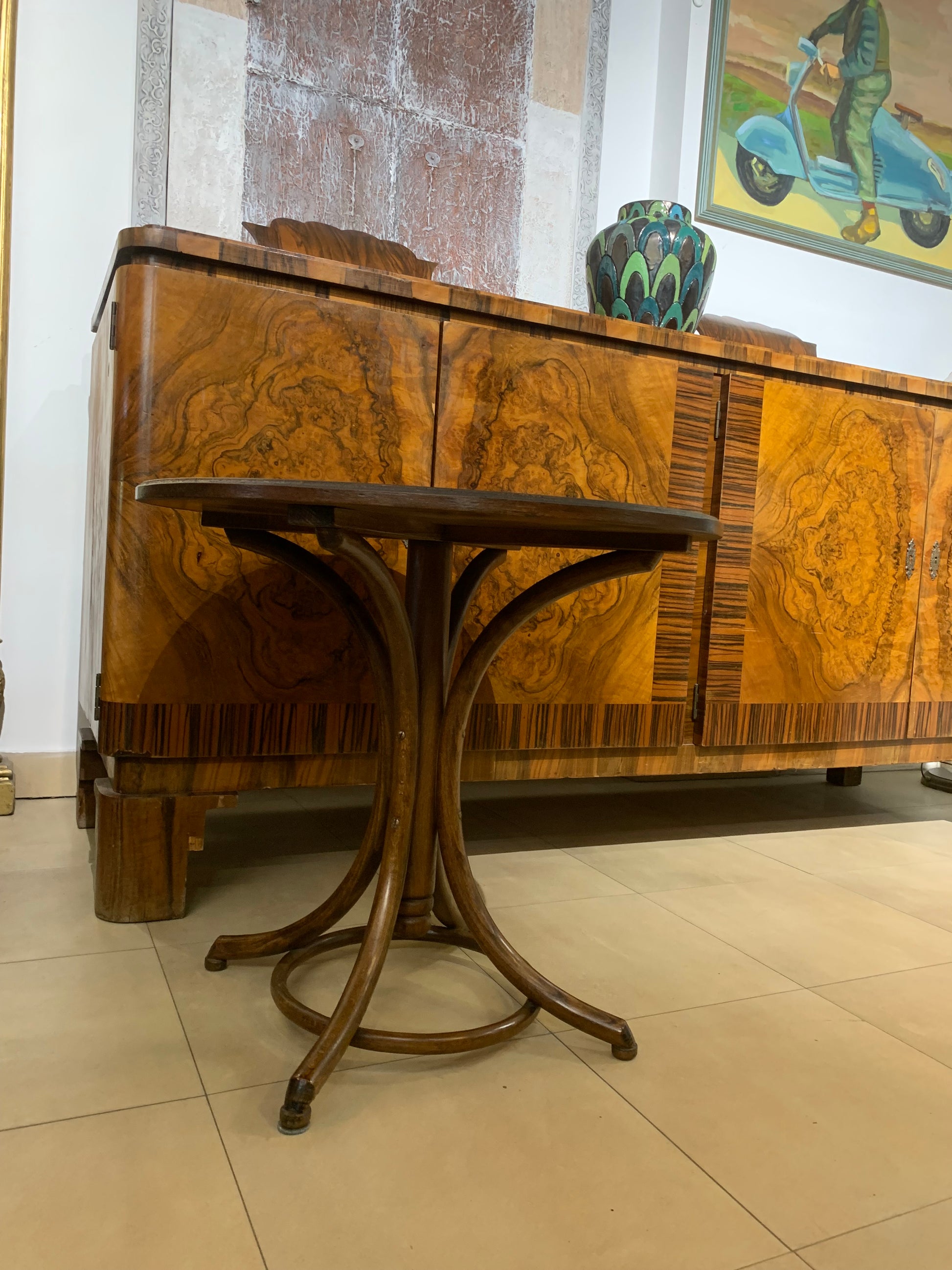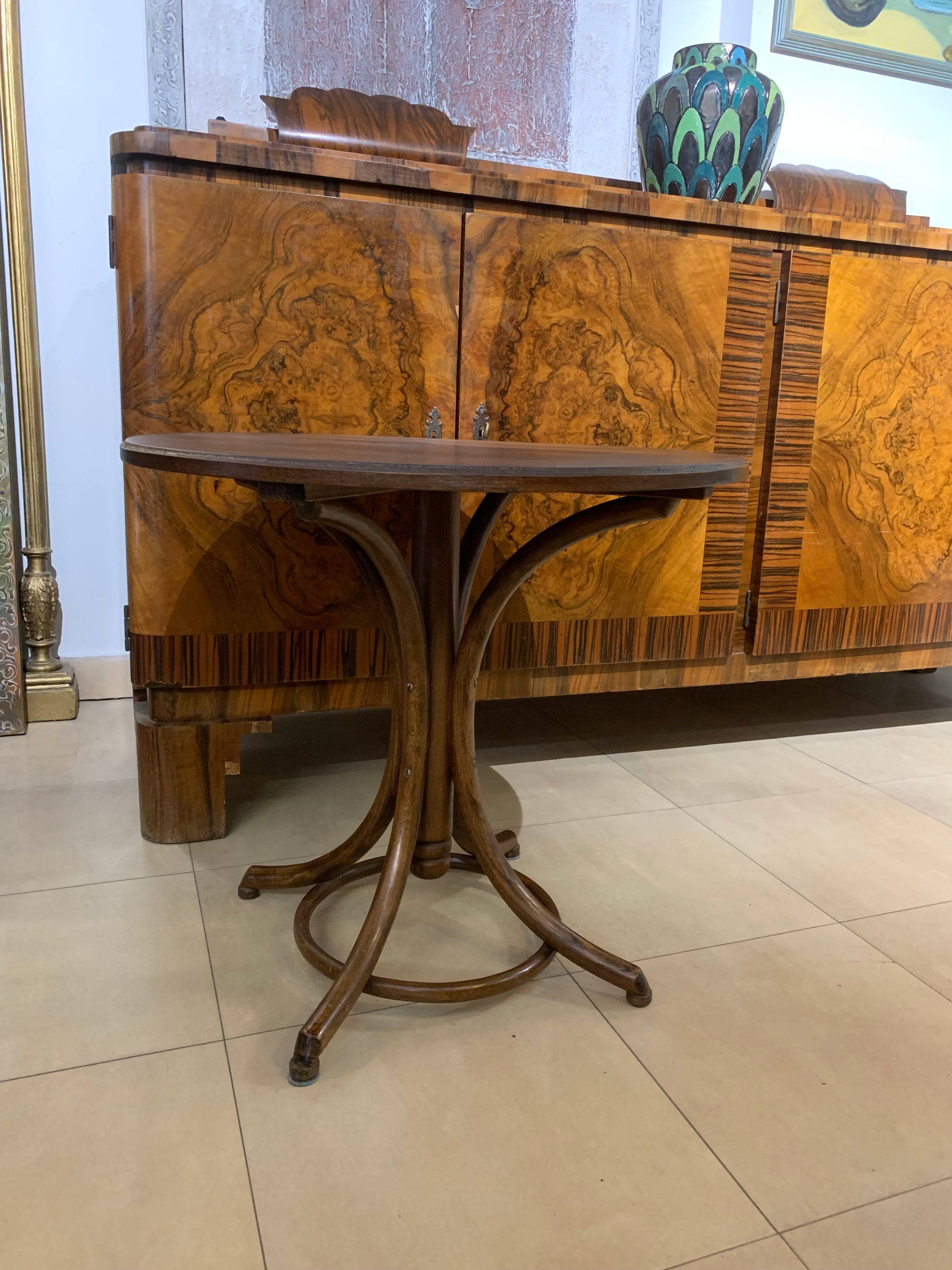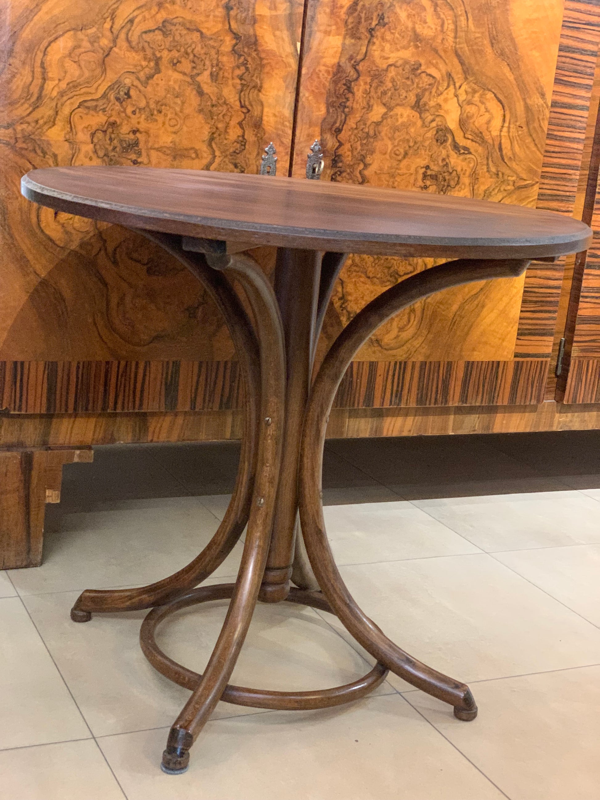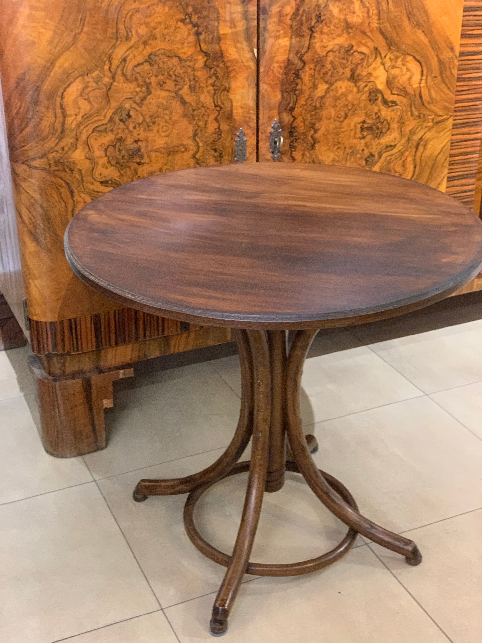 Stolik kawowy, okrągły Thonet, drewniany mebel gięty z minionego stulecia.