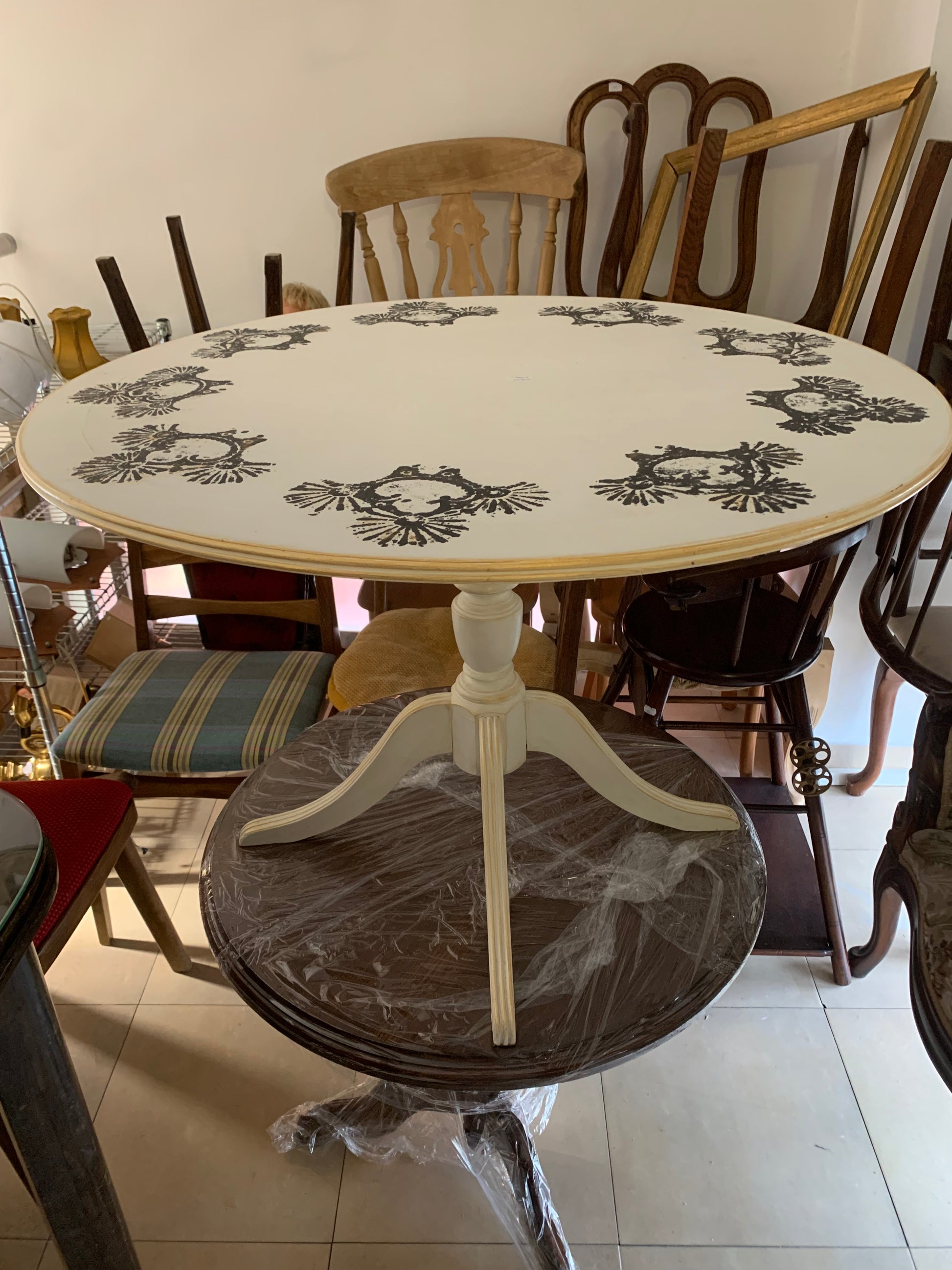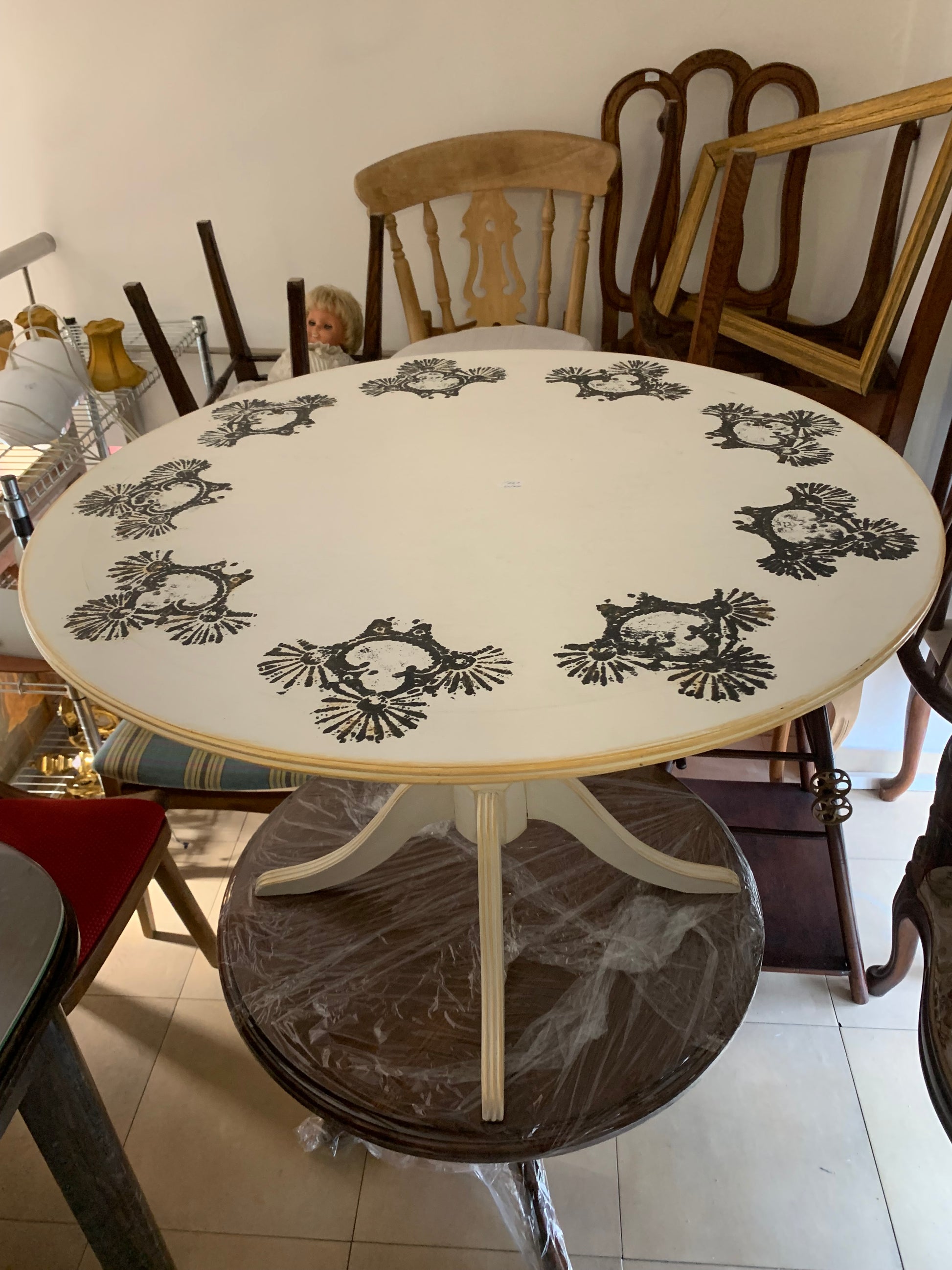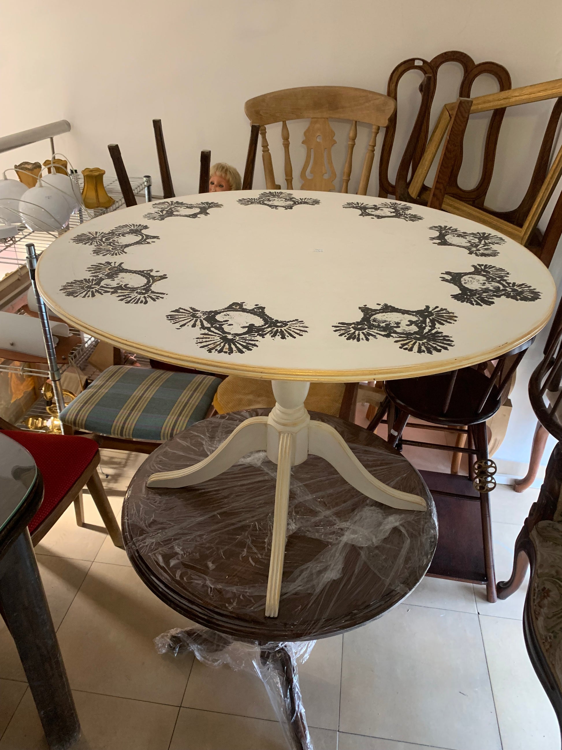 Śliczny stolik okrągły, kawowy z drewna, na jednej nóżce, ręcznie malowany, zdobiony wzorem orientalnym.