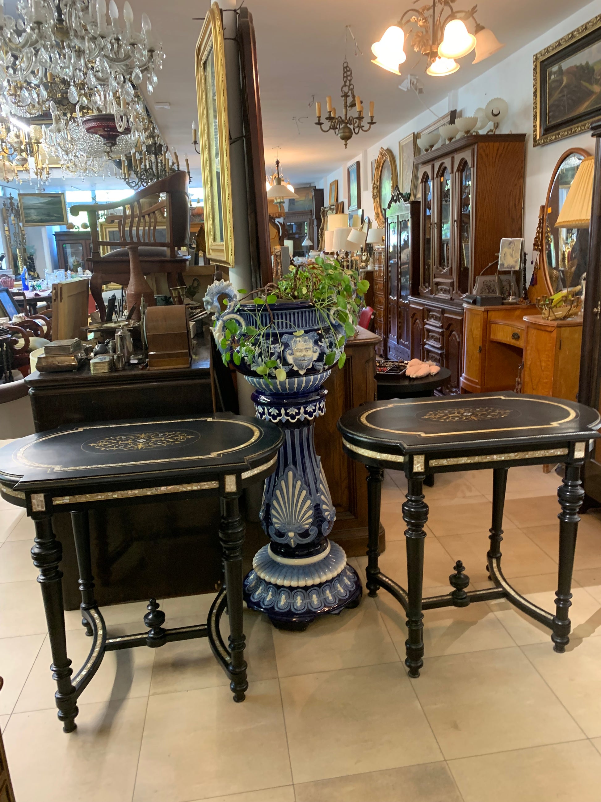 Eleganckie połączenie czerni ze złotymi akcentami. W ofercie mamy 2 identyczne stoliki po renowacji. Cena za 1 stolik.