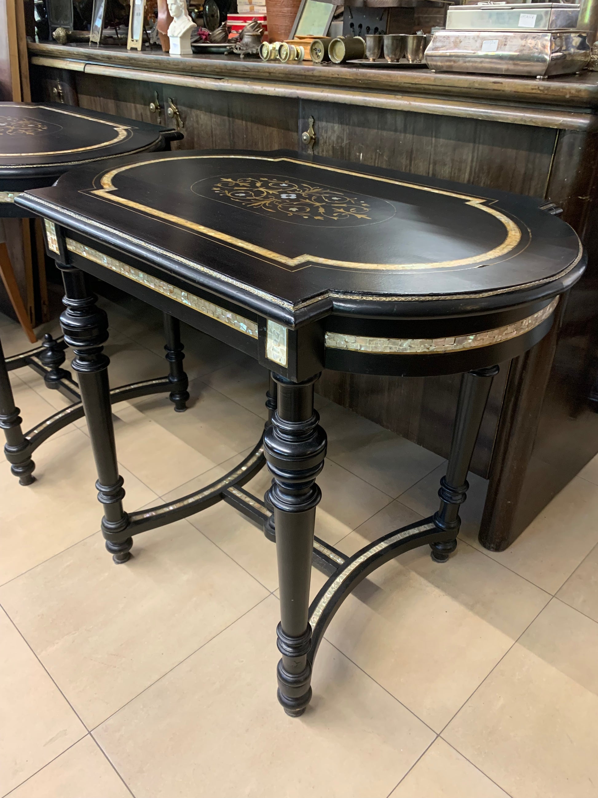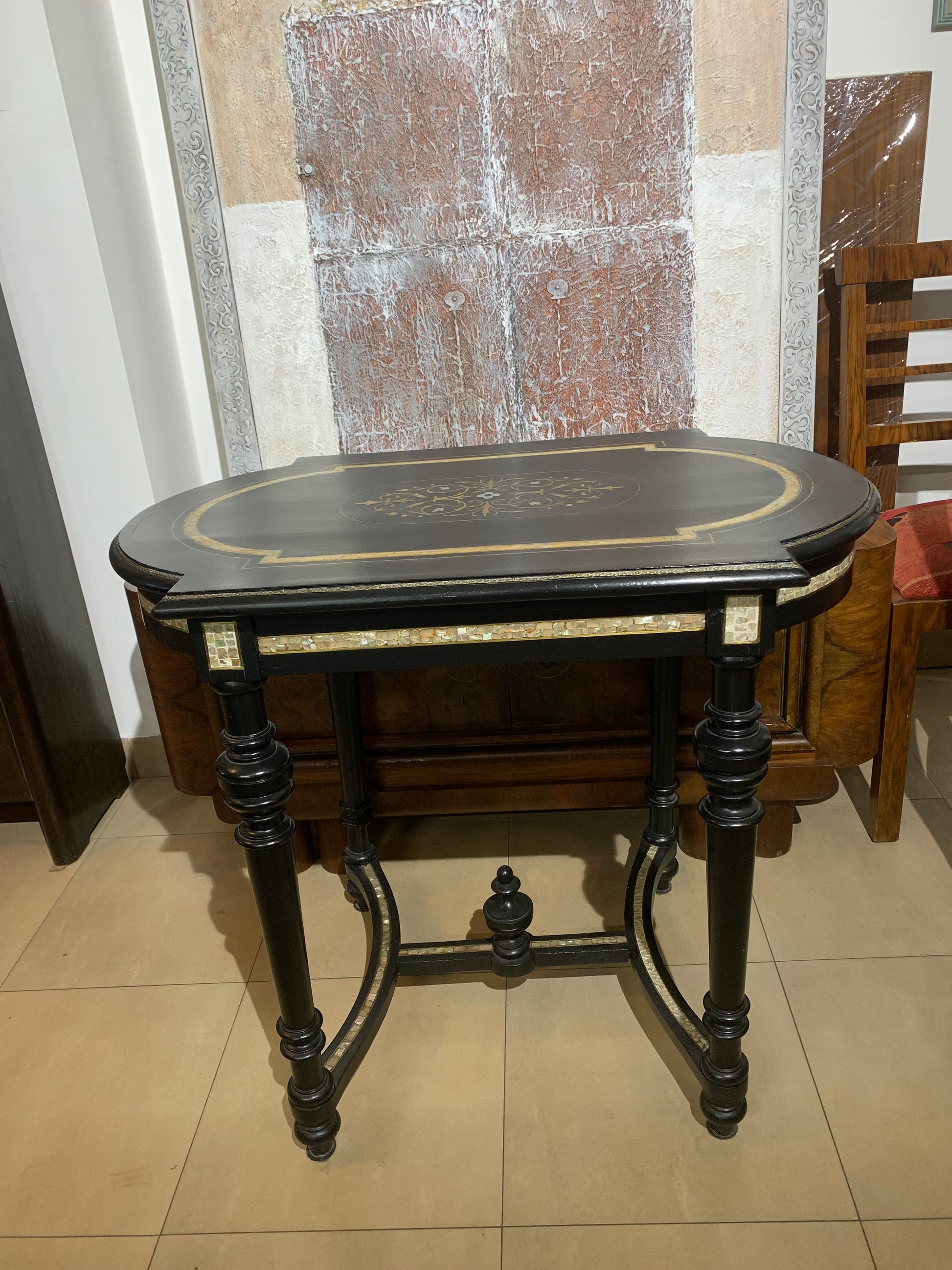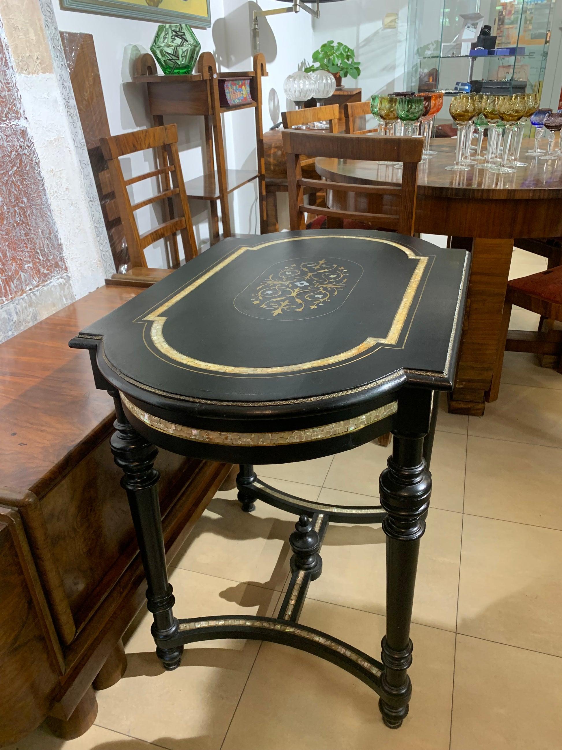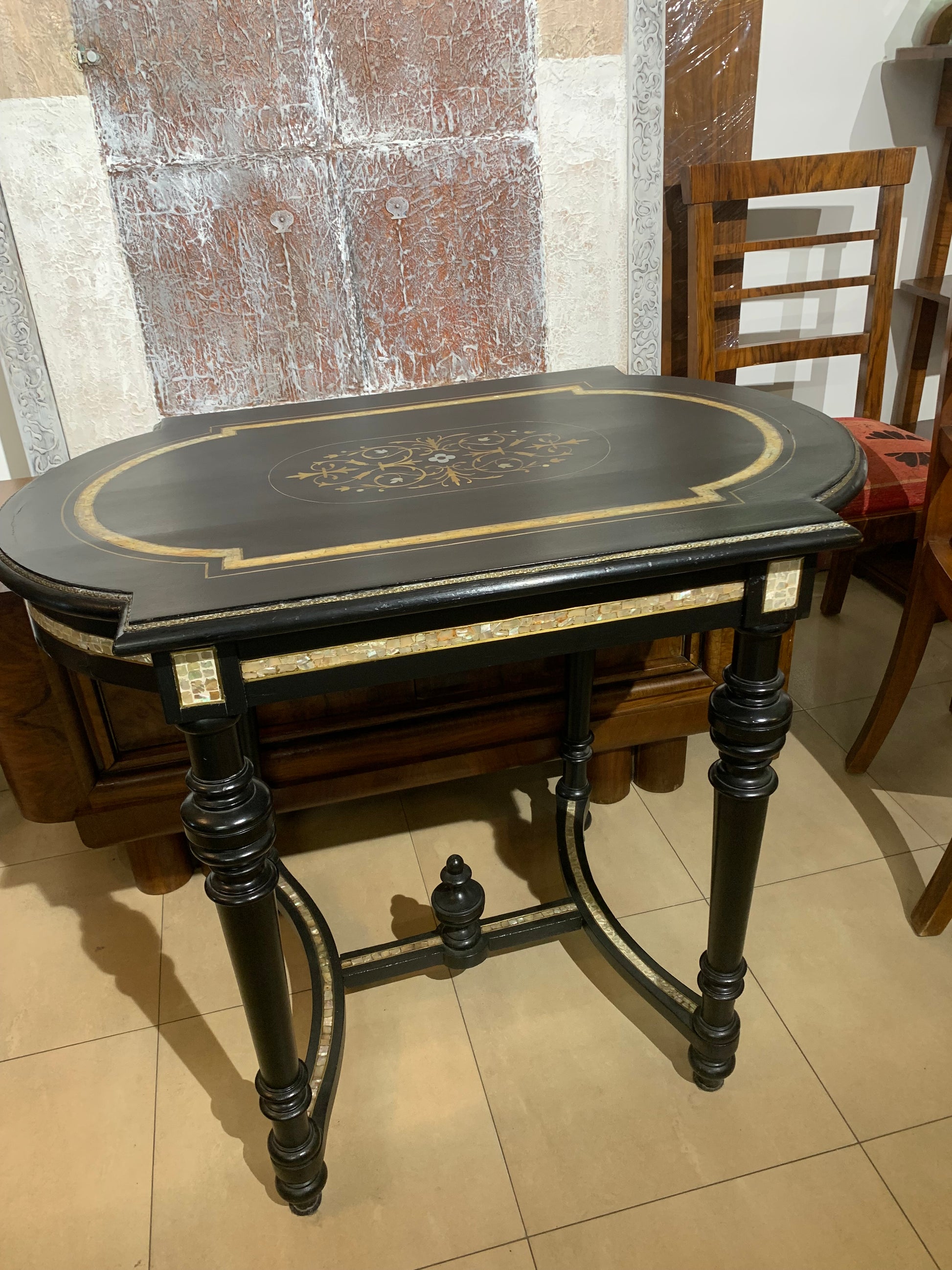 Stolik do pisania listów Napoleon III wykonany z brzozy lub jaworu bejcowany na czarno naśladującej heban, inkrustowany macicą perłową, wzory kwiatowe i żyłki z mosiądzu.