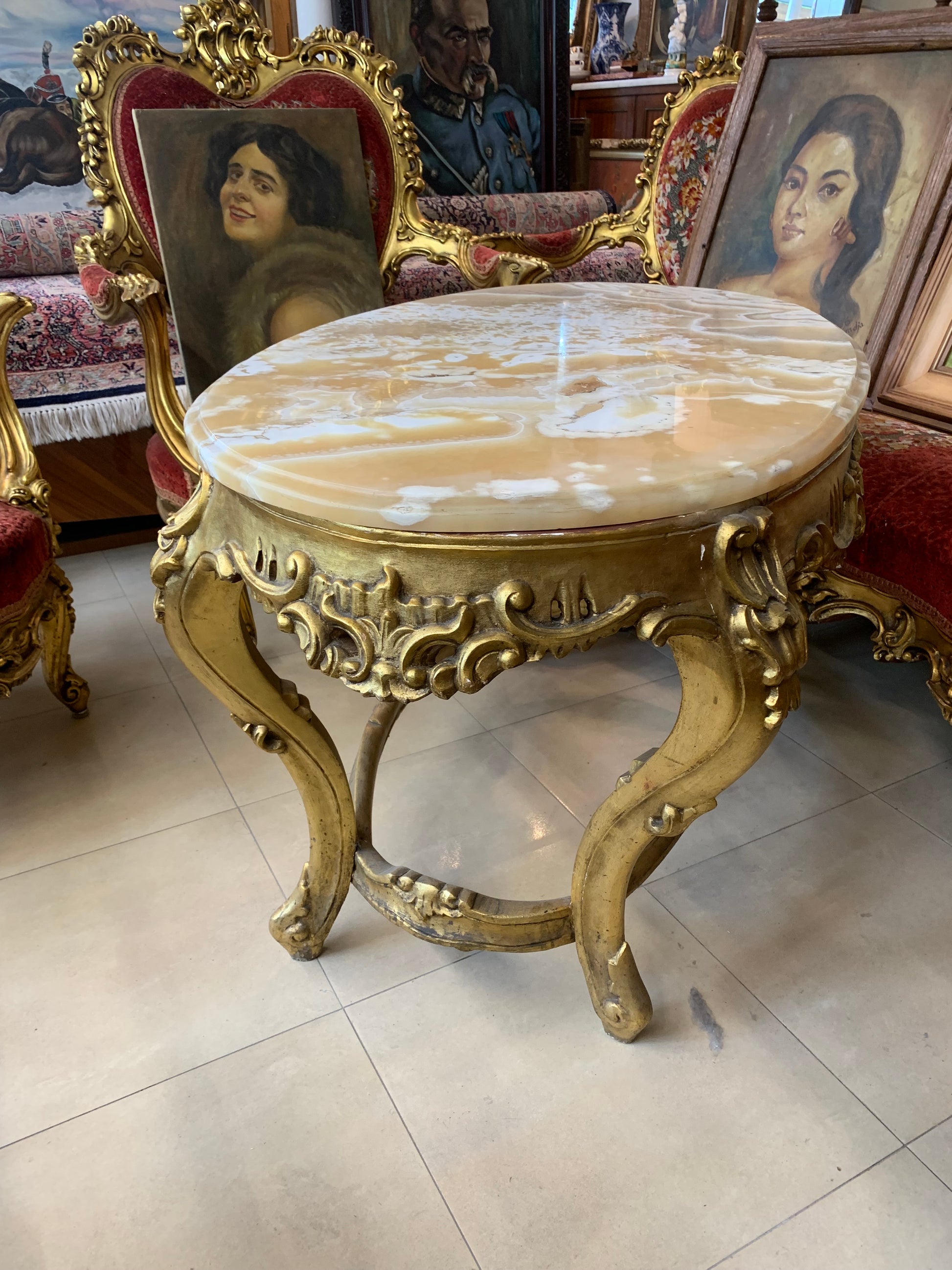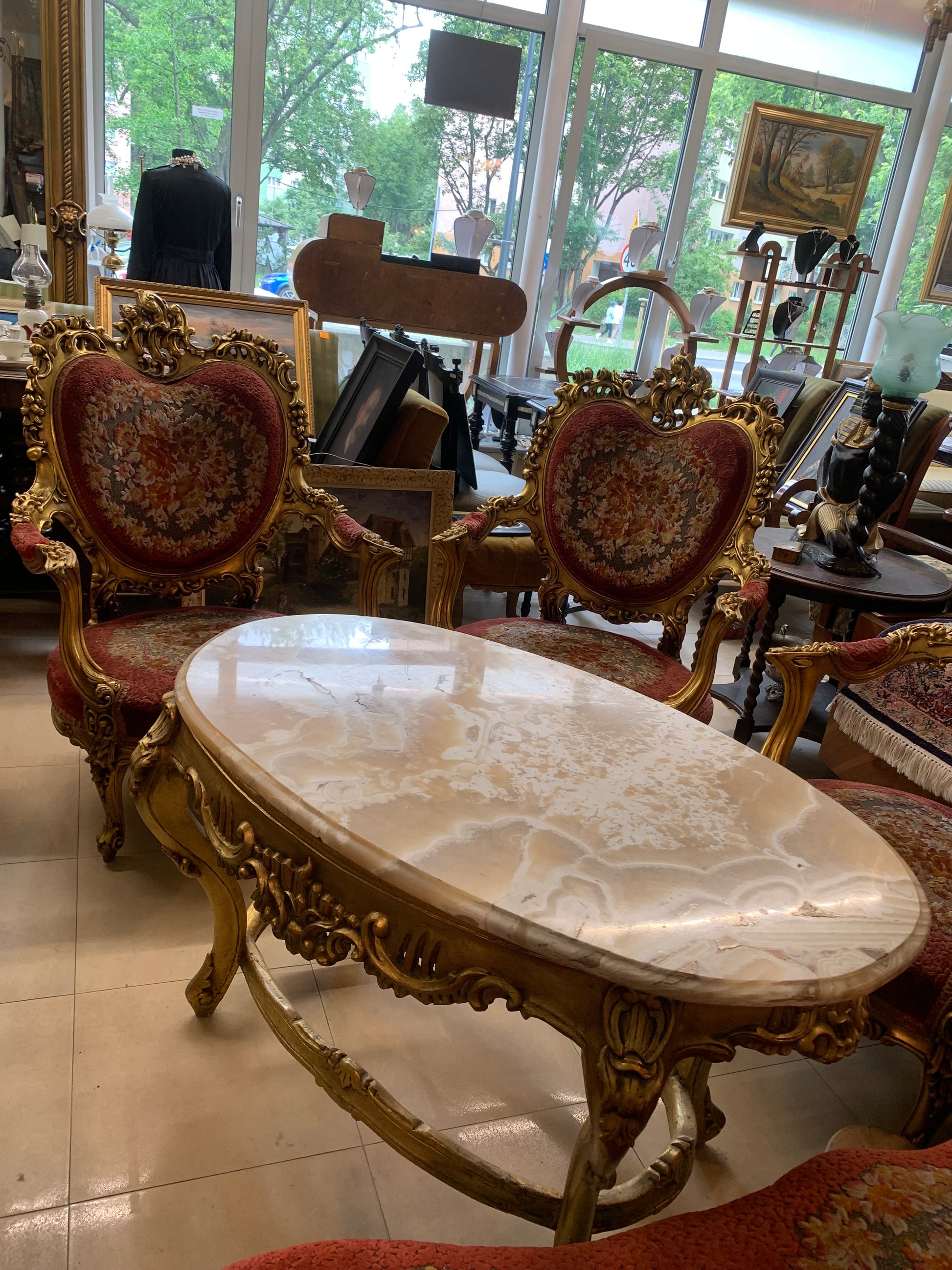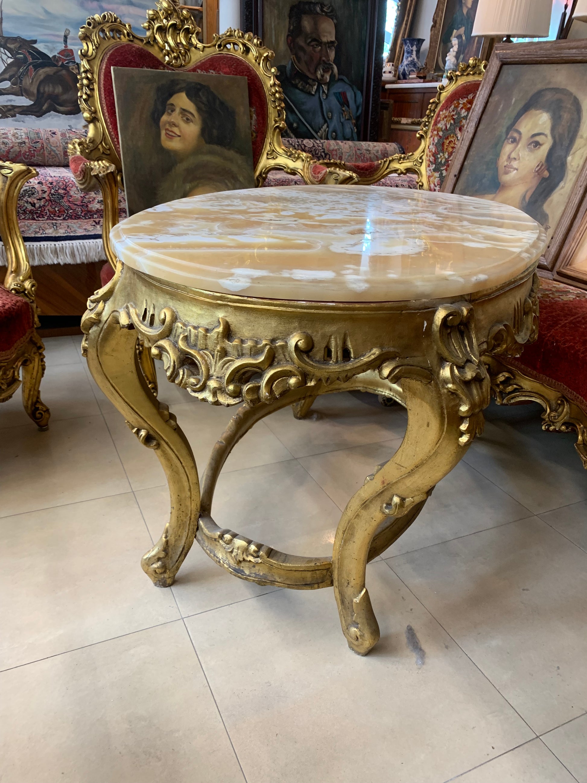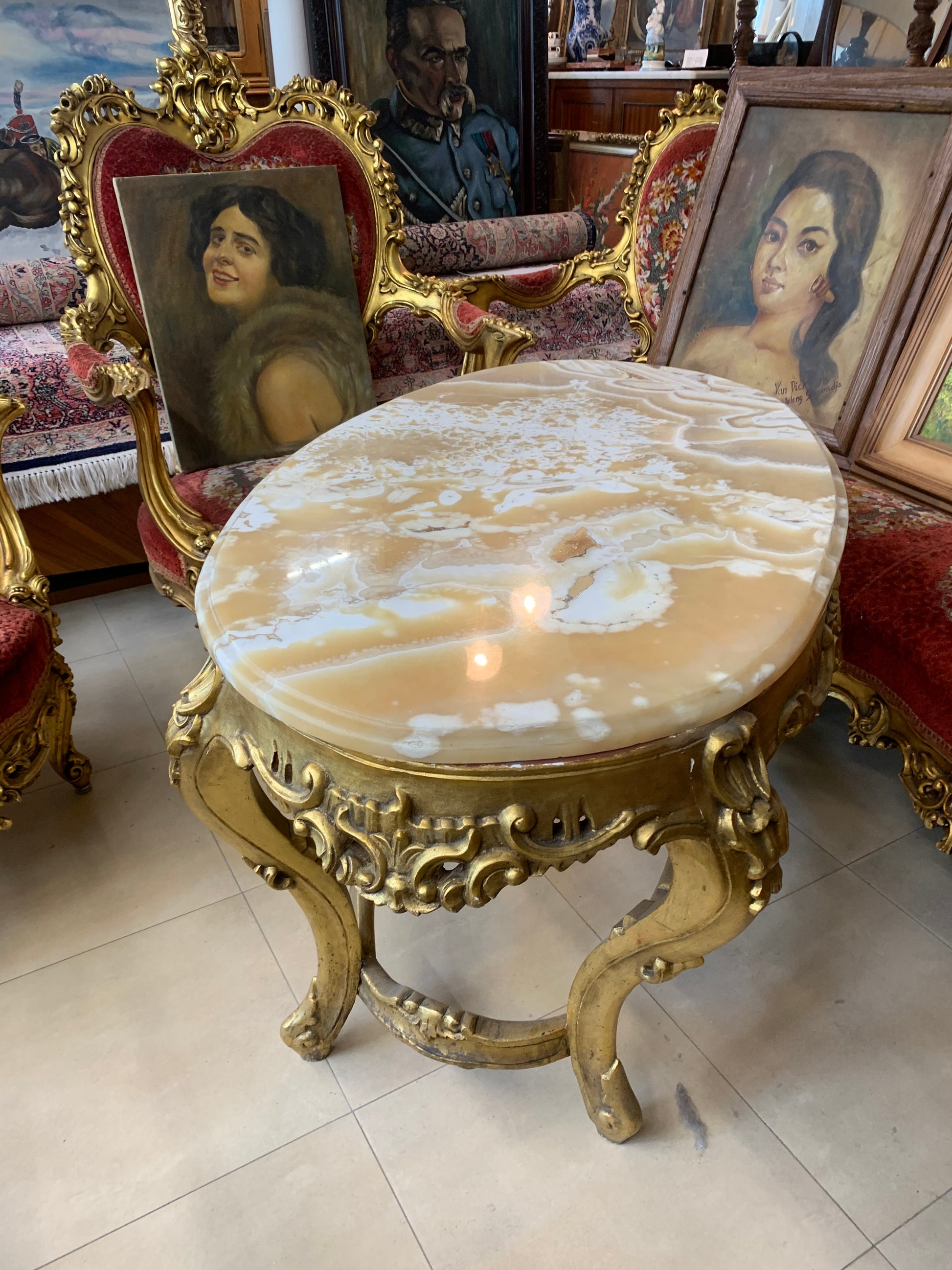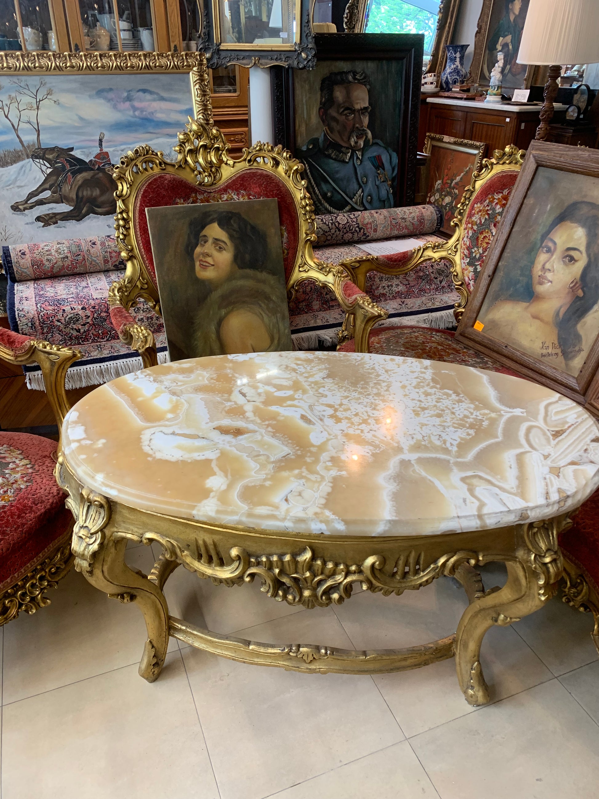 Stylowy stolik owalny, kawowy z kamiennym blatem. Nóżki drewniane, rzeźbione, blat z marmuru w kolorze beżowo-białym. Stan : dobry.