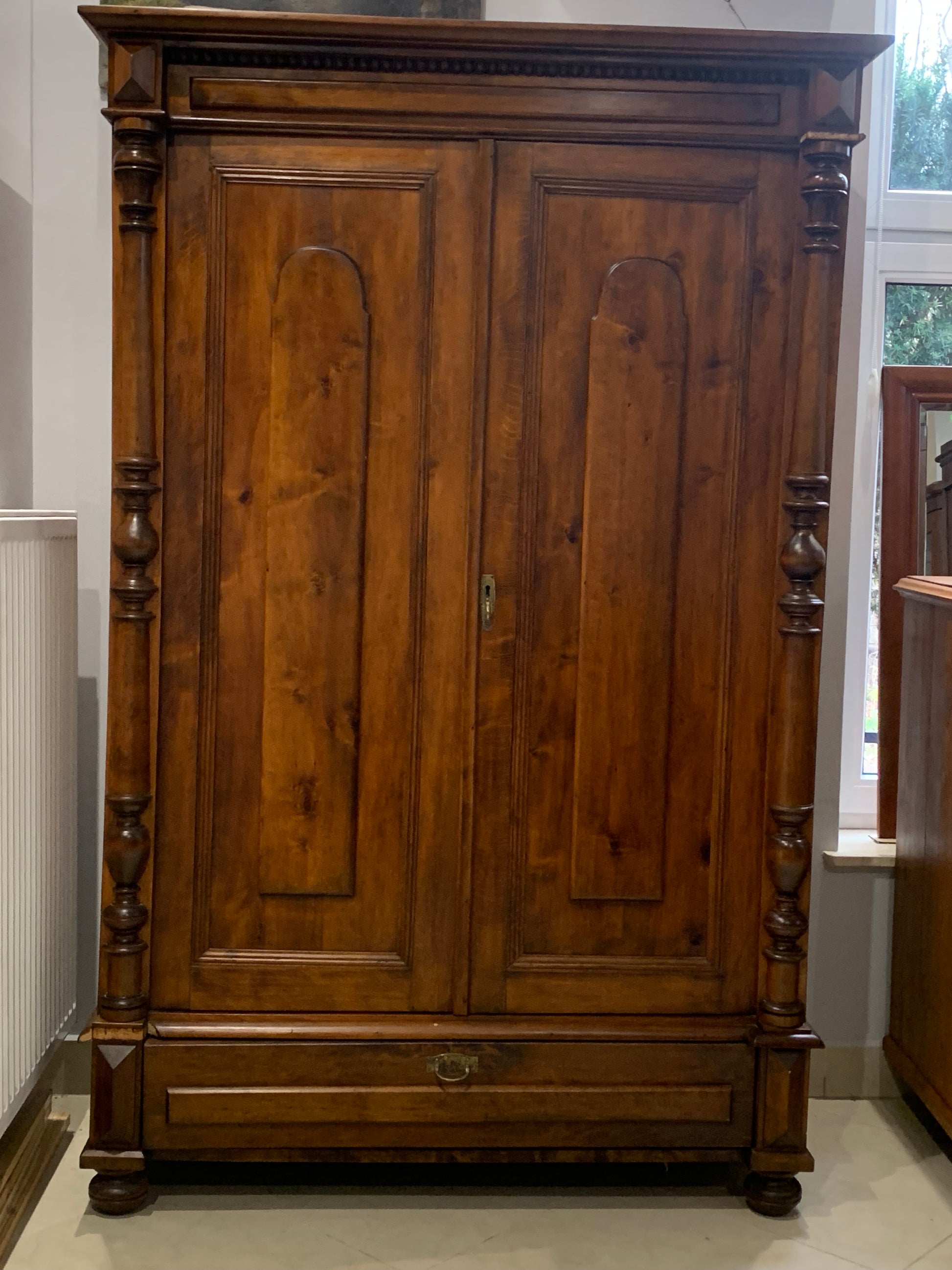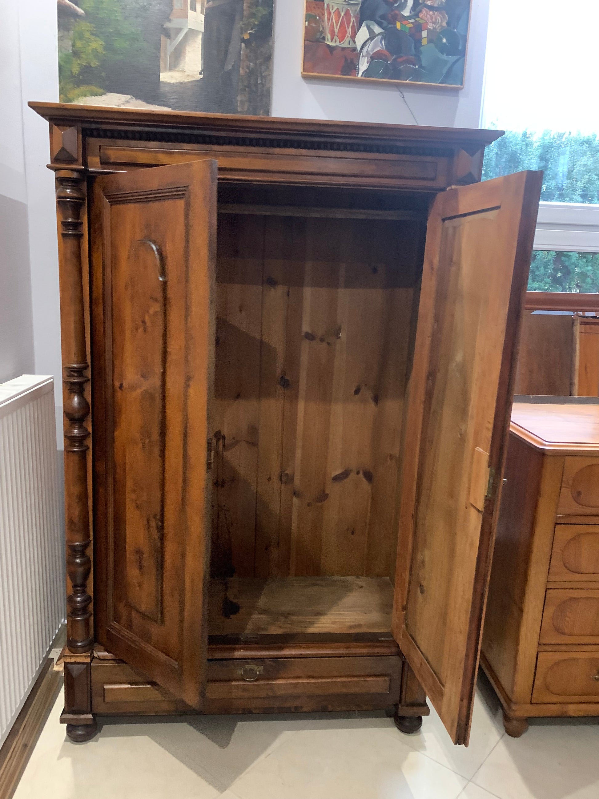 Szafa 2-drzwiowa drewniana, eklektyczna z XIX w. w dobrym stanie, wyposażona w drążek ubraniowy i szufladę na dole. Możliwy transport.