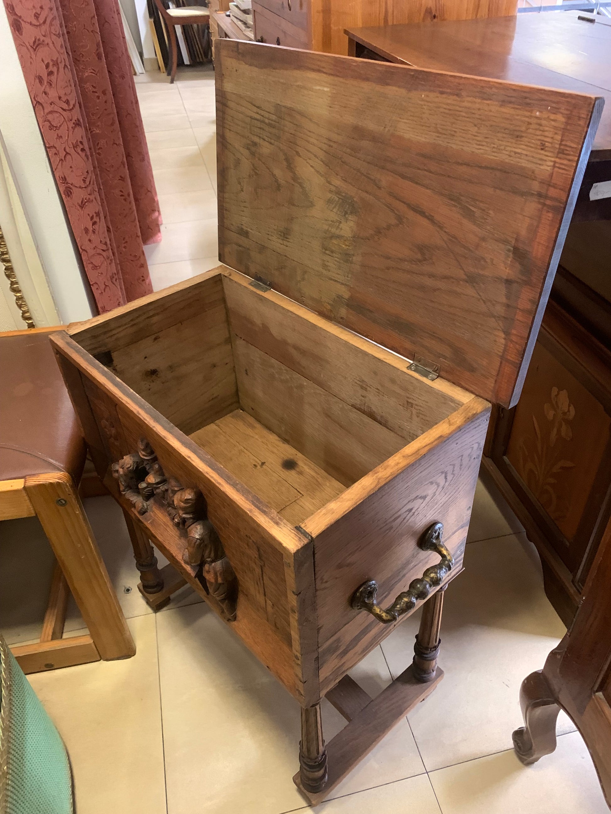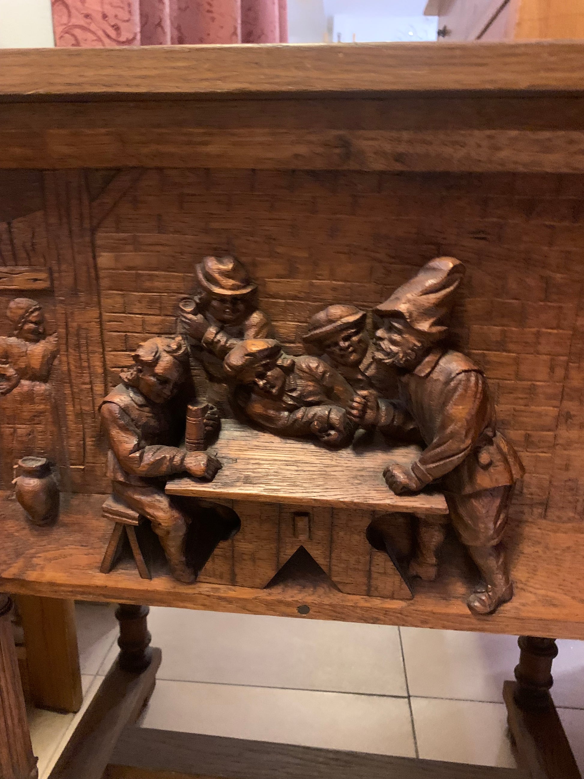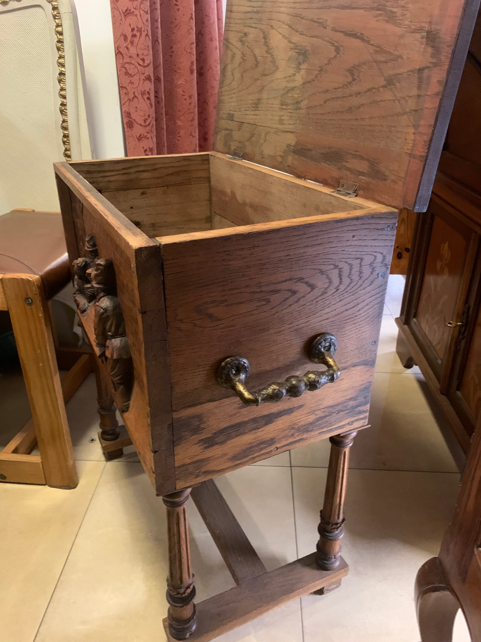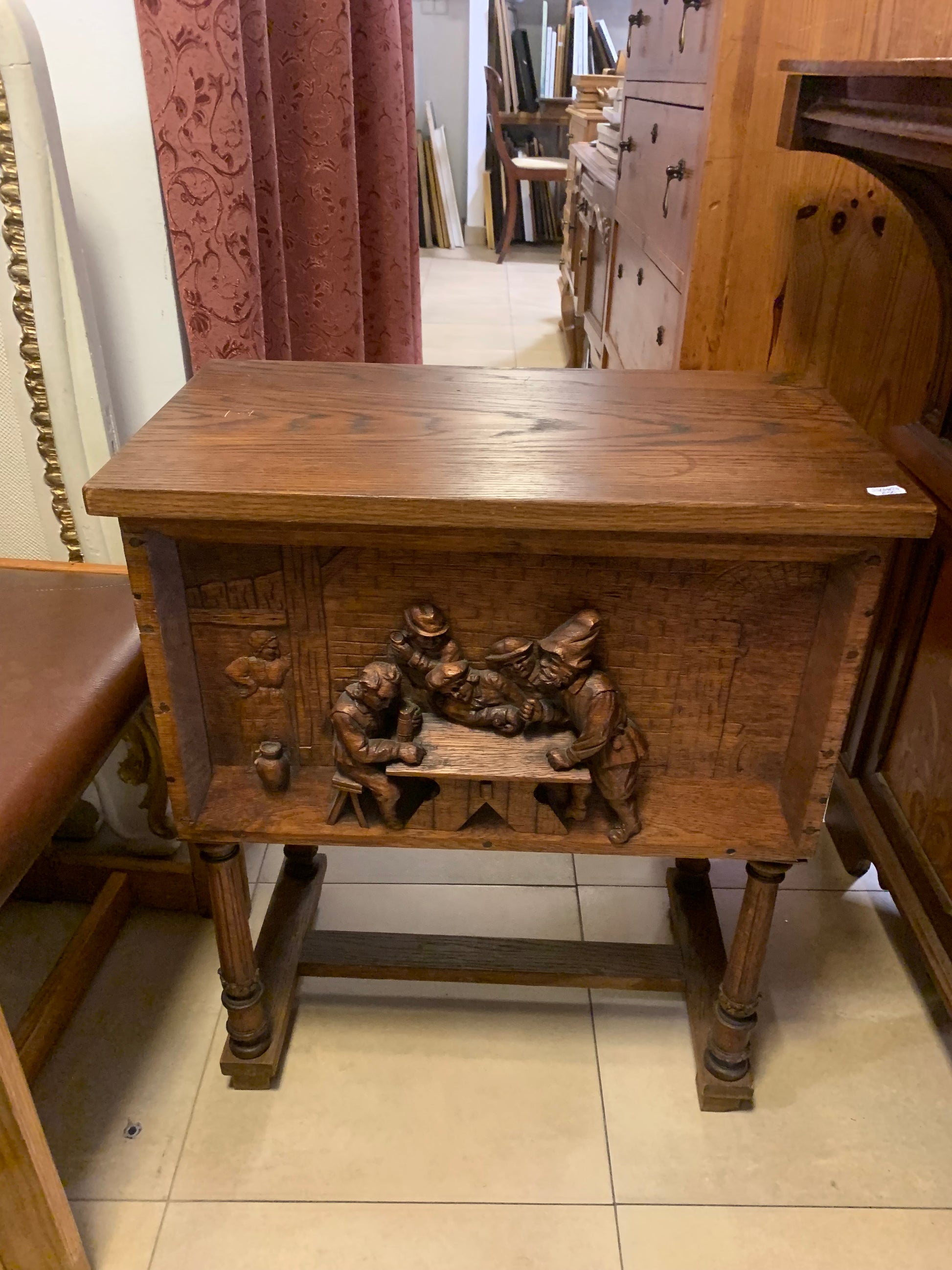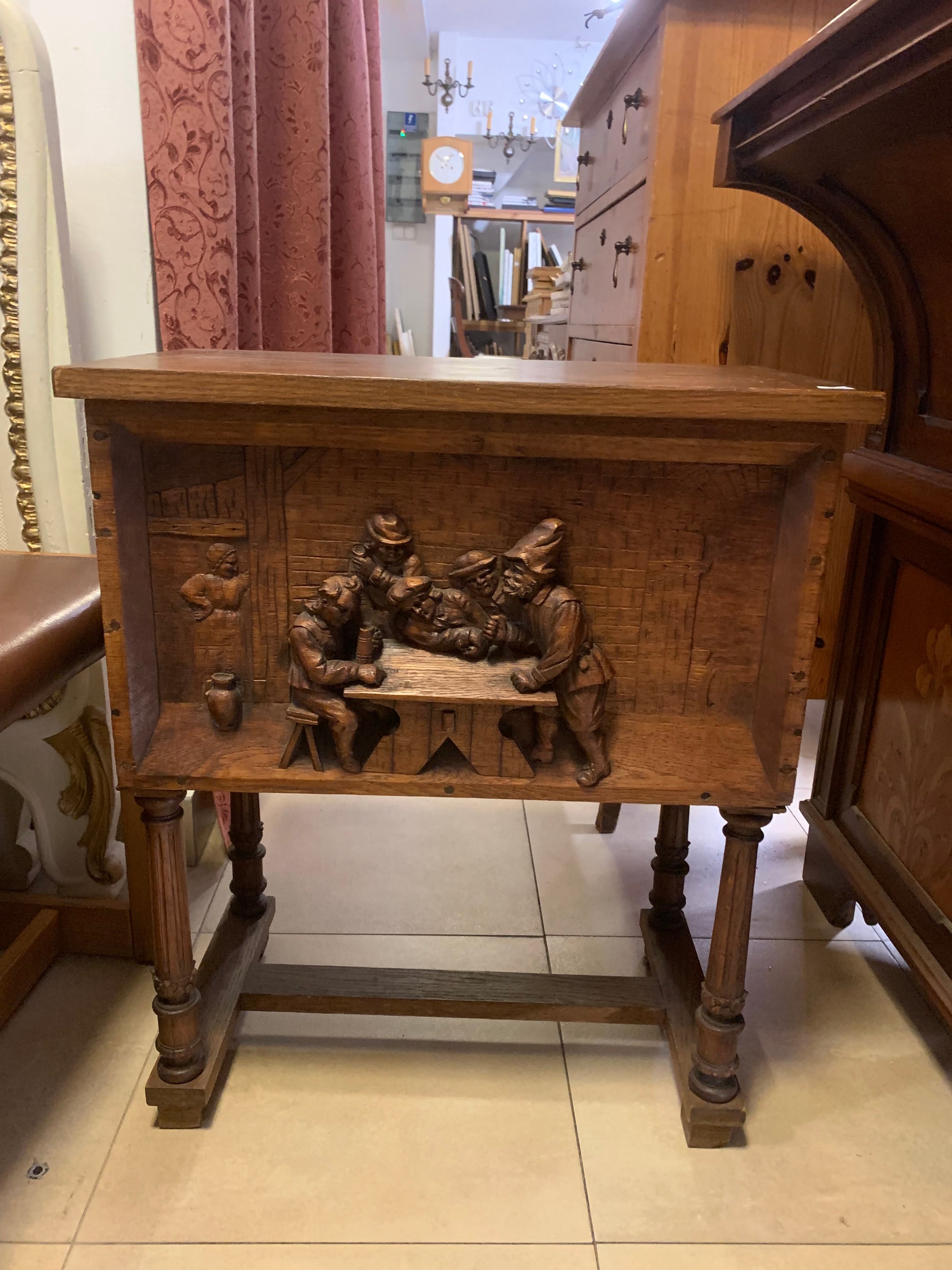 Szafka stylowa, z rzeźbieniami, dębowa, ze schowkiem. Na froncie mebla piękna, rzeźbiona scenka rodzajowa, praktyczny, mały mebel do każdego wnętrza.