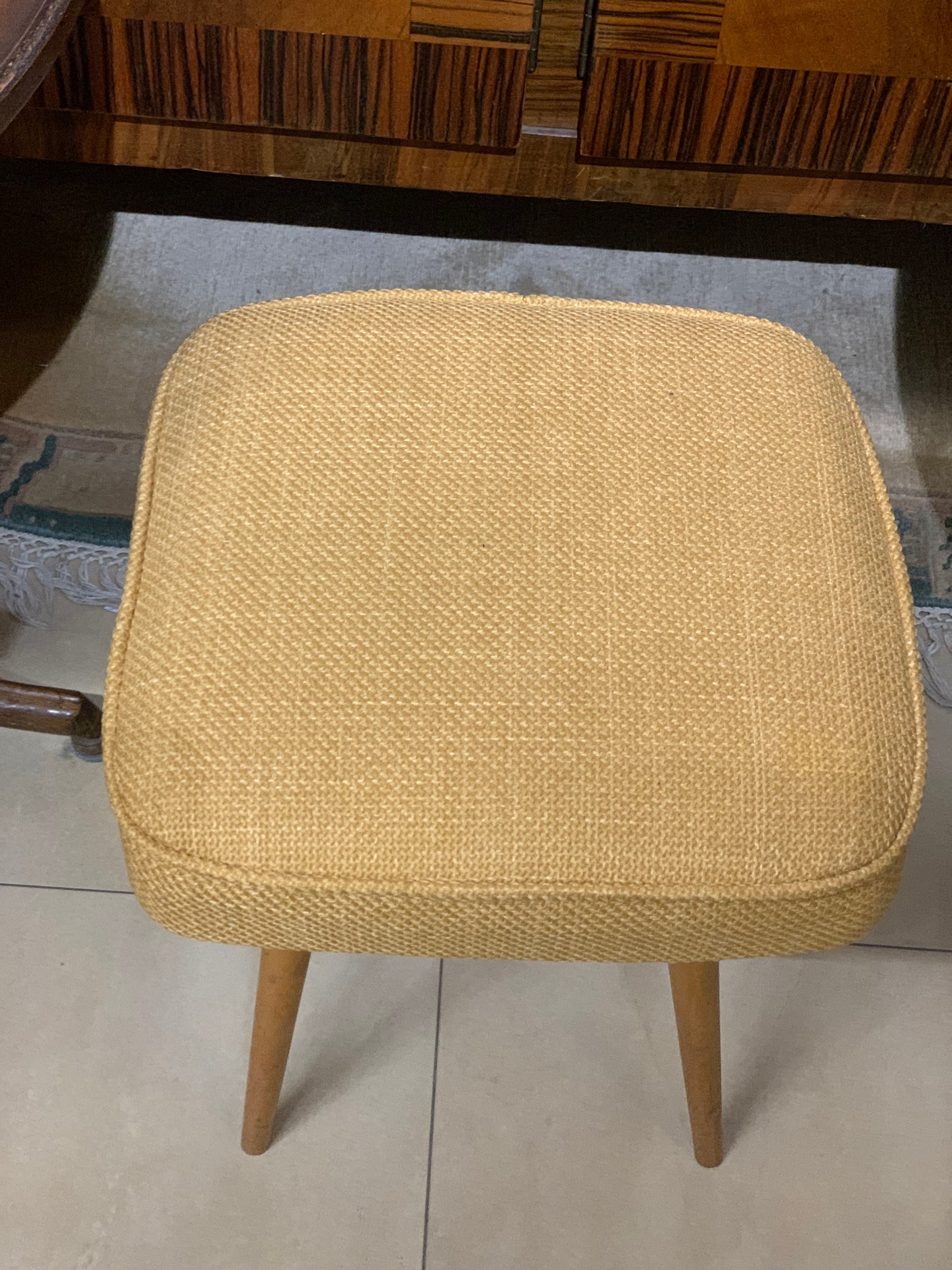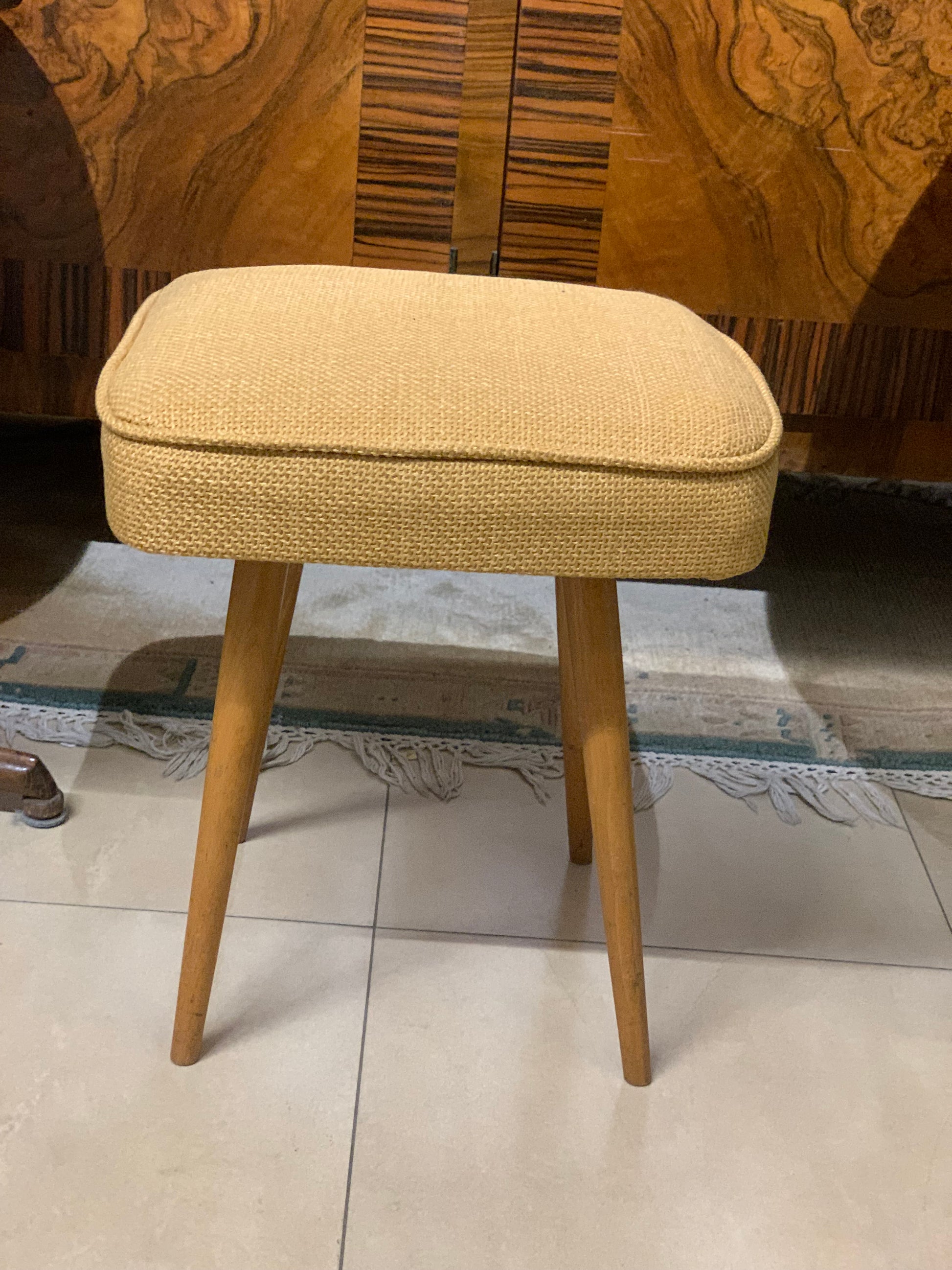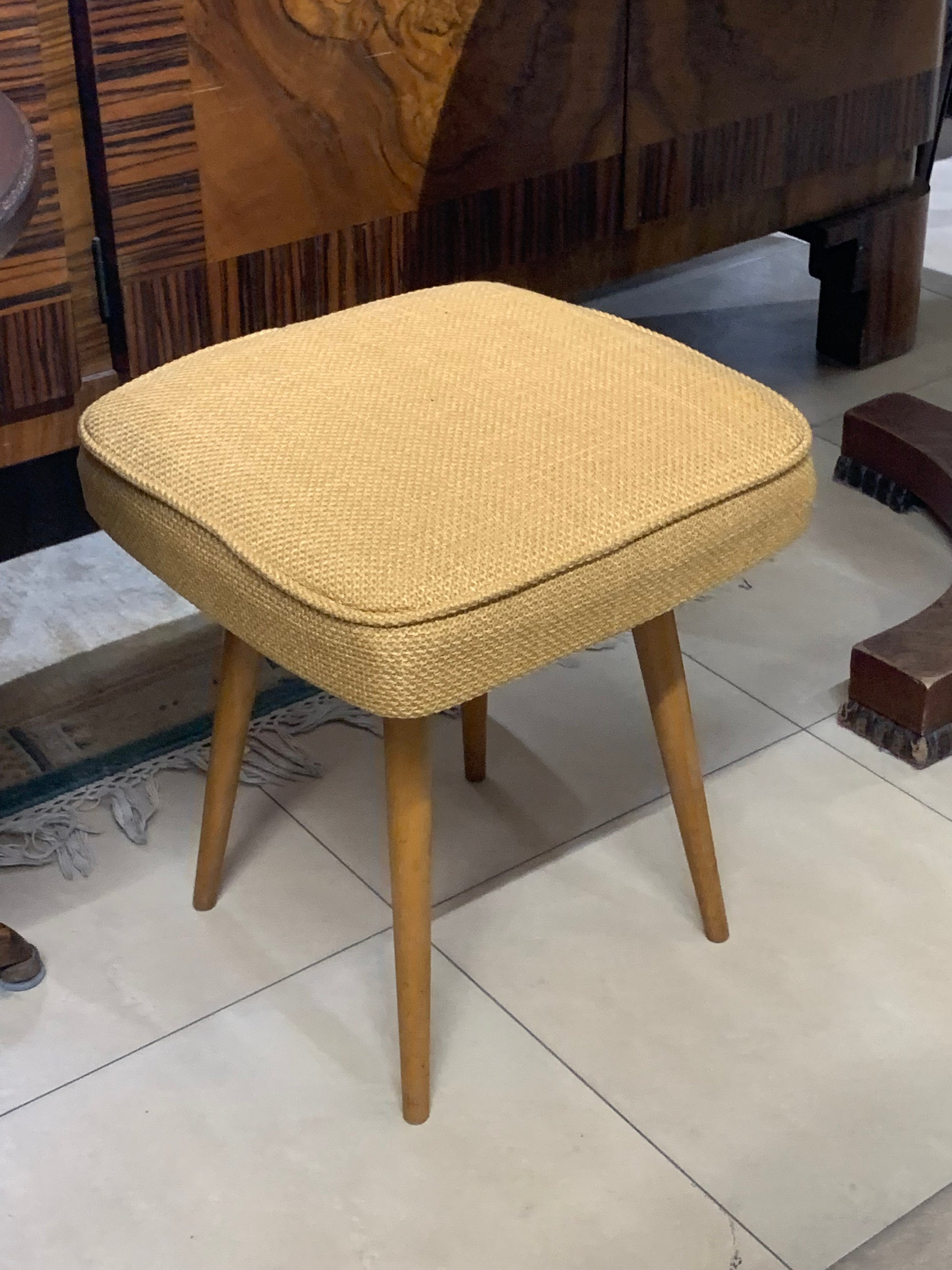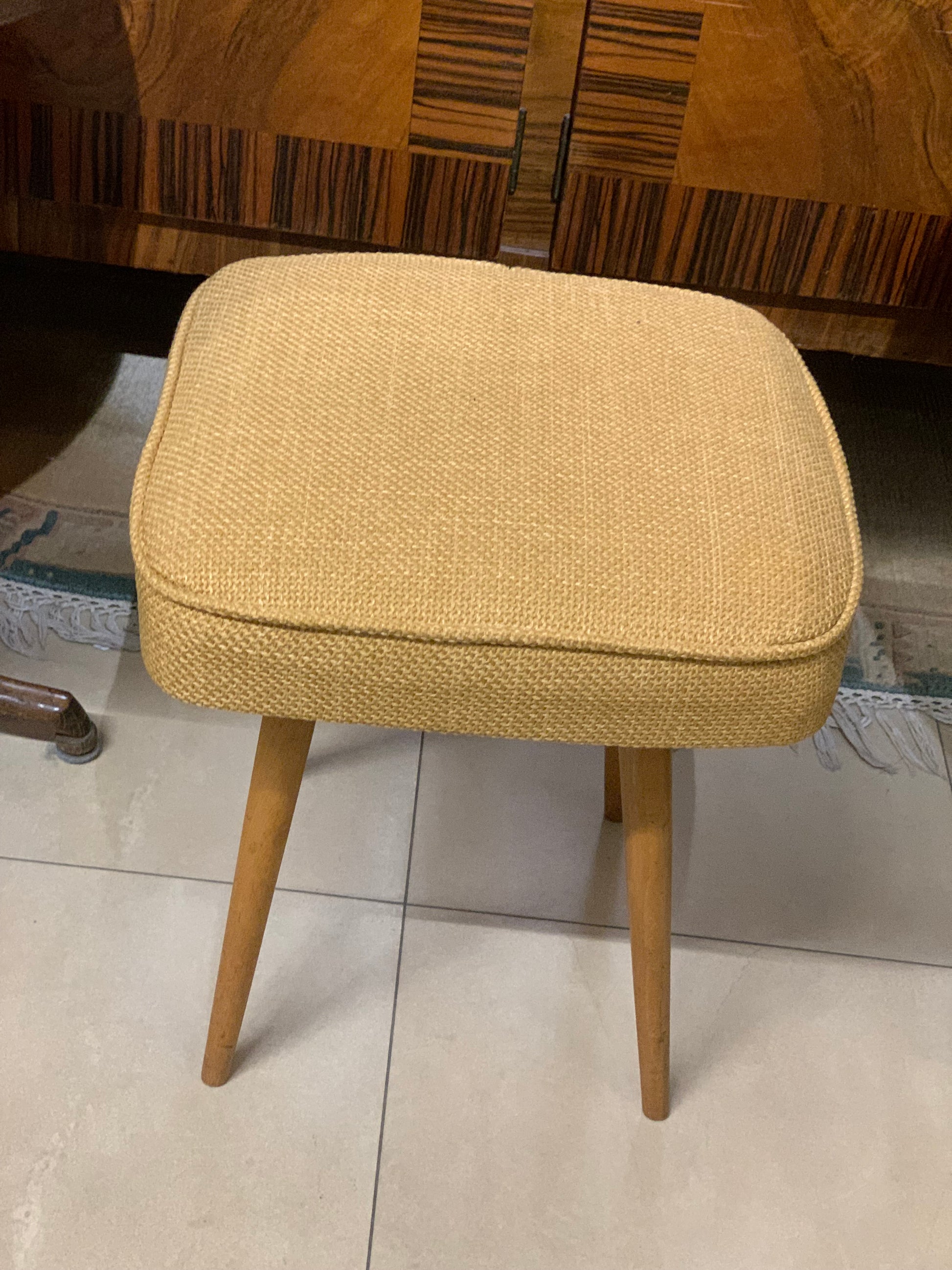 Taboret PRL patyczak, siedzisko gąbka, obicie w kolorze żółtym.