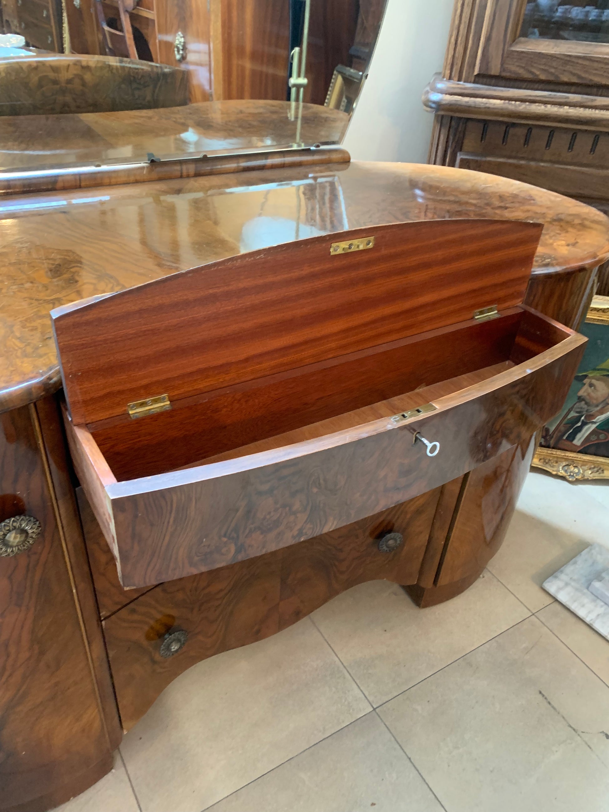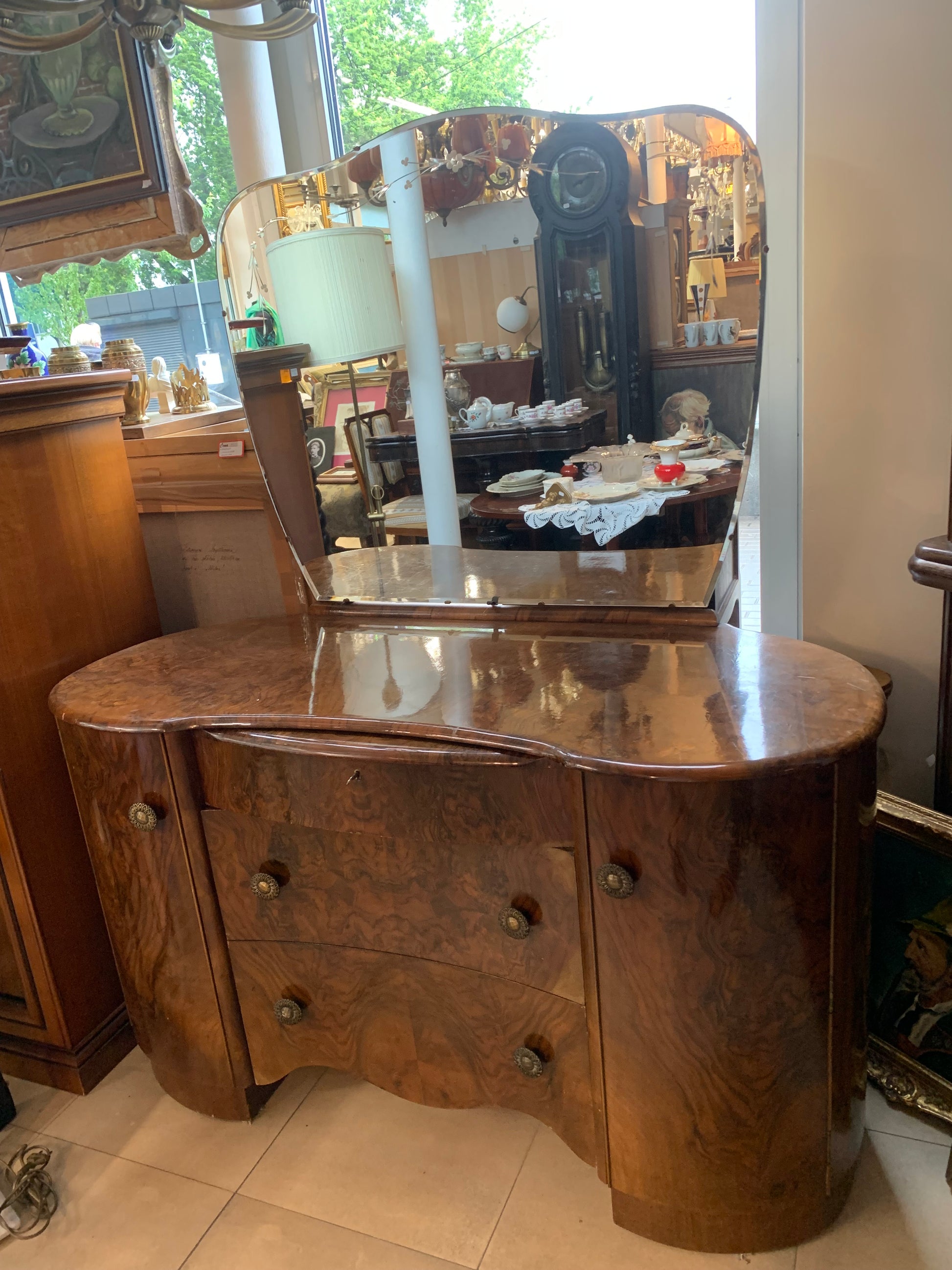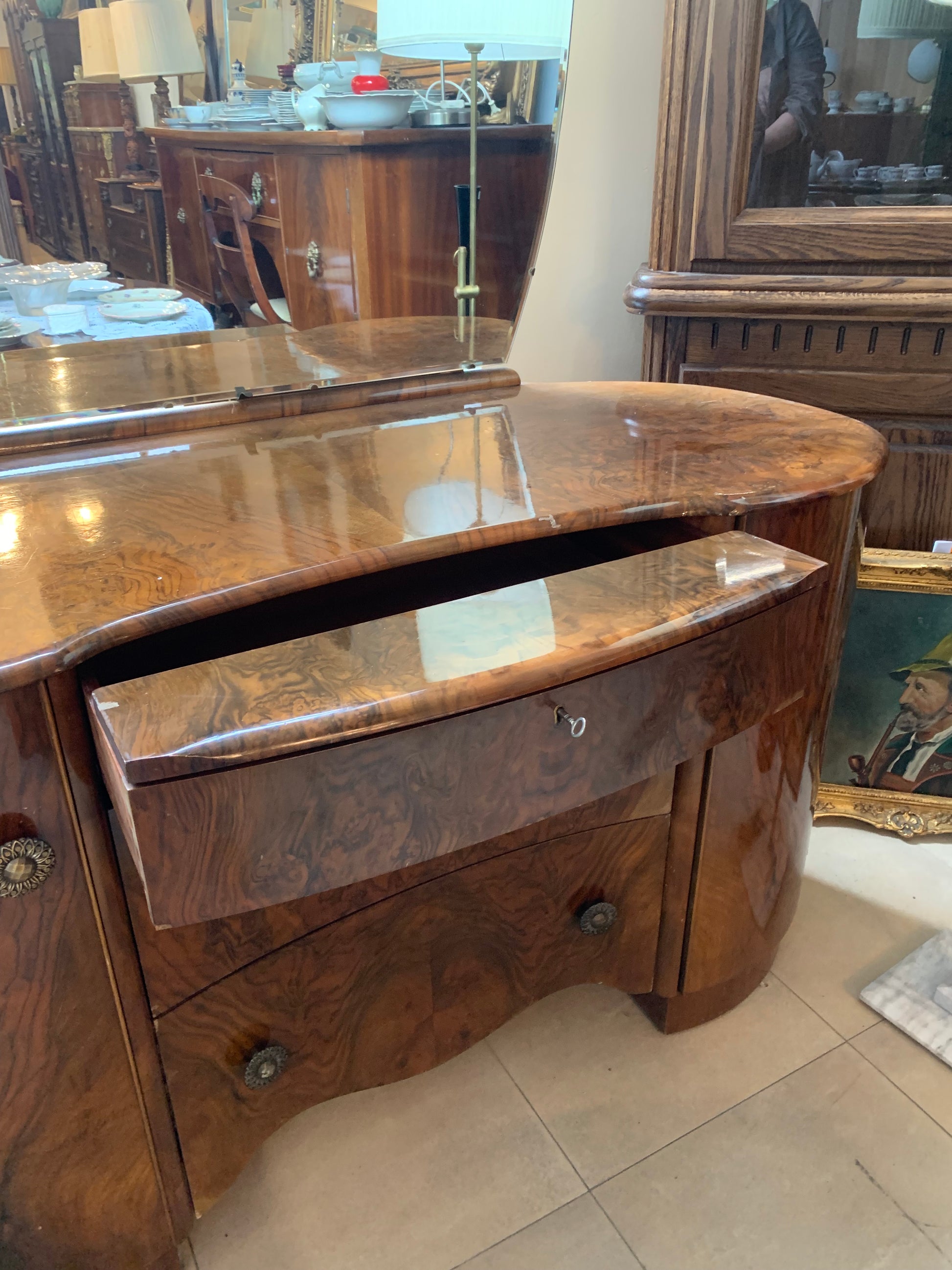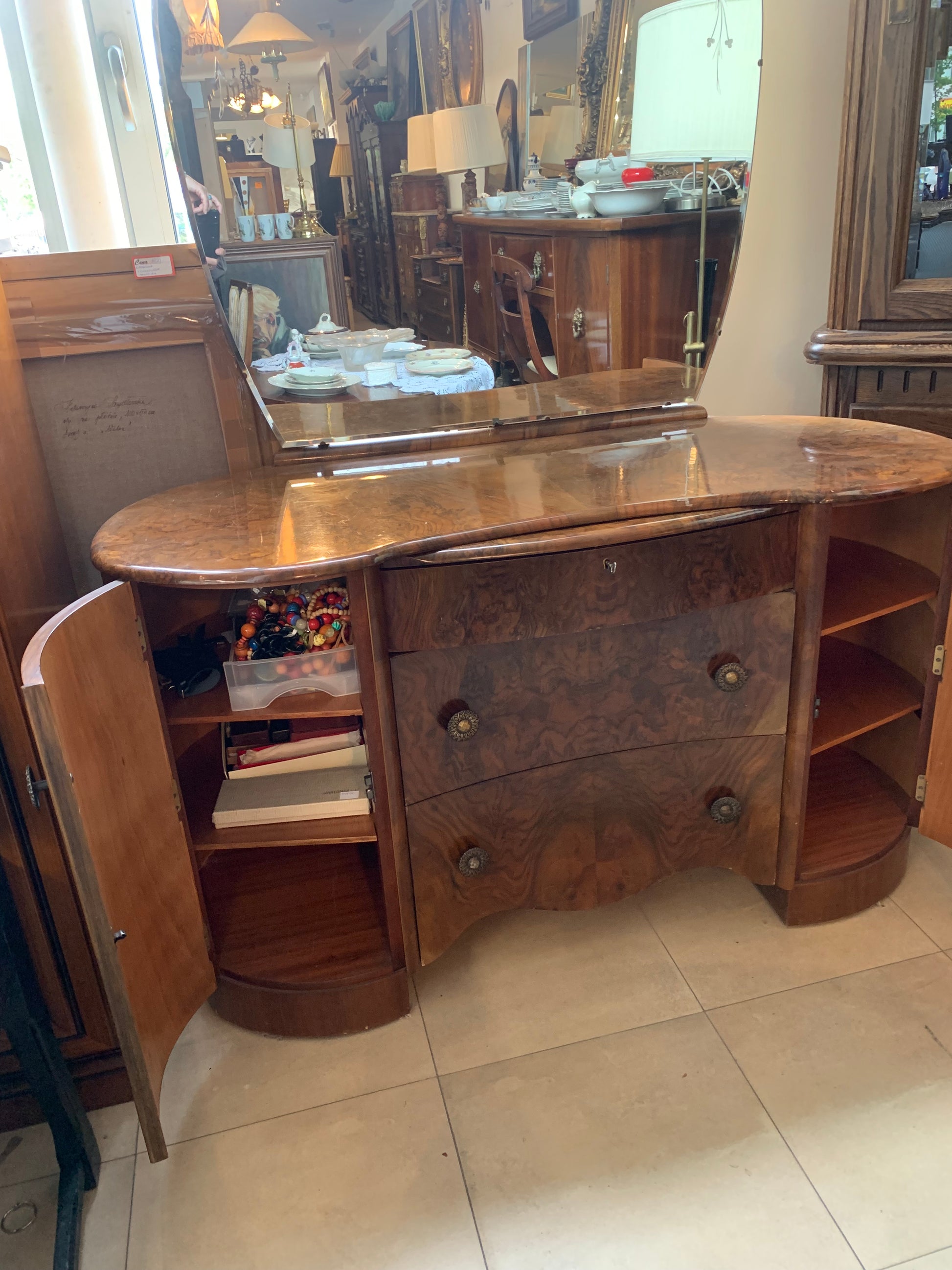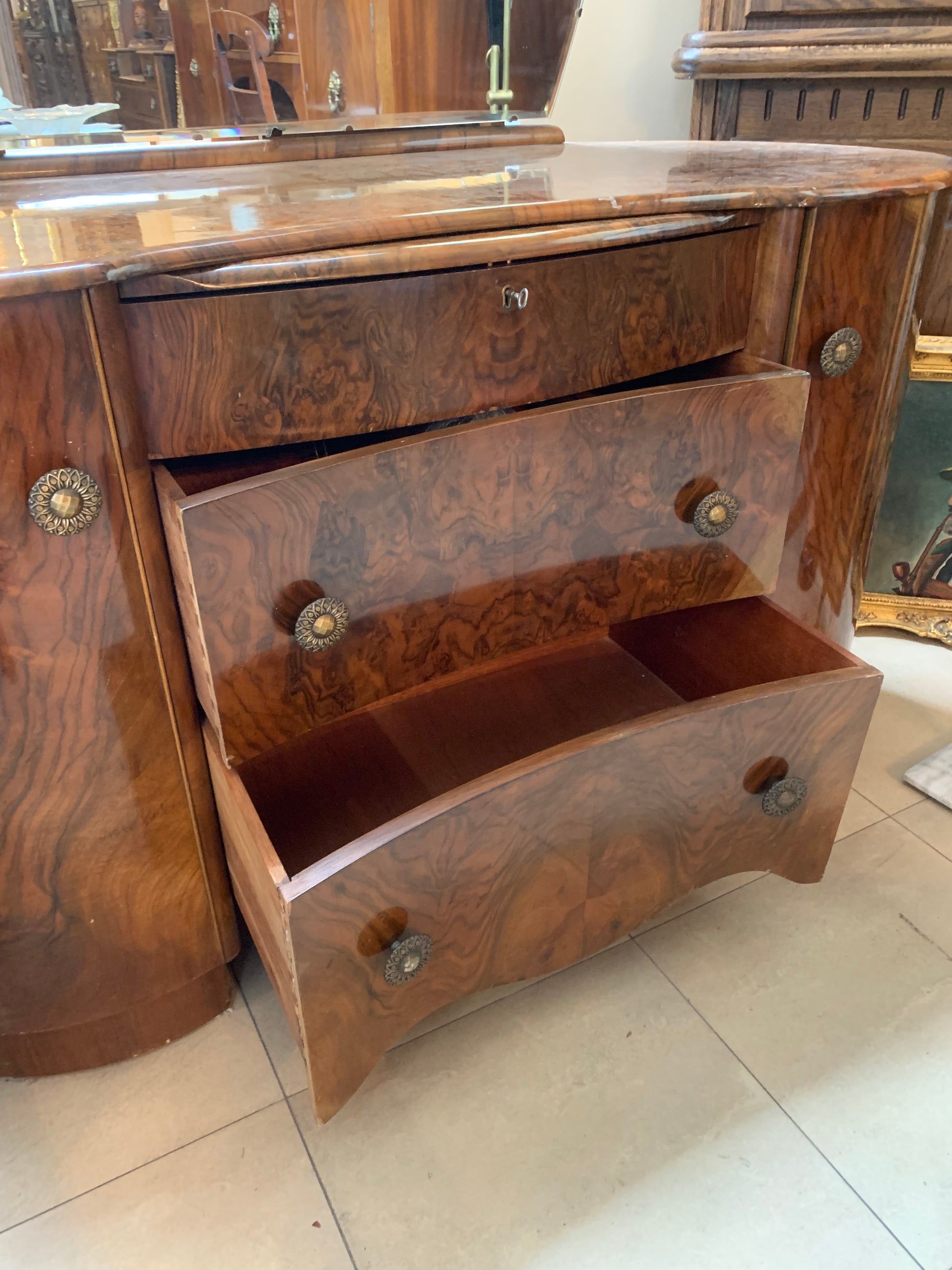 Toaletka Art Deco z drewna orzechowego, mebel przedwojenny, piękne lustro kryształowe, fazowane, ręcznie rżnięte zdobienia motyw kwiatowy. Elegancka i funkcjonalna toaletka z szufladkami, schowkami po bokach. Stan: zarysowania na blacie, widoczne ślady użytkowania.