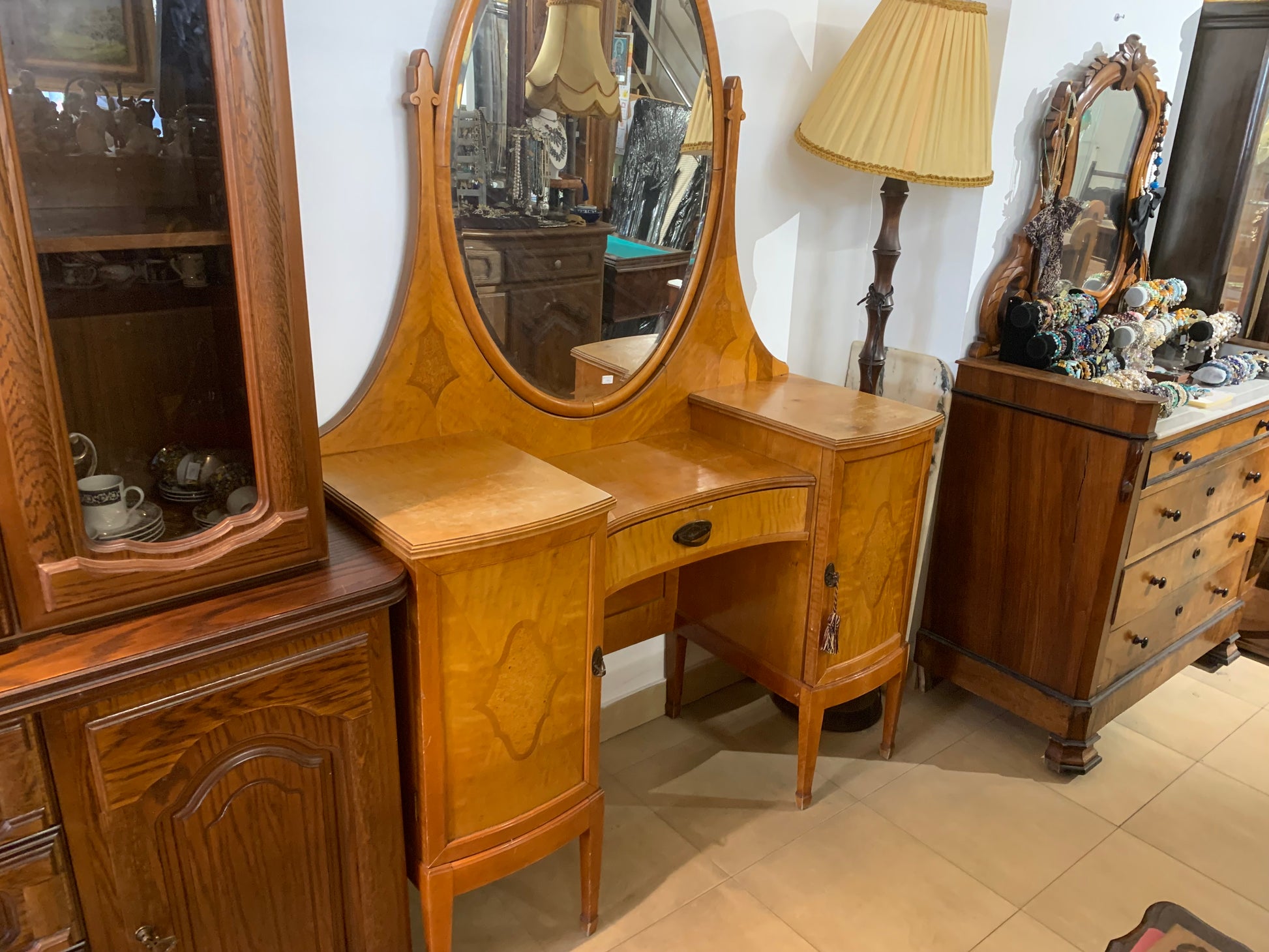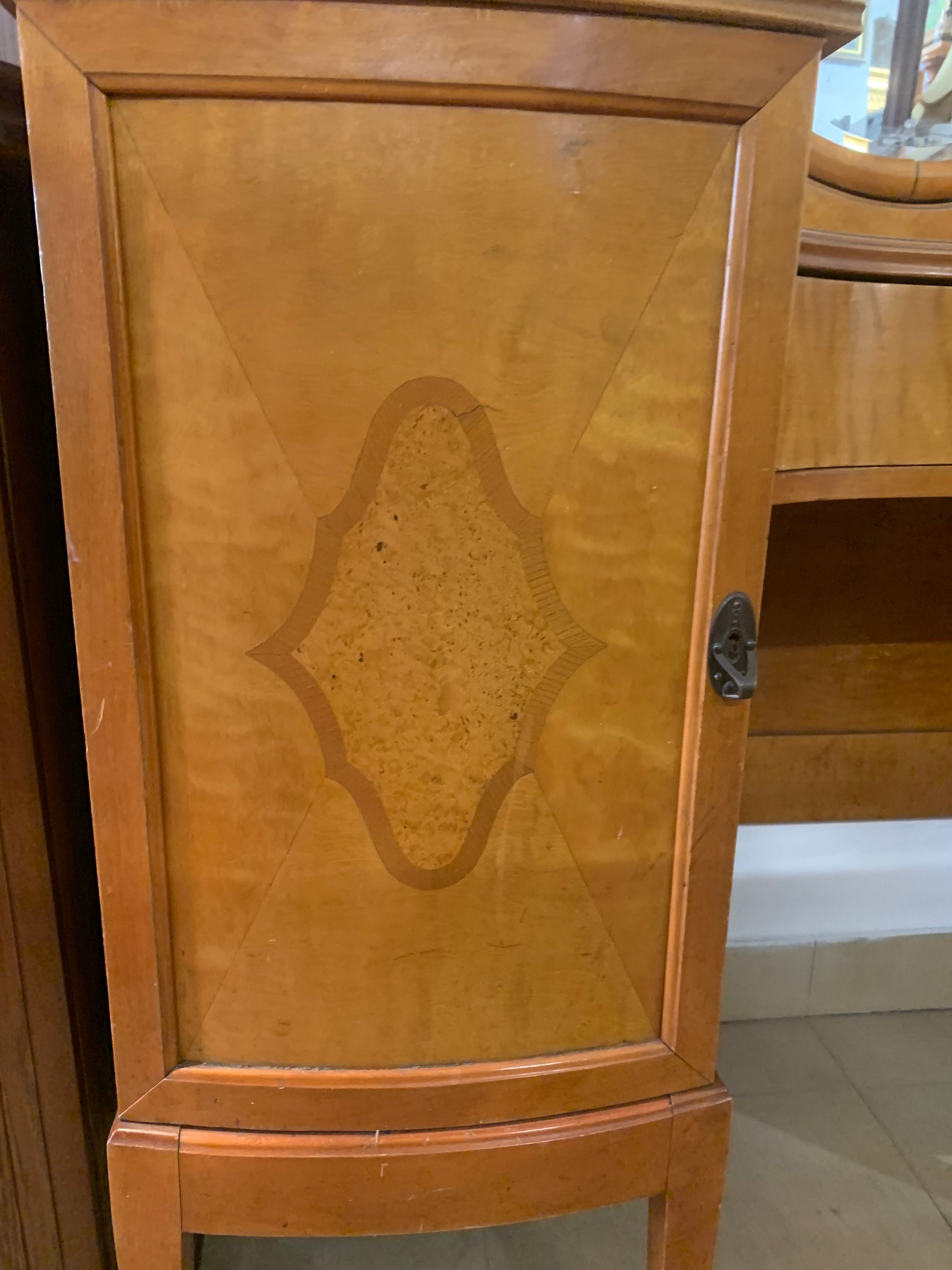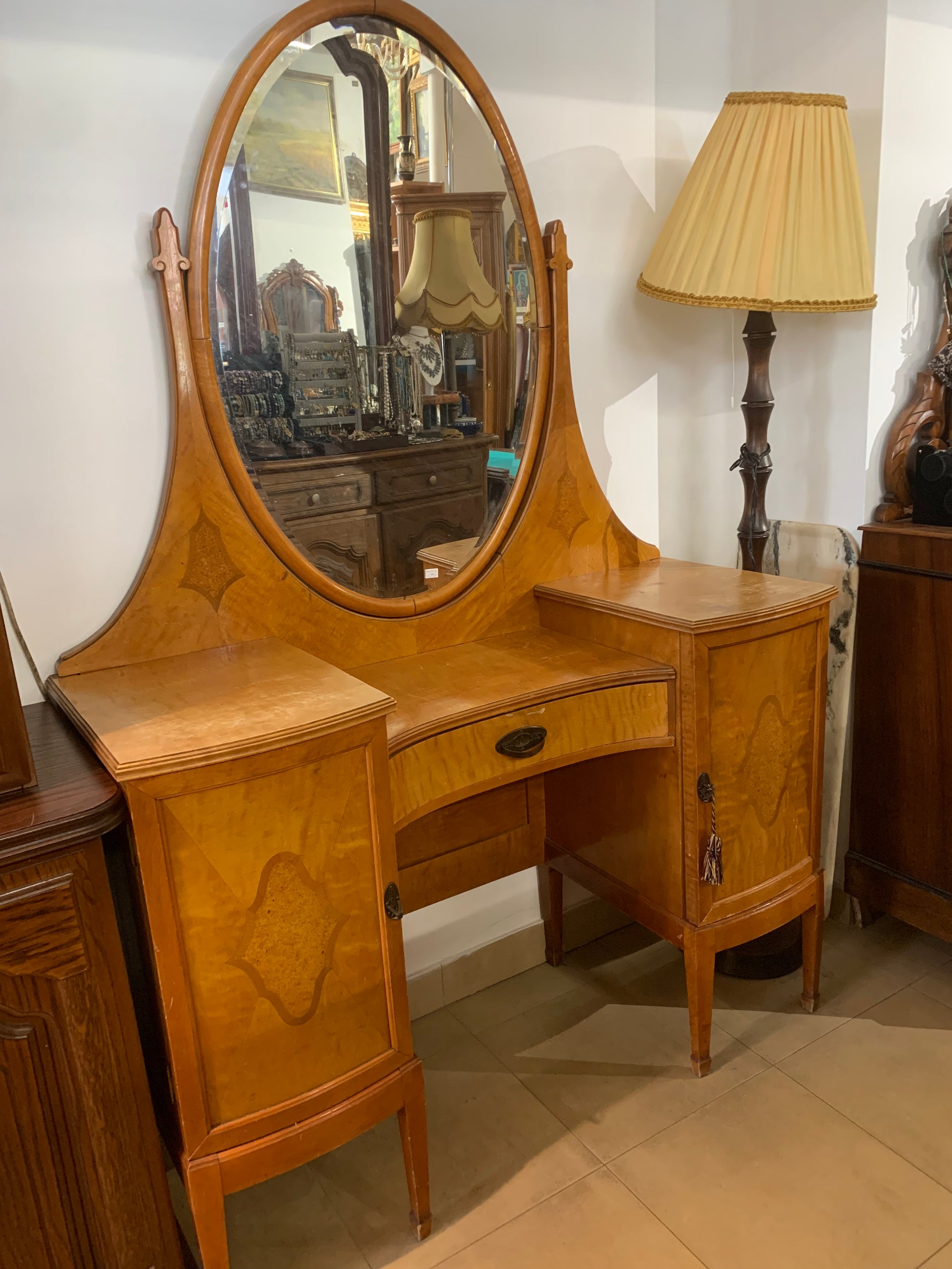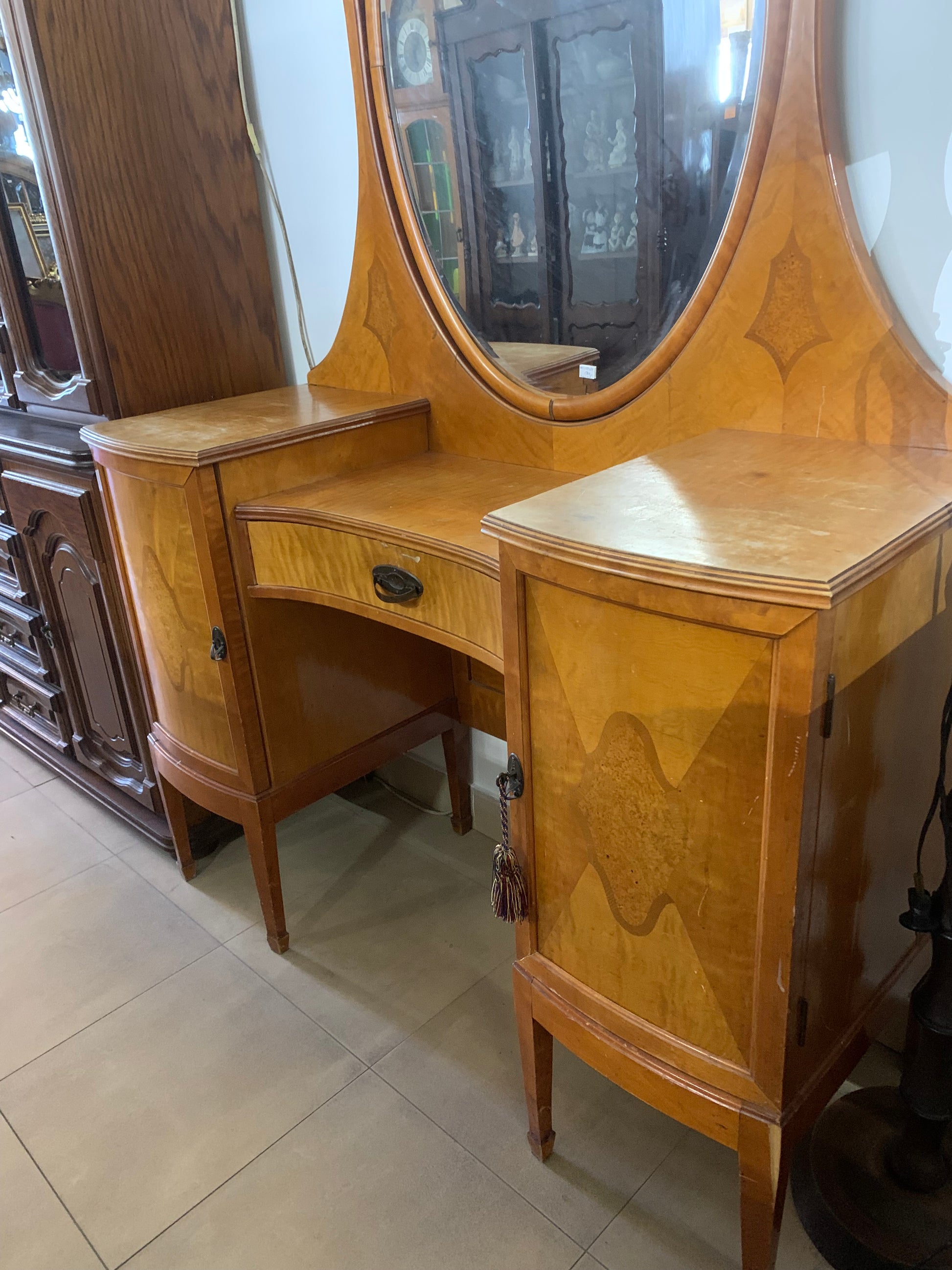 Toaletka secesyjna, drewniana, lustro owalne fazowane. Piękny mebel secesyjny do sypialni, z 2 szafkami i szufladką po środku.
