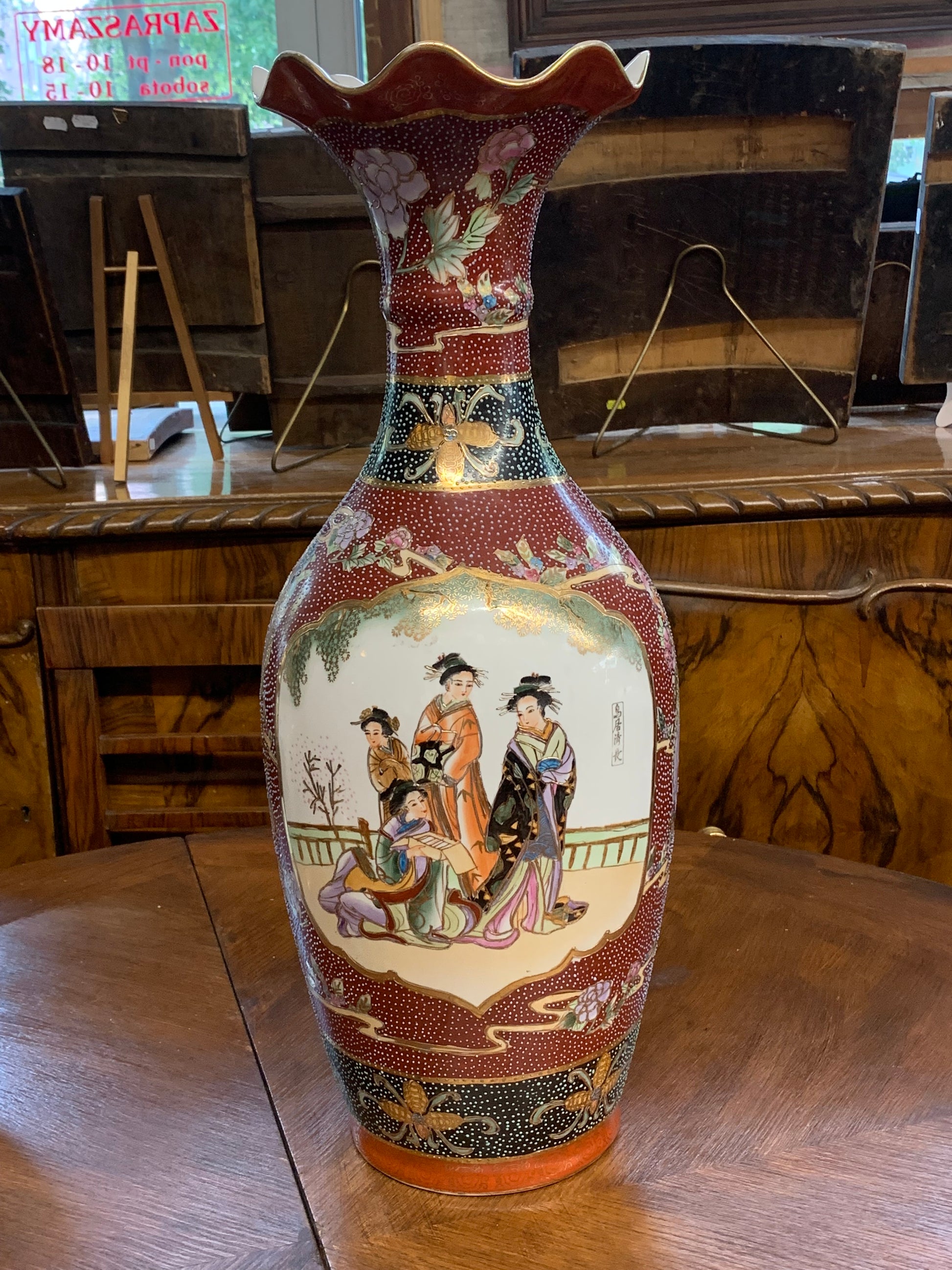 Wazon chiński, wysoki ręcznie zdobiony lata 80-e. Pięknie zdobiony motywem scenki rodzajowe. Stan- jak nowy.