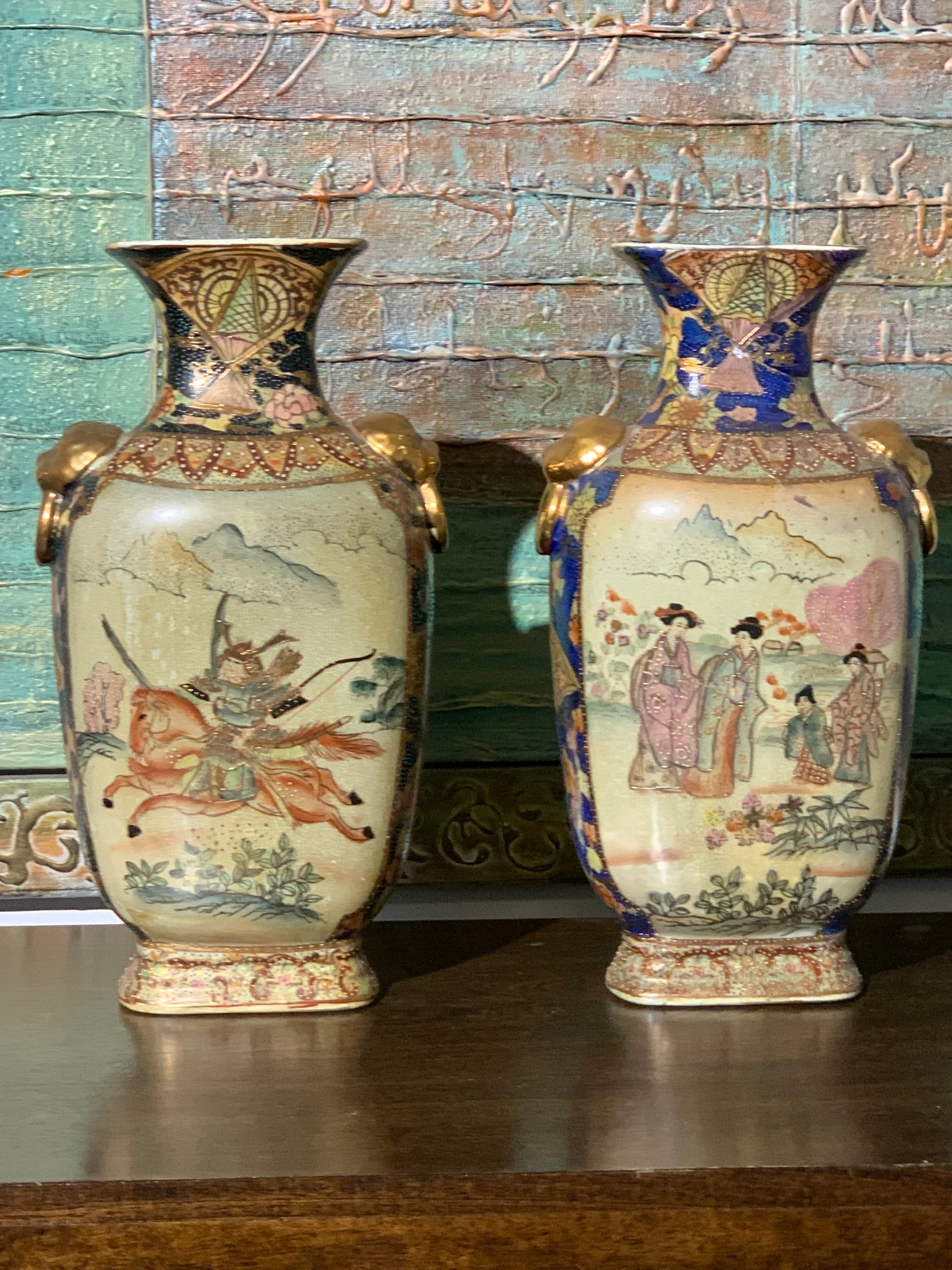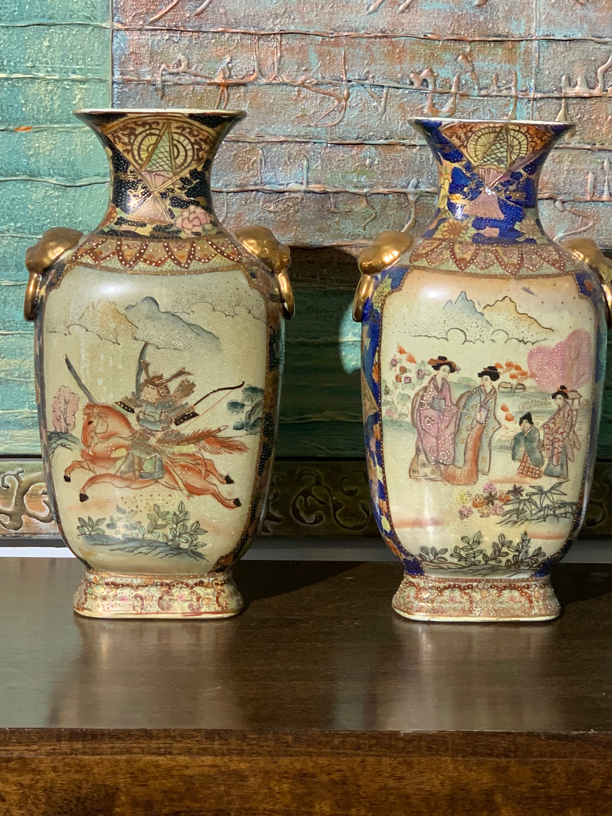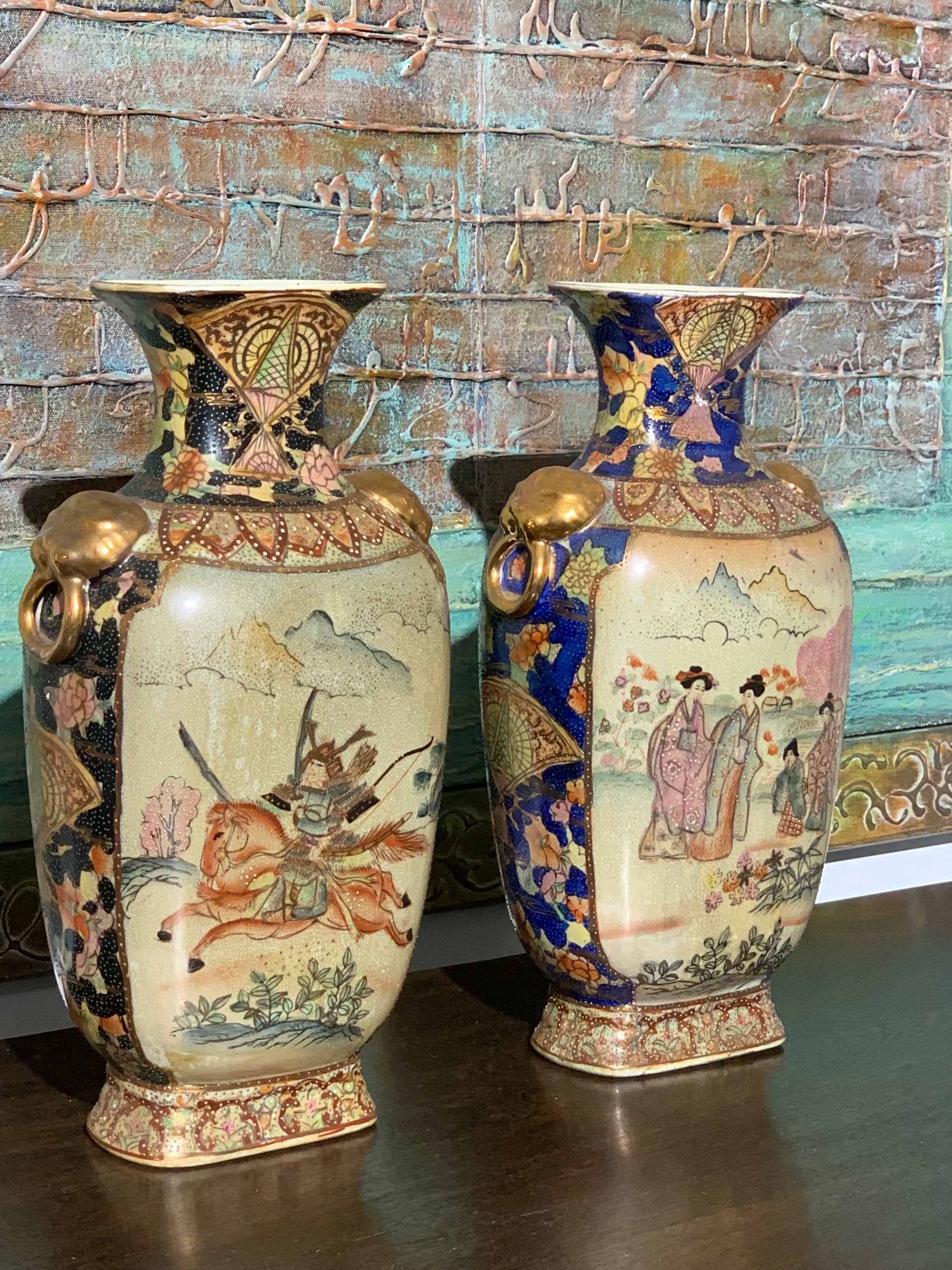 Dwie wazy porcelanowe, Satsuma, scenki rodzajowe, przełom XIX i XX wieku.