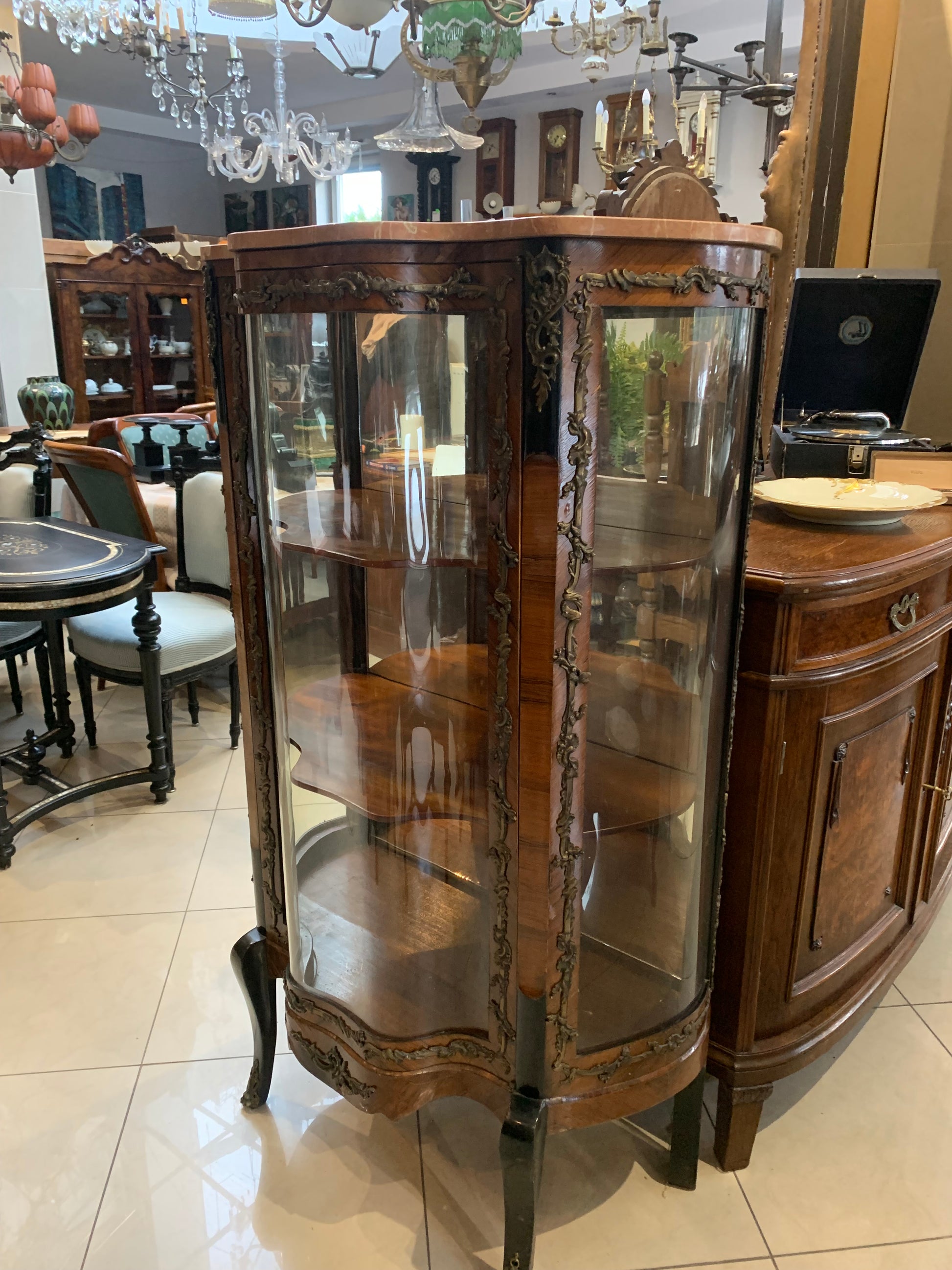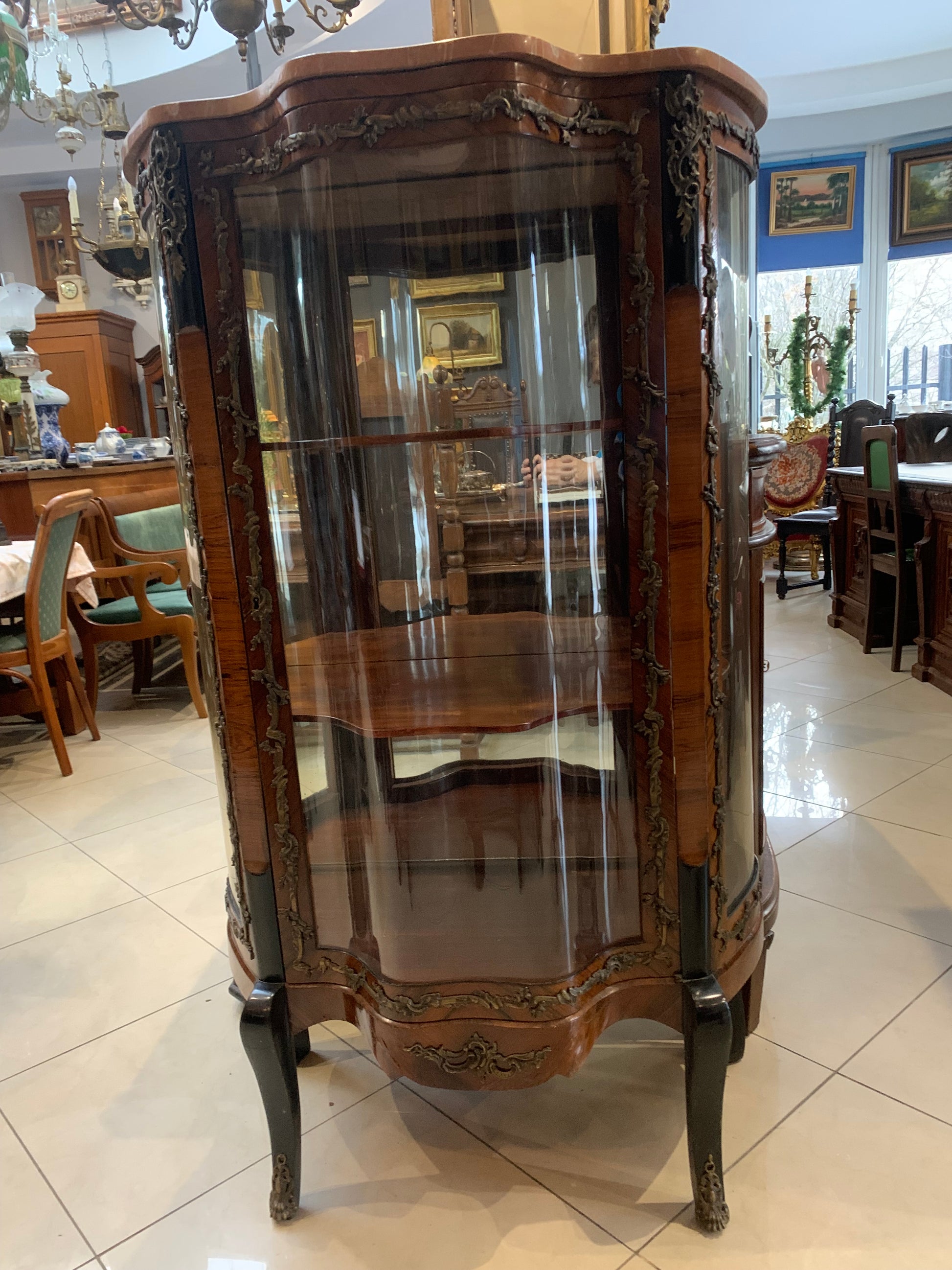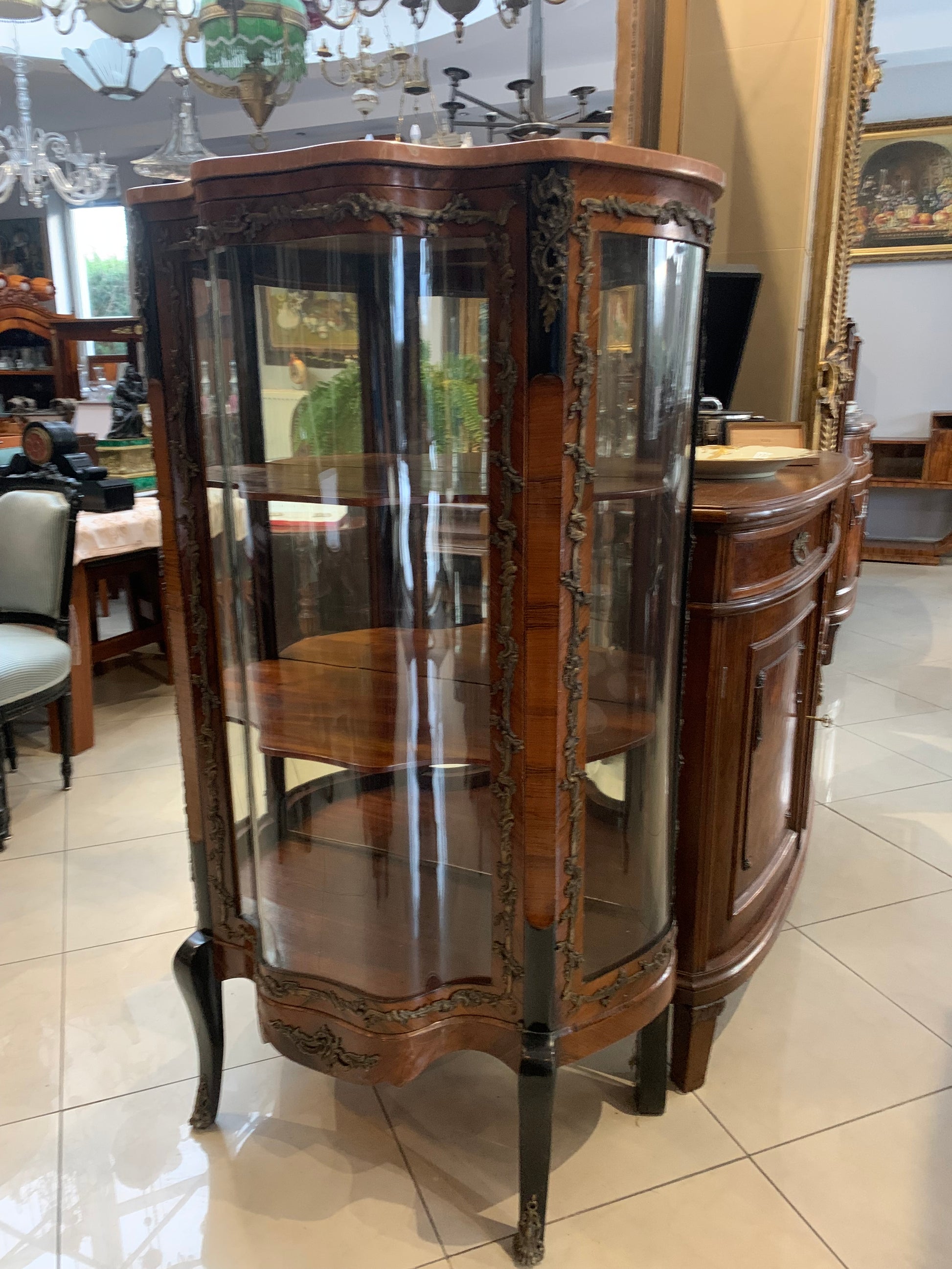 Witryna antyczna French Kingwood XIX w., szyby falowane, artystyczne. Zdobienia motyw roślinny z brązu na froncie, bokach i giętych nogach witryny, lustro wewnątrz witryny. Stan: witryna jest w dobrym stanie, front - oryginalna szyba, boki uzupełnione szybkami ze szkła akrylowego (możliwość zamówienia szybek ze szkła).