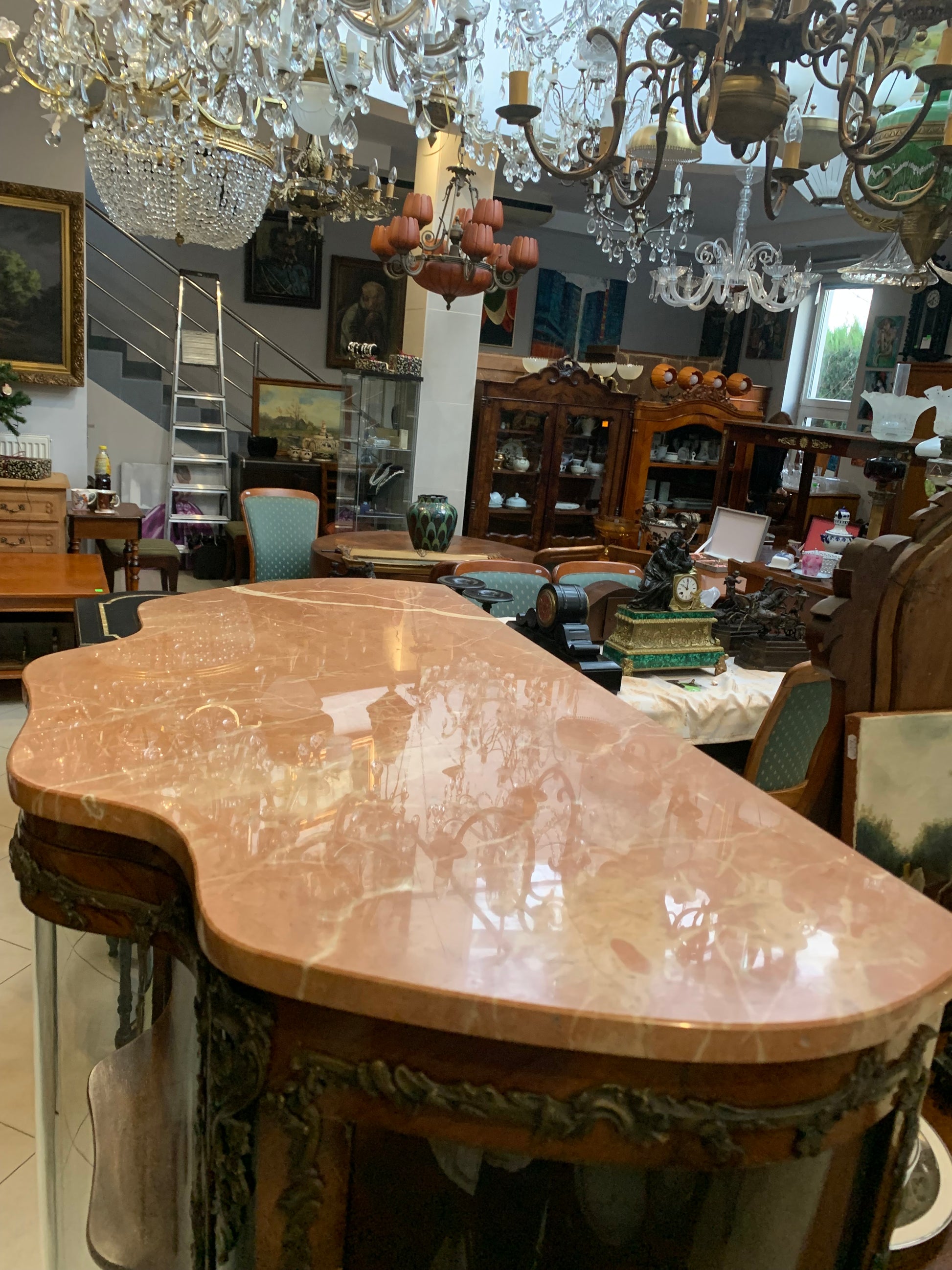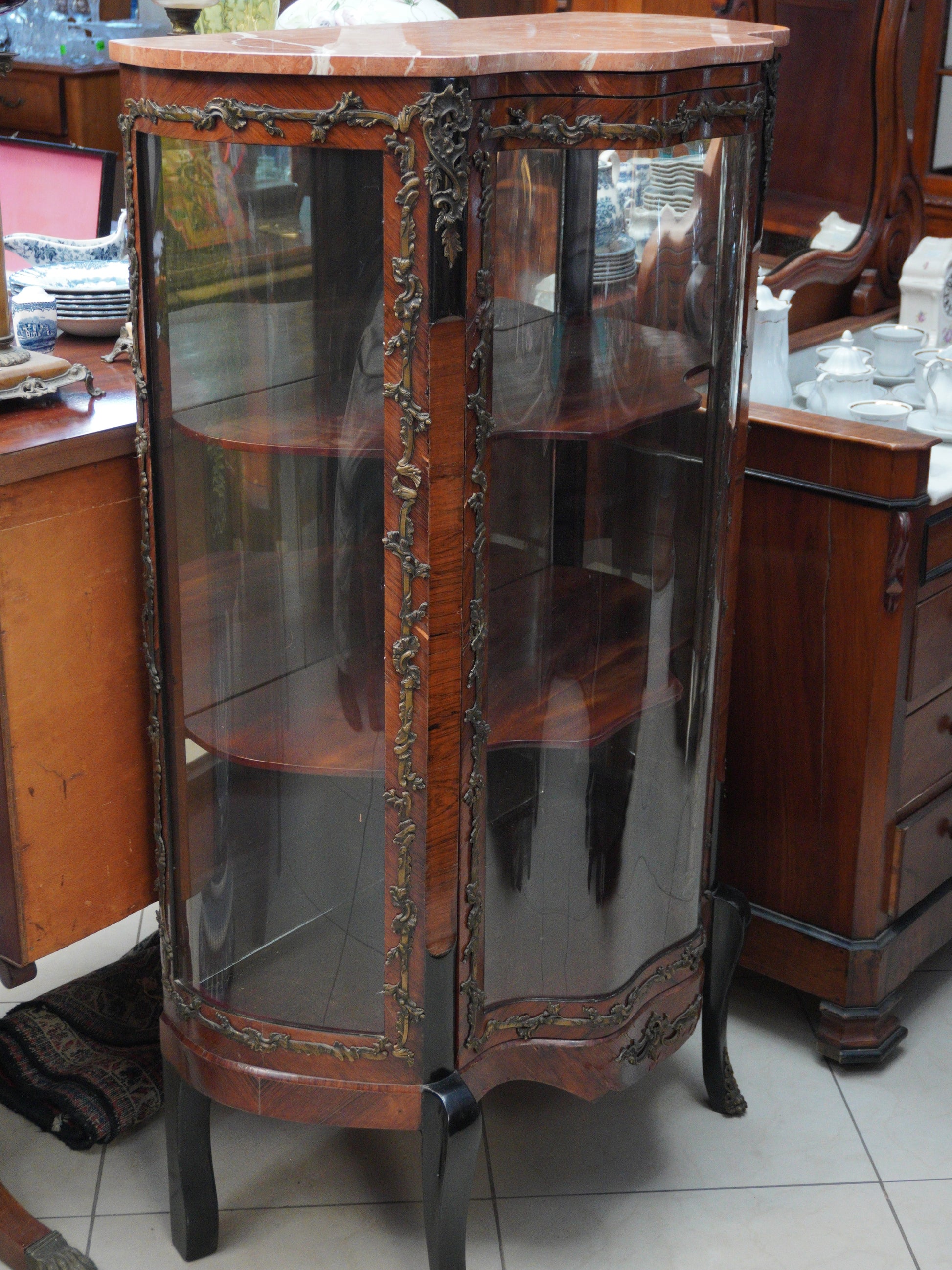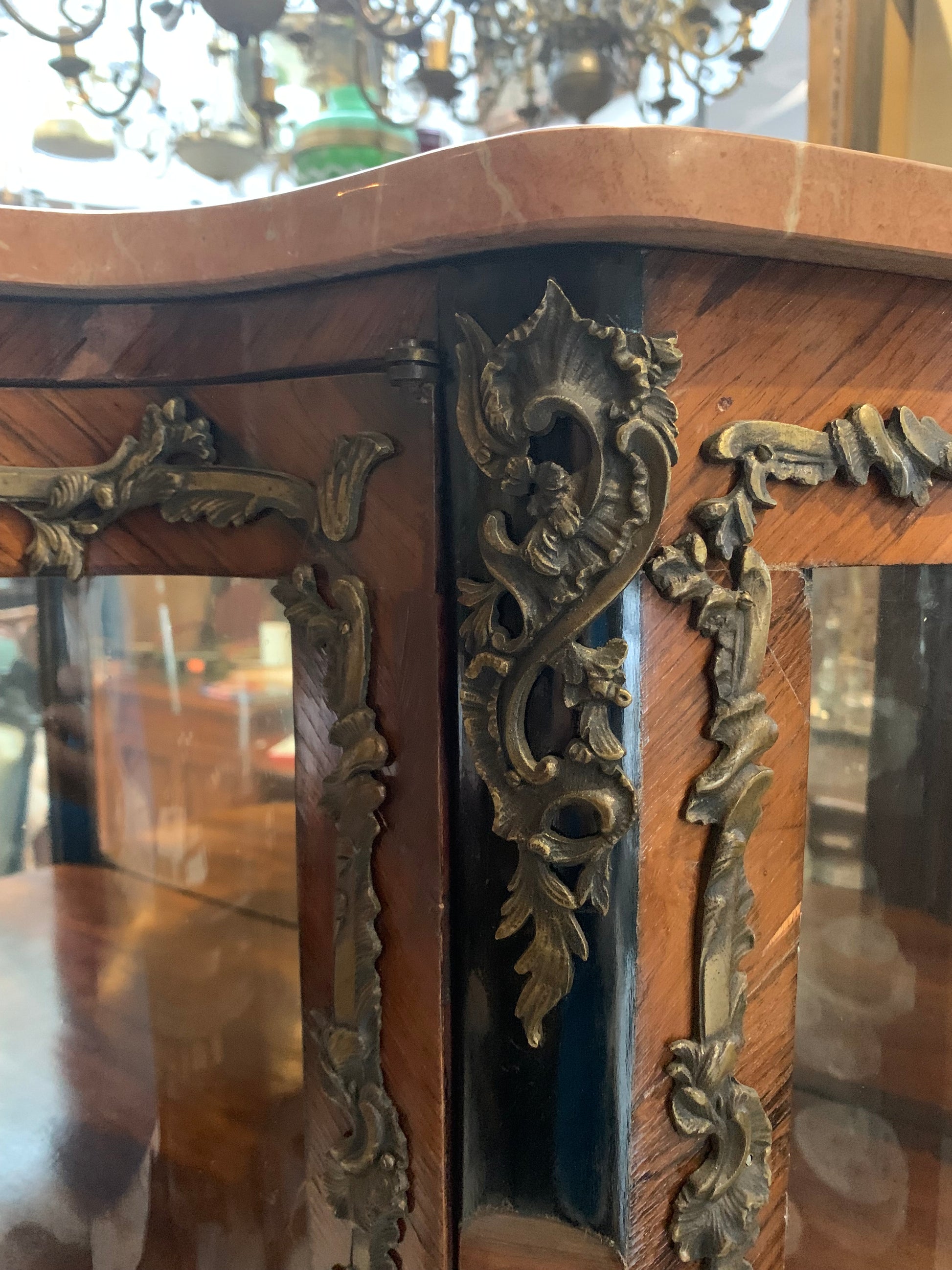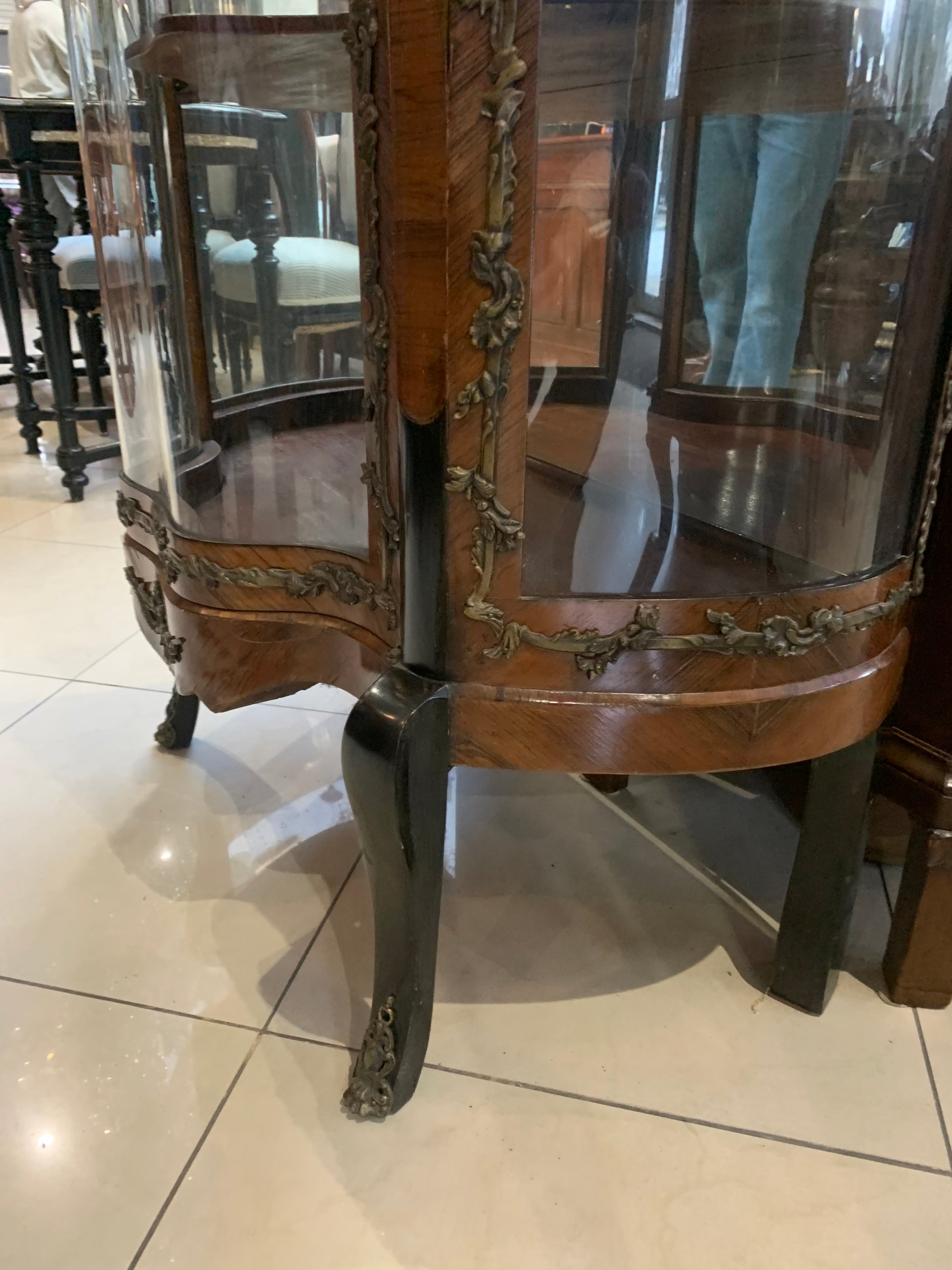 Witryna antyczna French Kingwood XIX w., szyby falowane, artystyczne. Zdobienia motyw roślinny z brązu na froncie, bokach i giętych nogach witryny, lustro wewnątrz witryny. Stan: witryna jest w dobrym stanie, front - oryginalna szyba, boki uzupełnione szybkami ze szkła akrylowego (możliwość zamówienia szybek ze szkła).