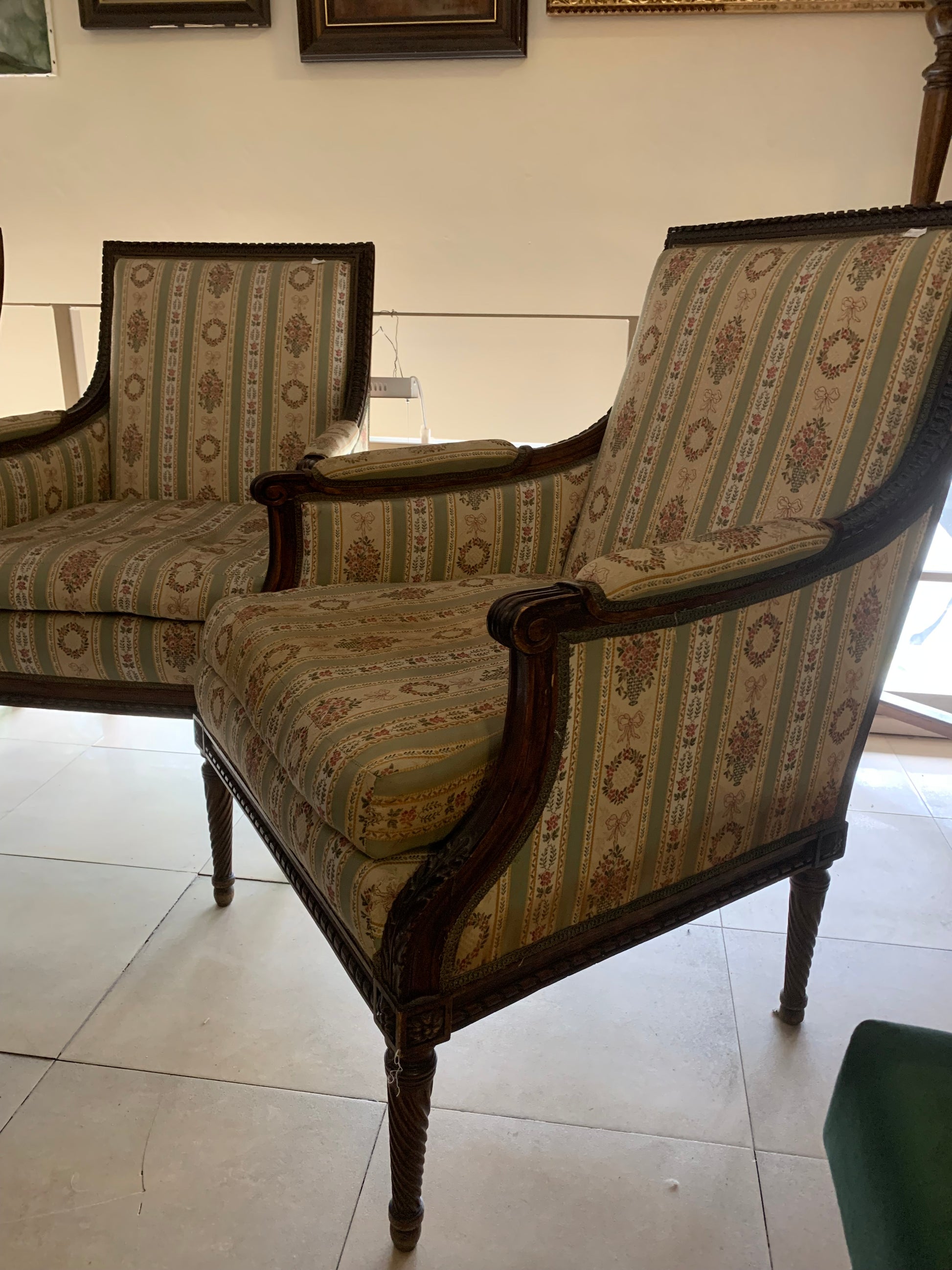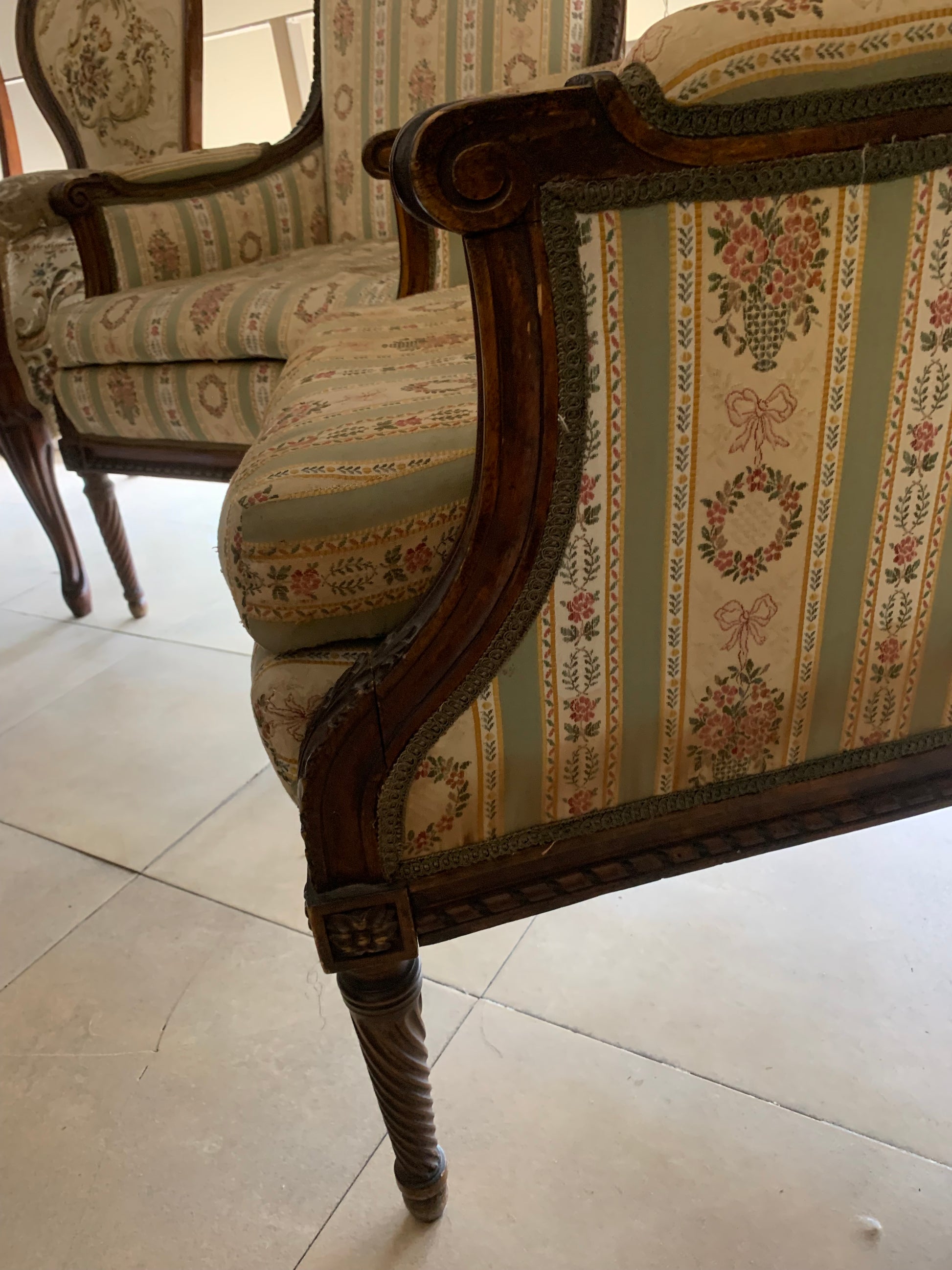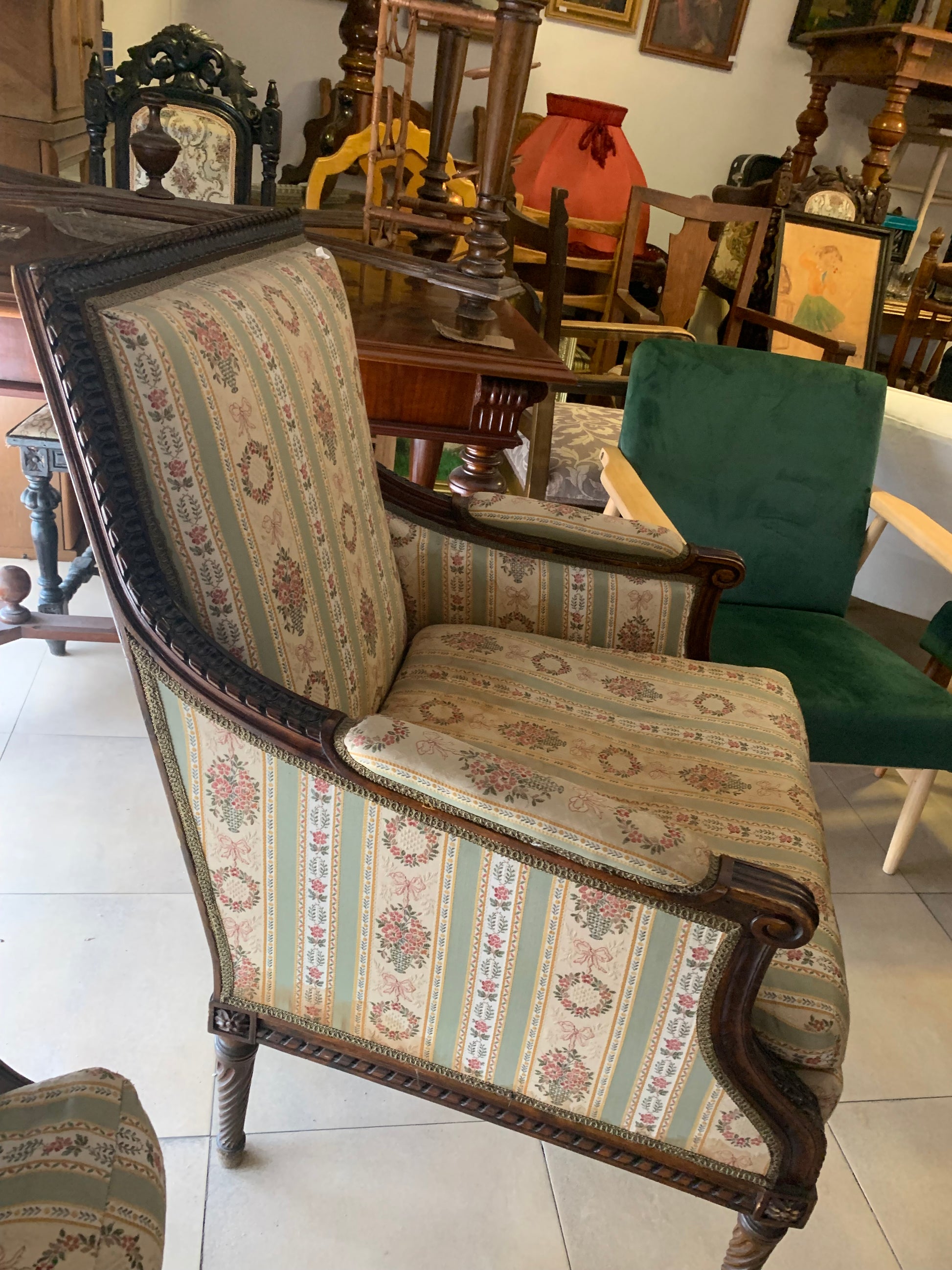 Zabytkowy fotel Ludwik XVI, stelaż drewniany, rzeźbiony, siedzisko i oparcie tapicerowane, sprężyny. Stan: do renowacji. Dostępne dwa fotele.
