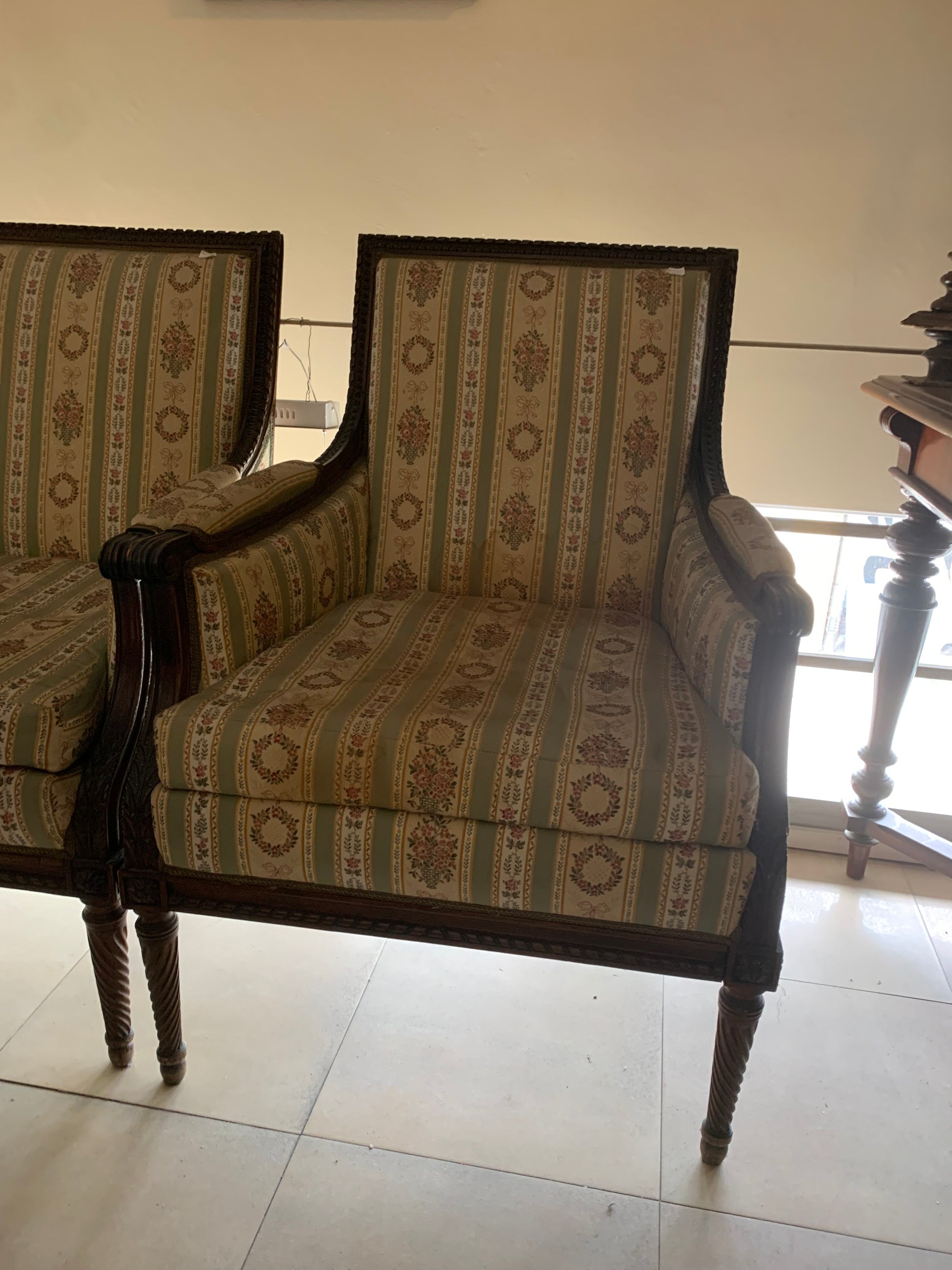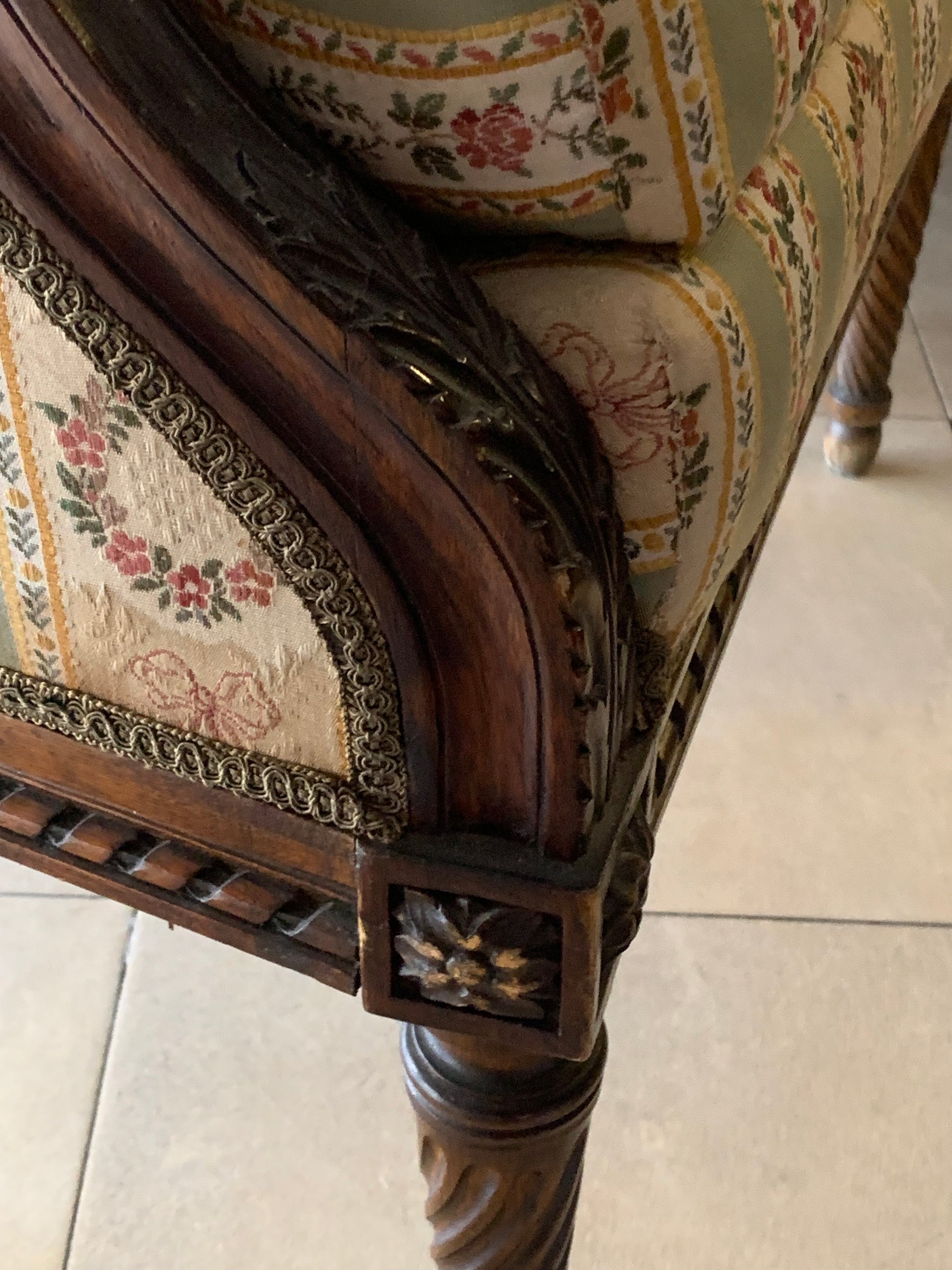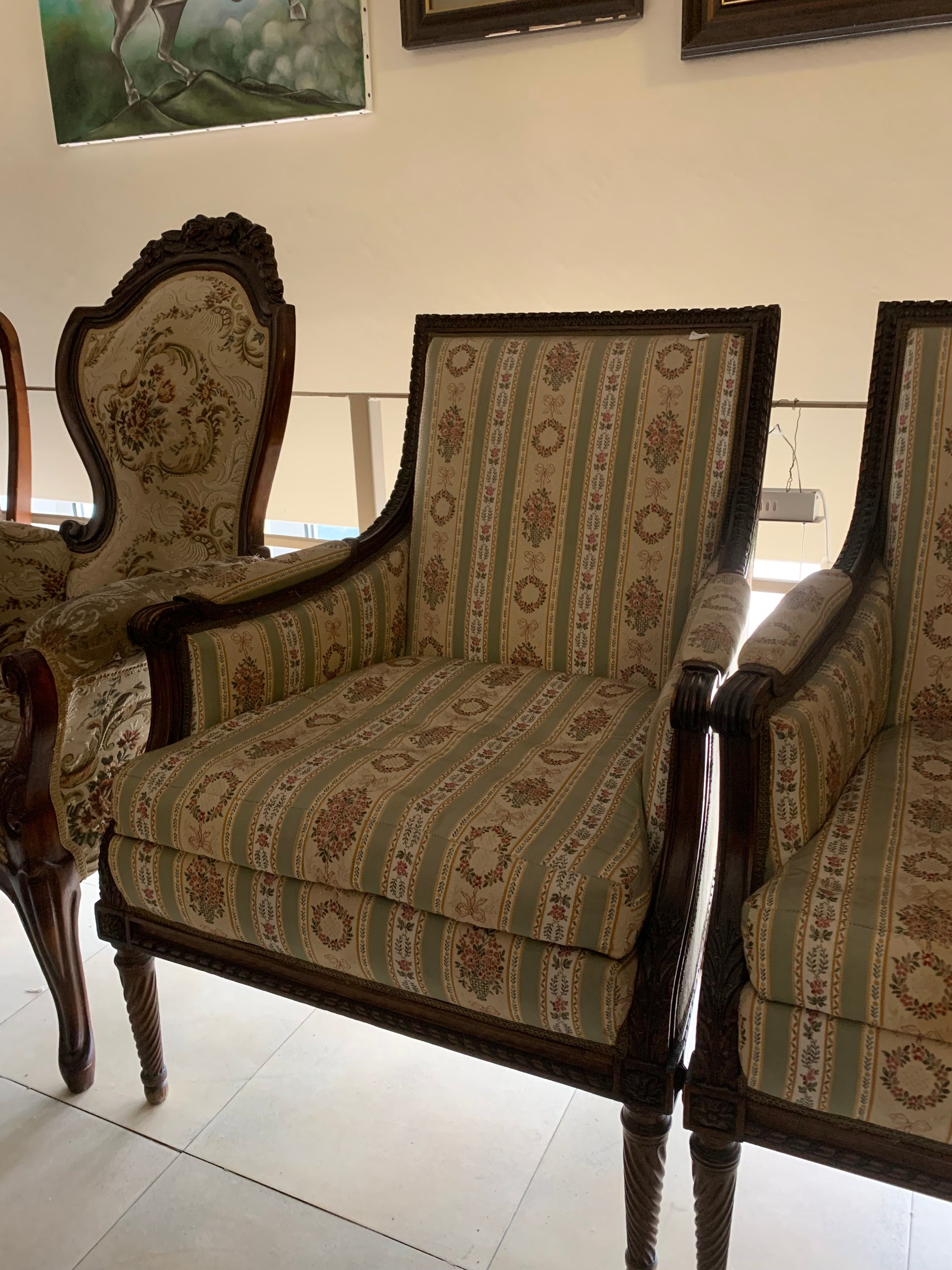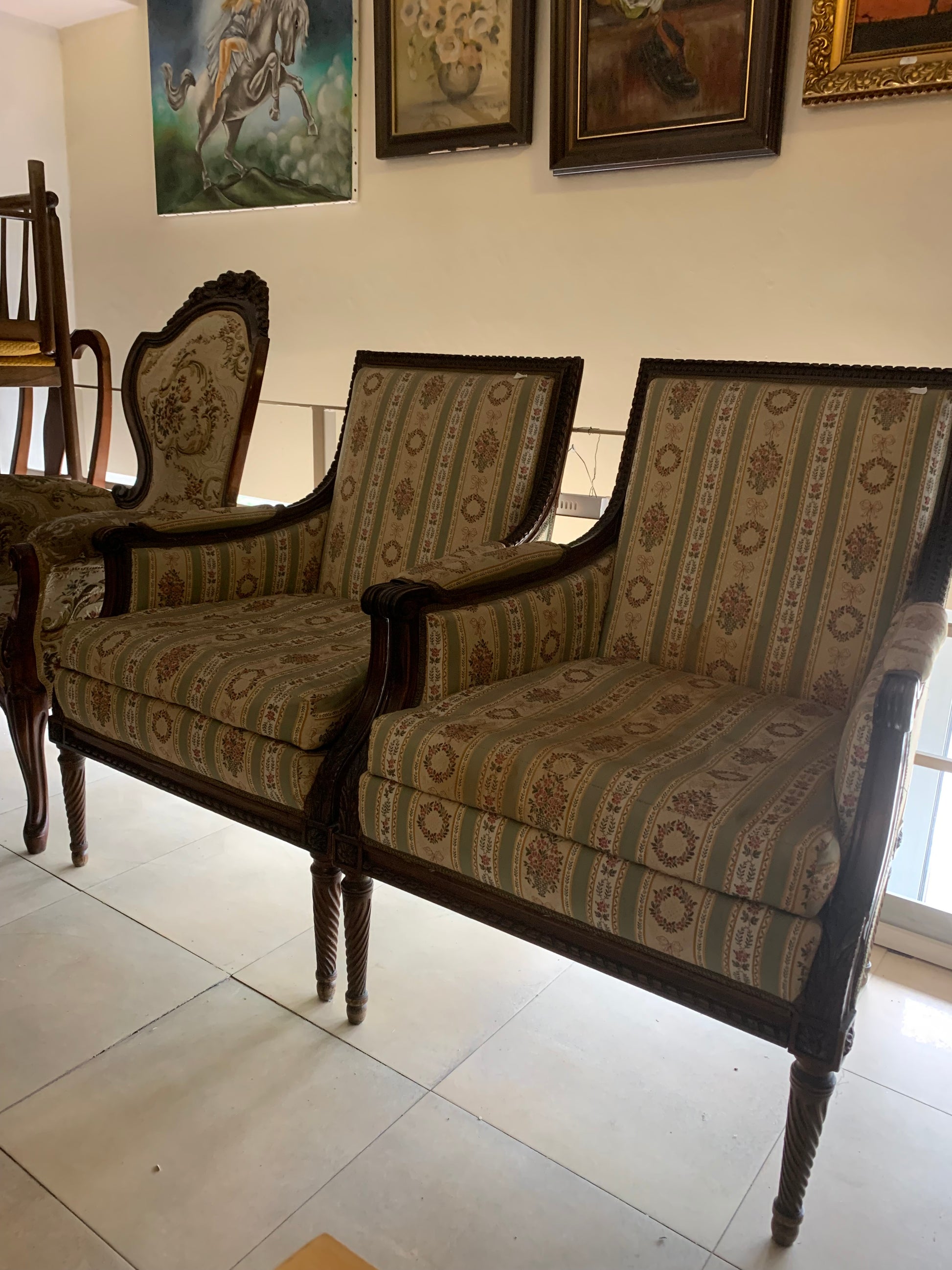 Zabytkowy fotel Ludwik XVI, stelaż drewniany, rzeźbiony, siedzisko i oparcie tapicerowane, sprężyny. Stan: do renowacji. Dostępne dwa fotele.