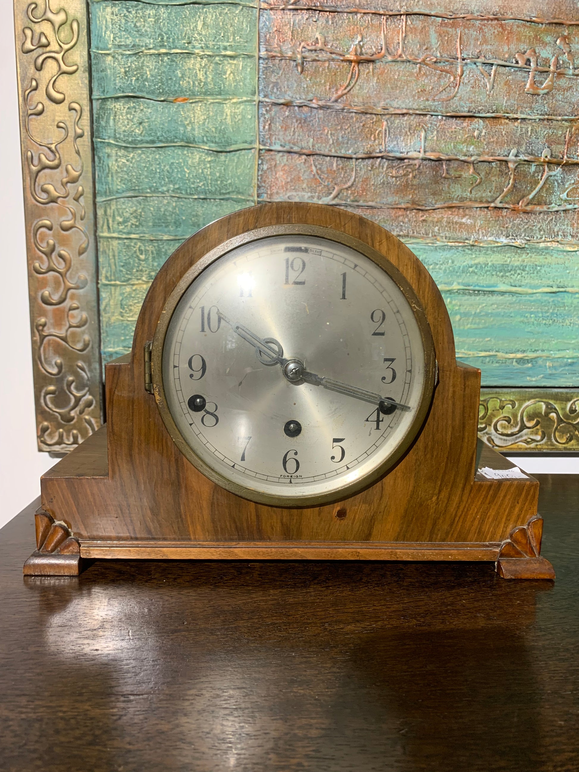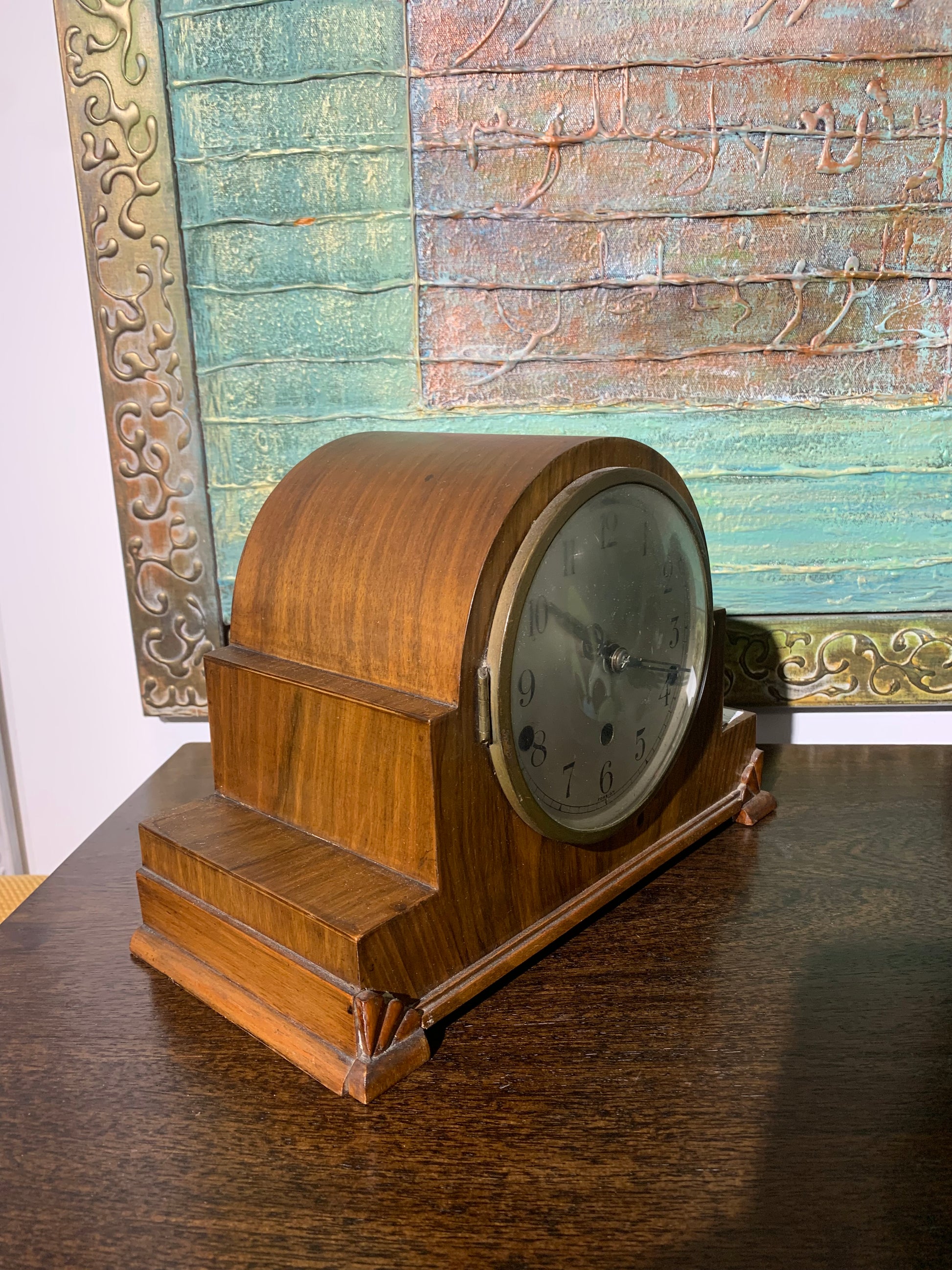 Zegar Art déco, kwadransiak z lat 20-tych XX w, w pięknej, drewnianej skrzyni, bicie co kwadrans. Stan: mechanizm do naprawy.