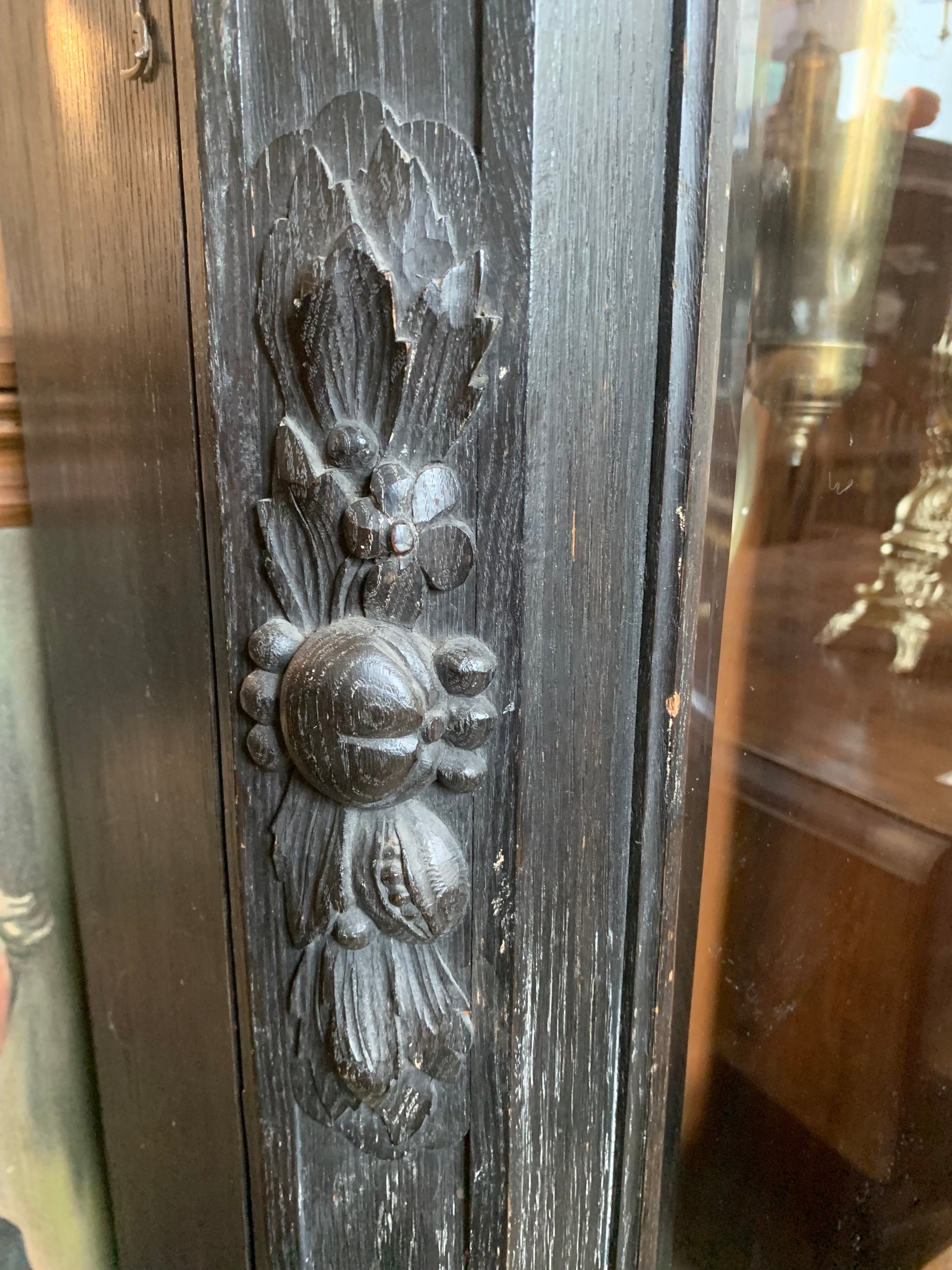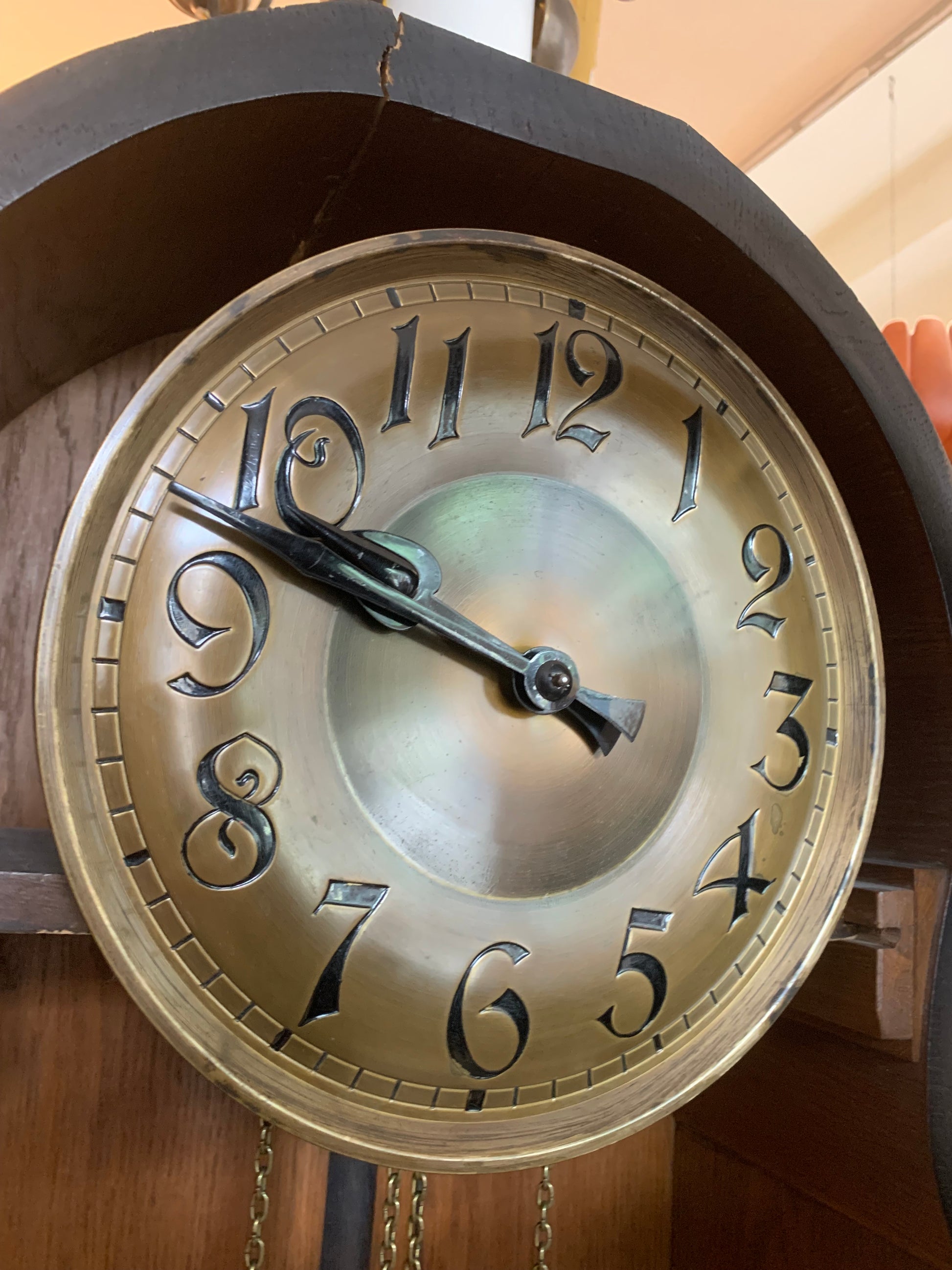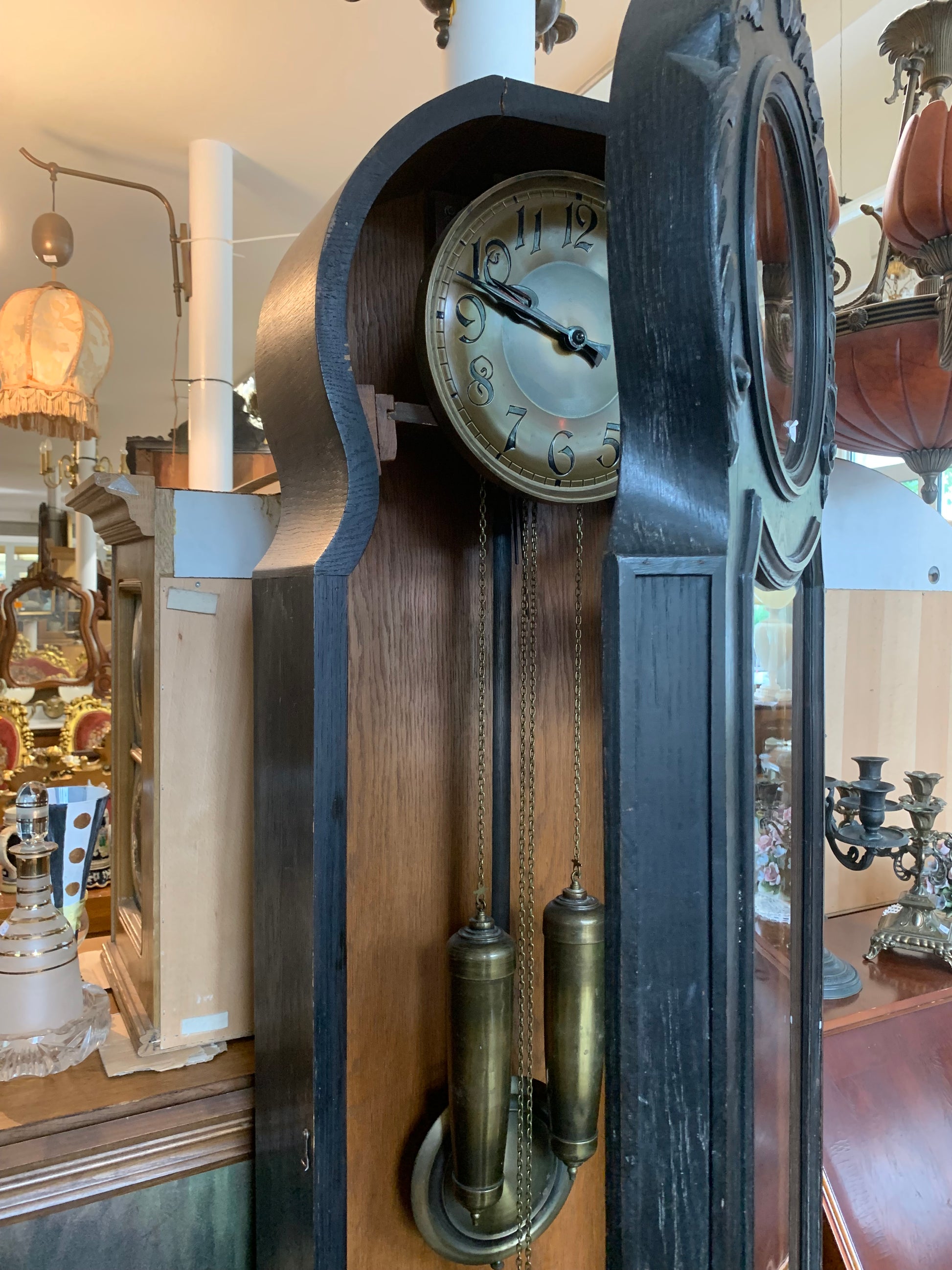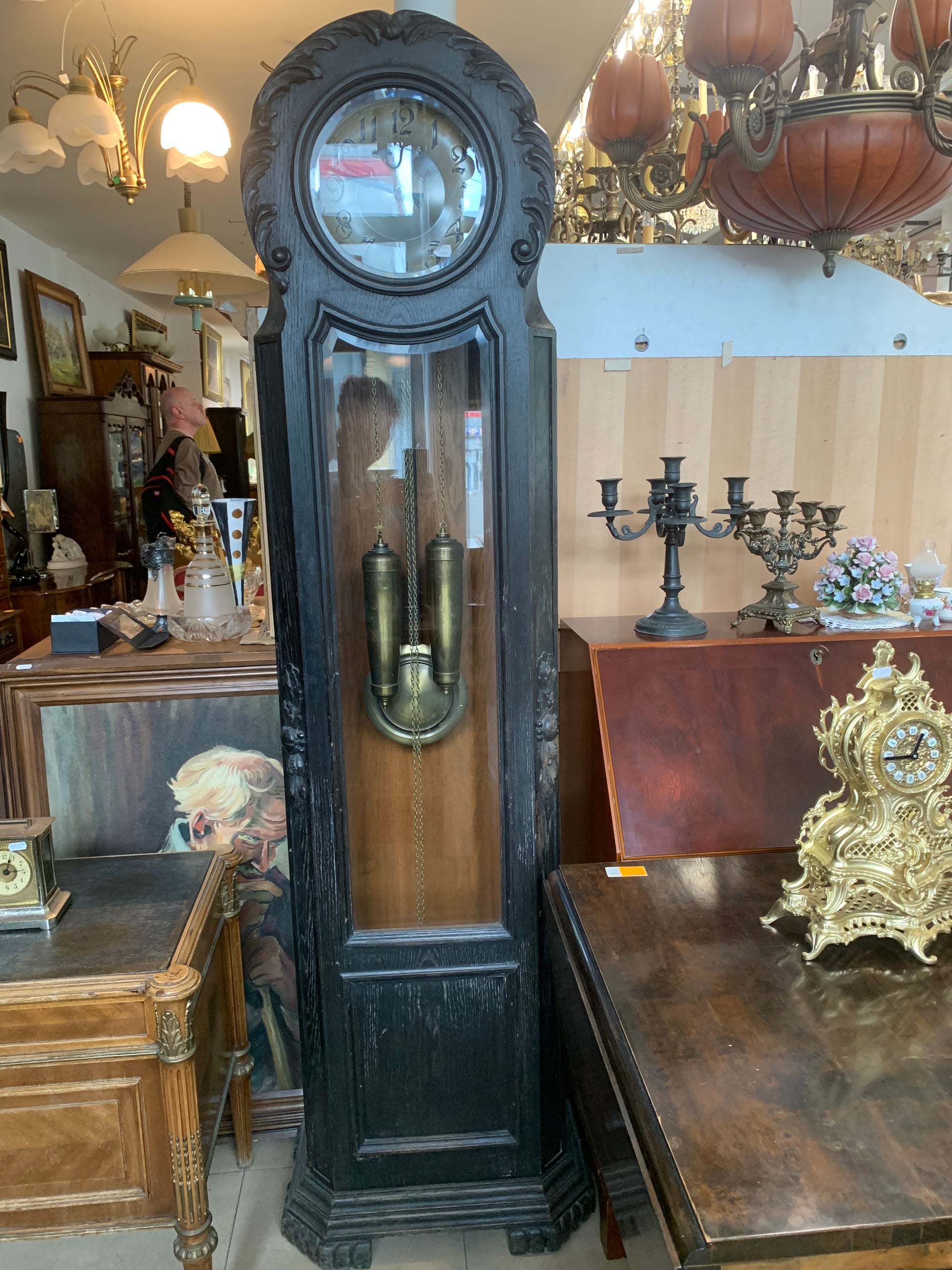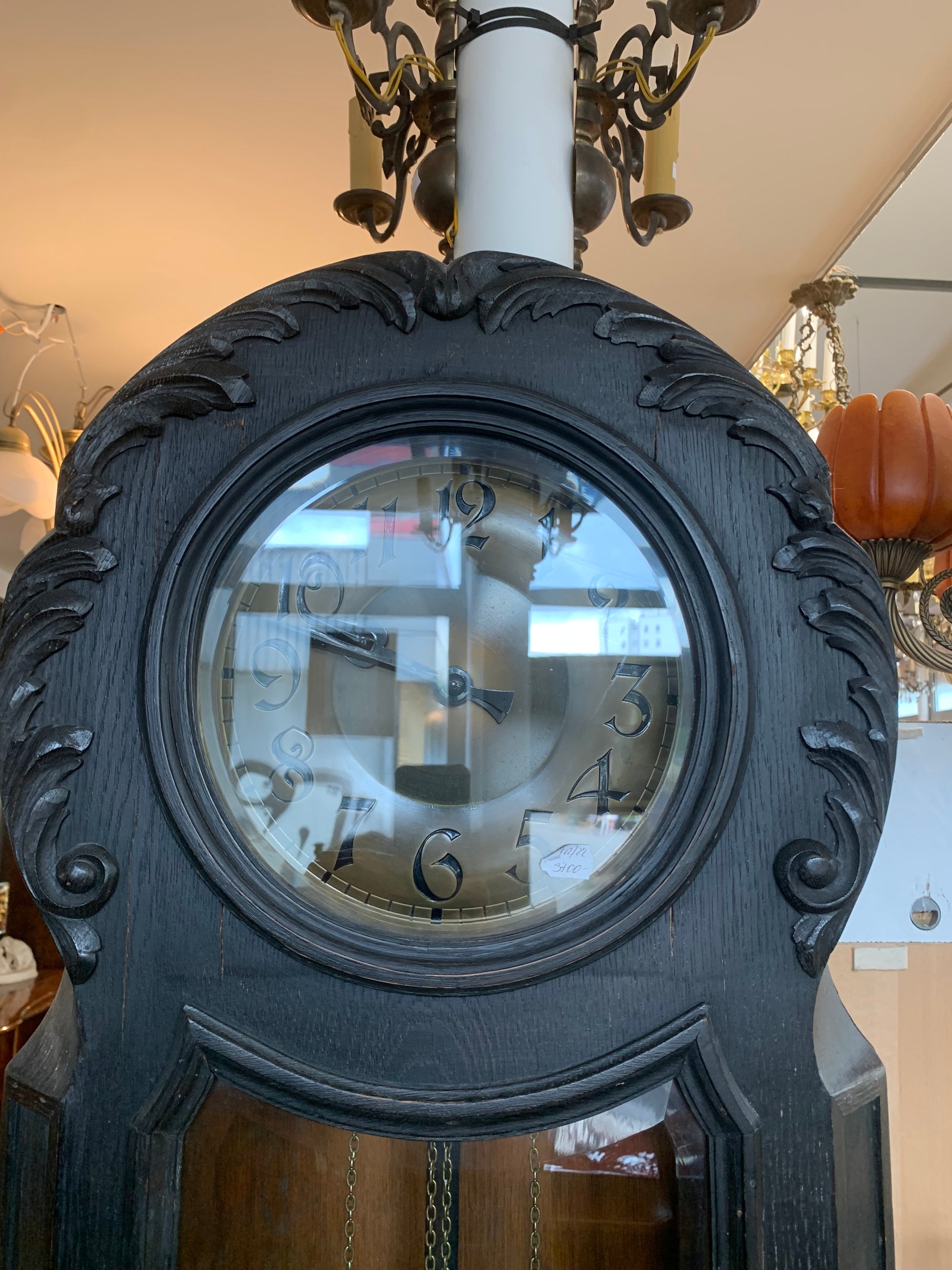 Zegar podłogowy, odważnikowy, XIX - XX w. Skrzynia z drewna dębowego, zdobiona rzeźbieniami, mechanizm w dobrym stanie. Stan: działający.