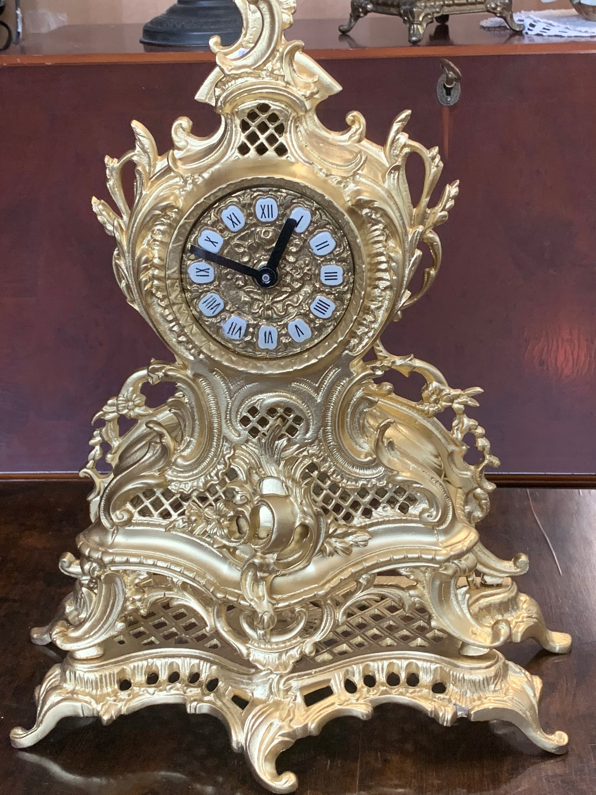 Zegar kominkowy, barokowy, zabytkowa obudowa z mosiądzu, odnowiona, zegar na baterie. Stan: bardzo dobry.