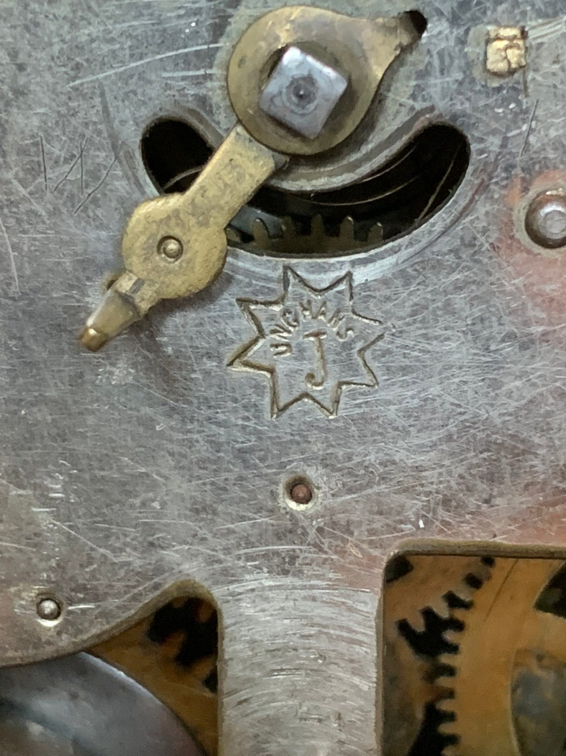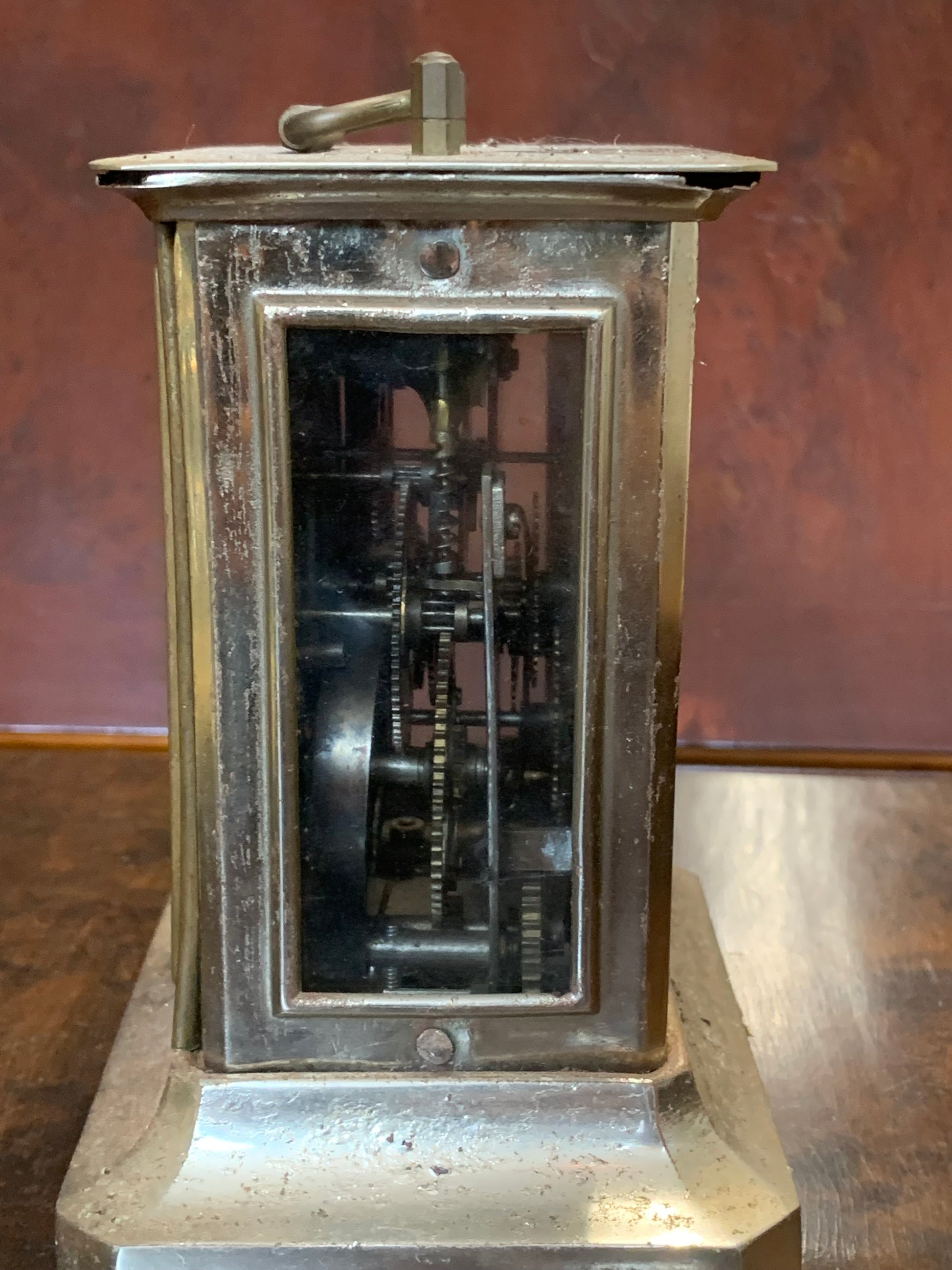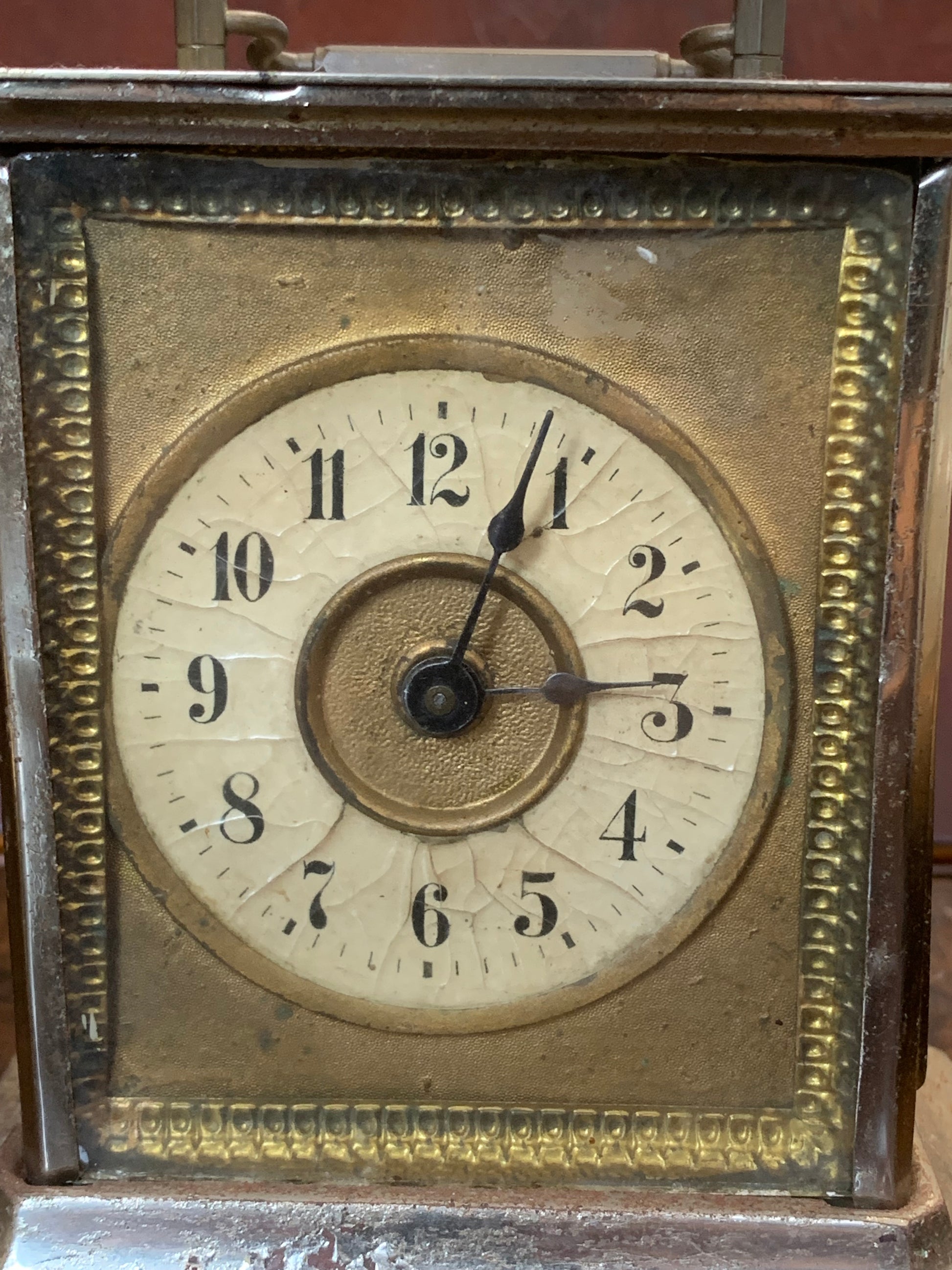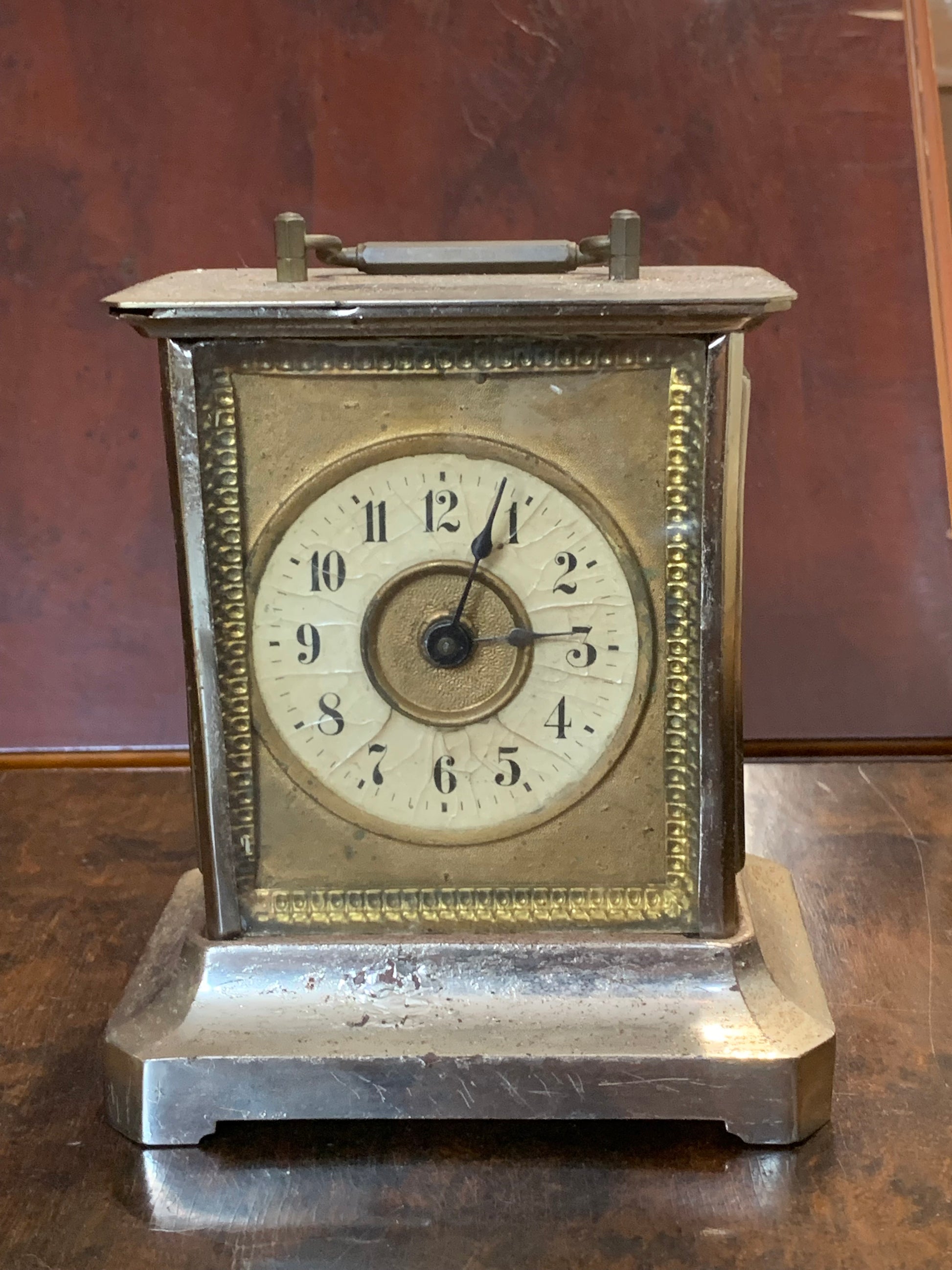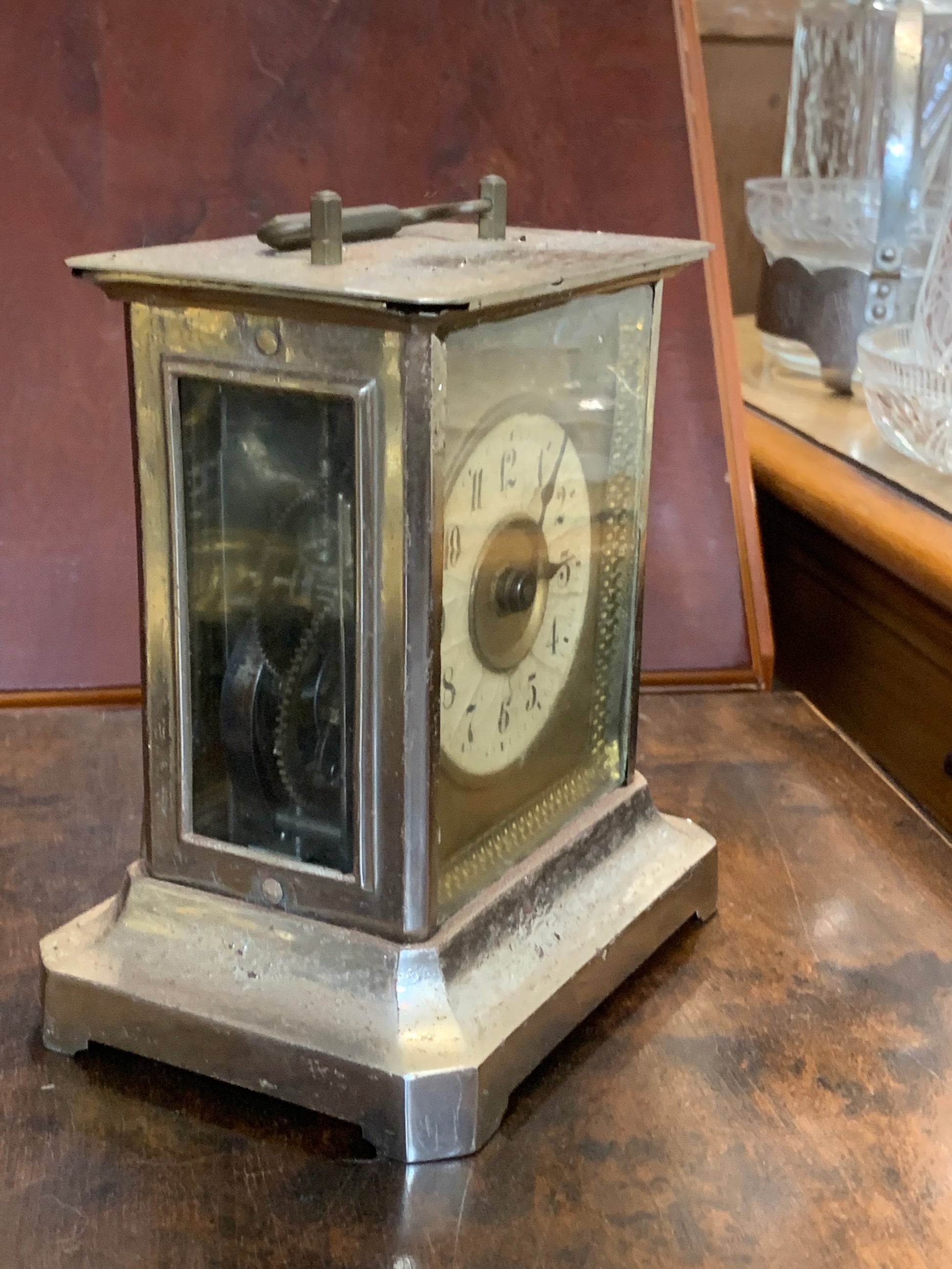 Zegar kominkowy mechaniczny w metalowej obudowie. Stan: do naprawy.