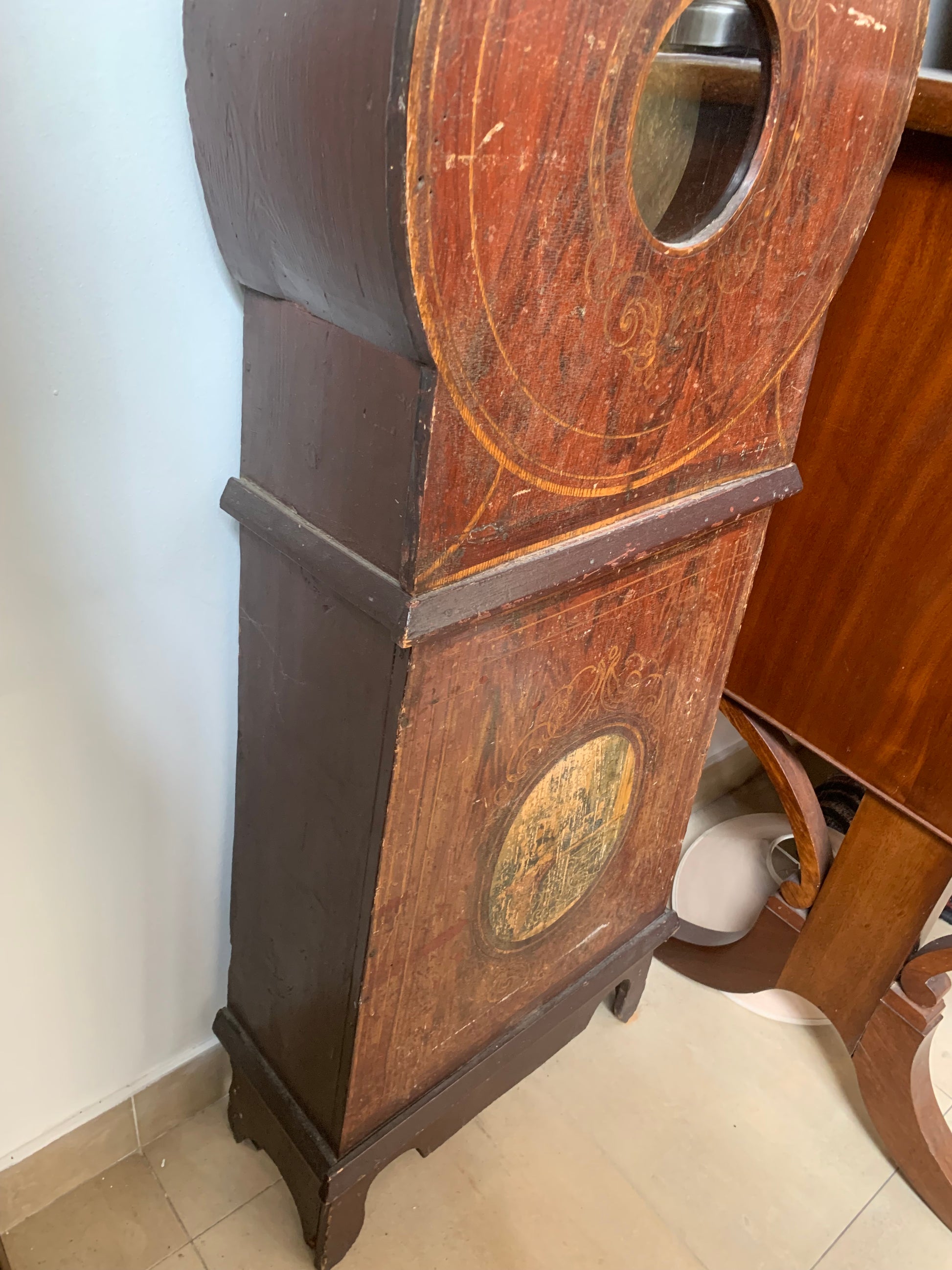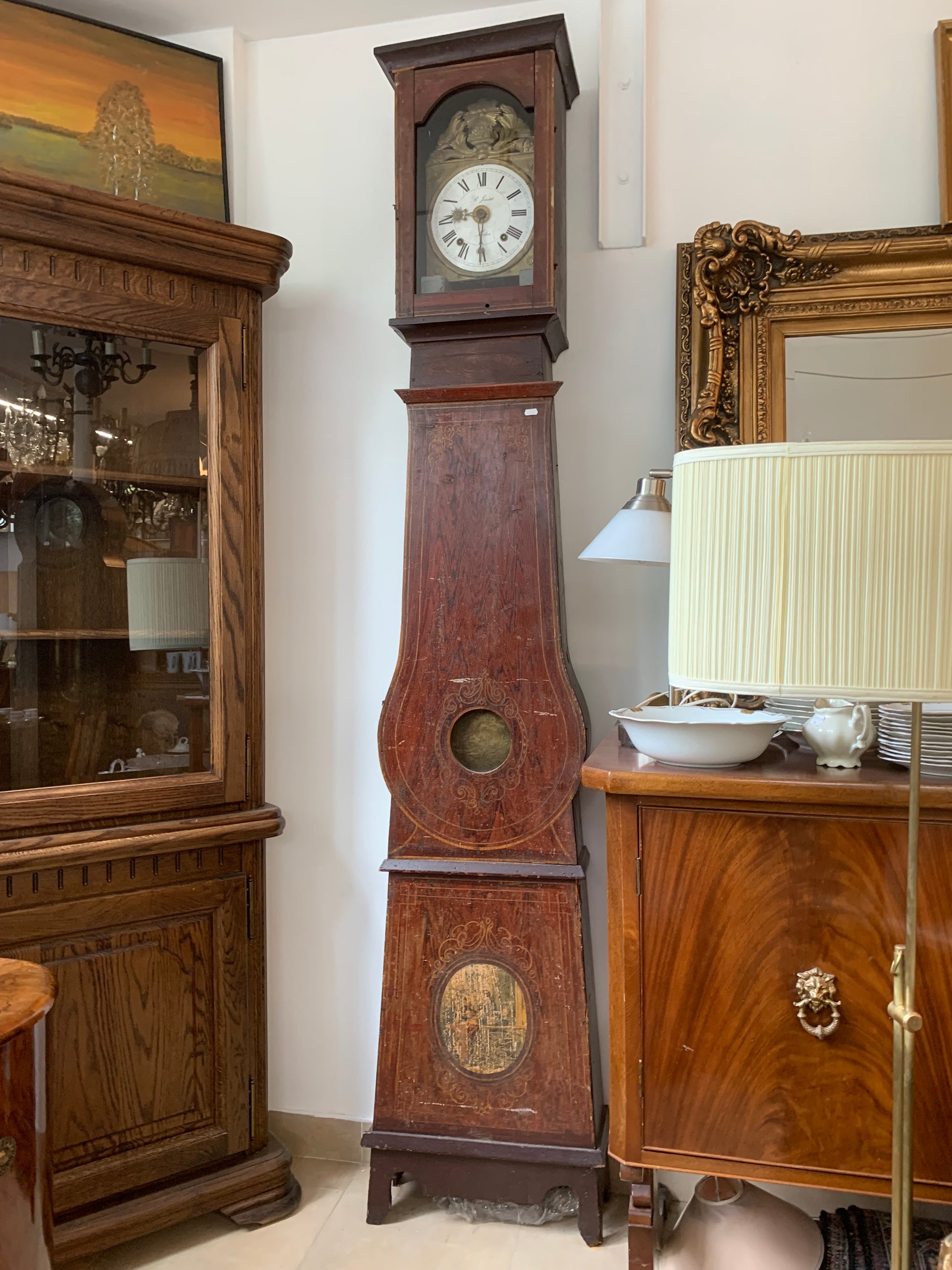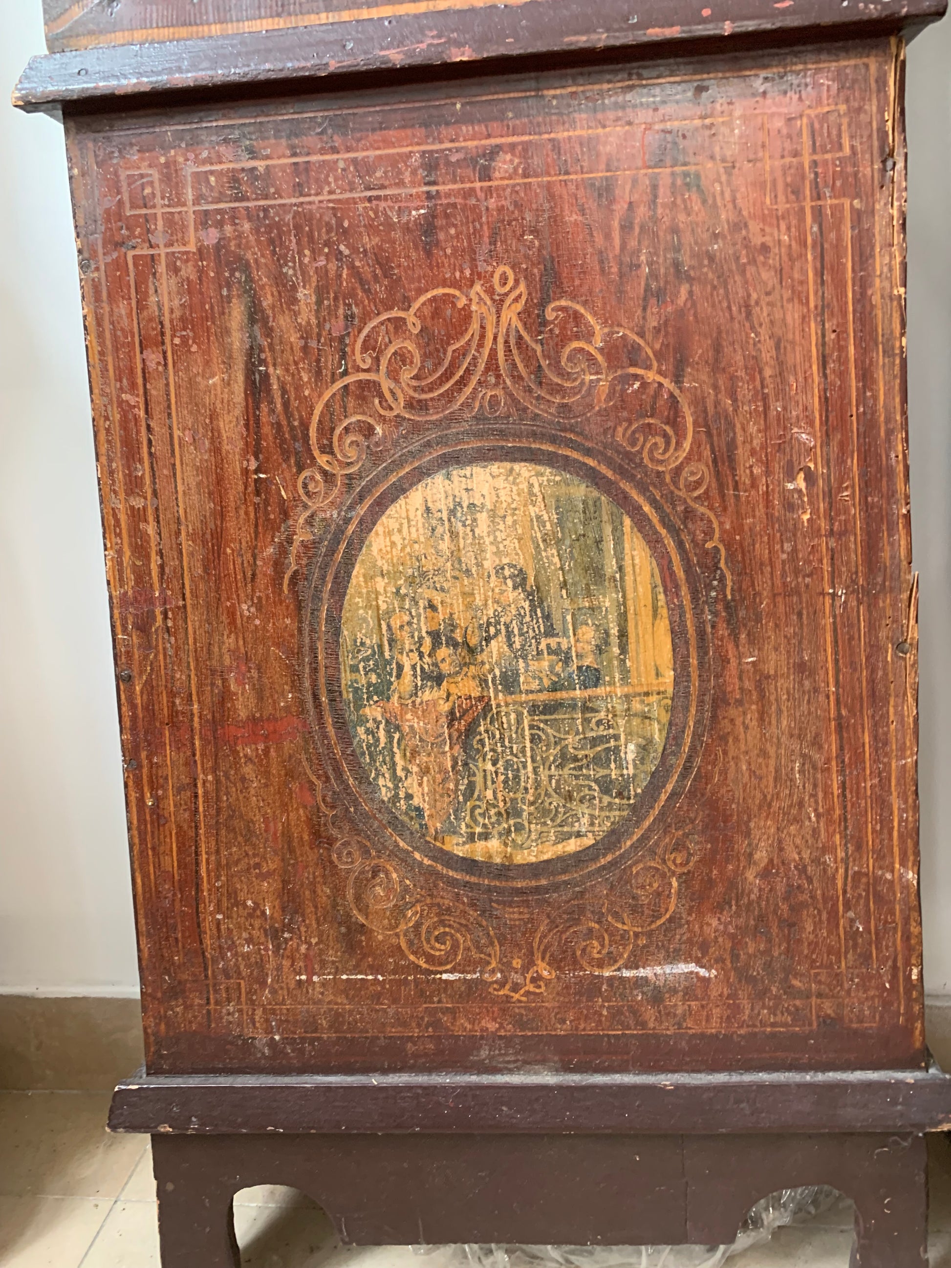 Zegar antyczny, francuski XVIII-XIX w. w oryginalnej, drewnianej obudowie zdobionej malowidłem, scenką rodzajową. Niezwykły, smukły kształt skrzyni, mechanizm kompletny, do uruchomienia.
