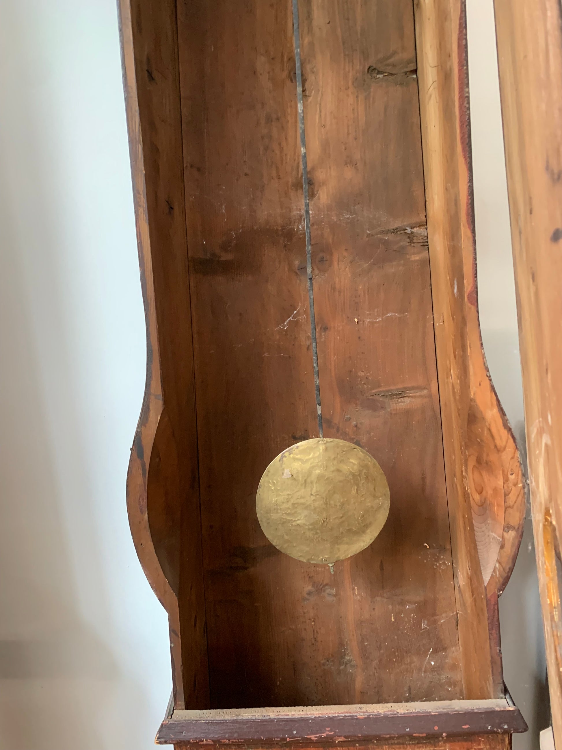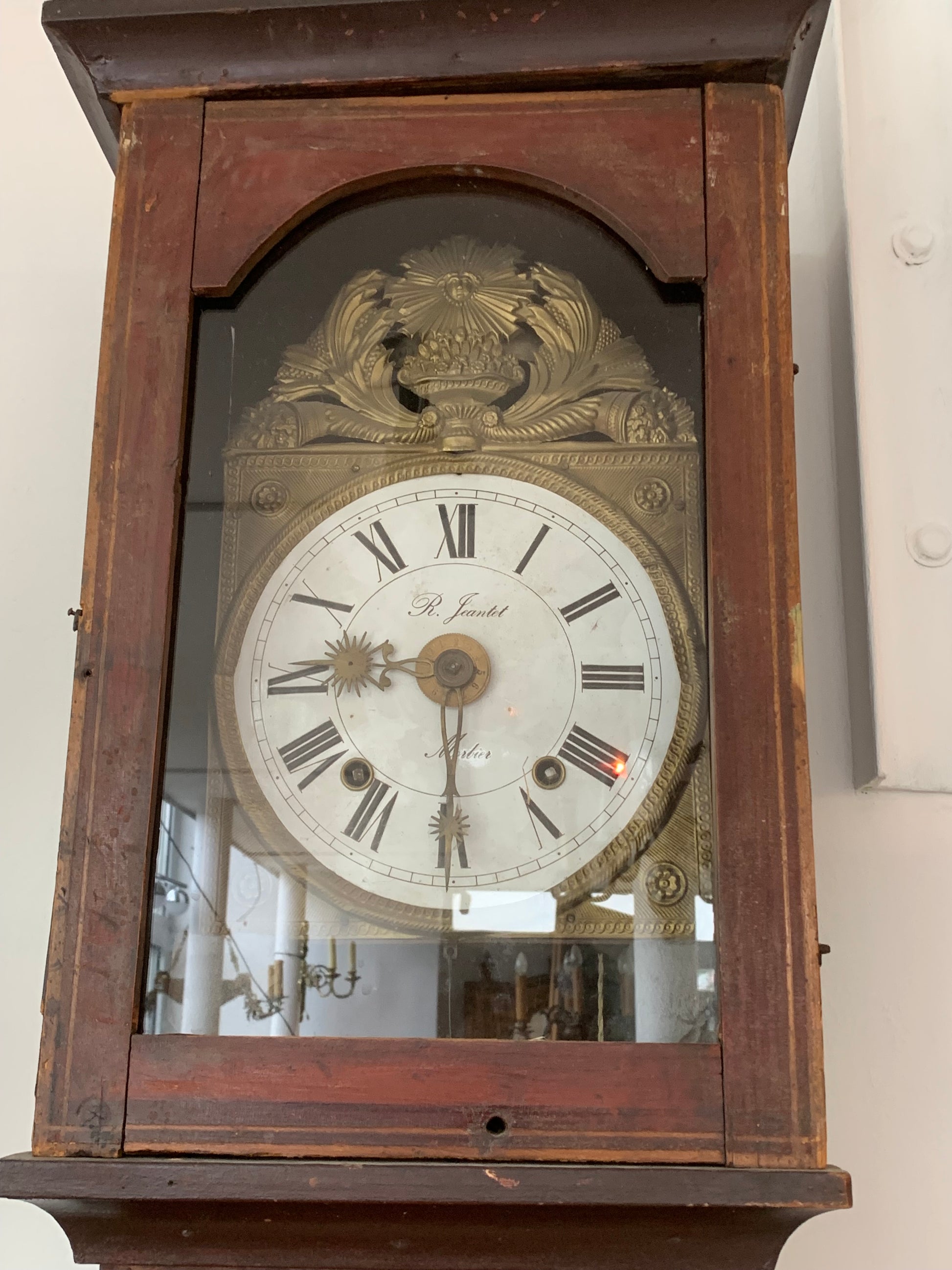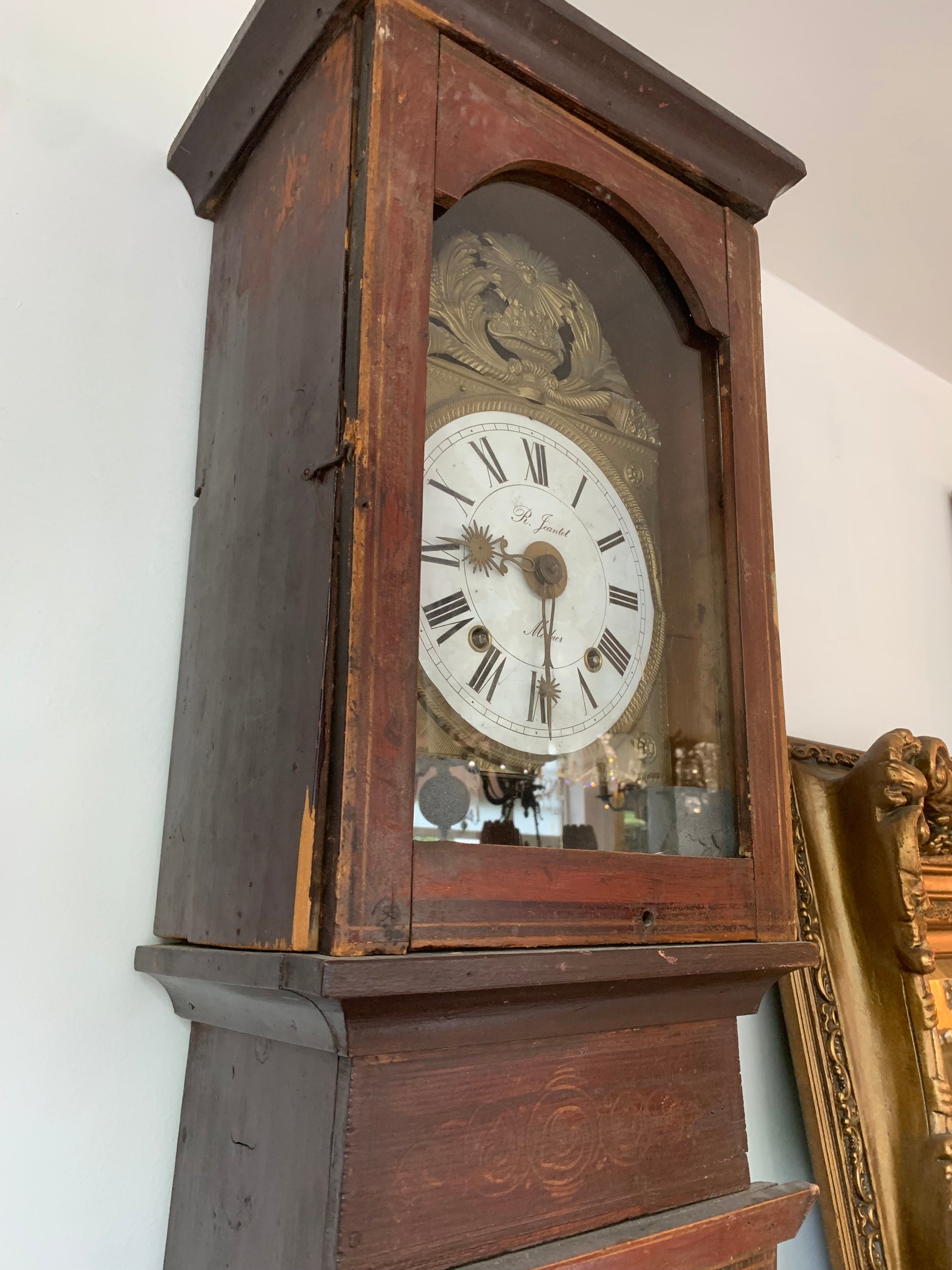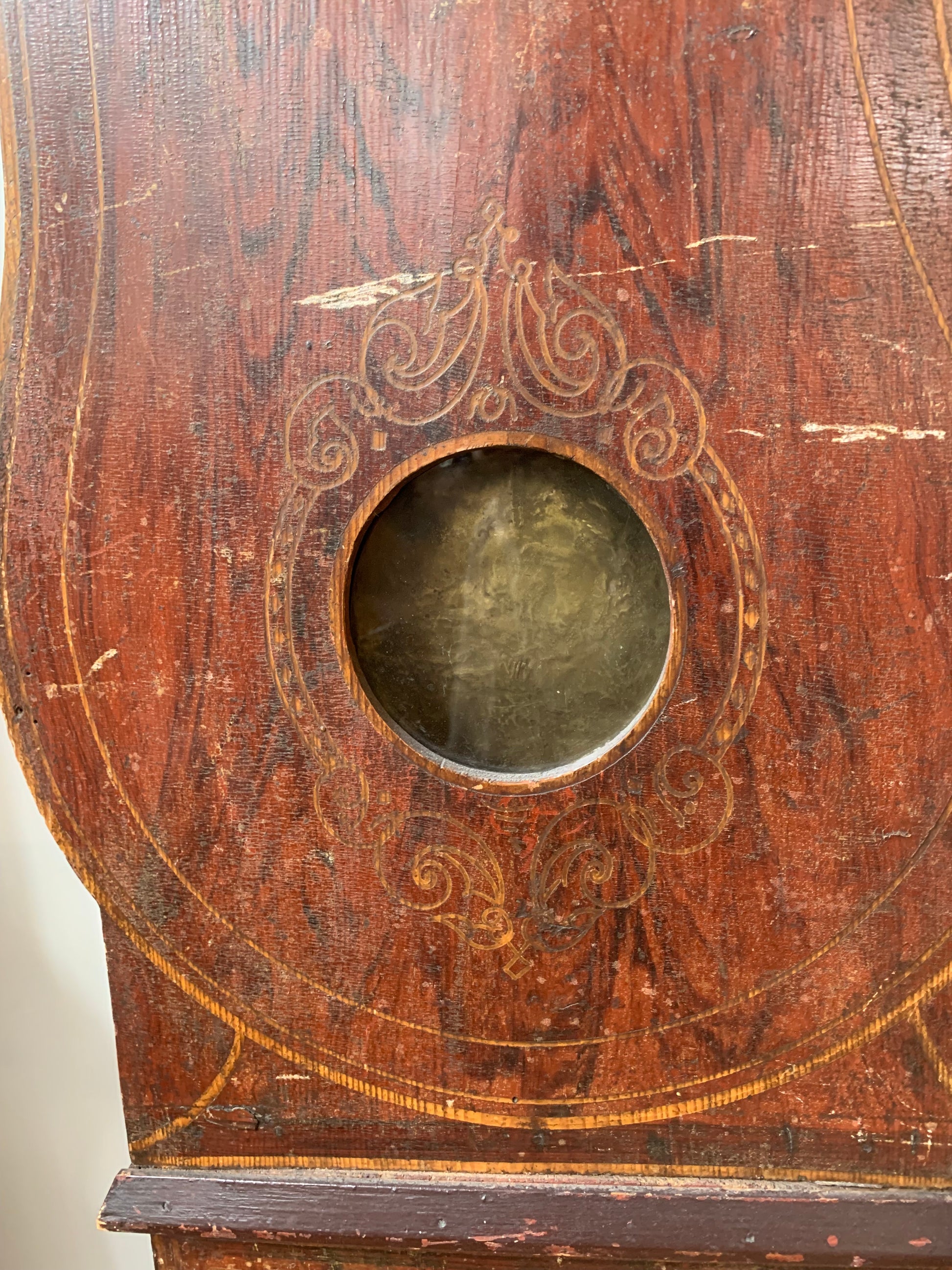 Zegar antyczny, francuski XVIII-XIX w. w oryginalnej, drewnianej obudowie zdobionej malowidłem, scenką rodzajową. Niezwykły, smukły kształt skrzyni, mechanizm kompletny, do uruchomienia.