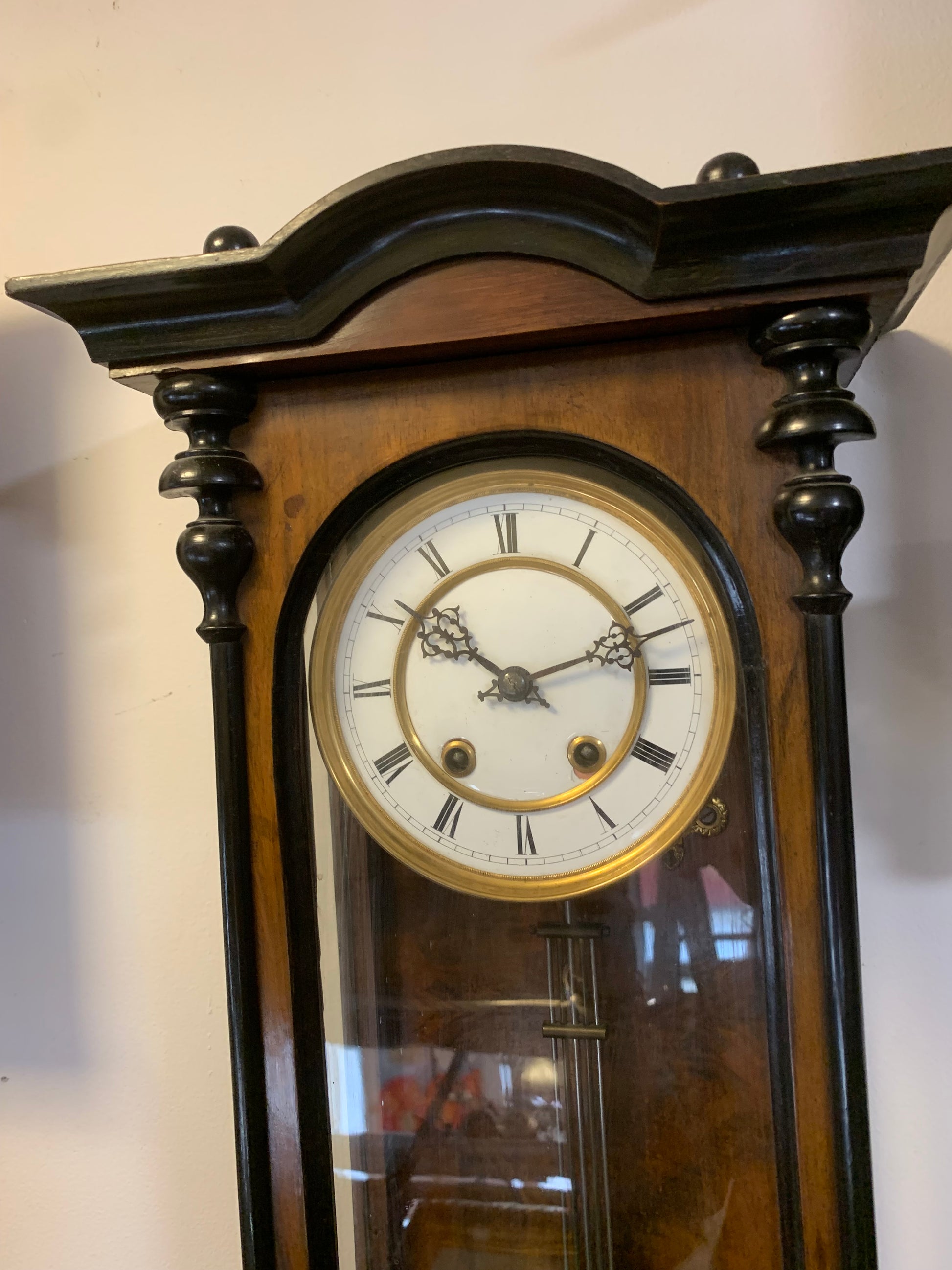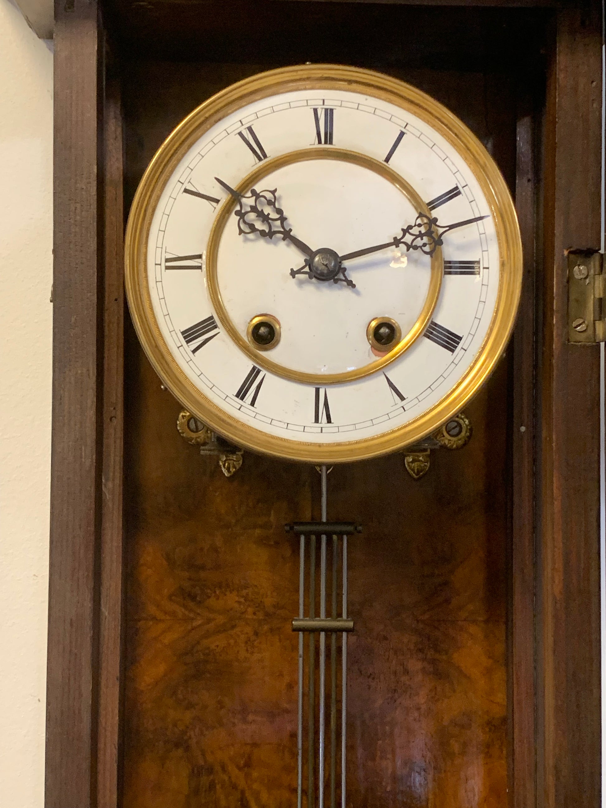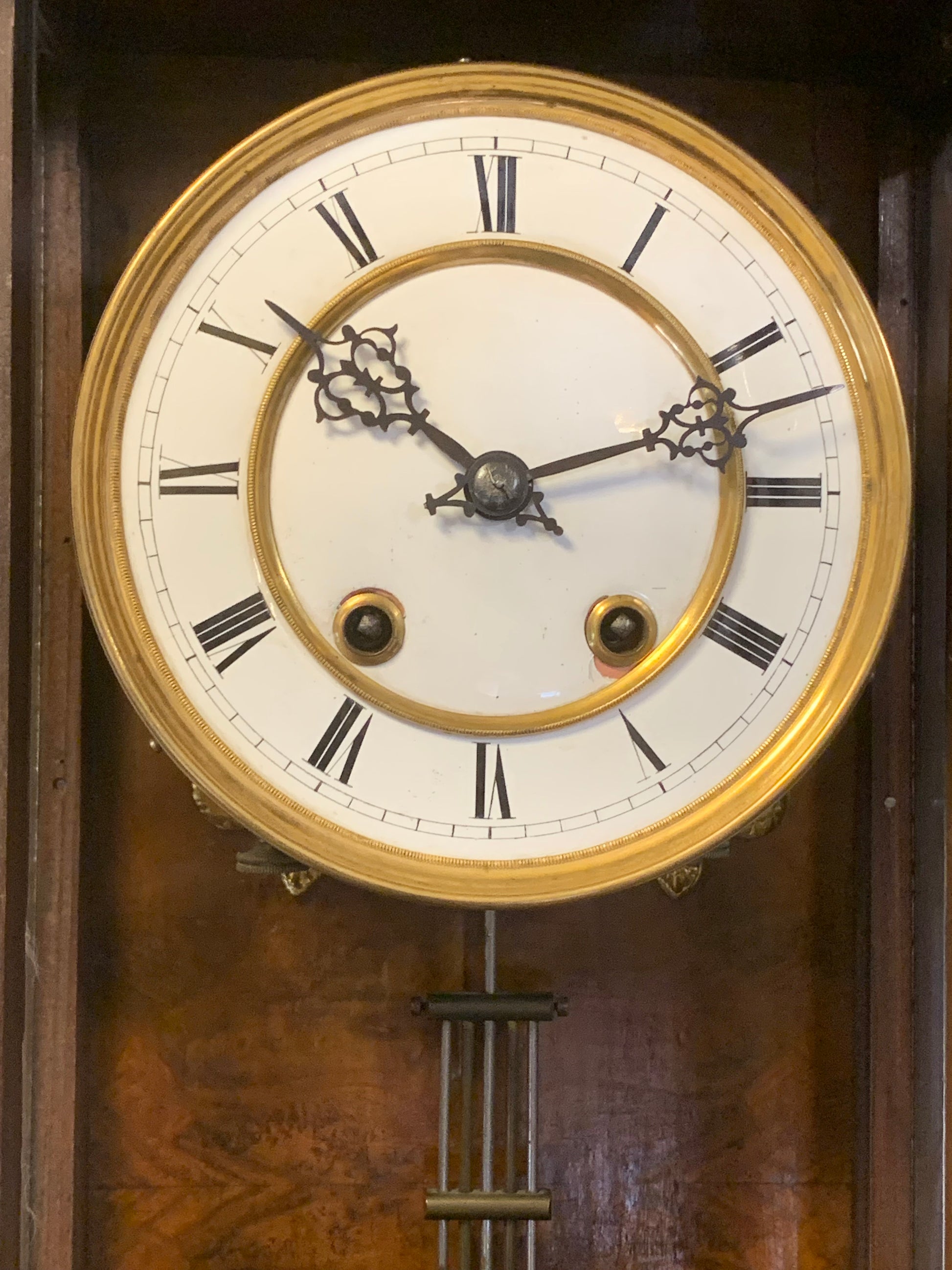 Zegar ścienny, wiktoriański, mechanizm niemiecki, działający. Skrzynia drewniana. Stan: dobry.