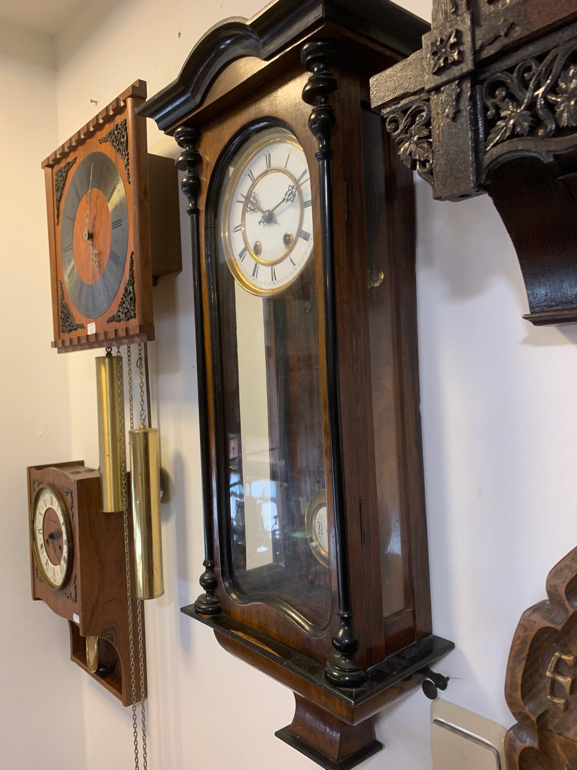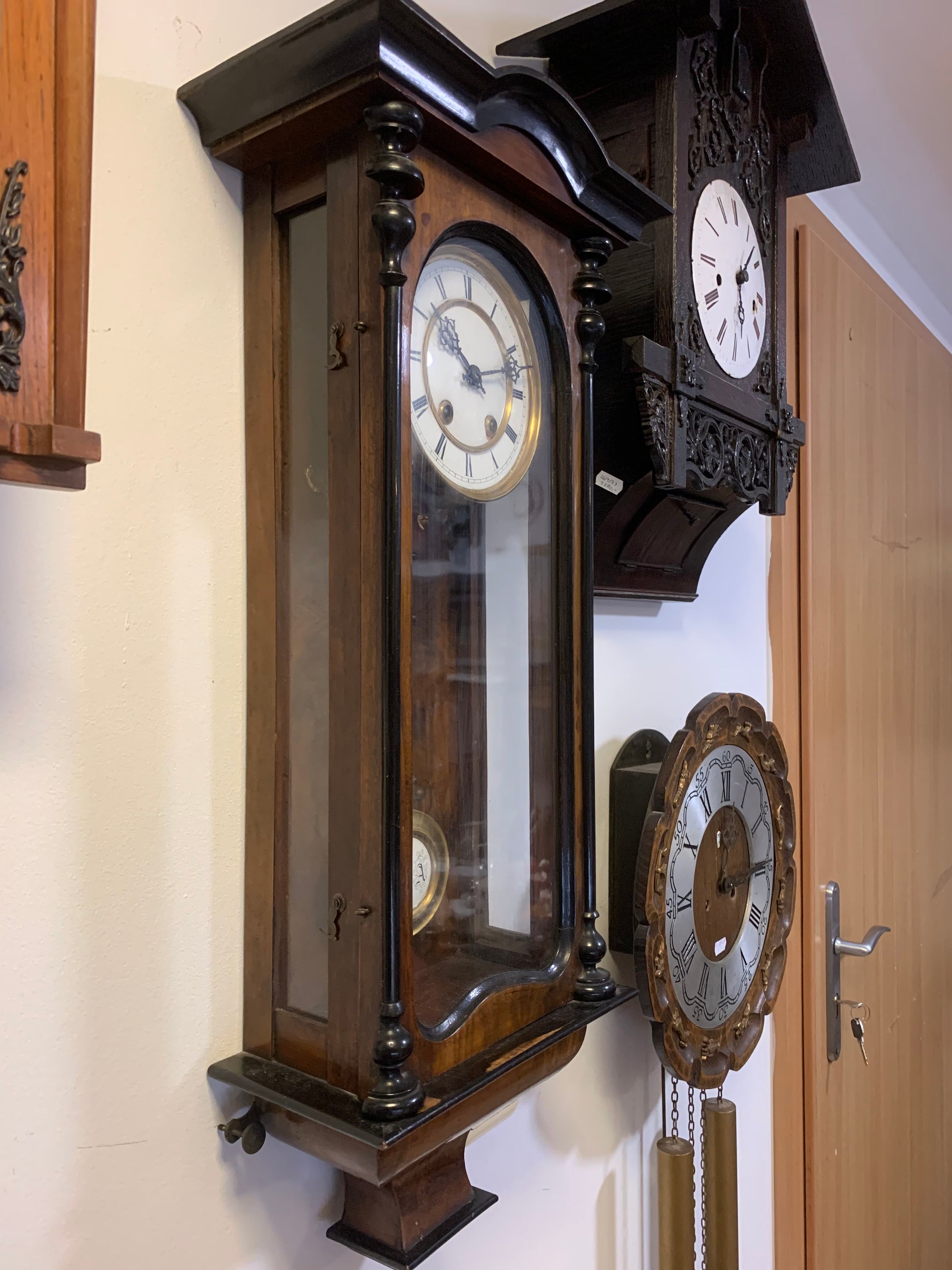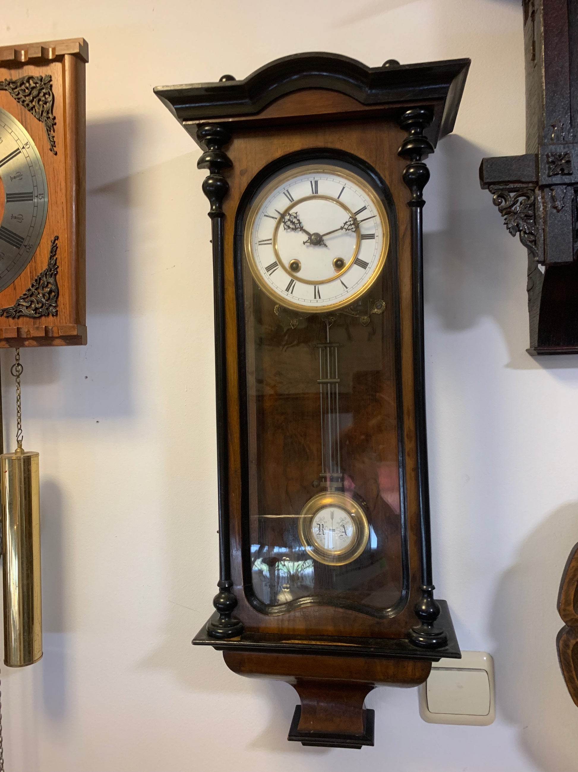 Zegar ścienny, wiktoriański, mechanizm niemiecki, działający. Skrzynia drewniana. Stan: dobry.