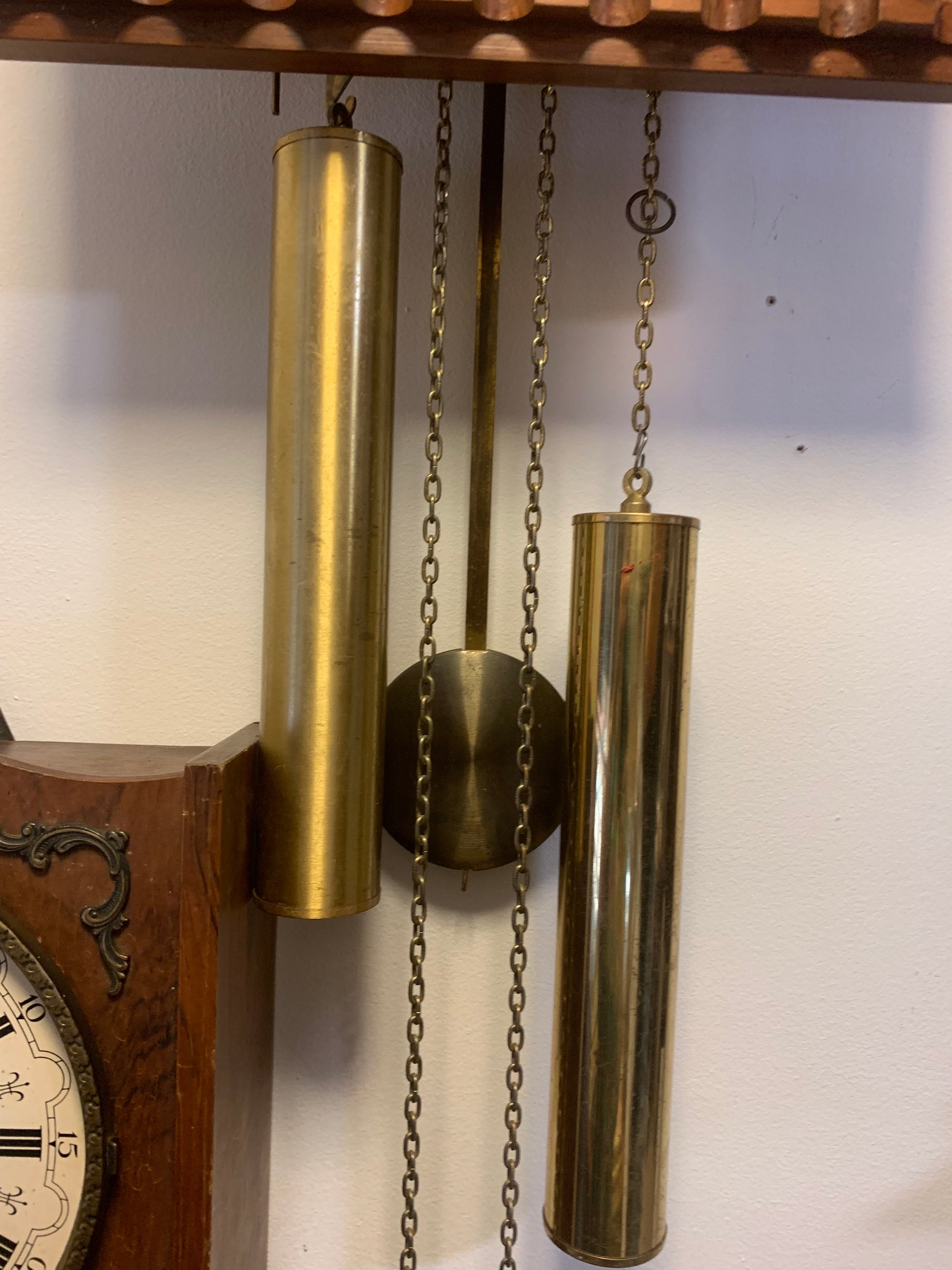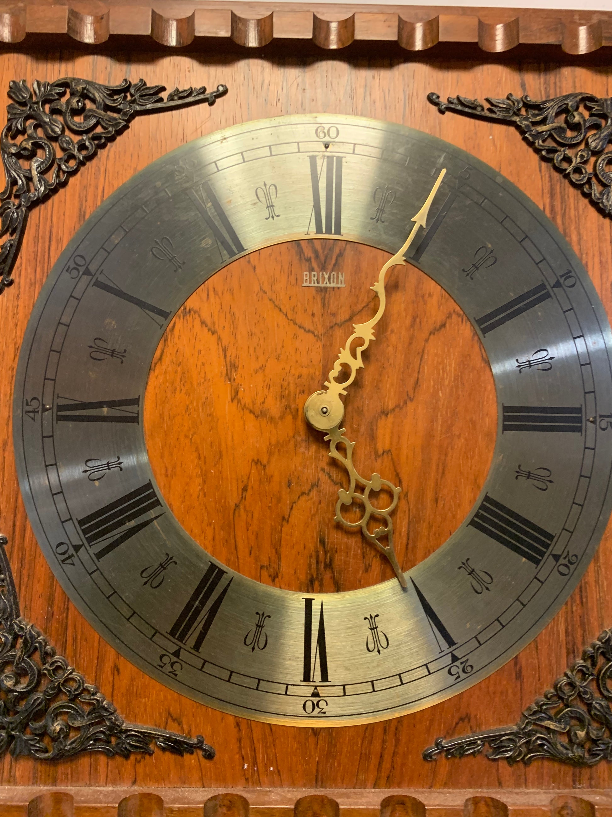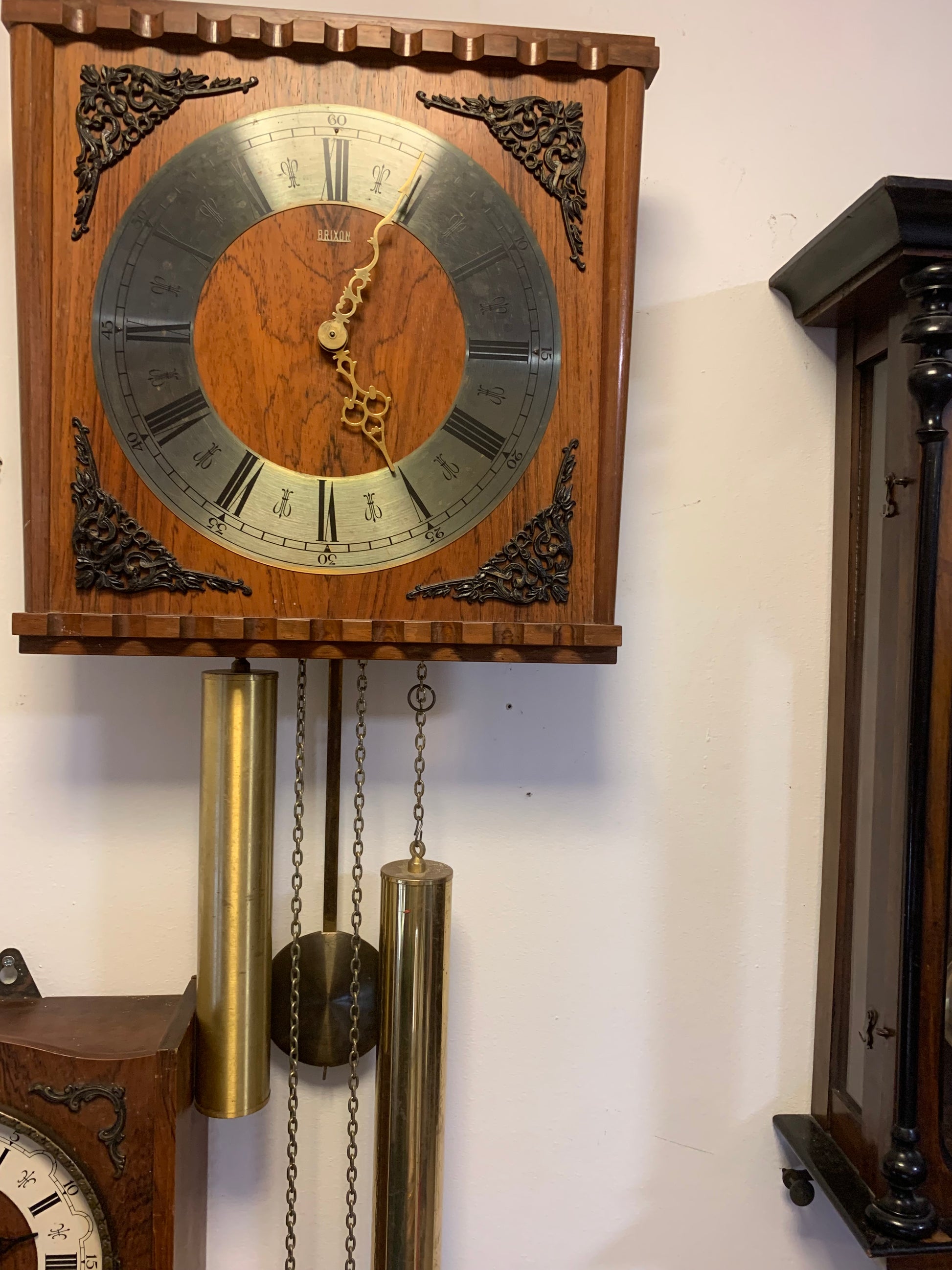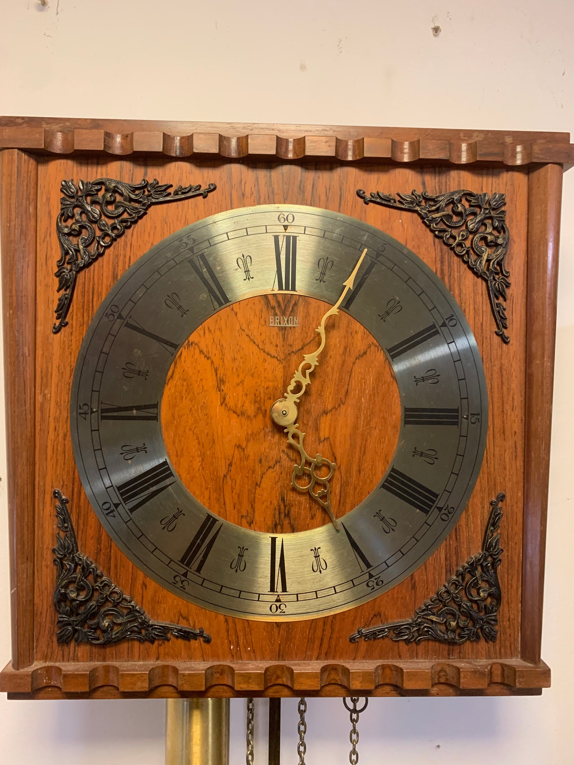 Zegar stylowy Brixon wagowy, kwadrat. Wagi i wahadło z mosiądzu. Stan: działający.