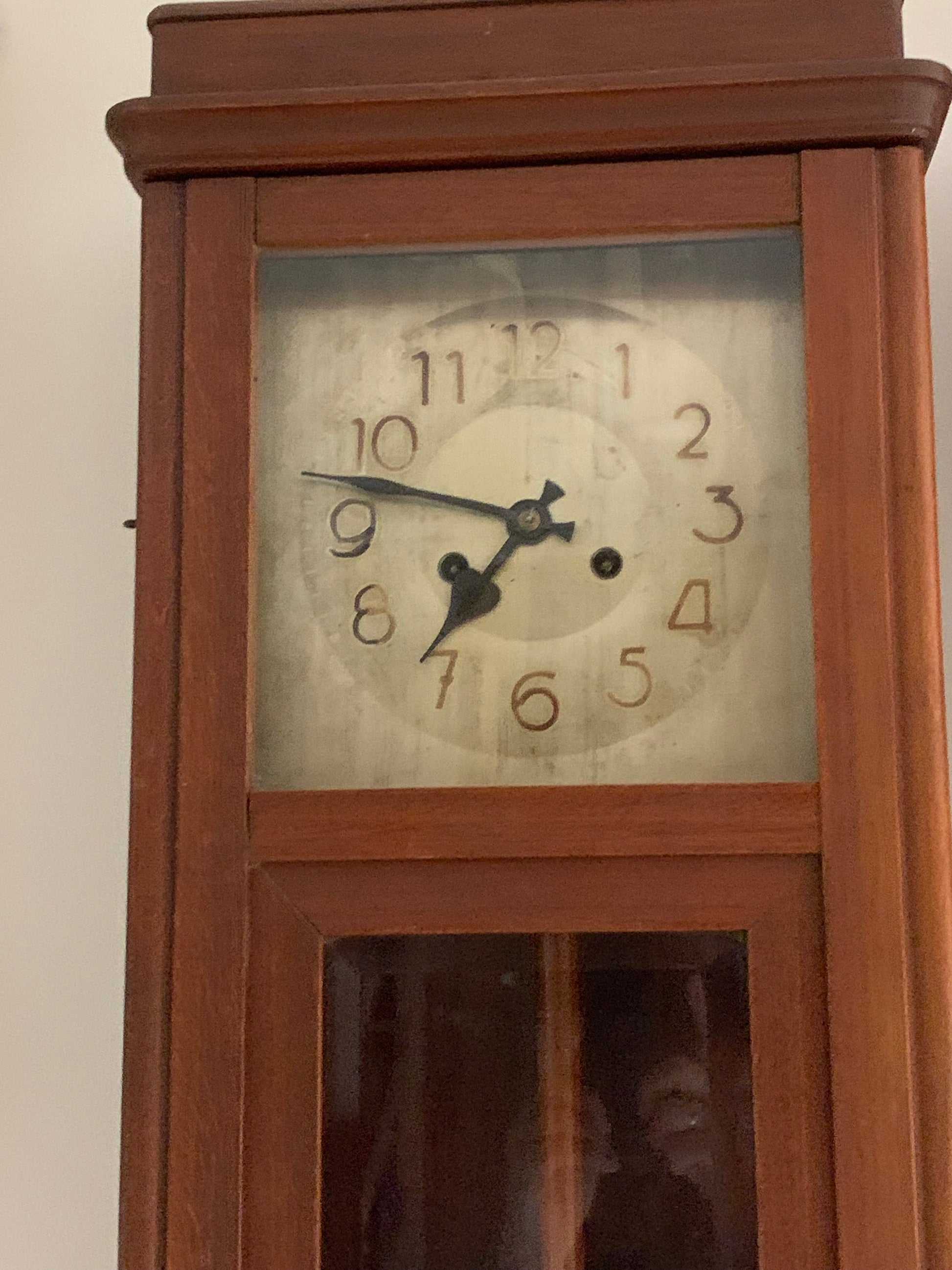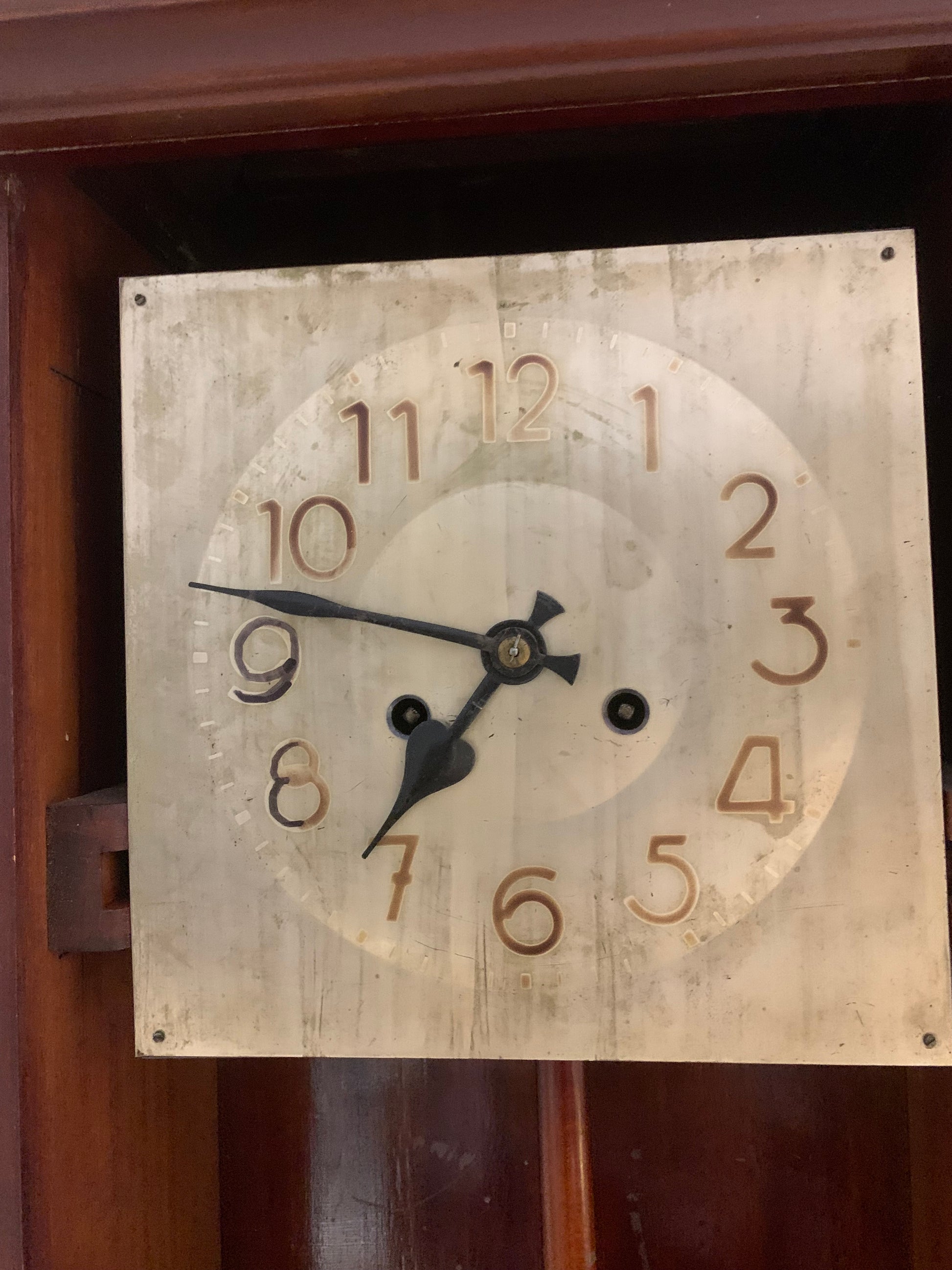 Zegar ścienny Art déco, lata 30-te, w drewnianej obudowie w kolorze palisandru. Bicie: pełne godziny i połówki. Rezerwa chodu ok. 14 dni. Stan: działający.