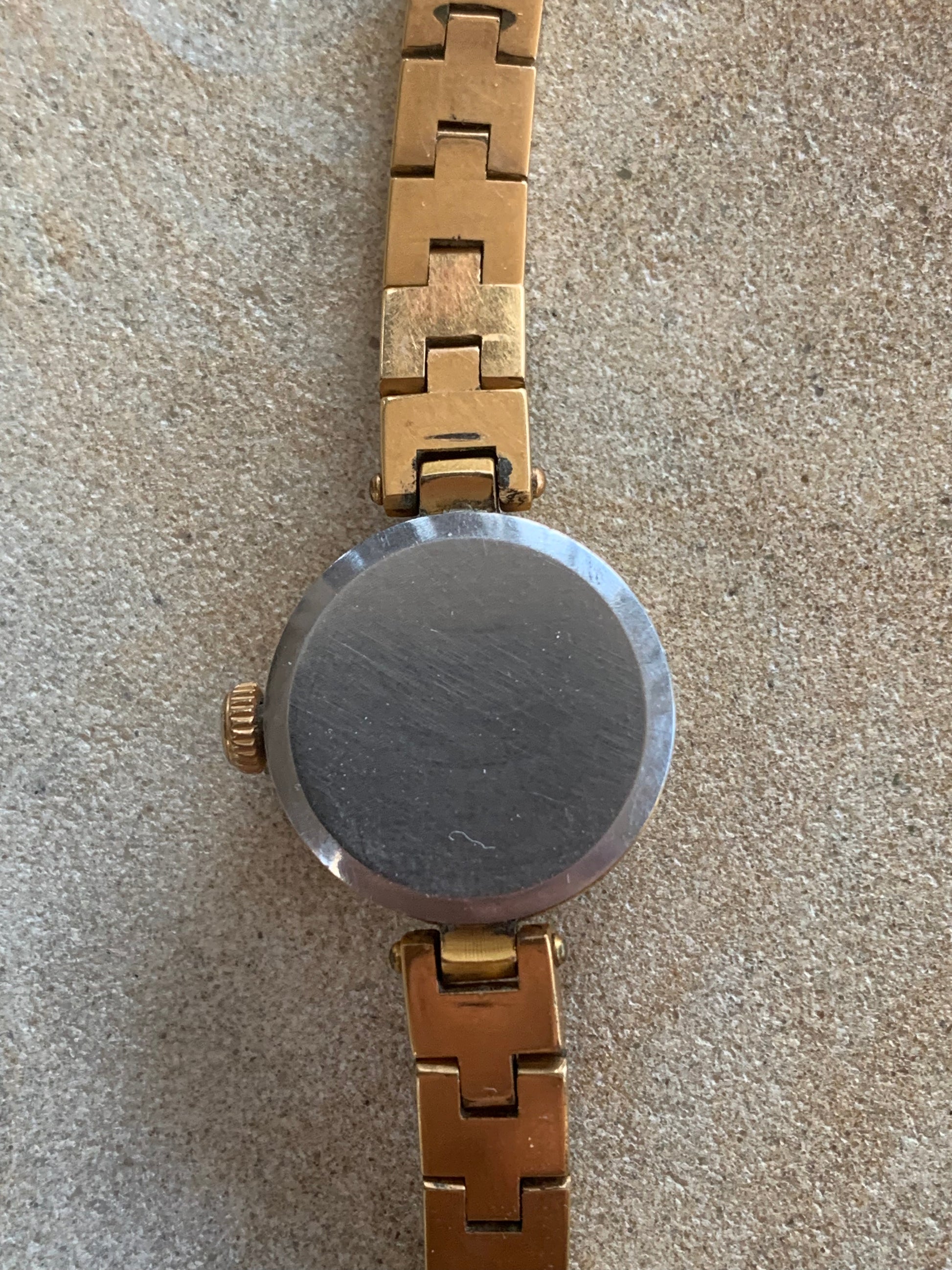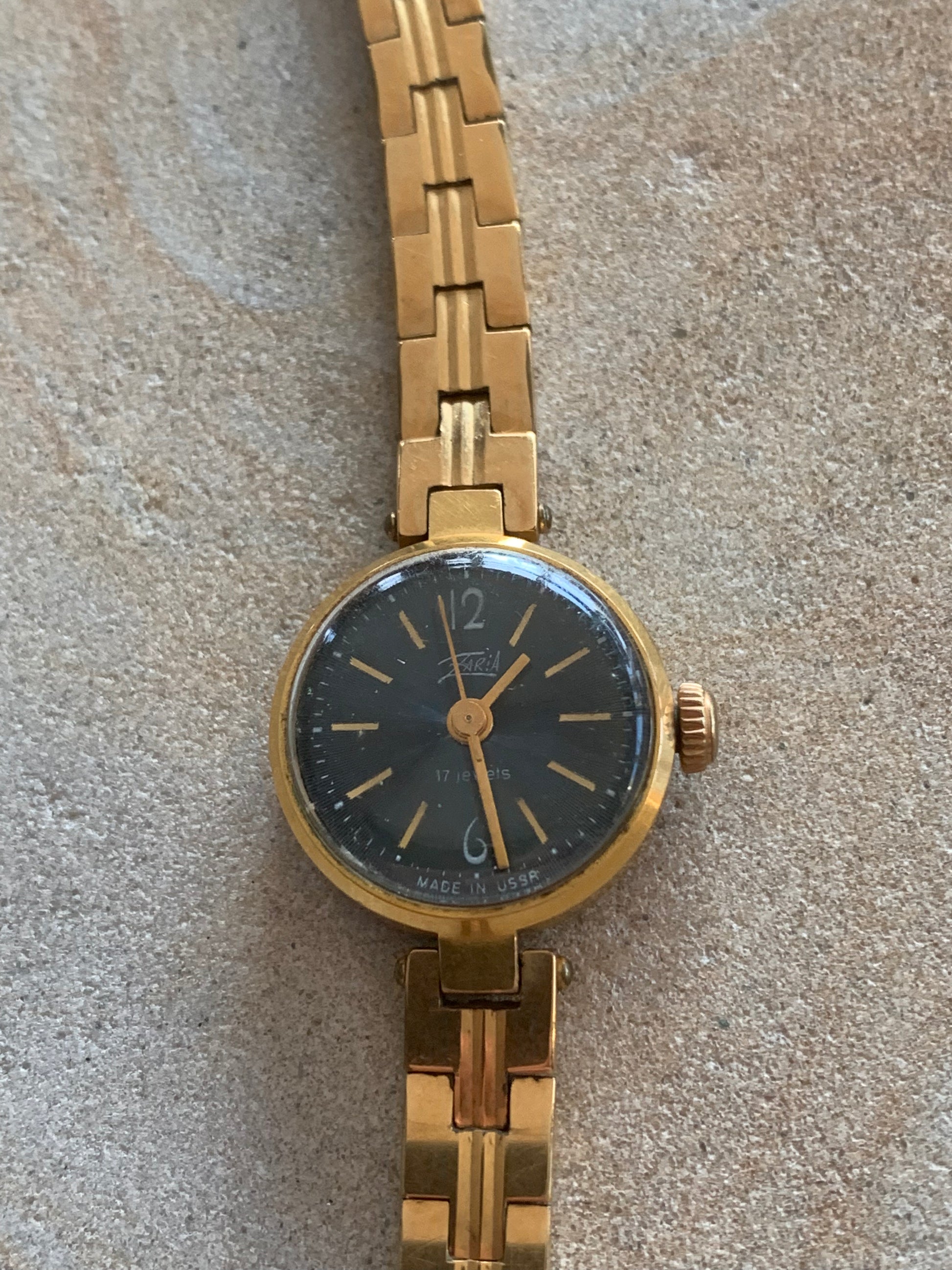 Zegarek damski Zaria, mechaniczny, ZSRR, lata 60-te, cyferblat czarny, koperta i bransoleta pozłacana, 17 kamieni.
