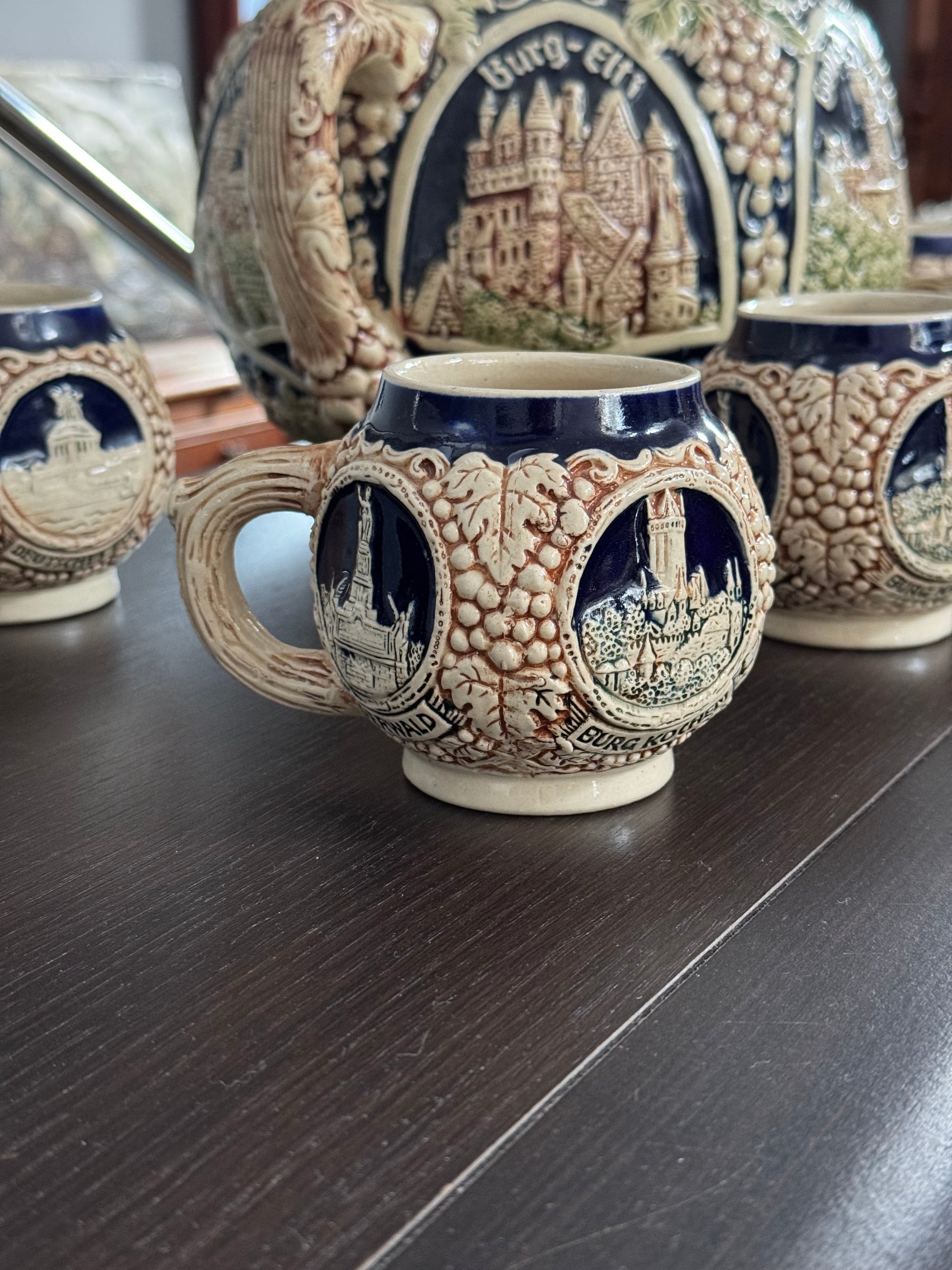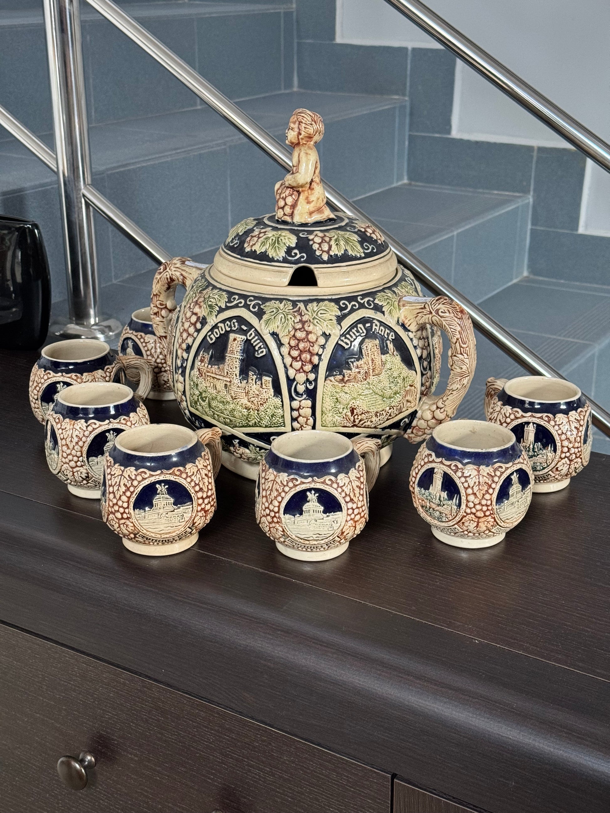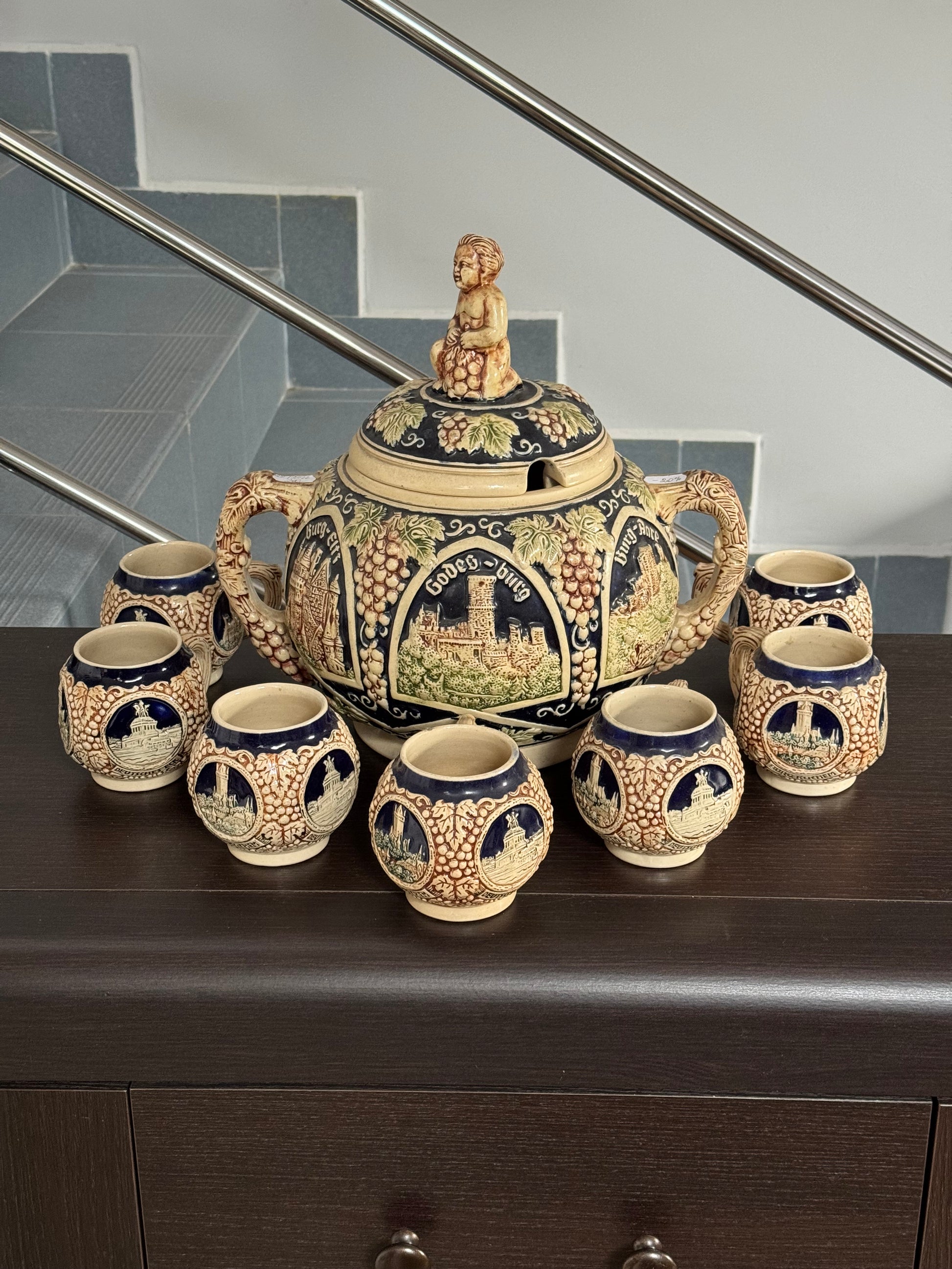 Zestaw do ponczu, waza i 7 kubków, zrobiony z ceramiki.