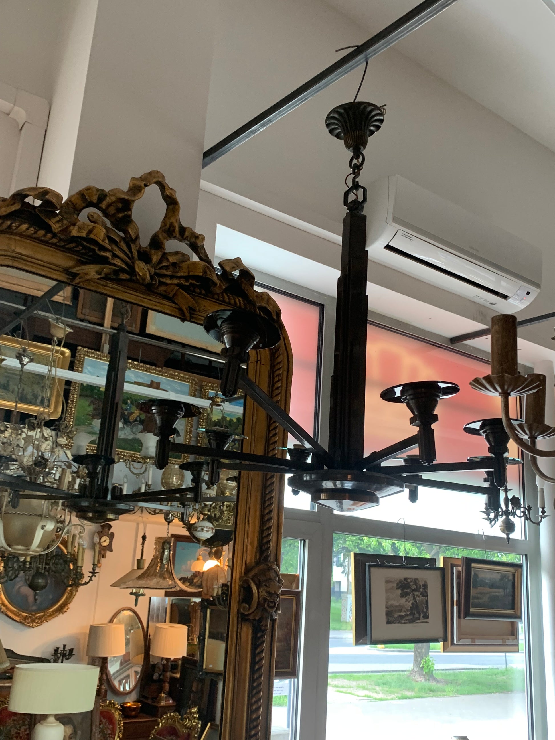 Oryginalny żyrandol Art Déco z lat 30, Marciniak, ośmioramienny, z profili kwadratowych, talerze szklane jako podstawa do żarówek. Stan: sprawny.