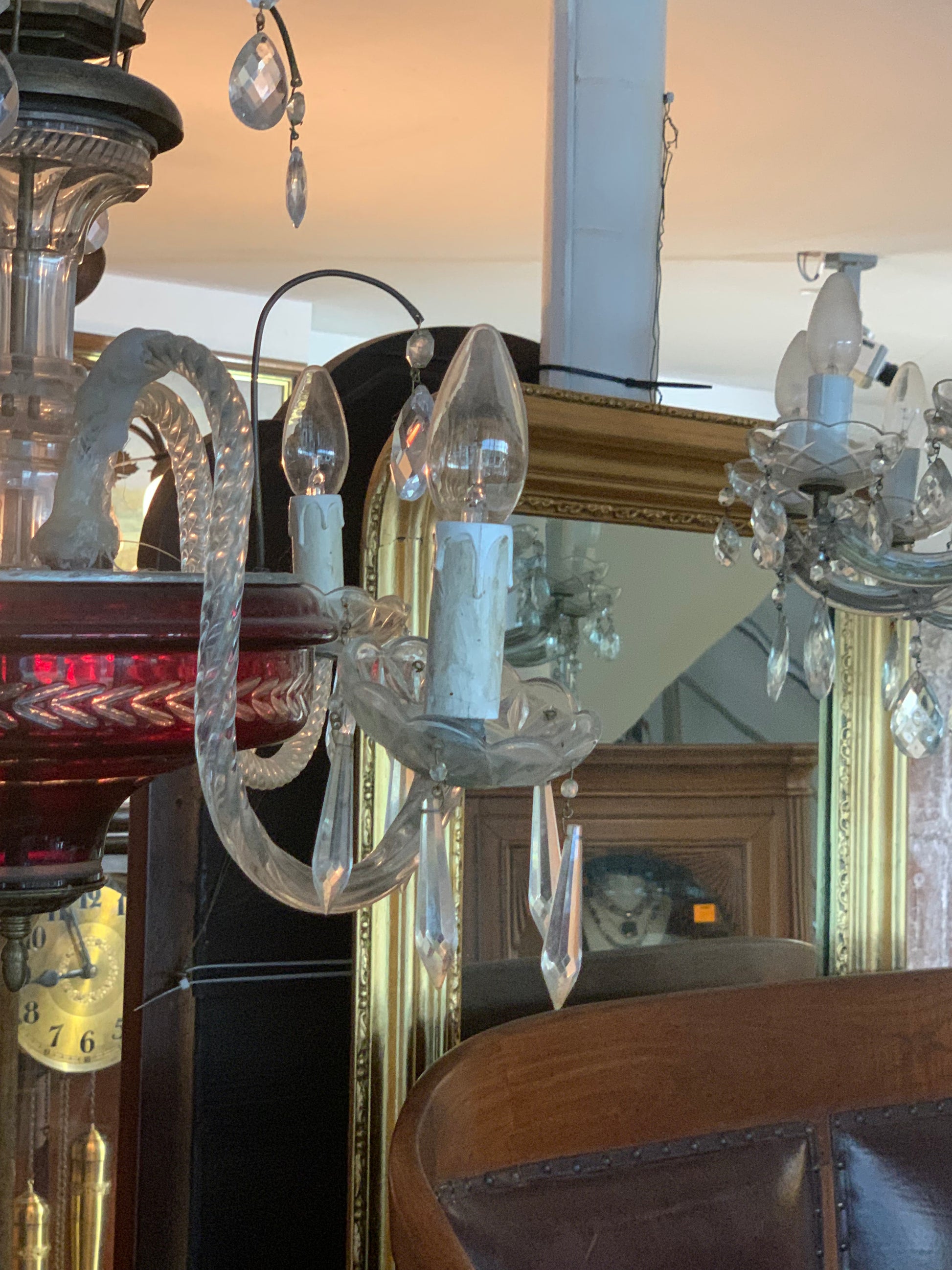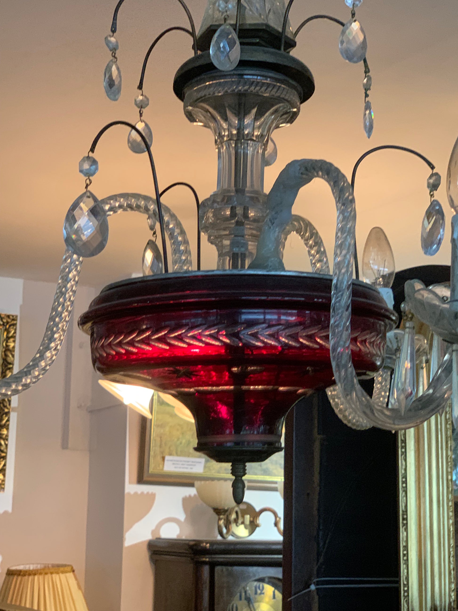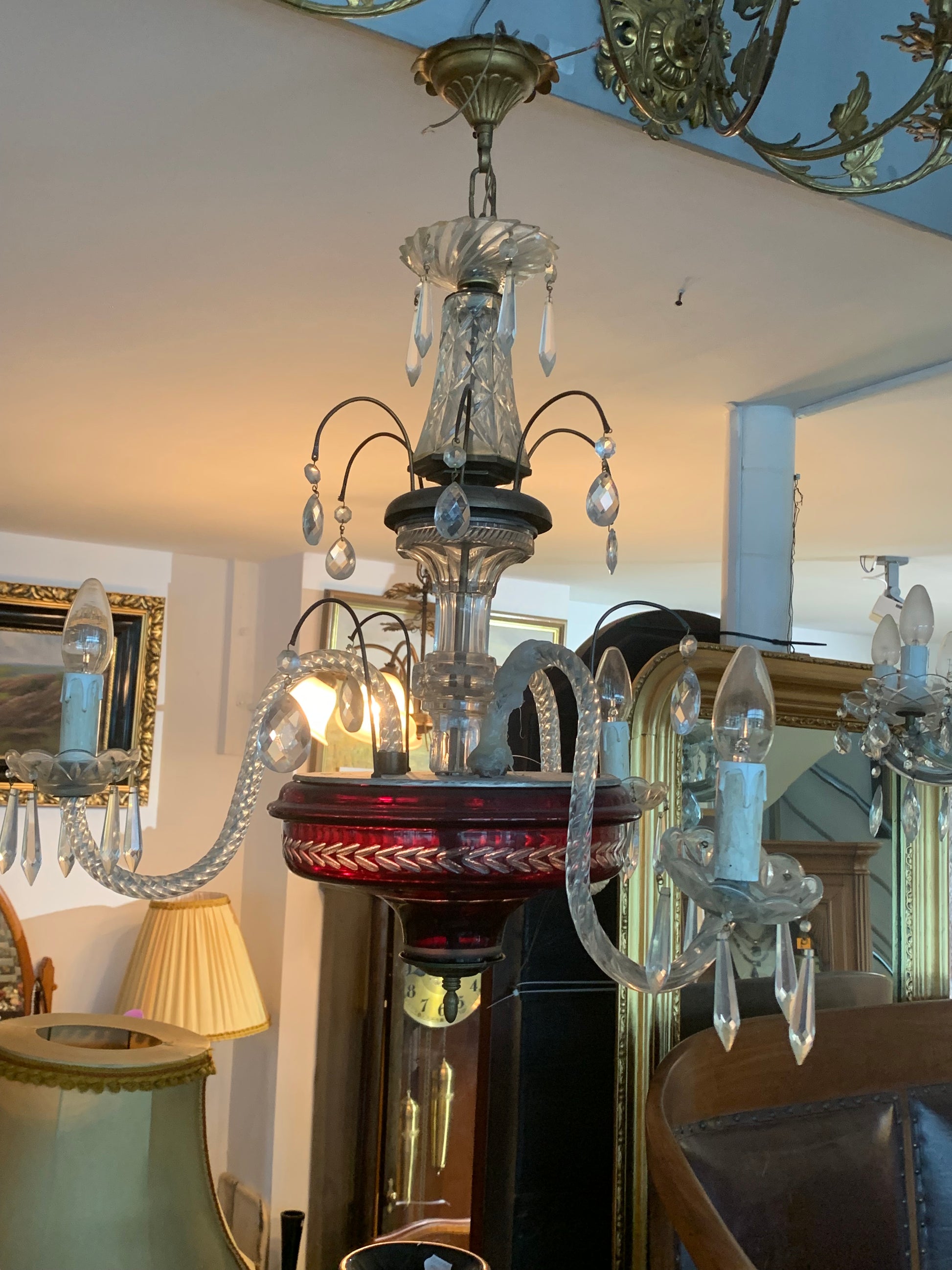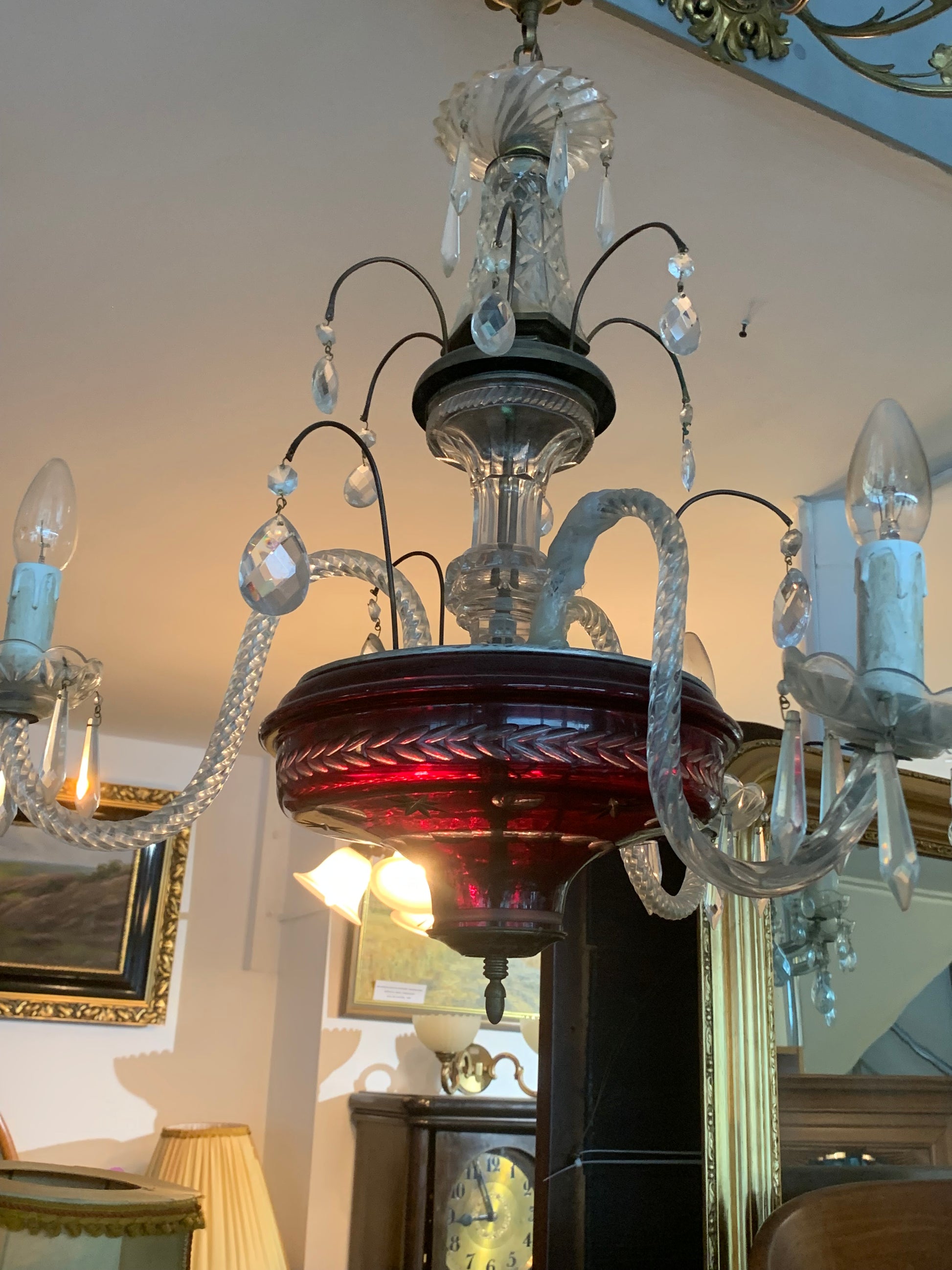 Unikatowy żyrandol secesyjny, kryształowy, pocz. XX wieku, oryginalna kopuła kryształowa w kolorze bordowym, ręcznie rżnięta, delikatnie zdobiony łezkami z fazowanego kryształu. Stan sprawny.
