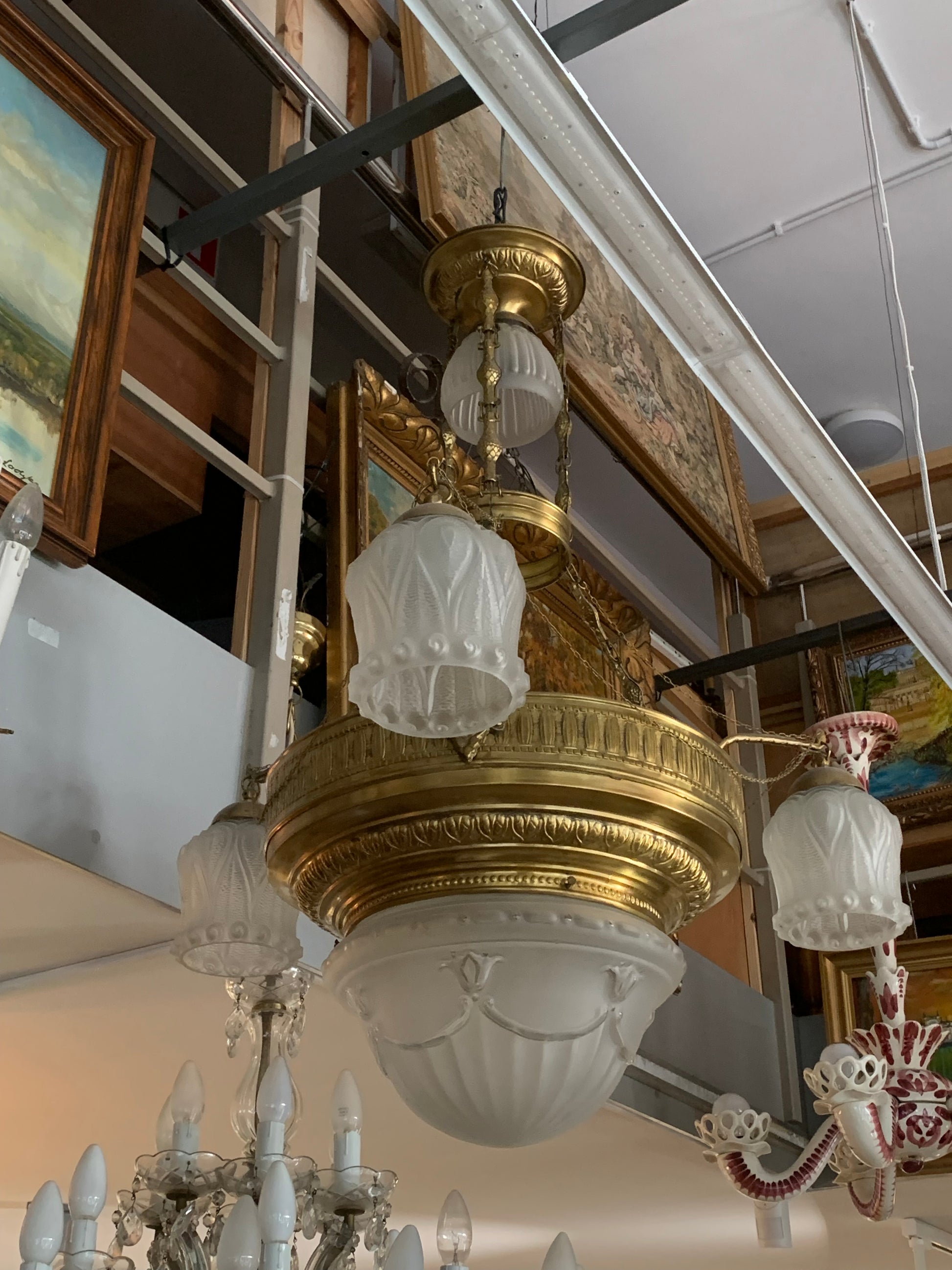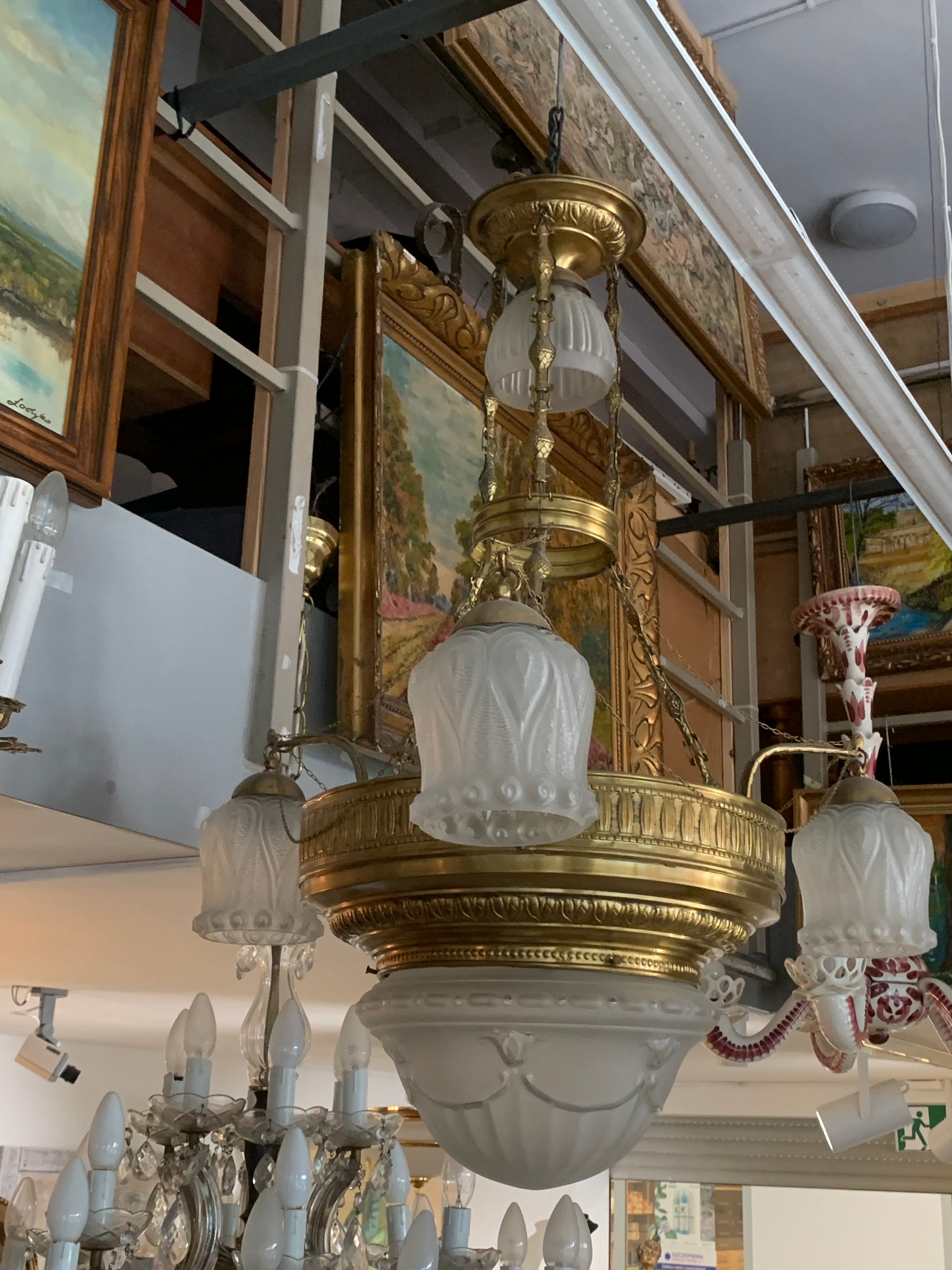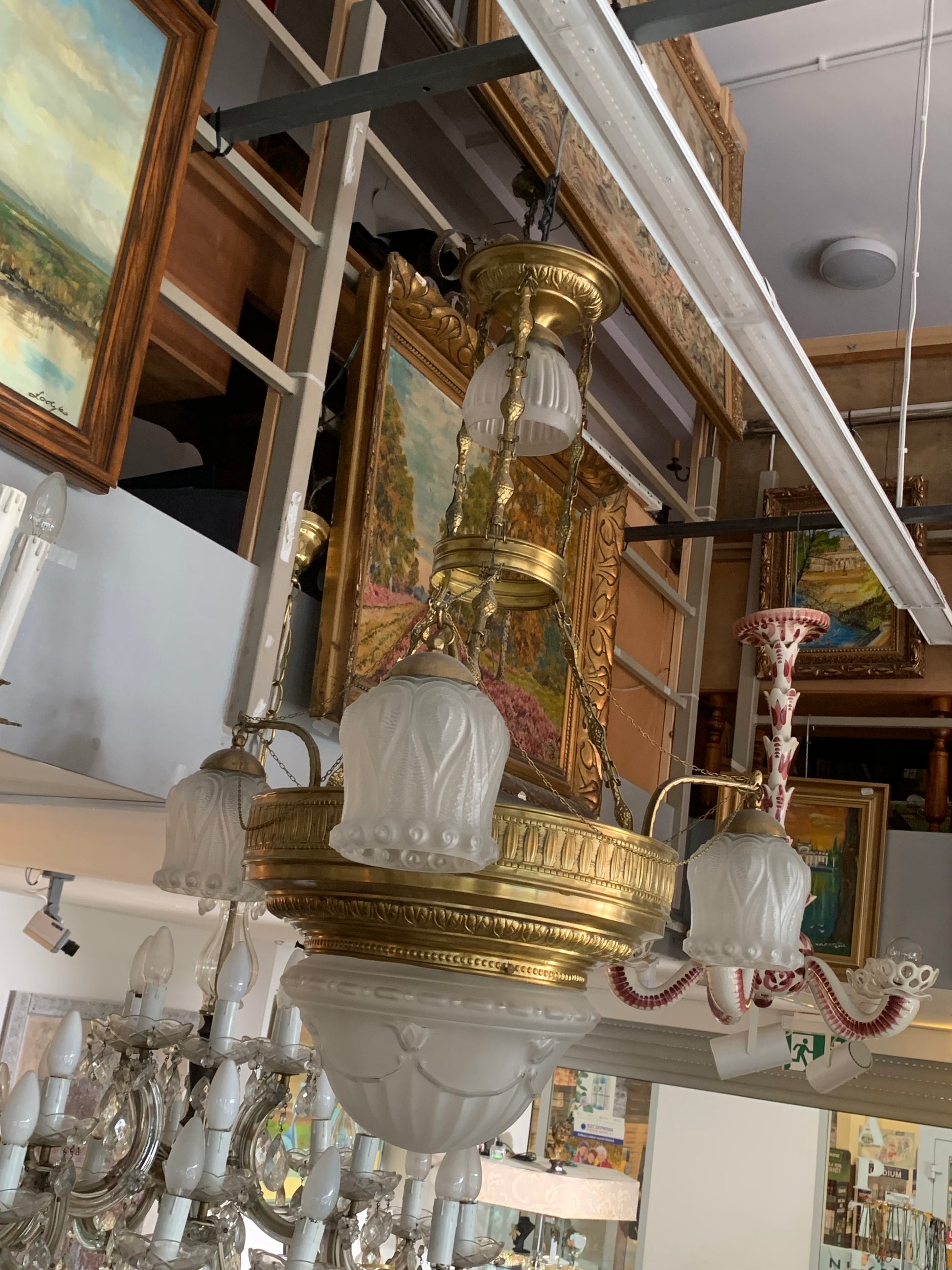 Piękna lampa, żyrandol mosiądz, secesja. Klosze z mlecznego szkła, piękne zdobienia.