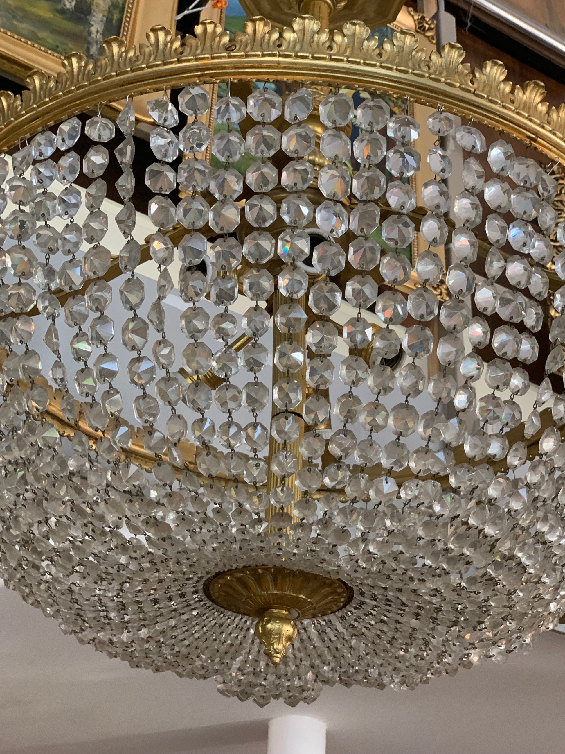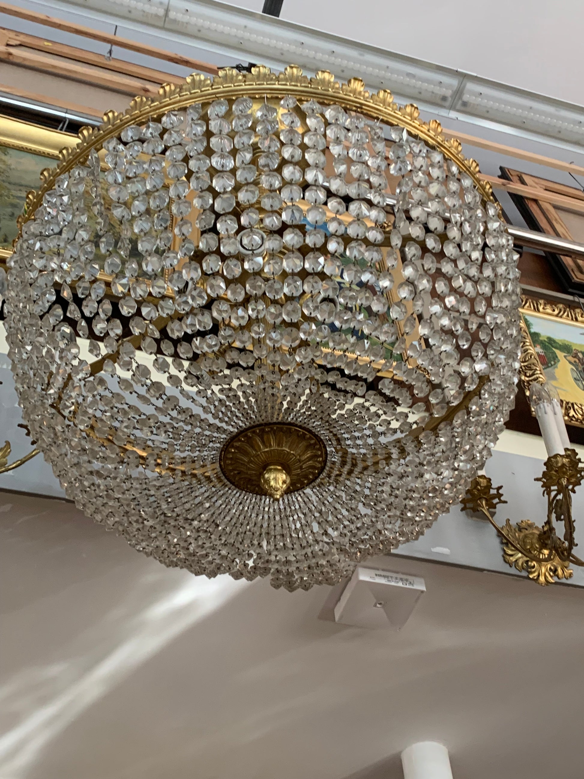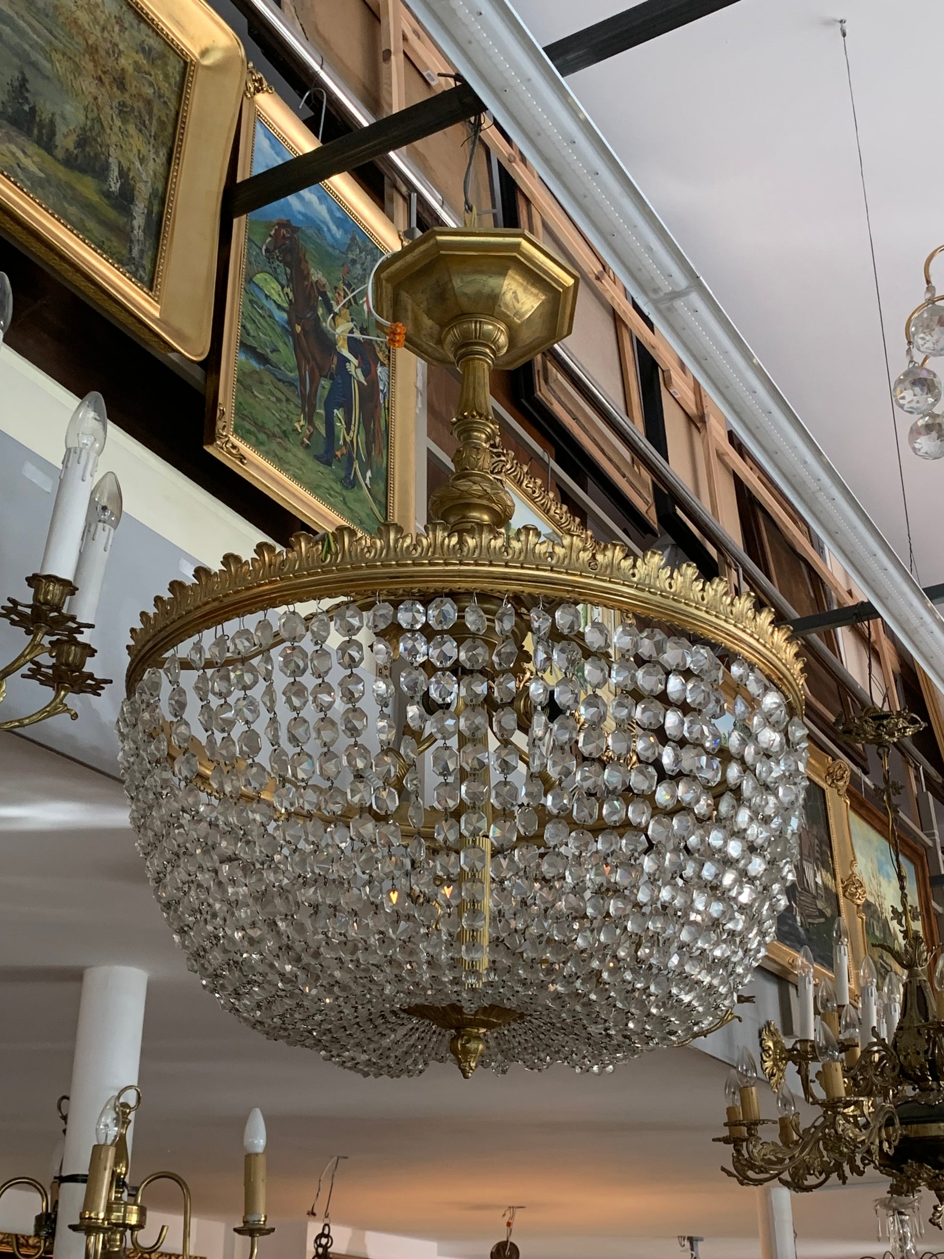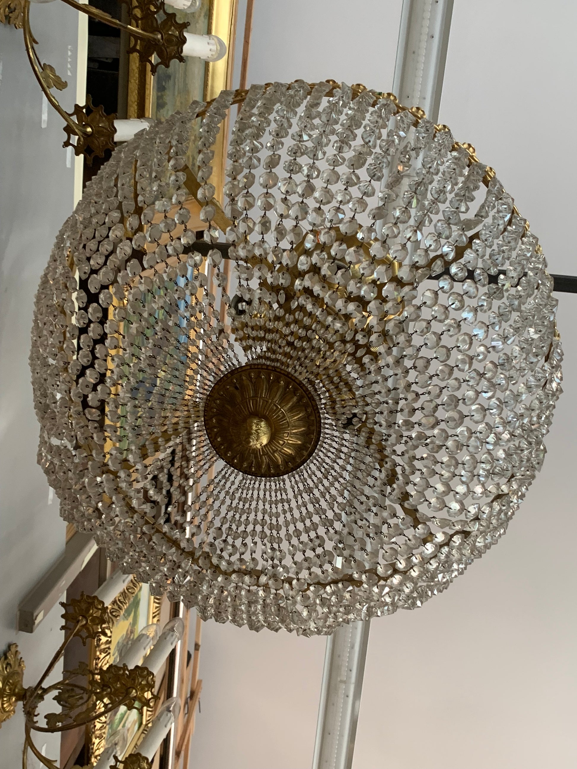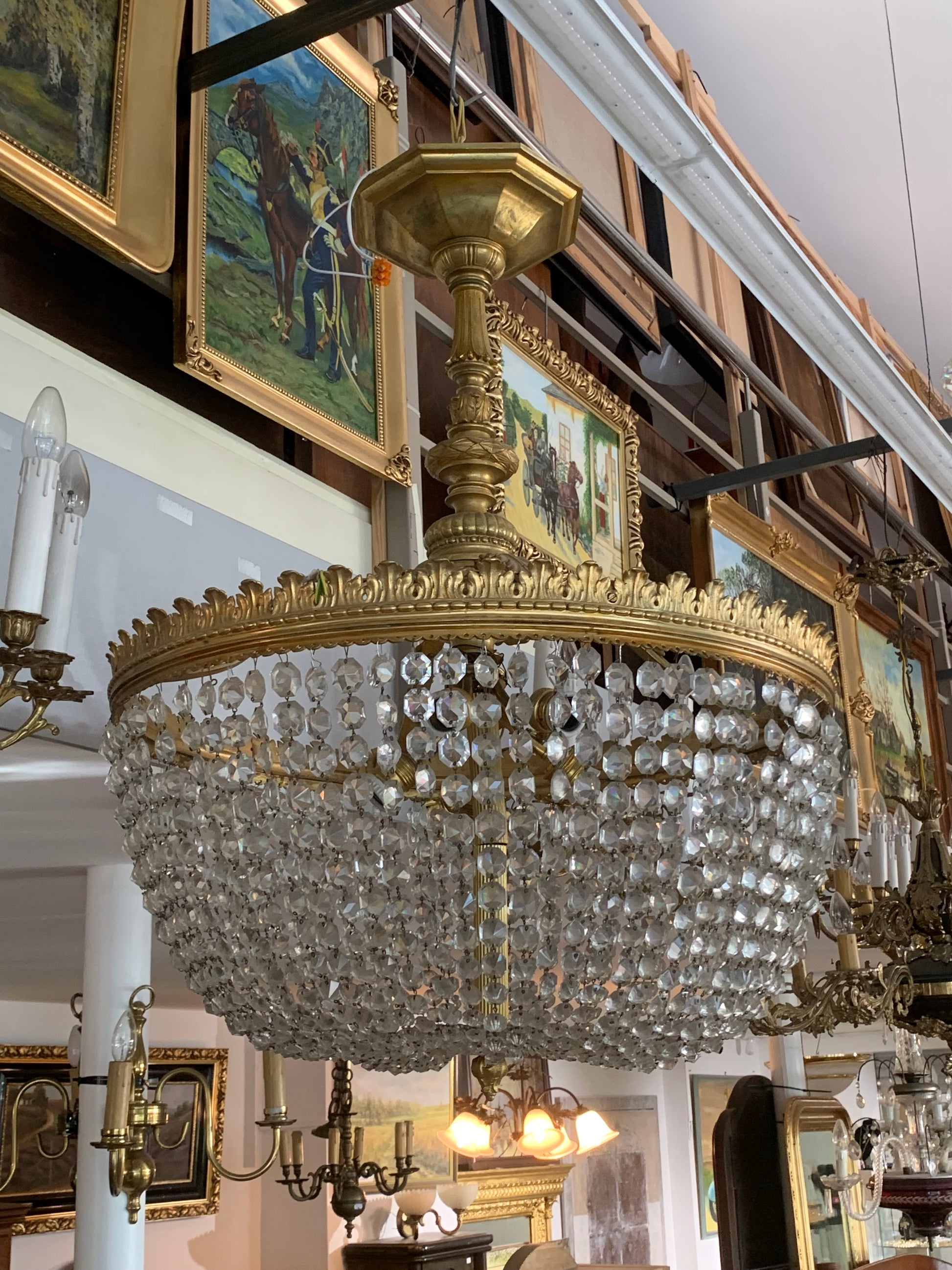 Duży, kryształowy żyrandol, zawieszenie z mosiądzu, stan - bardzo dobry, bez uszkodzeń.
