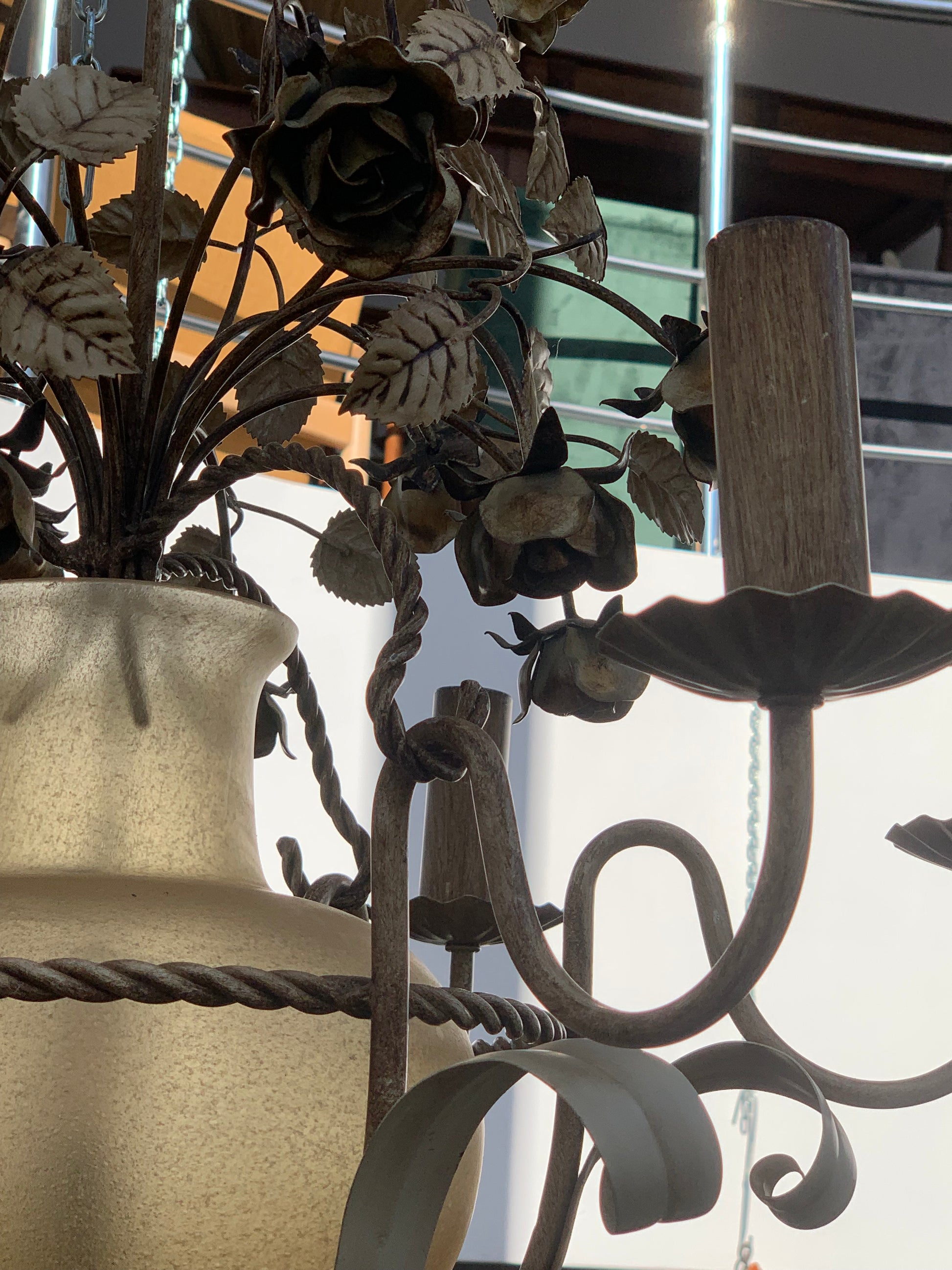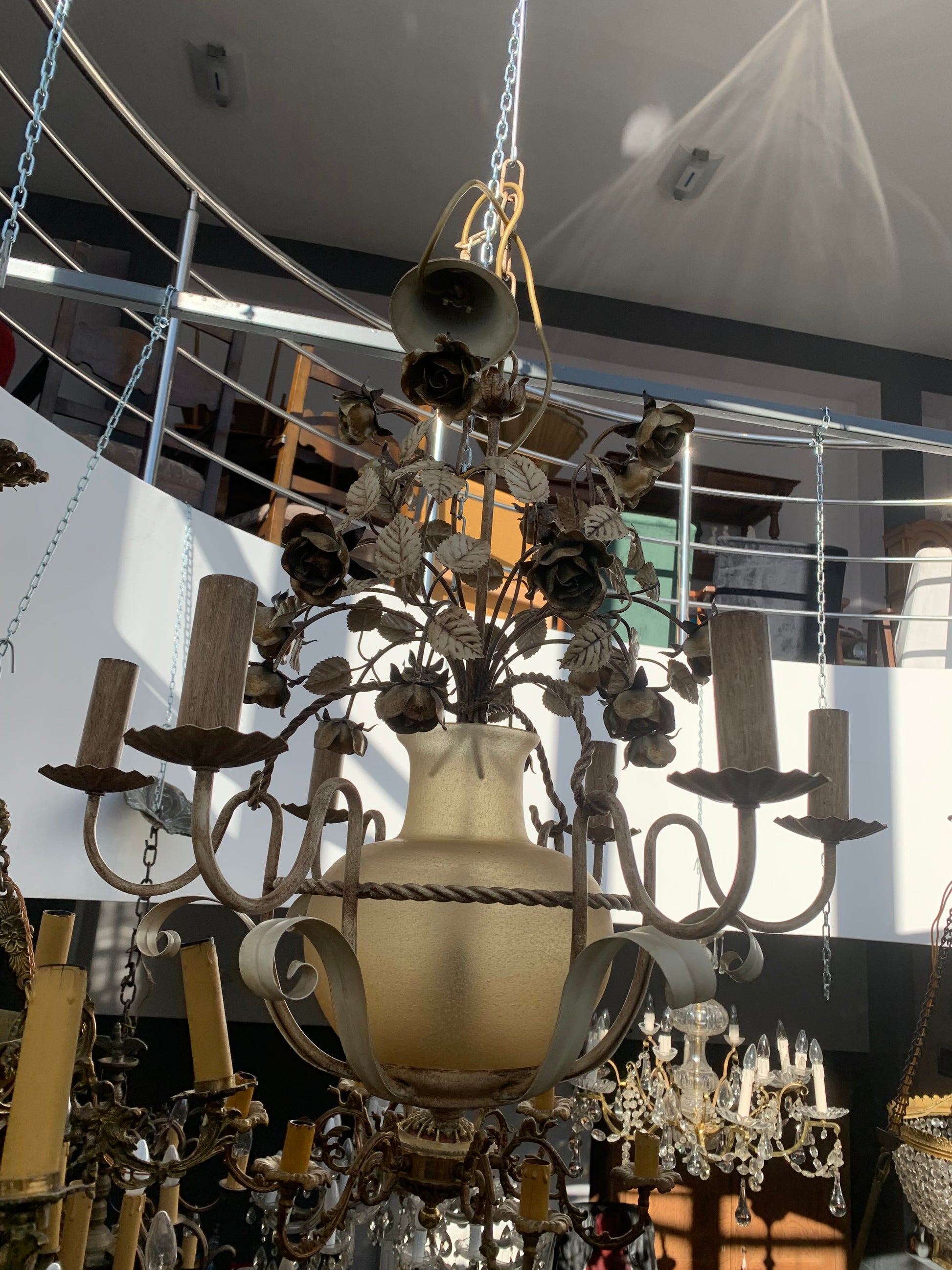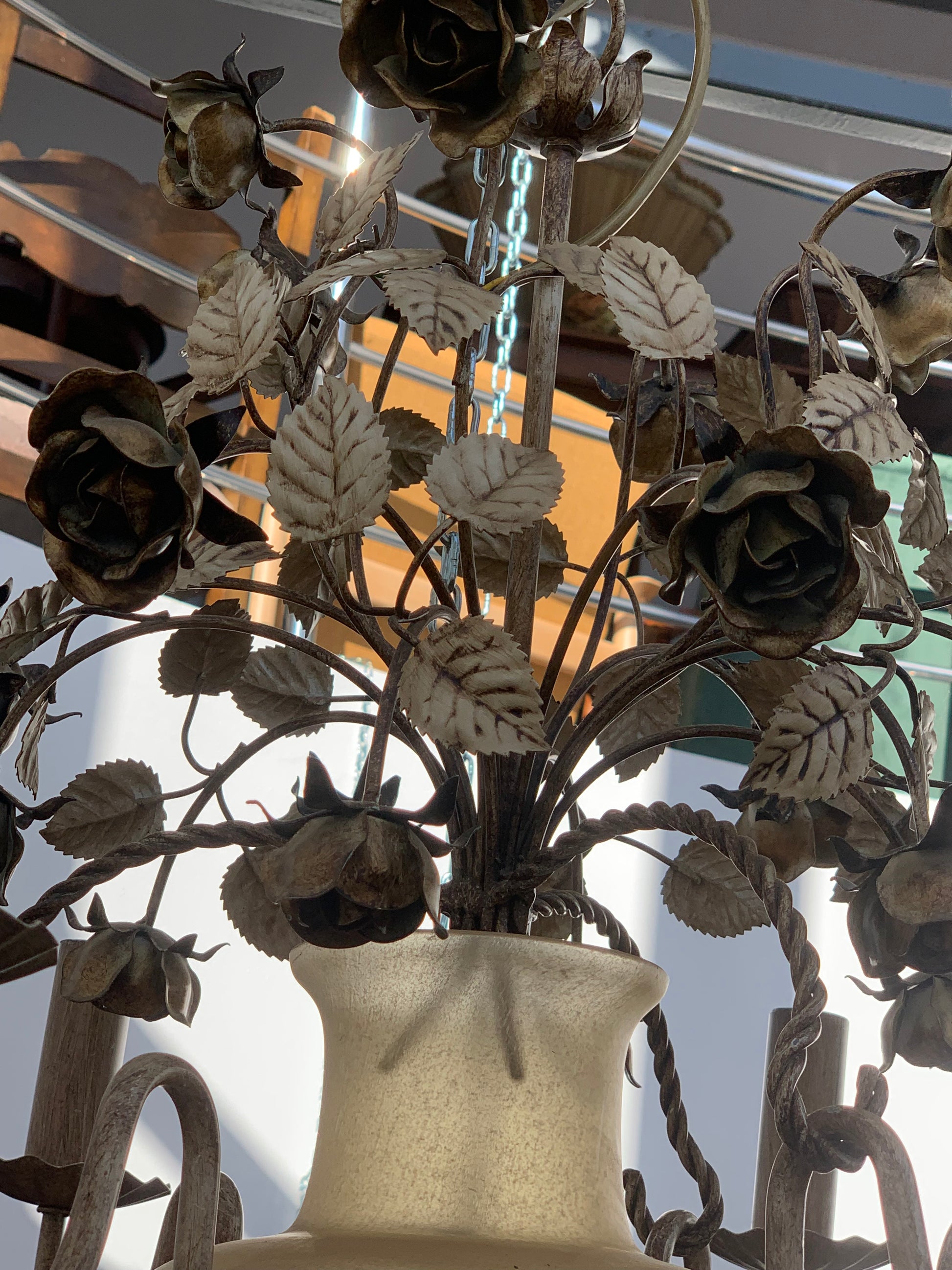 Spektakularny żyrandol włoski wykonany z metaloplastyki, ręcznie ozdobiony dużym szklanym wazonem z bukietem róż oraz sześcioma świecznikami.