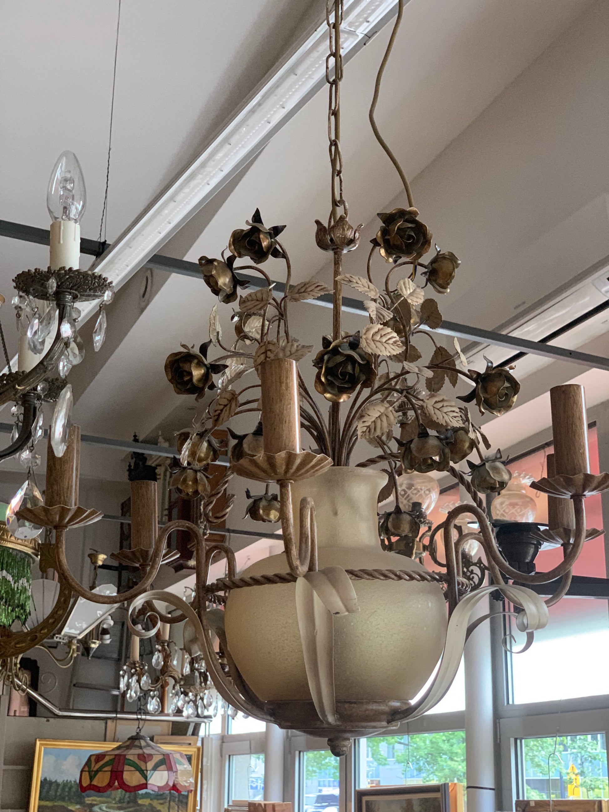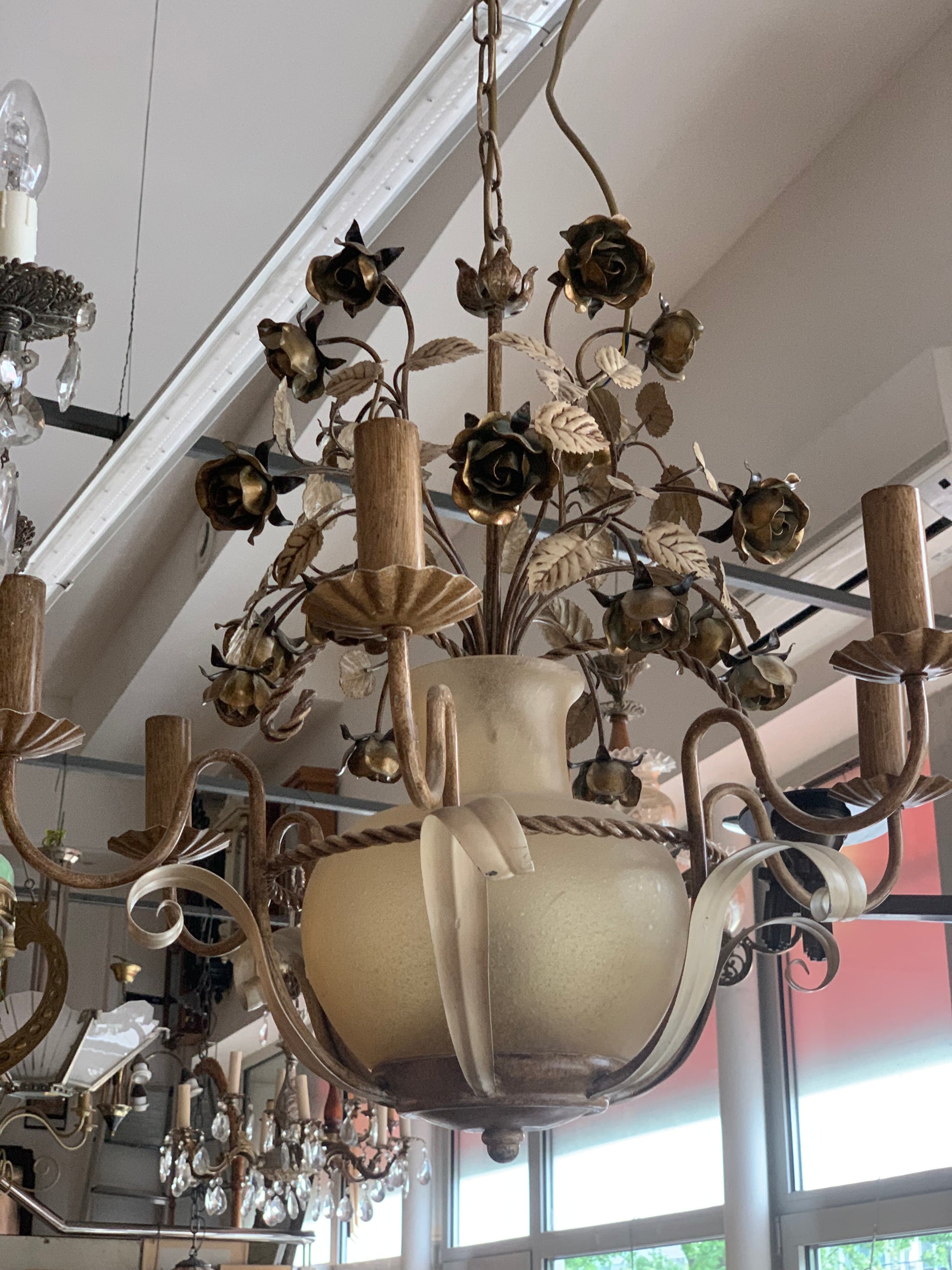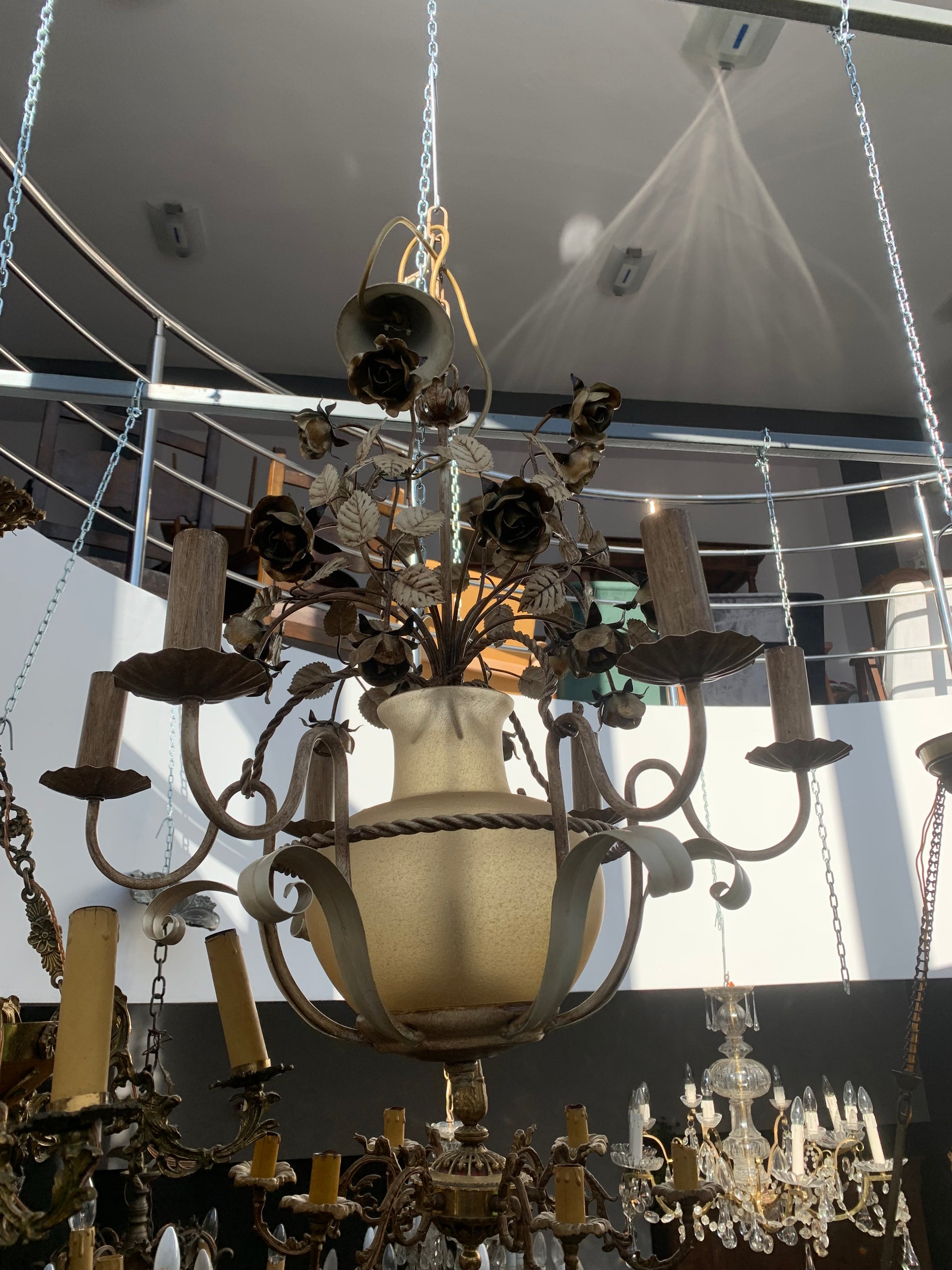 Spektakularny żyrandol włoski wykonany z metaloplastyki, ręcznie ozdobiony dużym szklanym wazonem z bukietem róż oraz sześcioma świecznikami.