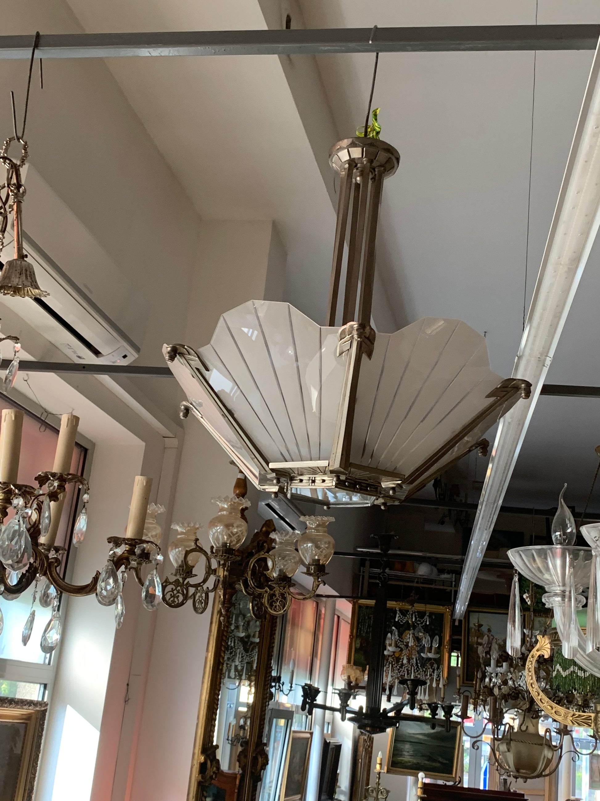 Żyrandol Art Deco, lata 30-te, Francja. Lampa wykonana z metalu niklowanego oraz szkła, piękny projekt francuskich mistrzów. UNIKAT.