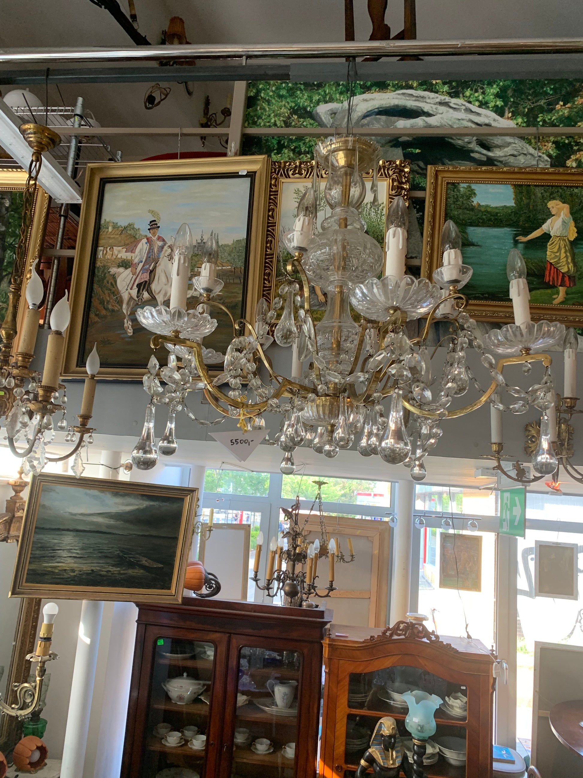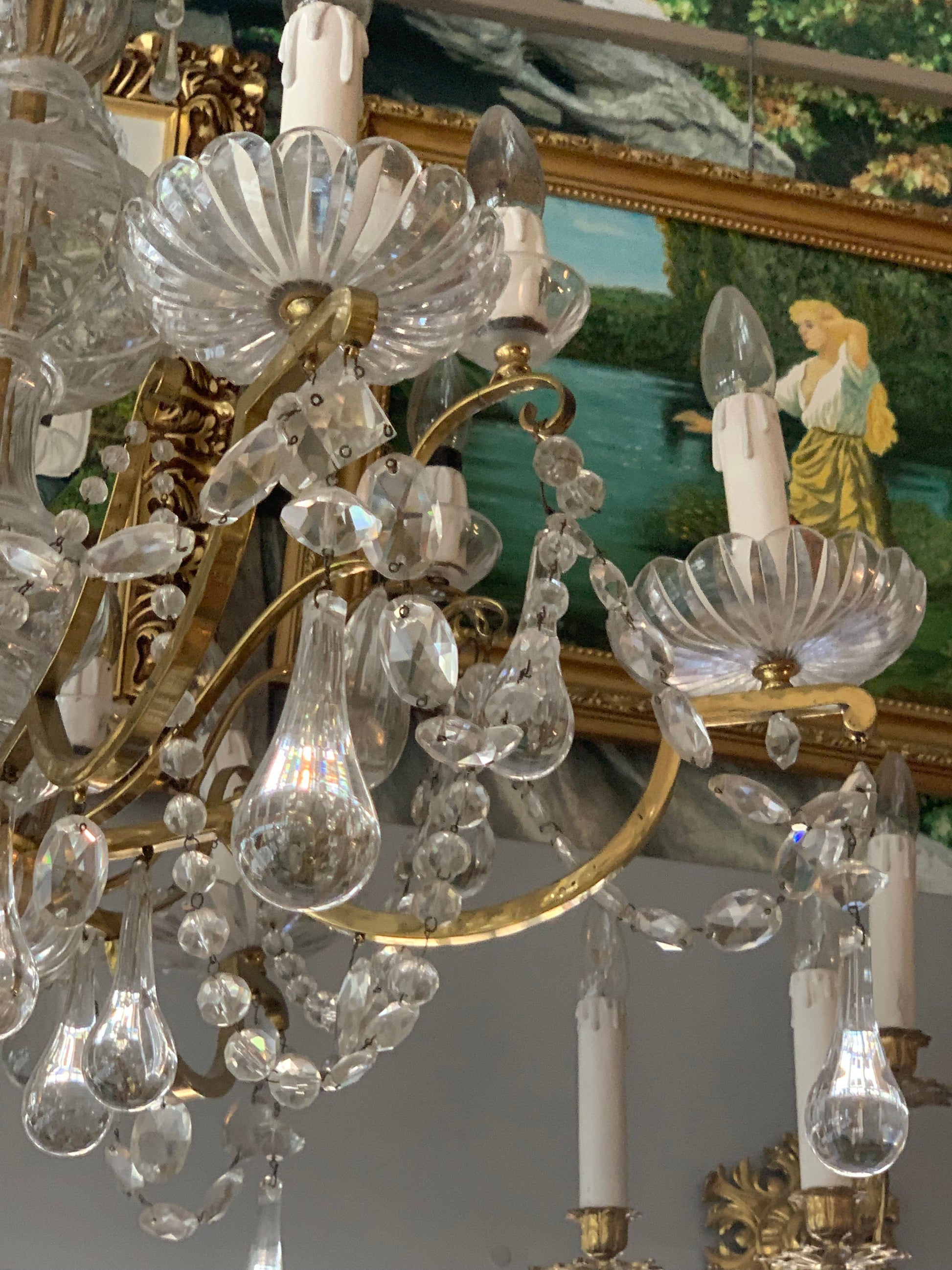 Pałacowy, duży żyrandol kryształowy, kaskadowy z mosiądzu na 12 żarówek, piękne, fazowane kryształy. Stan: sprawny, w dobrym stanie.