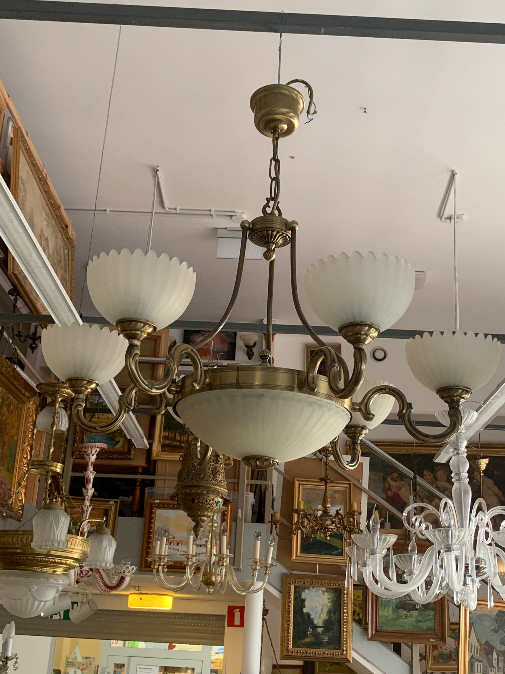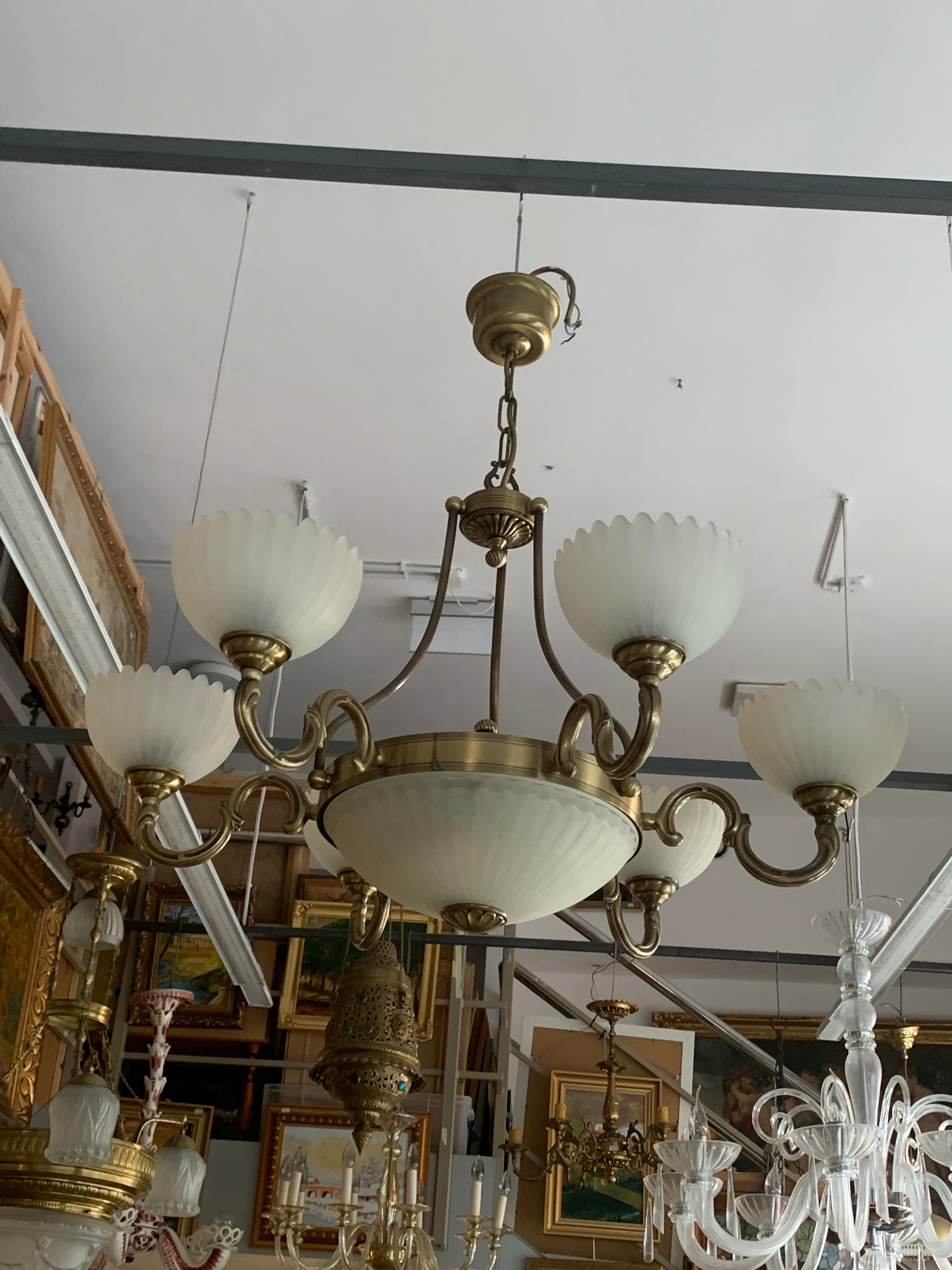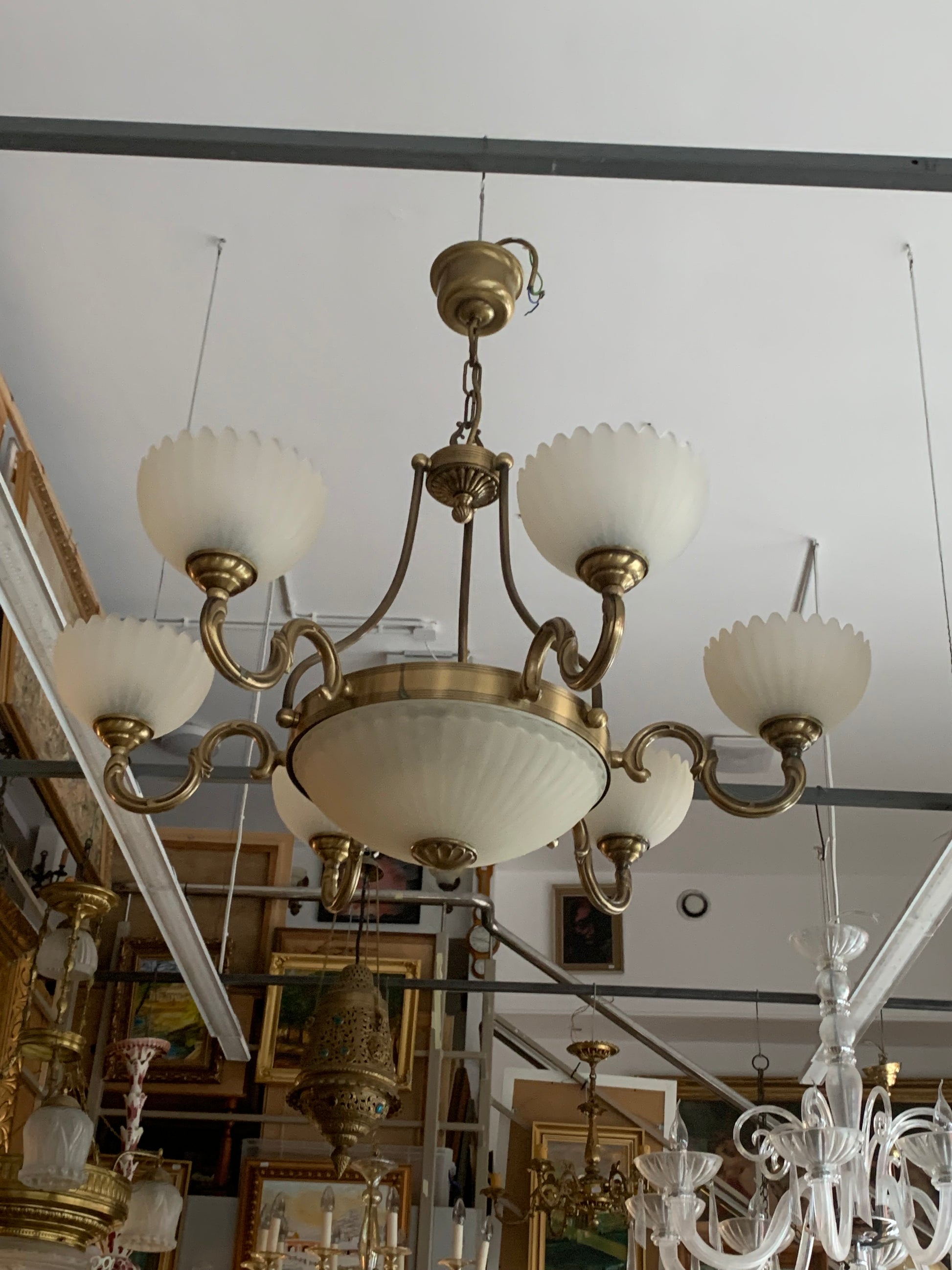 Żyrandol z mosiądzu, szklane klosze, 6-ramienny, Italy