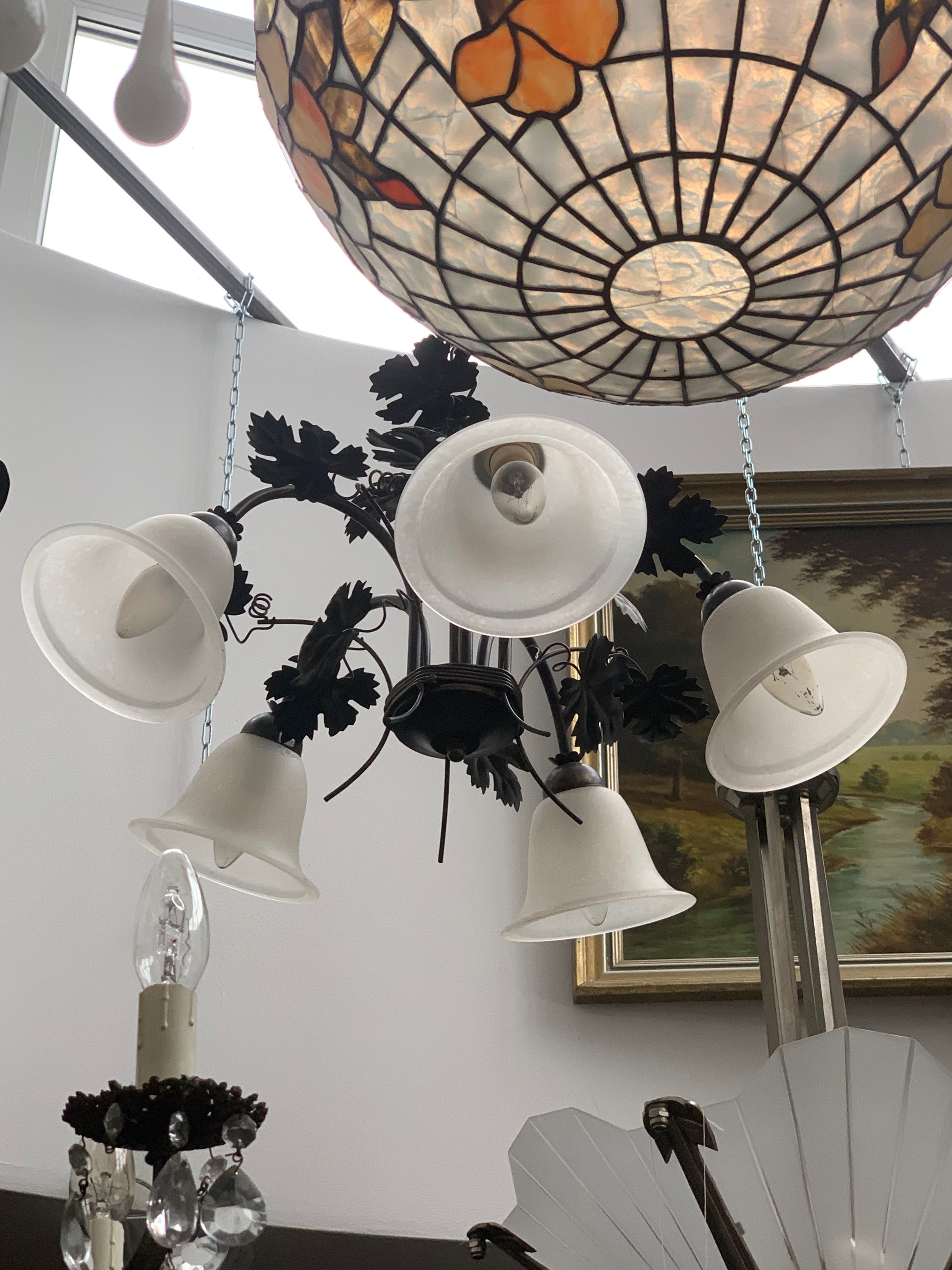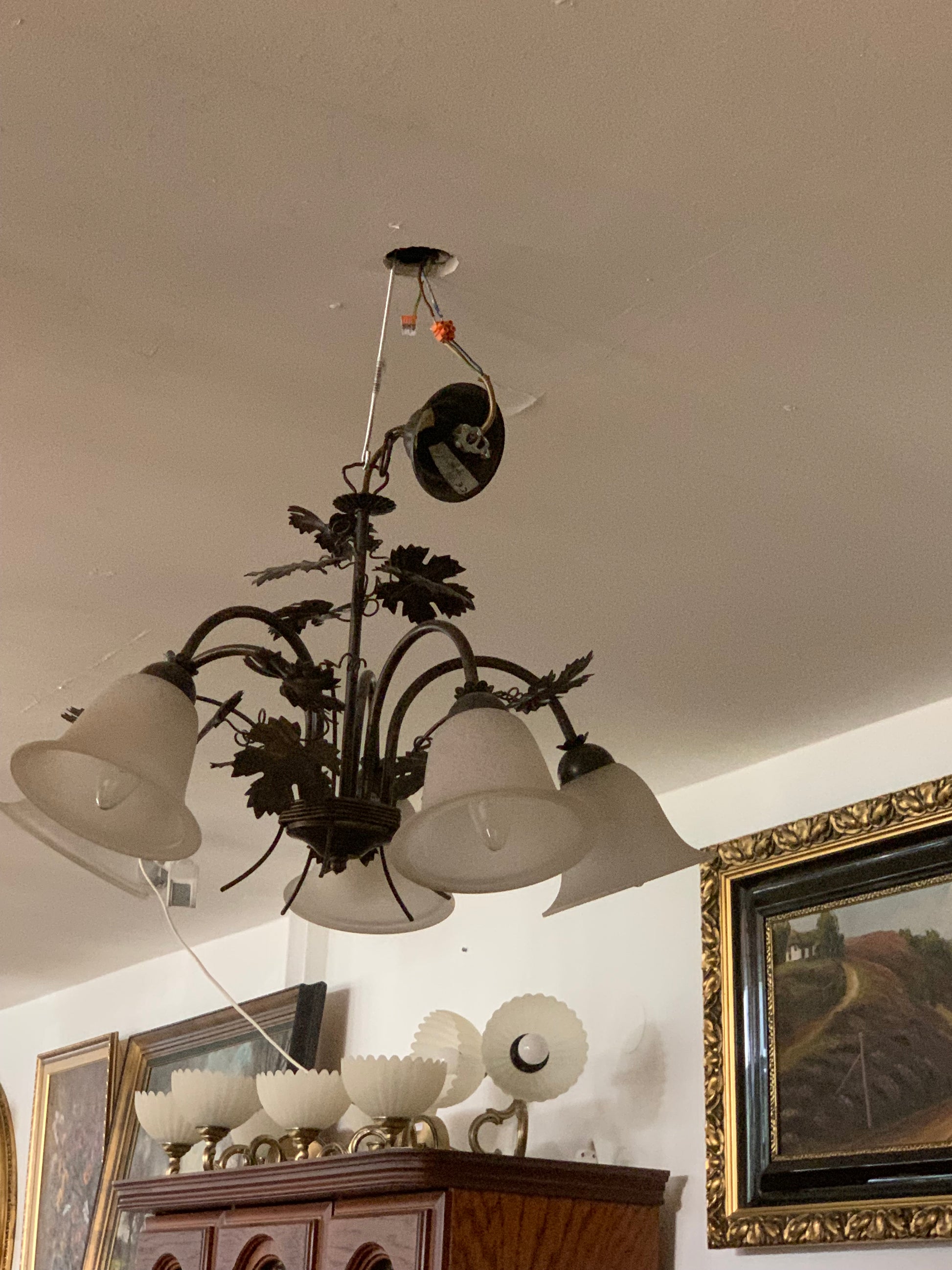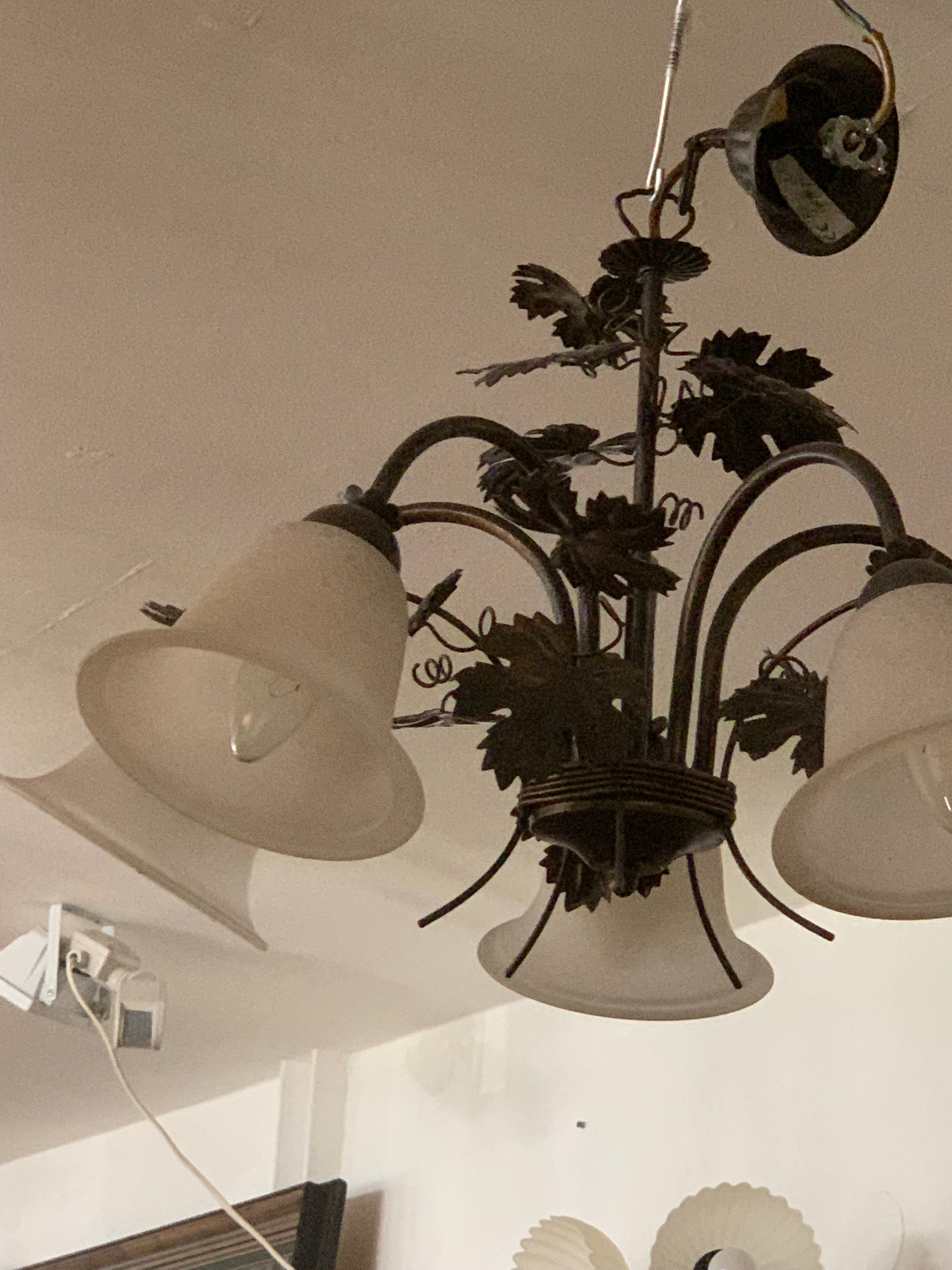 Żyrandol pięcioramienny, metaloplastyka, szklane klosze, zdobiony liśćmi z klonu, daje dużo światła, stan: sprawny.