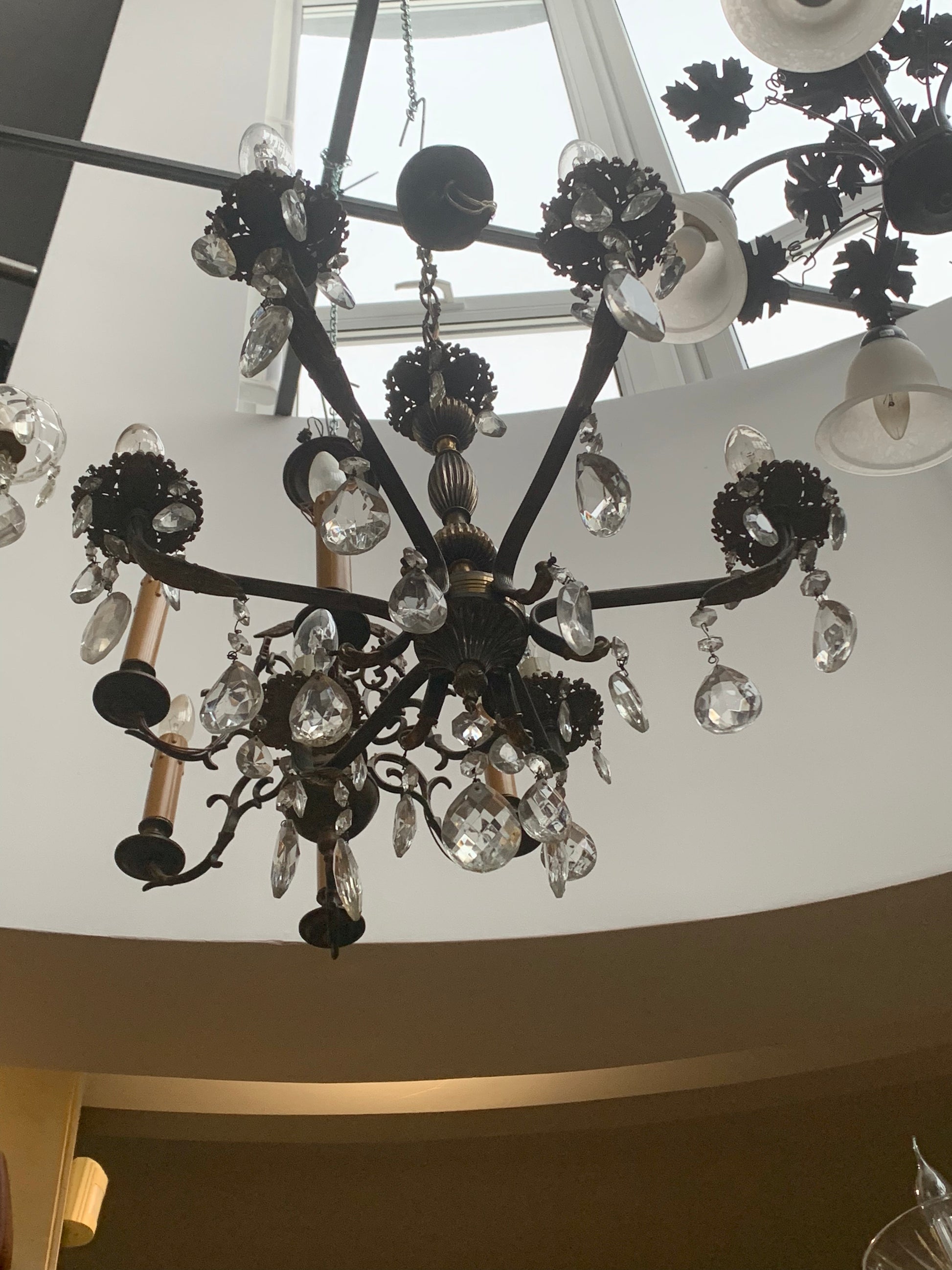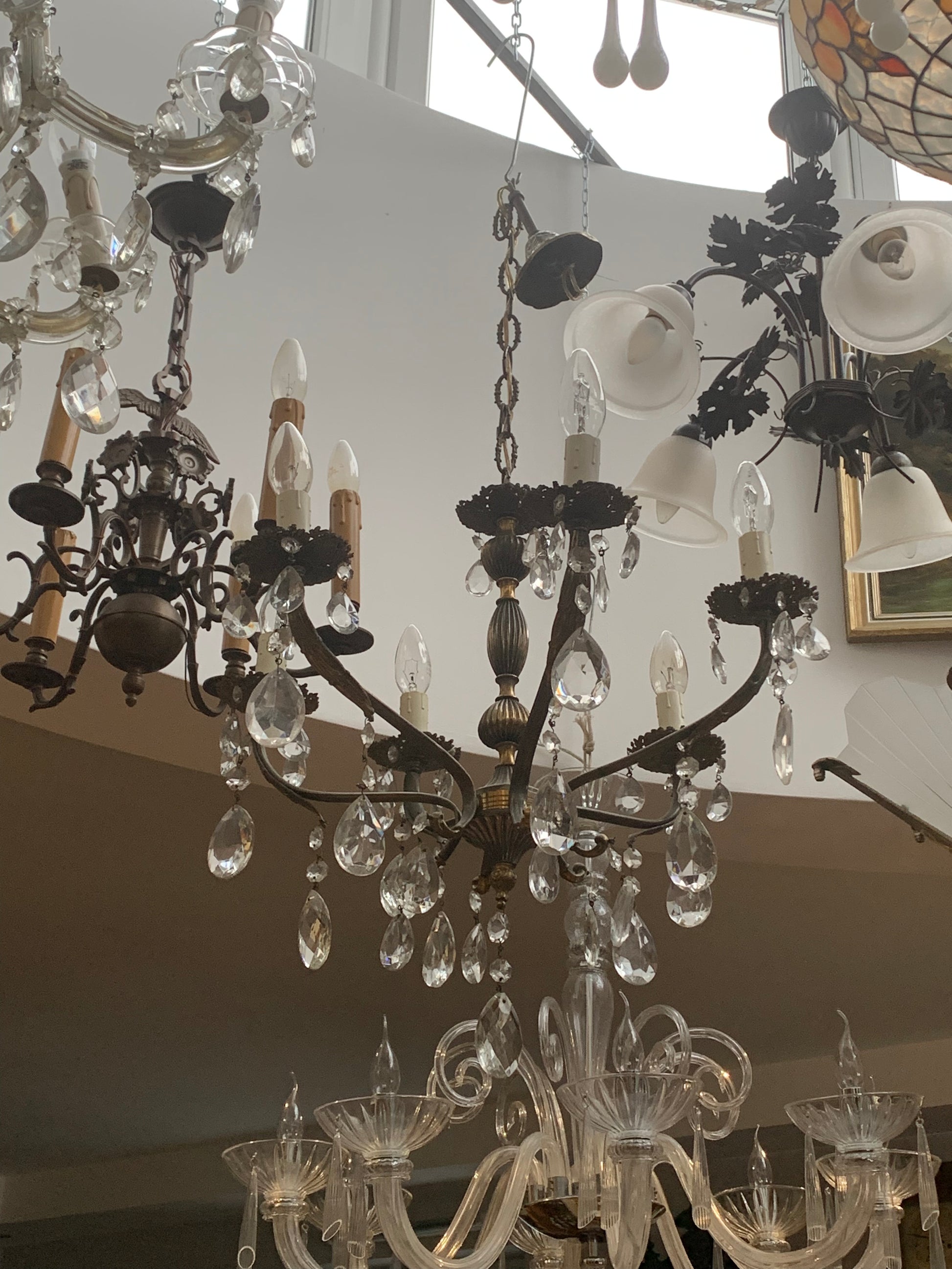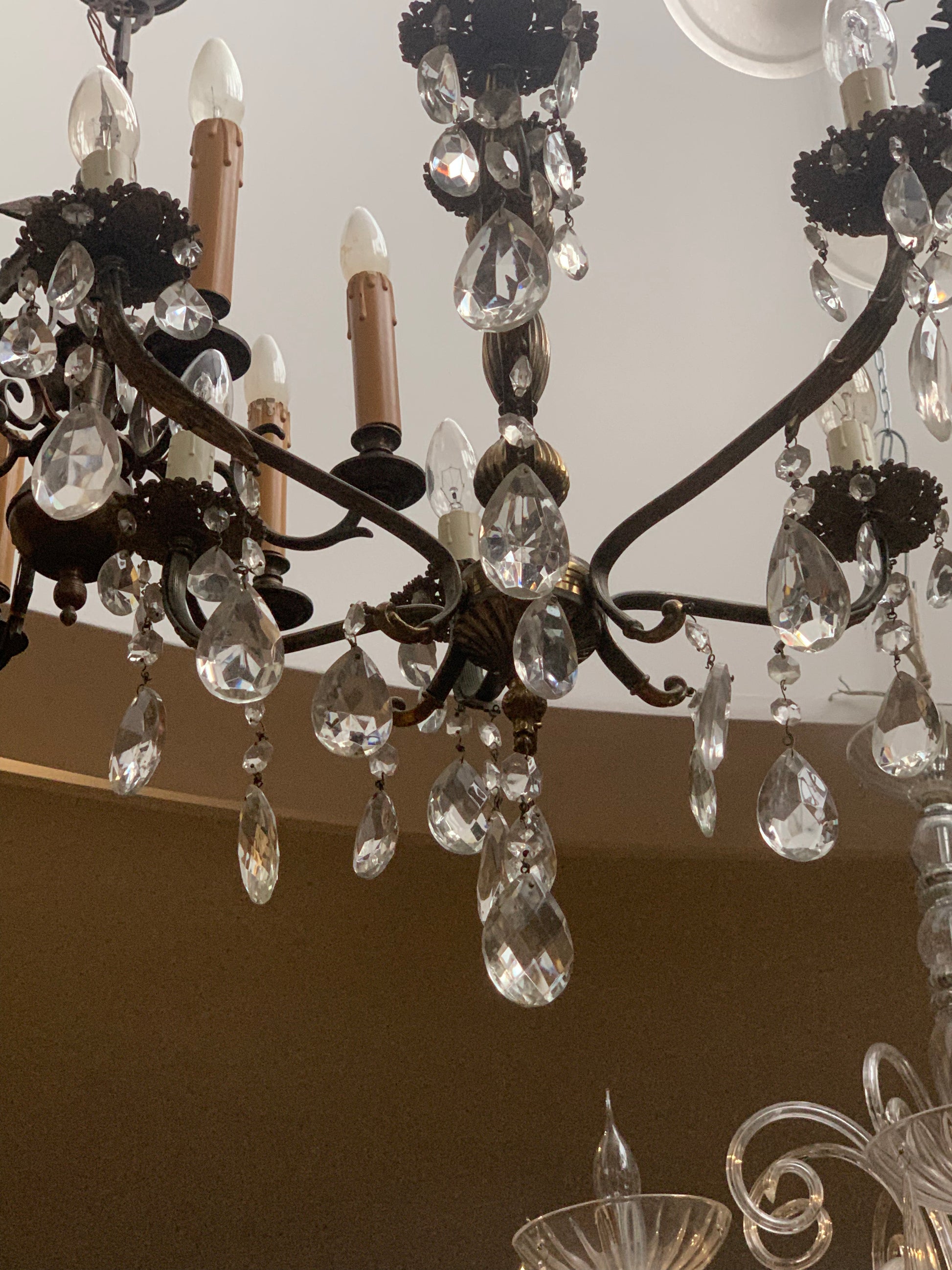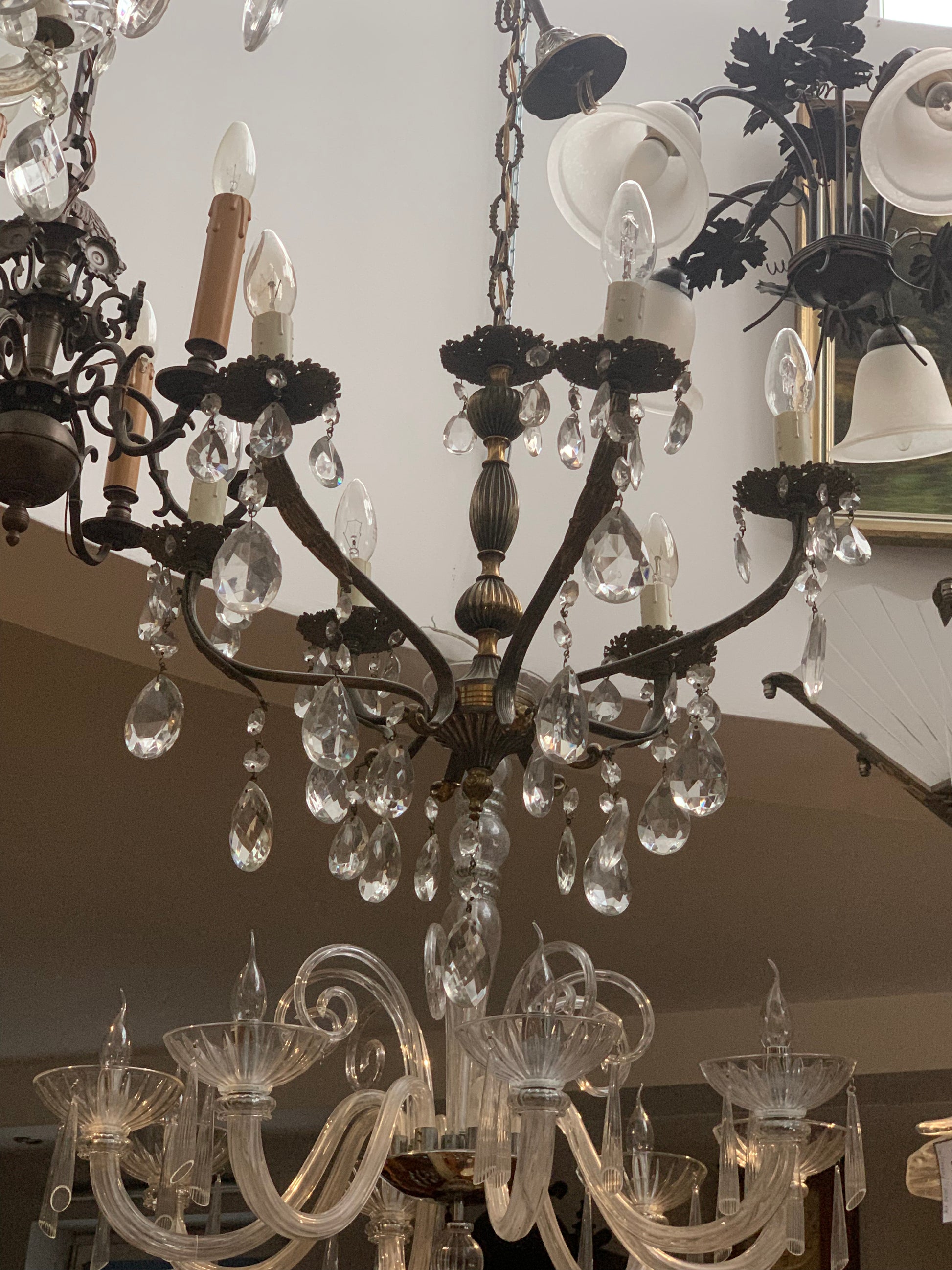 Żyrandol z mosiądzu, z kryształkami fazowanymi, na 6 żarówek. Stan: bardzo dobry, sprawny.