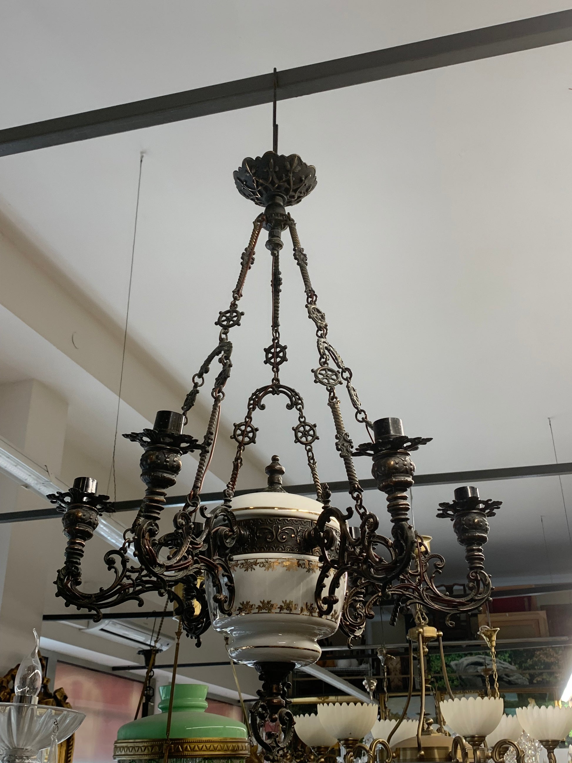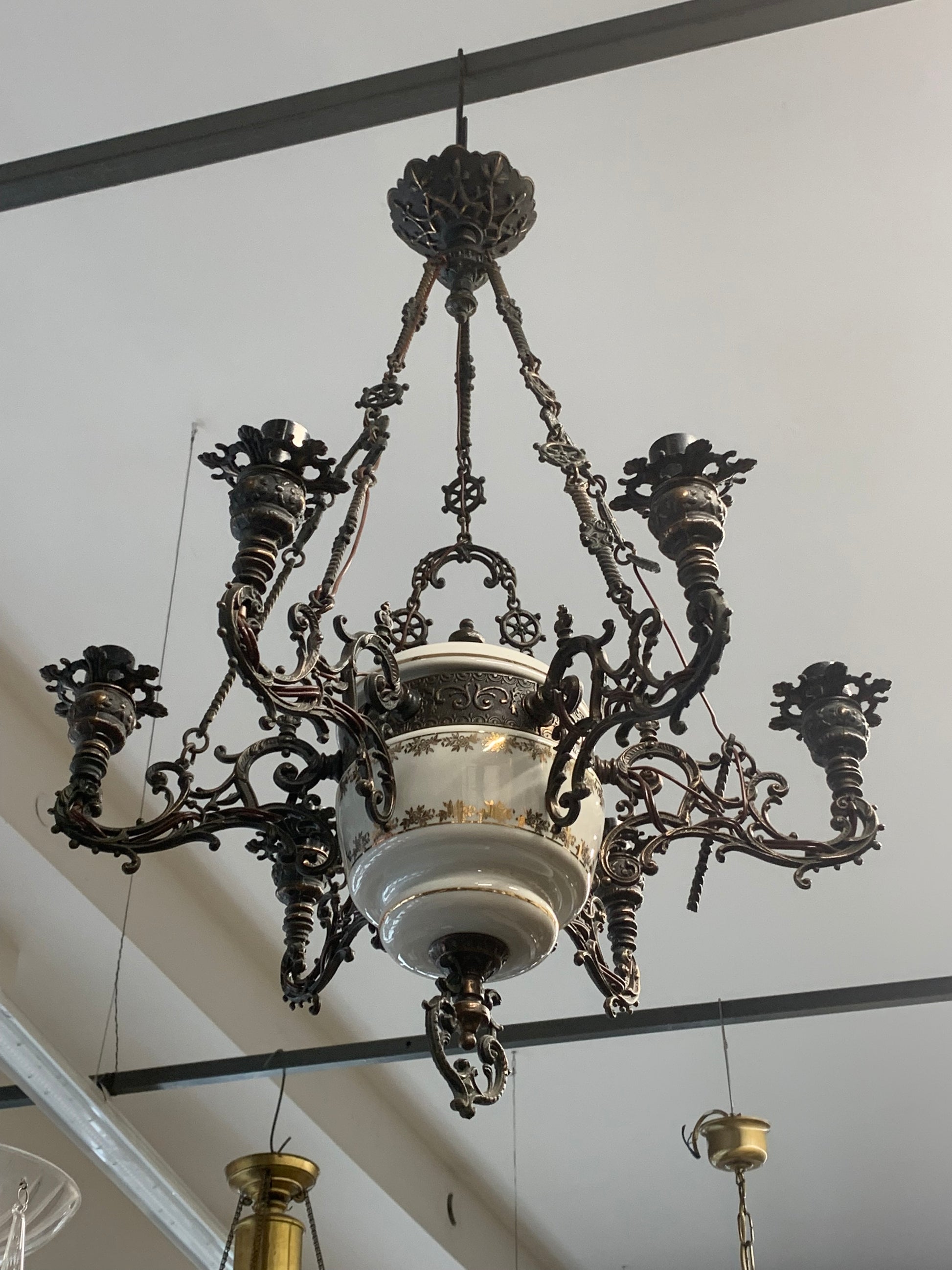 Żyrandol porcelana, metaloplastyka. Stylowy żyrandol na 6 świec z korpusem porcelanowym, złoconym.