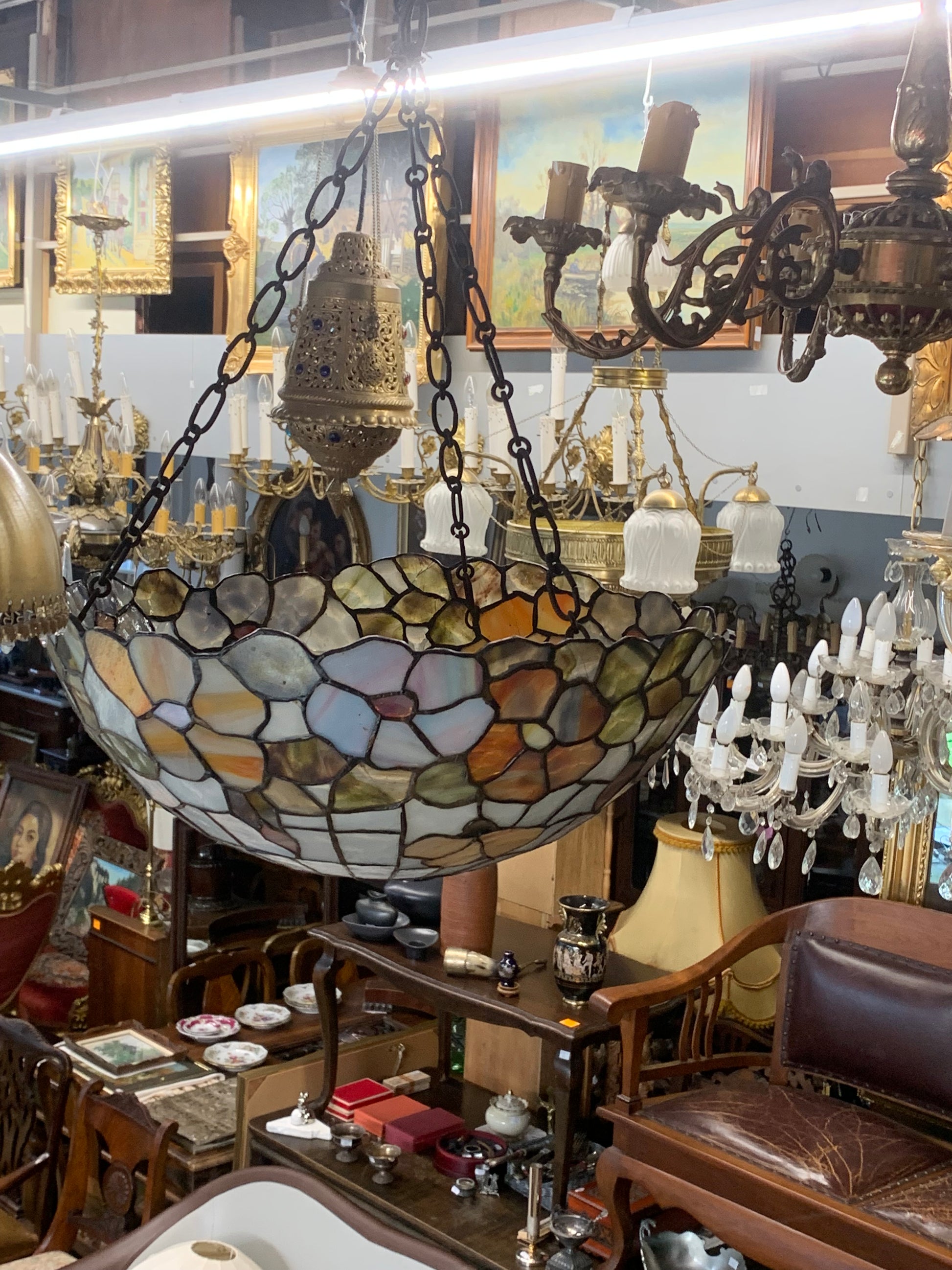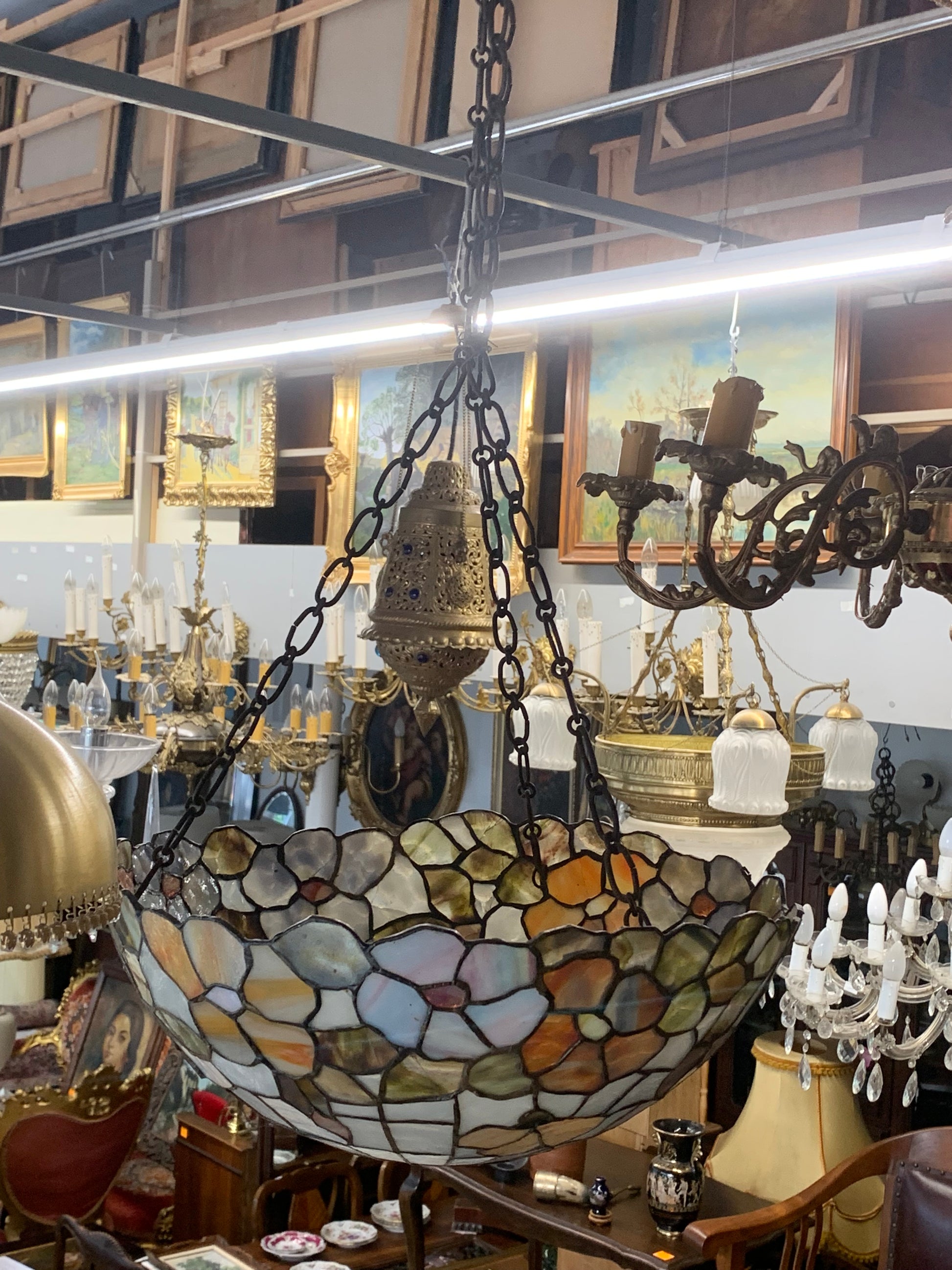 Lampa sufitowa witrażowa, zawieszona na łańcuchach z misą zdobioną mozaiką kwiatów, stan: sprawny.